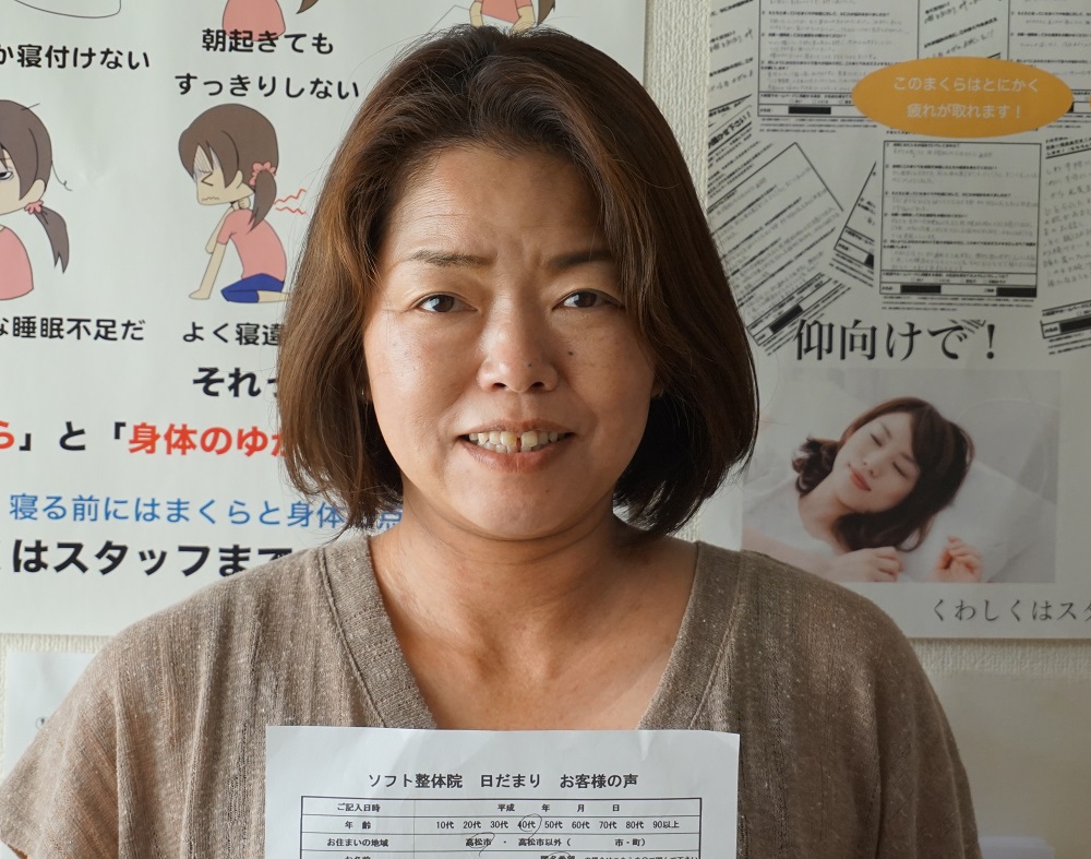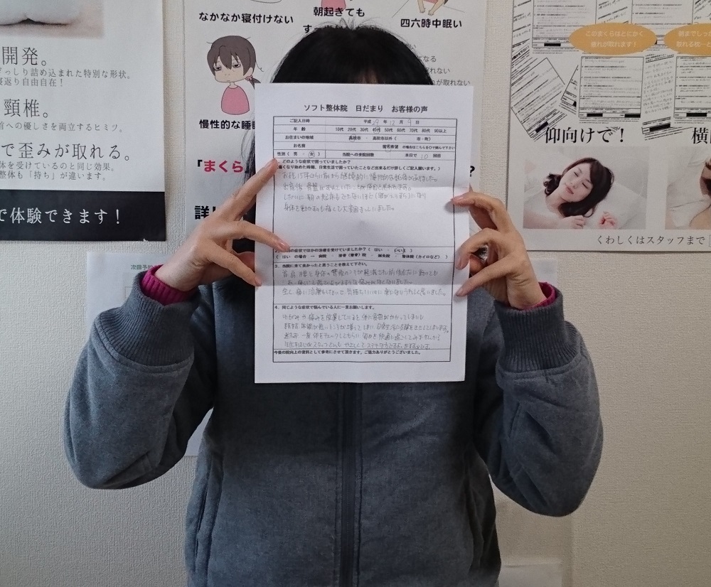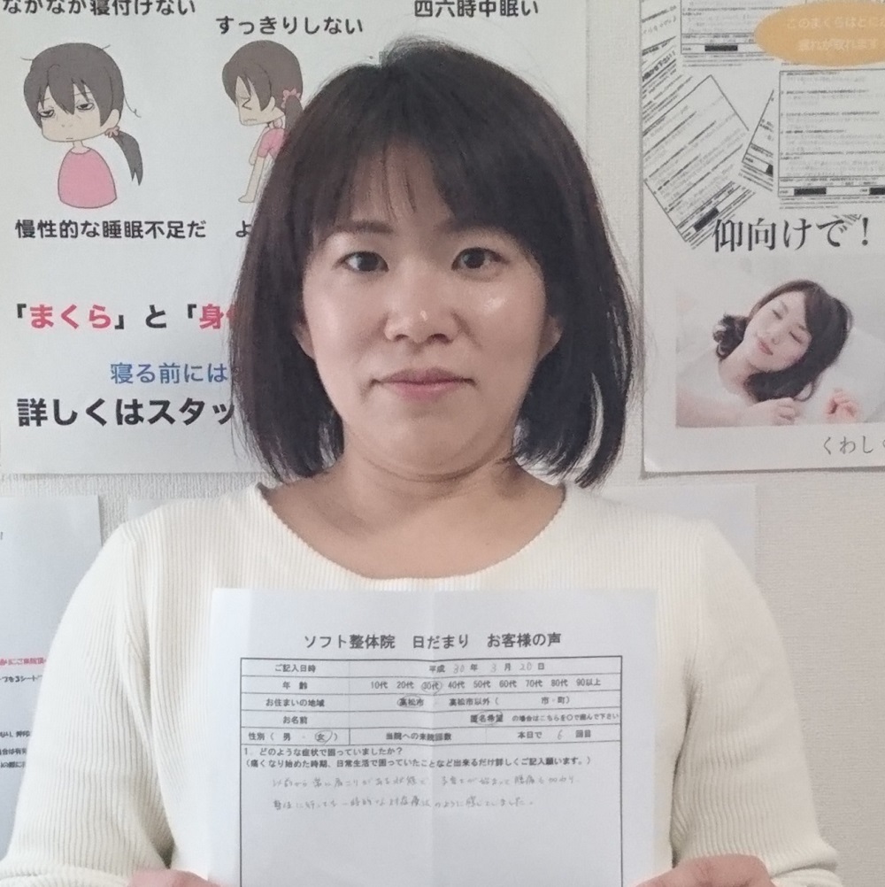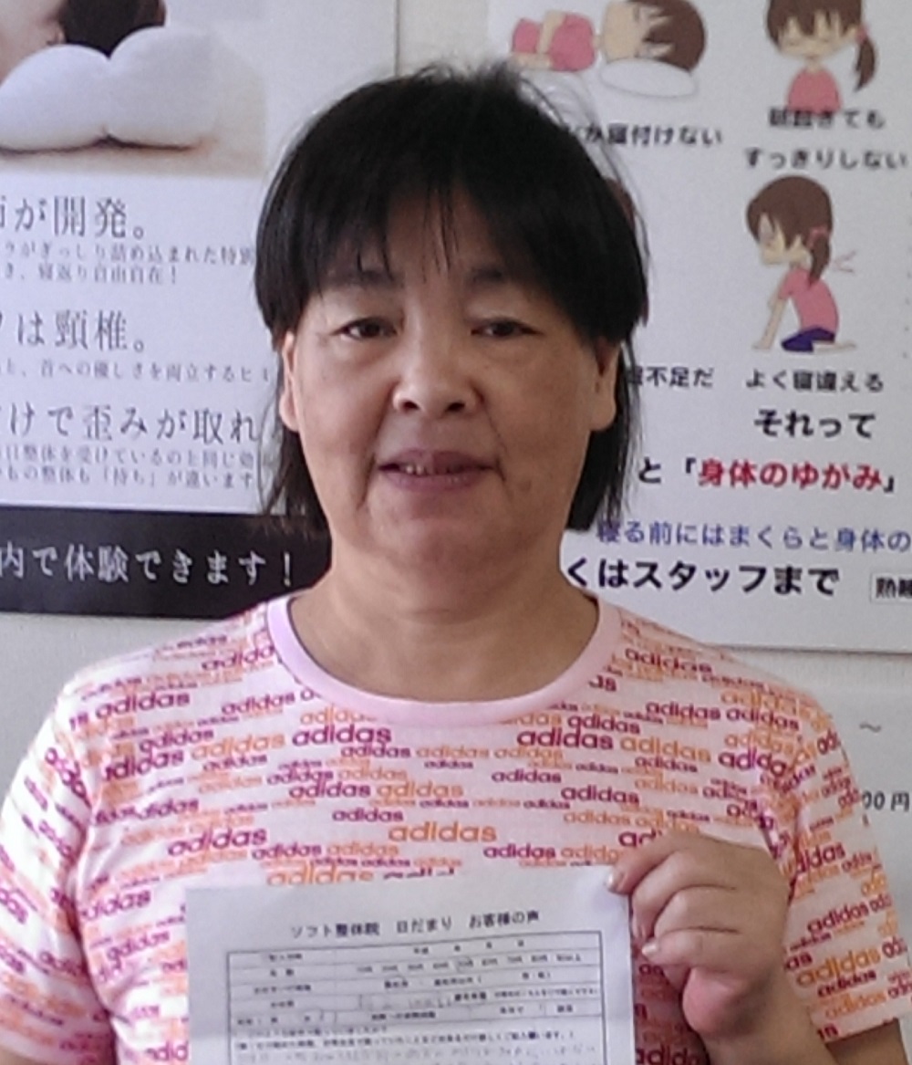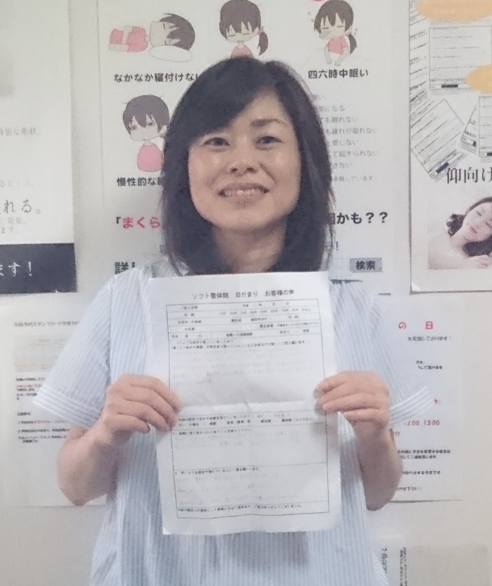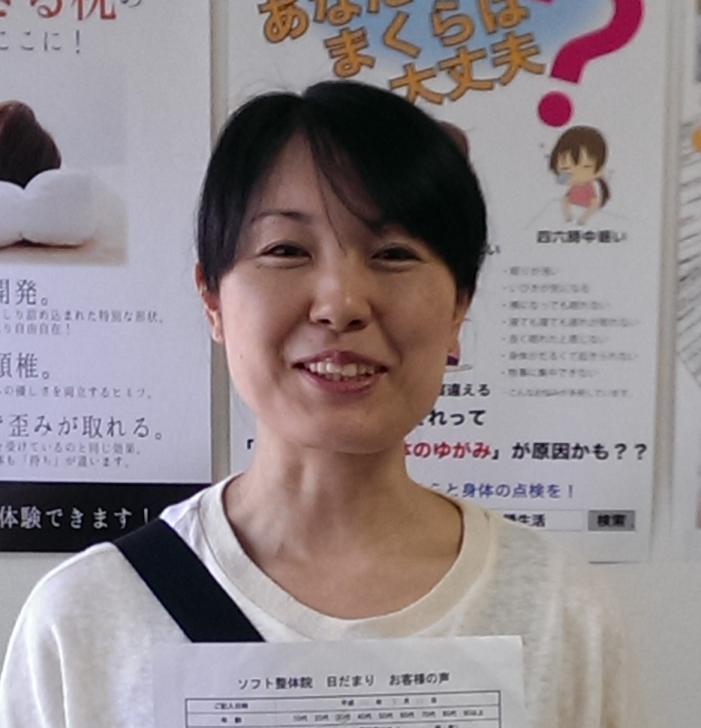 腰痛は、まだ時々ありますが、以前のようにひどく痛むことはなくなりました。首のこり、頭痛もすごく楽になって、まだ首がこることは時々ありますが、頭痛はしなくなりました。姿勢や歩き方、イス、布団、枕の硬さなど、日常生活で体がゆがまないように気をつけなければいけないことを教えてくださるので、有難いです。