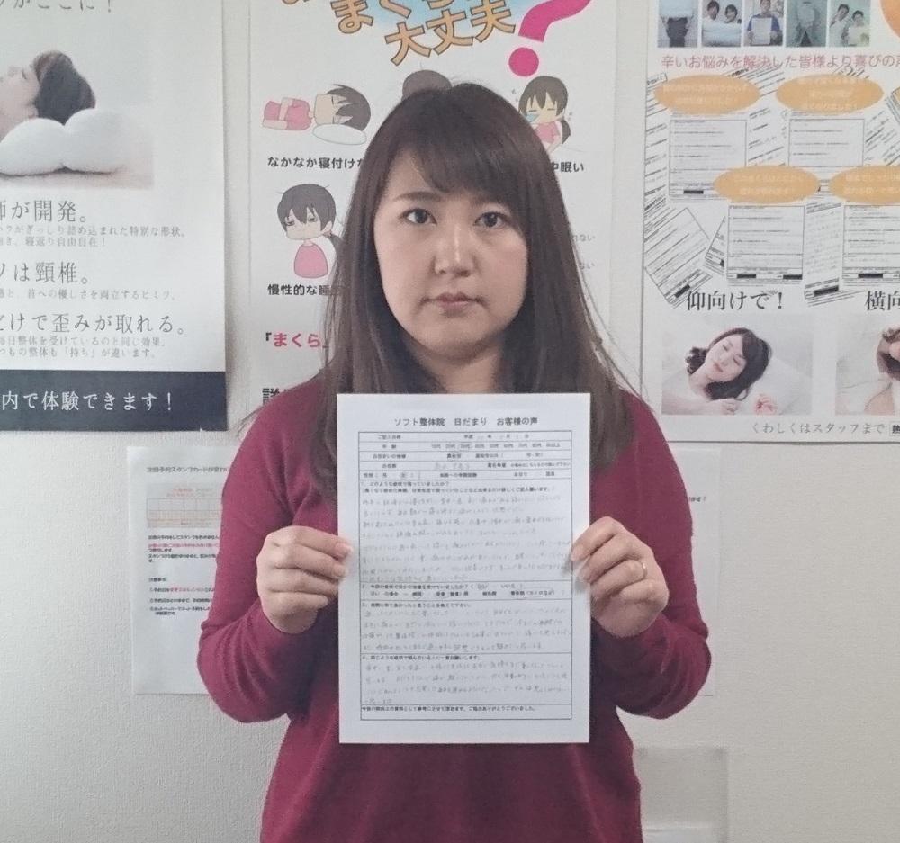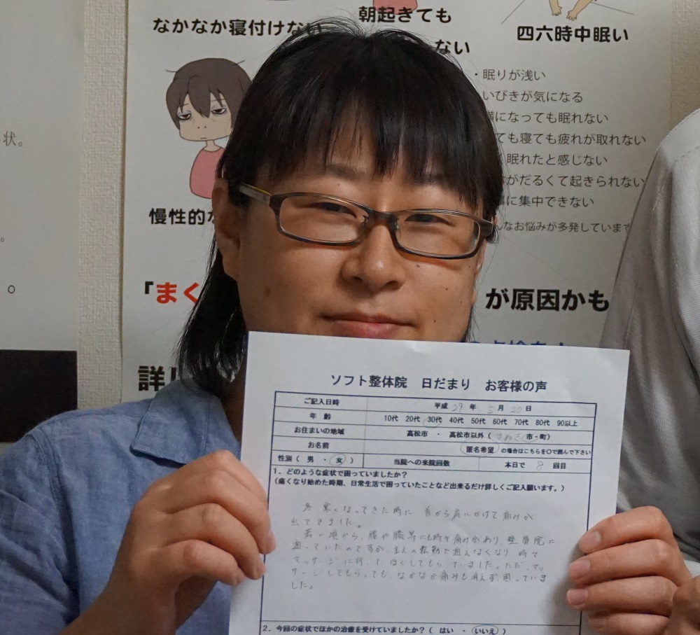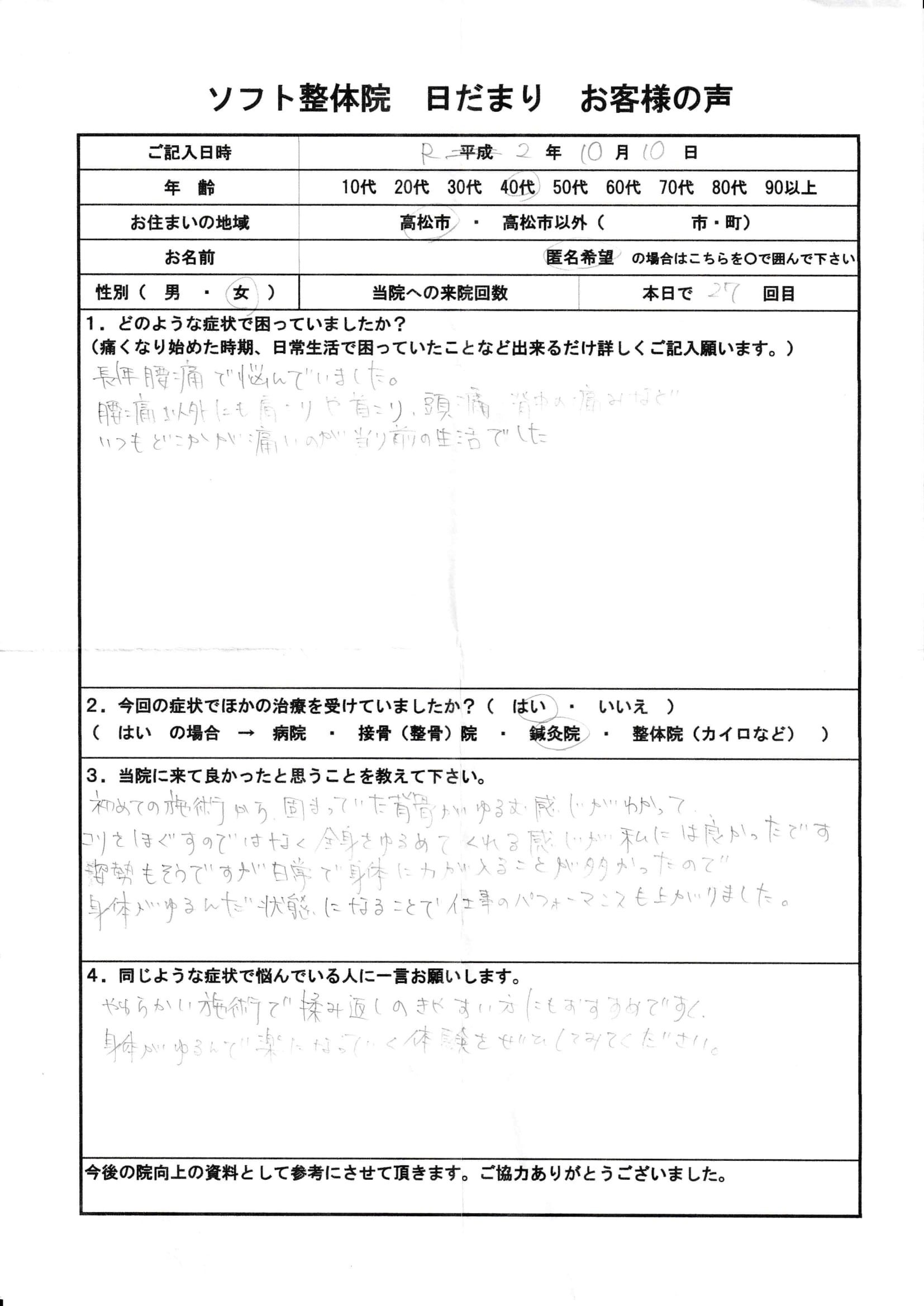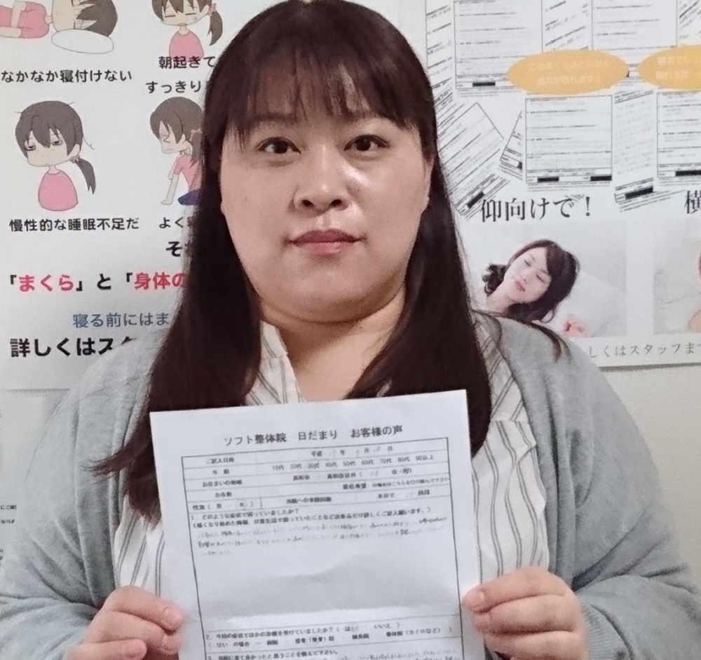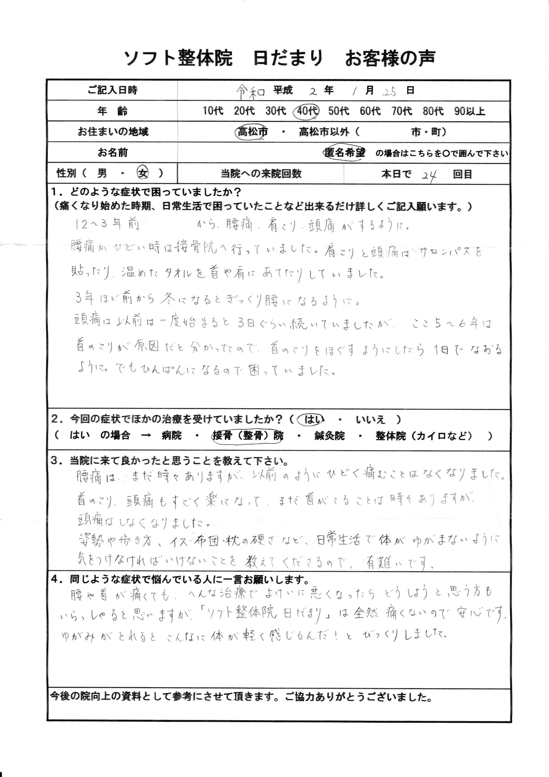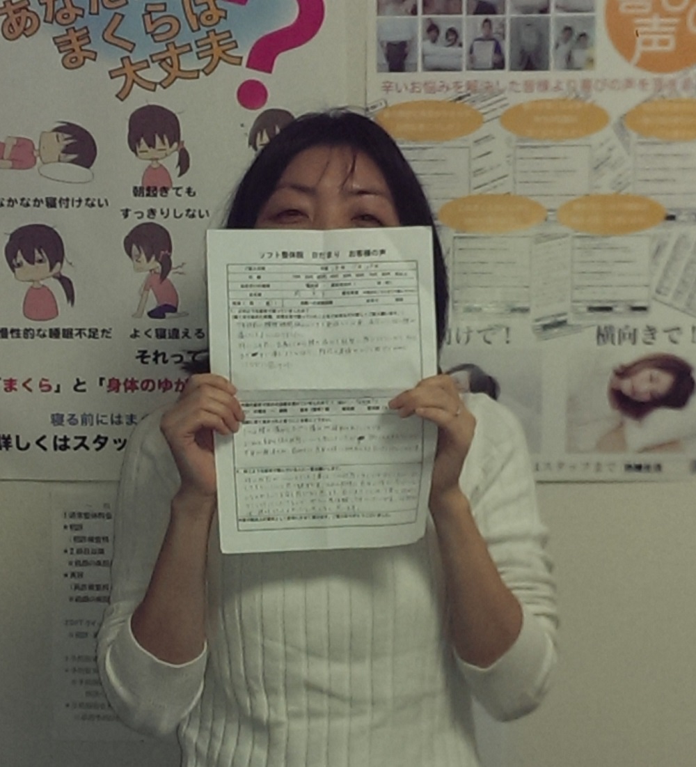 腰痛は、まだ時々ありますが、以前のようにひどく痛むことはなくなりました。首のこり、頭痛もすごく楽になって、まだ首がこることは時々ありますが、頭痛はしなくなりました。姿勢や歩き方、イス、布団、枕の硬さなど、日常生活で体がゆがまないように気をつけなければいけないことを教えてくださるので、有難いです。