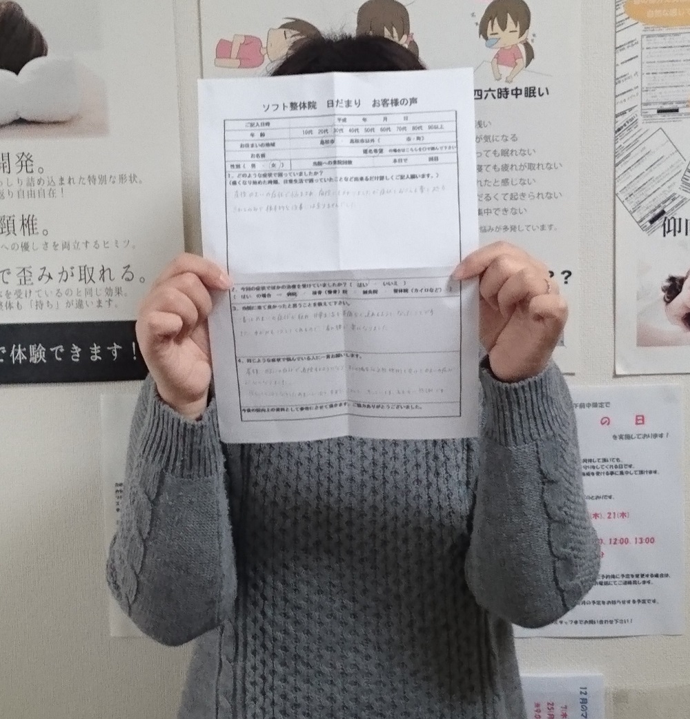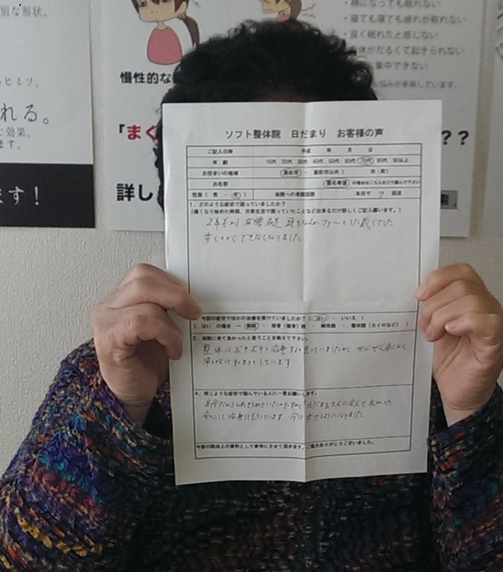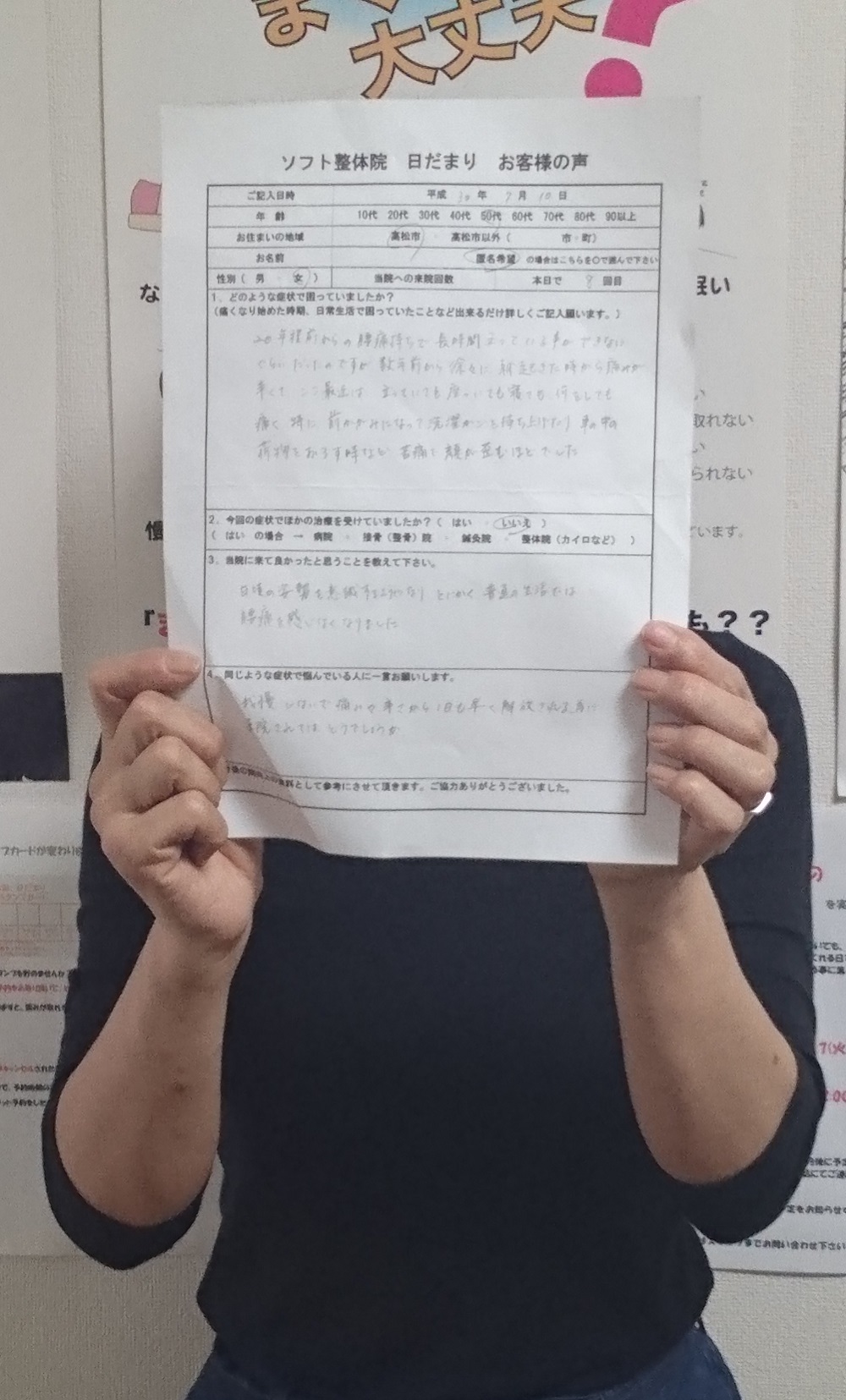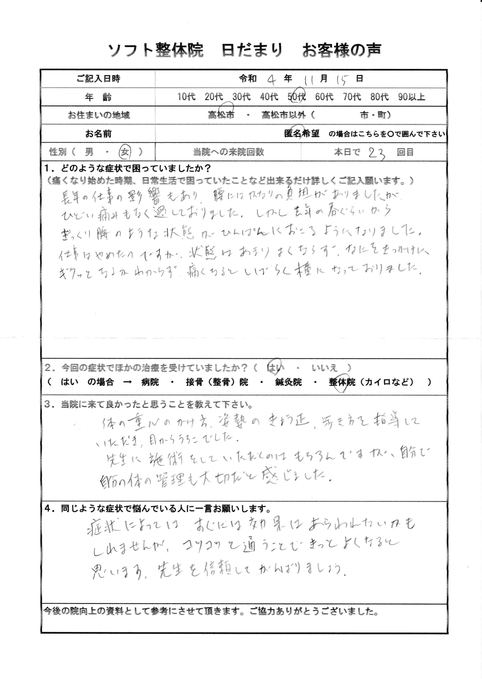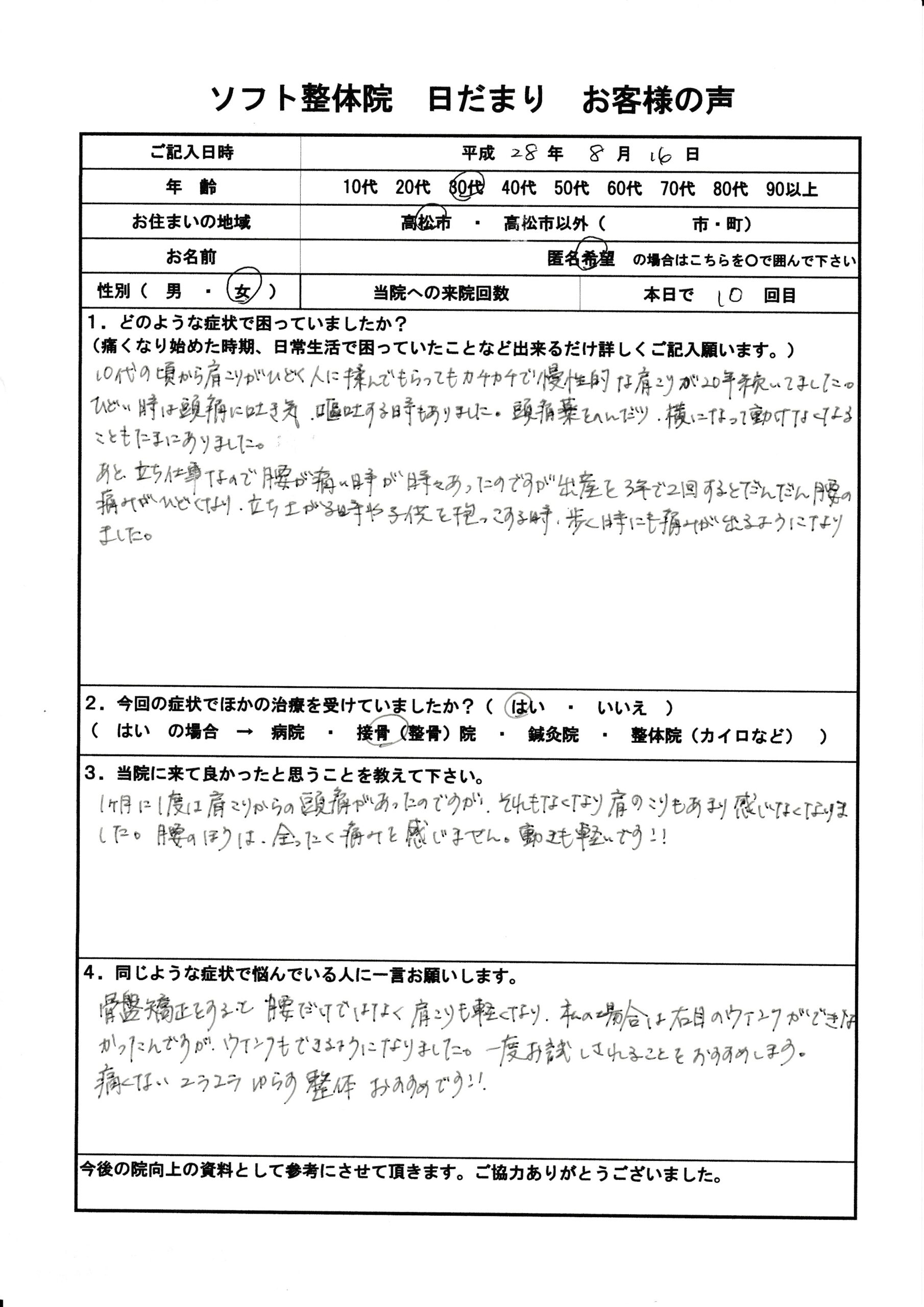 腰痛は、まだ時々ありますが、以前のようにひどく痛むことはなくなりました。首のこり、頭痛もすごく楽になって、まだ首がこることは時々ありますが、頭痛はしなくなりました。姿勢や歩き方、イス、布団、枕の硬さなど、日常生活で体がゆがまないように気をつけなければいけないことを教えてくださるので、有難いです。
