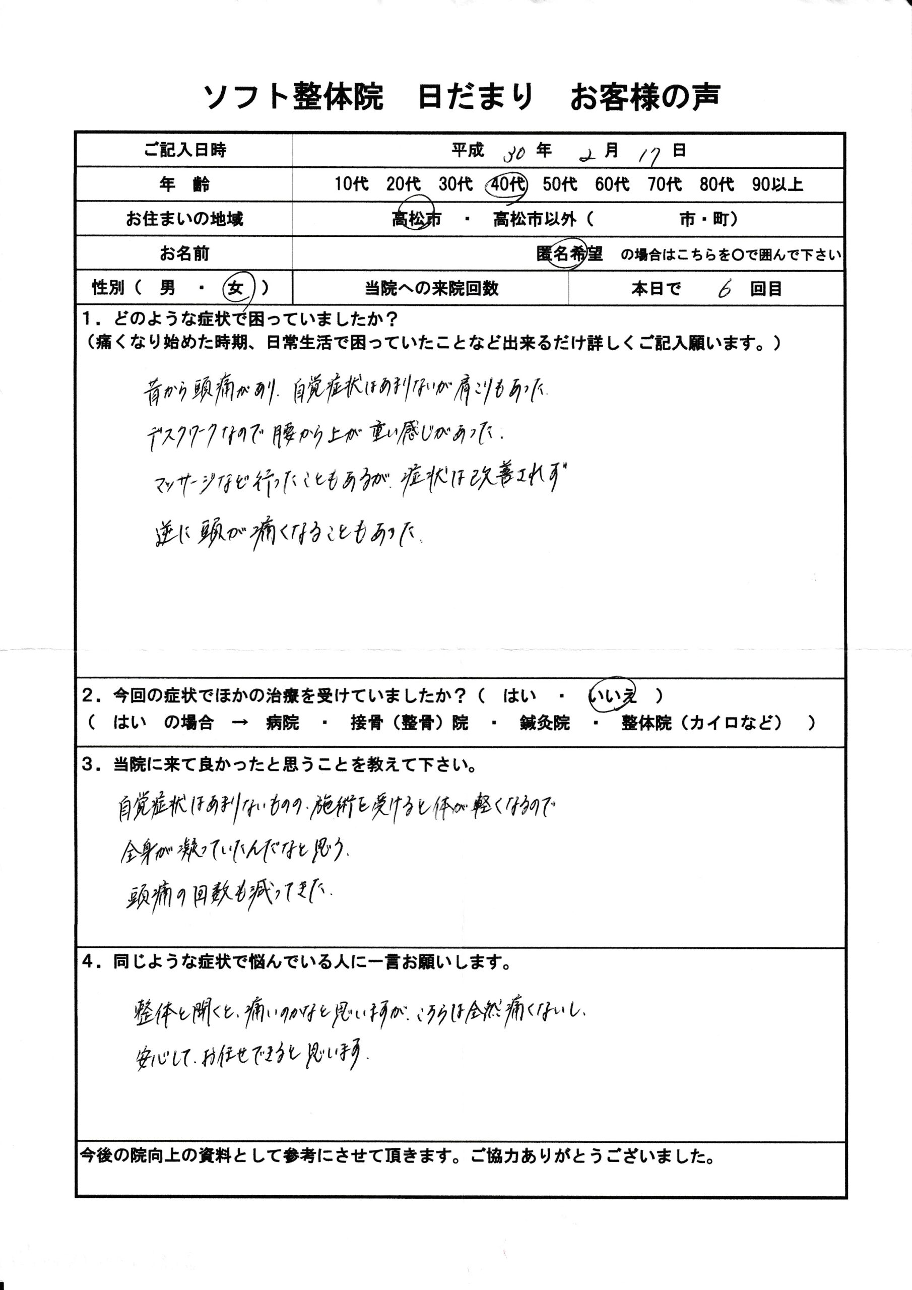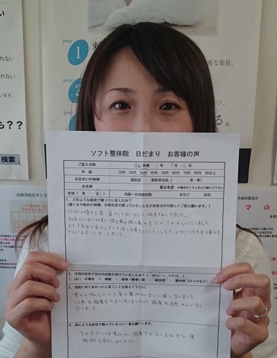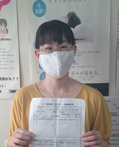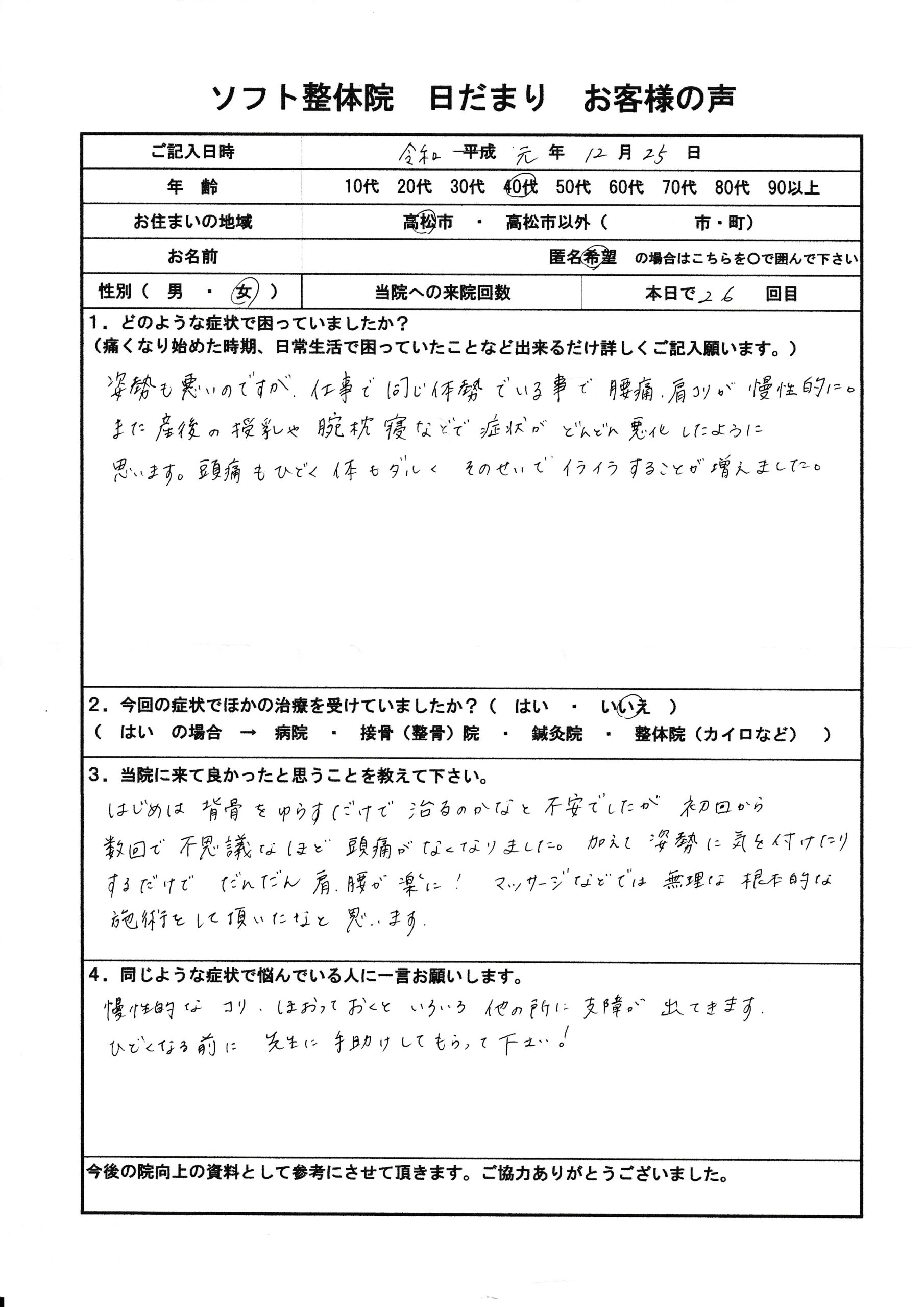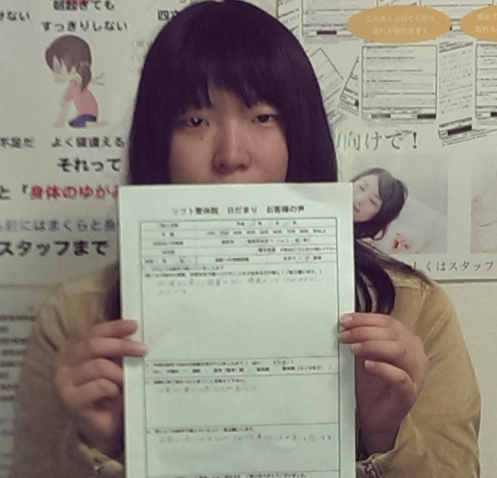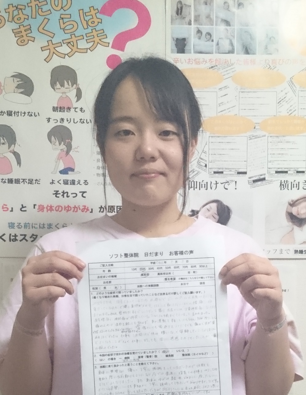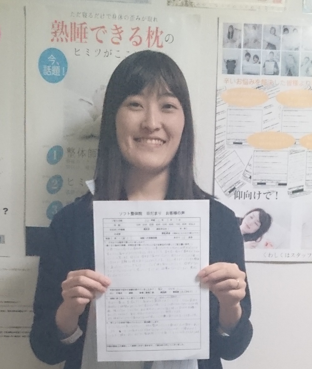 腰痛は、まだ時々ありますが、以前のようにひどく痛むことはなくなりました。首のこり、頭痛もすごく楽になって、まだ首がこることは時々ありますが、頭痛はしなくなりました。姿勢や歩き方、イス、布団、枕の硬さなど、日常生活で体がゆがまないように気をつけなければいけないことを教えてくださるので、有難いです。
