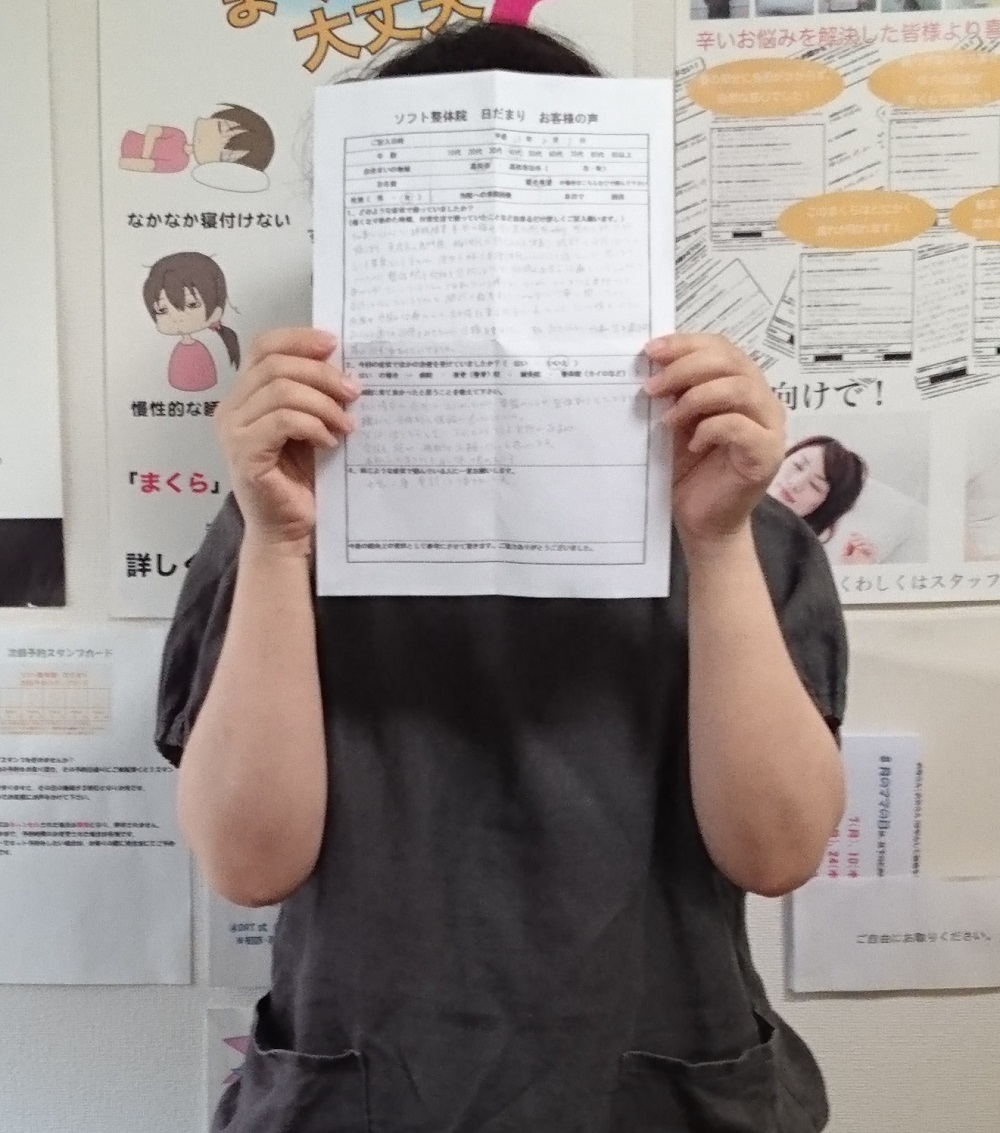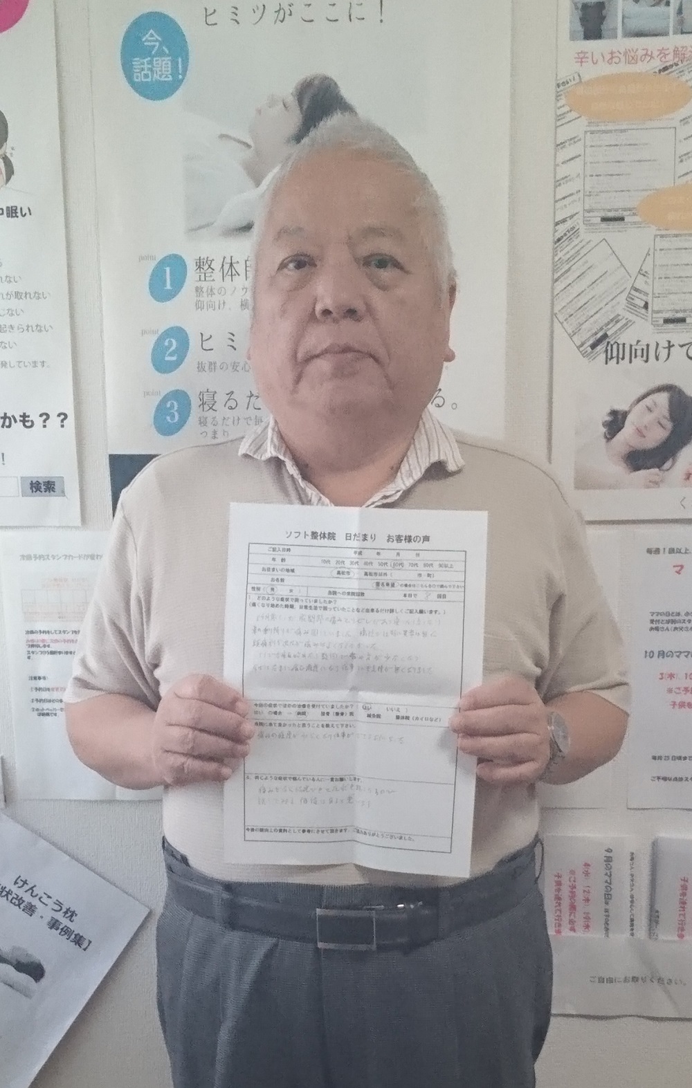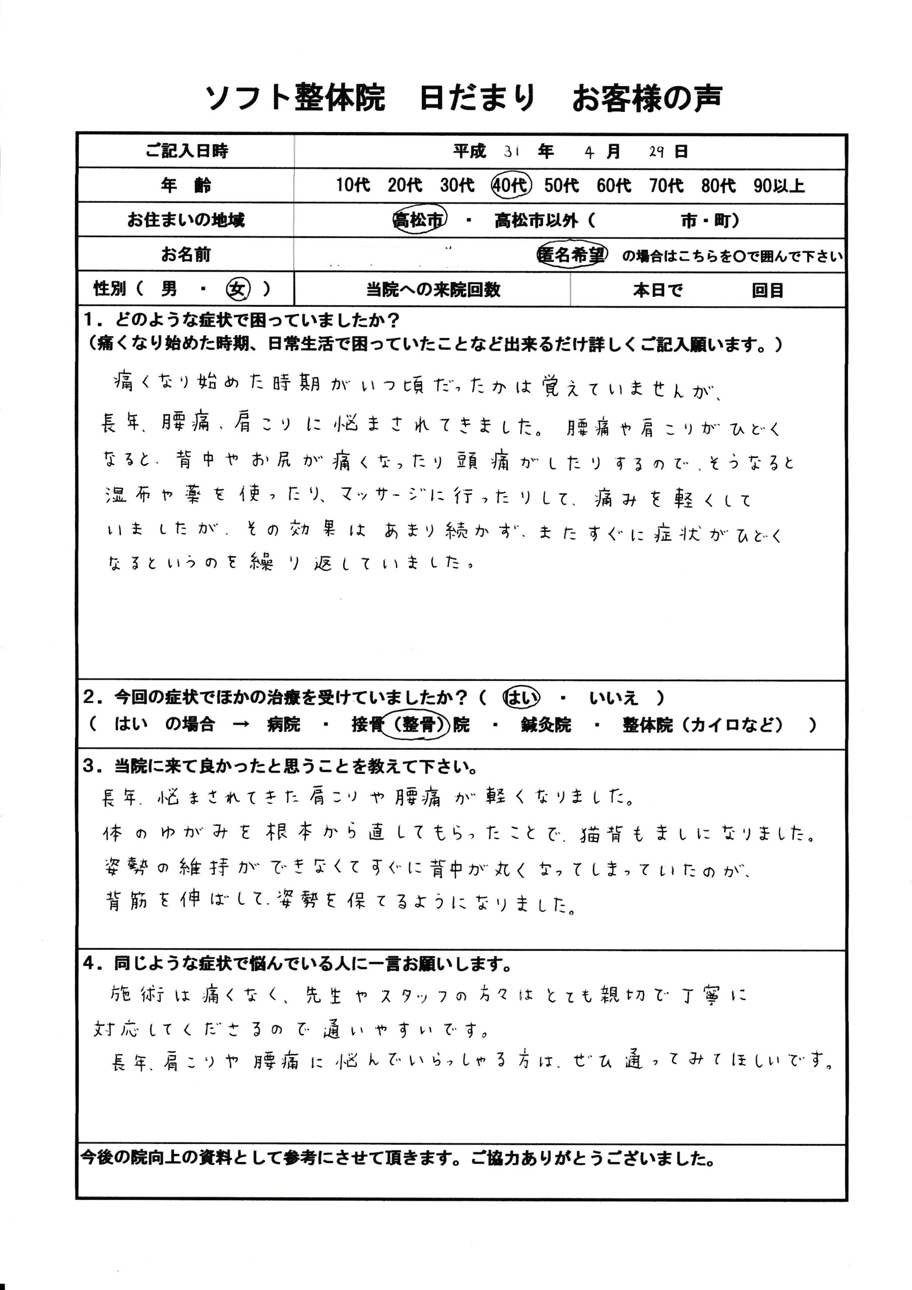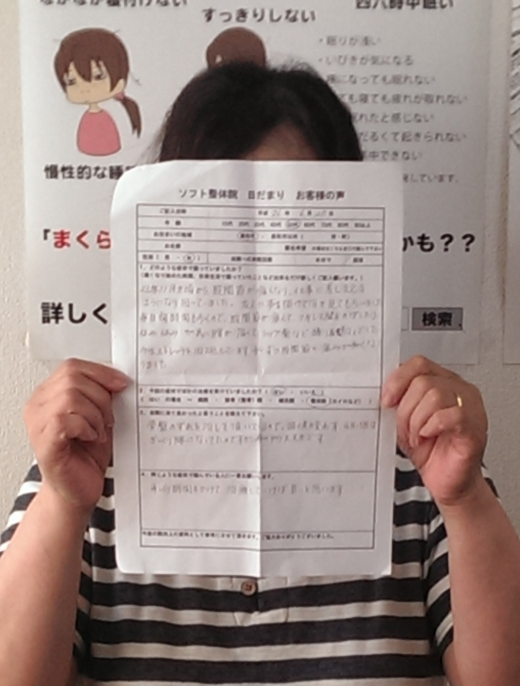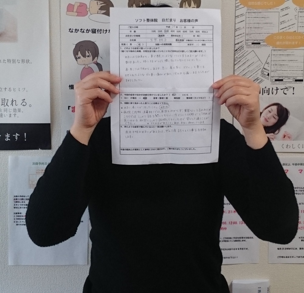 腰痛は、まだ時々ありますが、以前のようにひどく痛むことはなくなりました。首のこり、頭痛もすごく楽になって、まだ首がこることは時々ありますが、頭痛はしなくなりました。姿勢や歩き方、イス、布団、枕の硬さなど、日常生活で体がゆがまないように気をつけなければいけないことを教えてくださるので、有難いです。