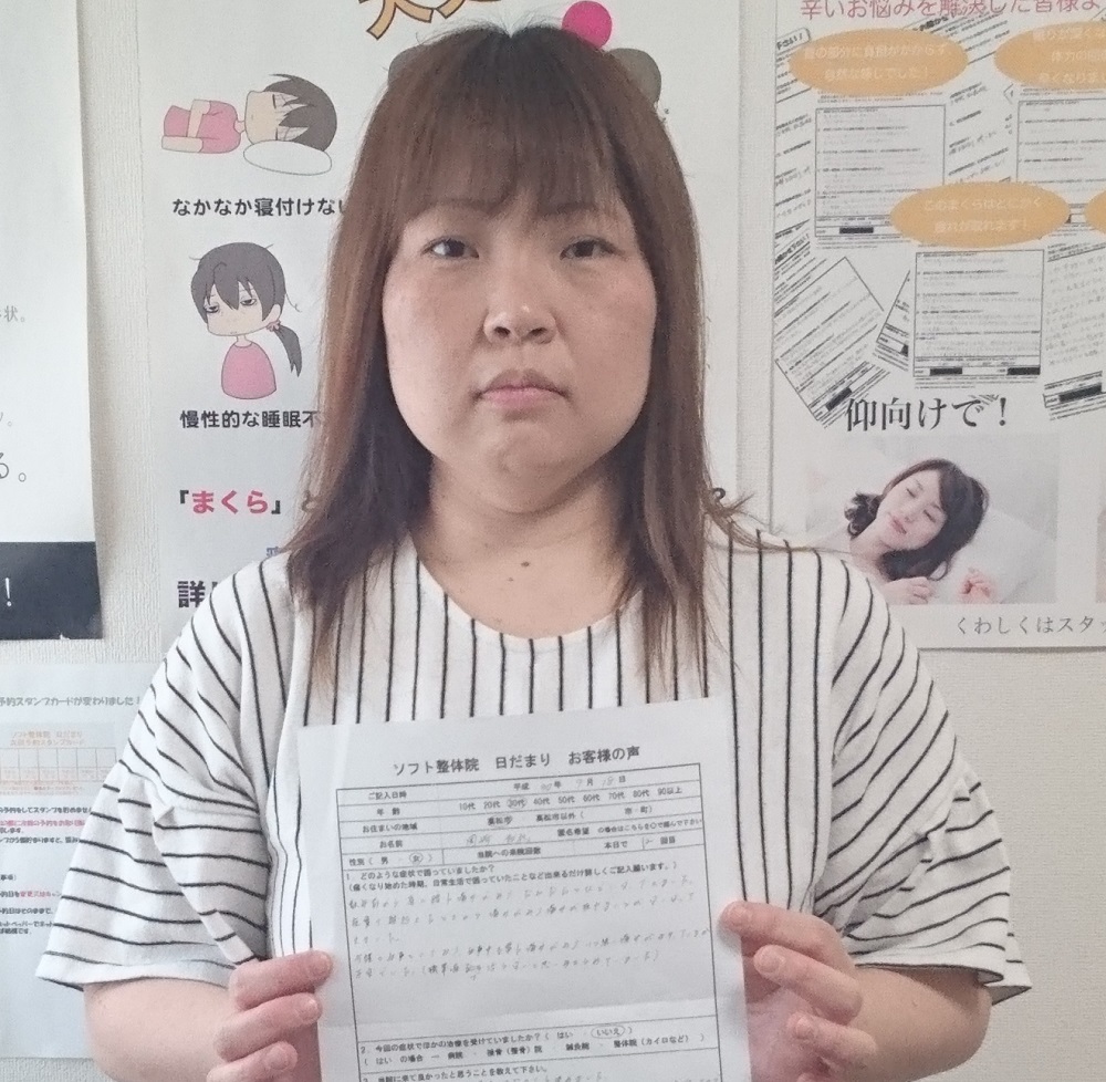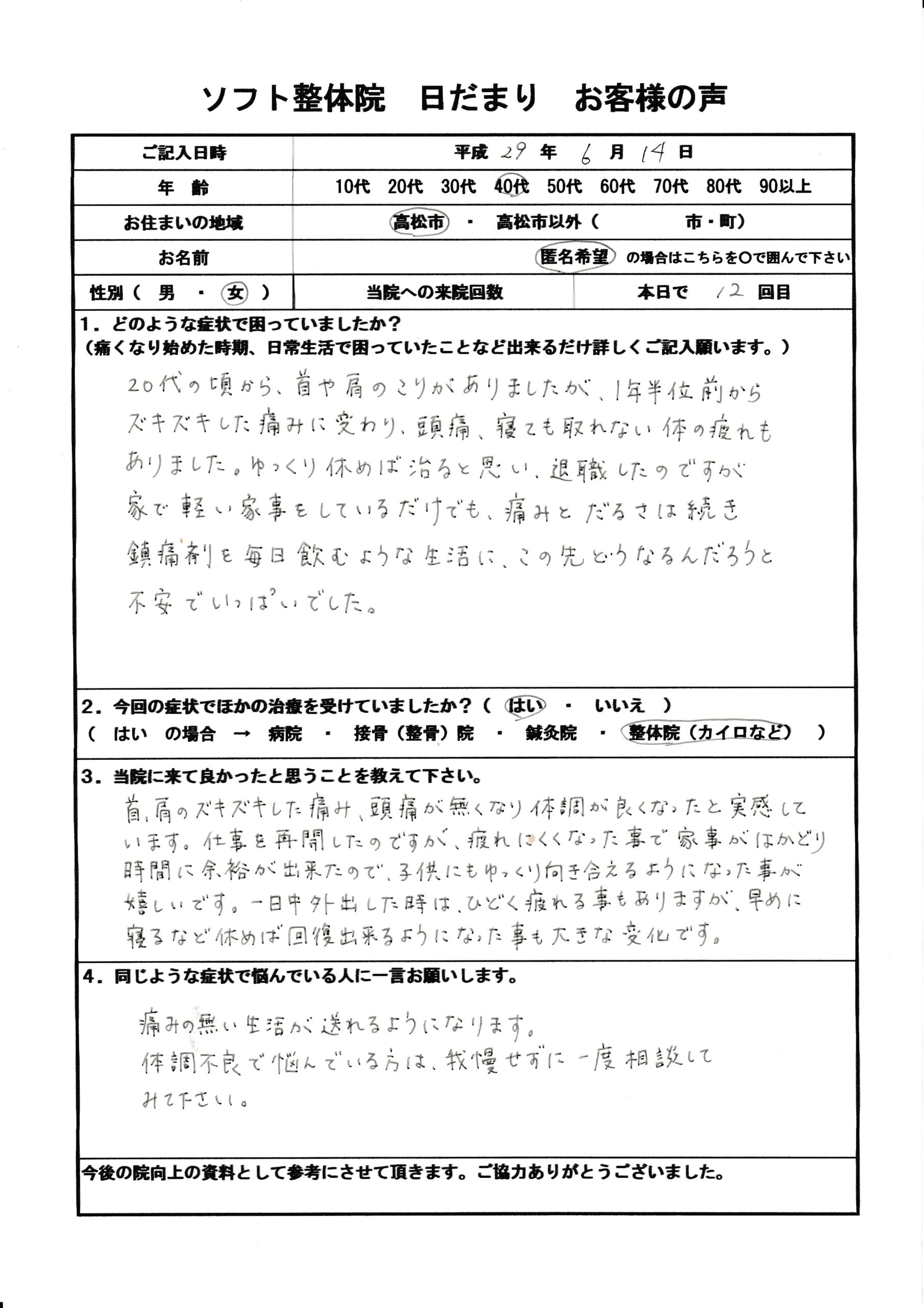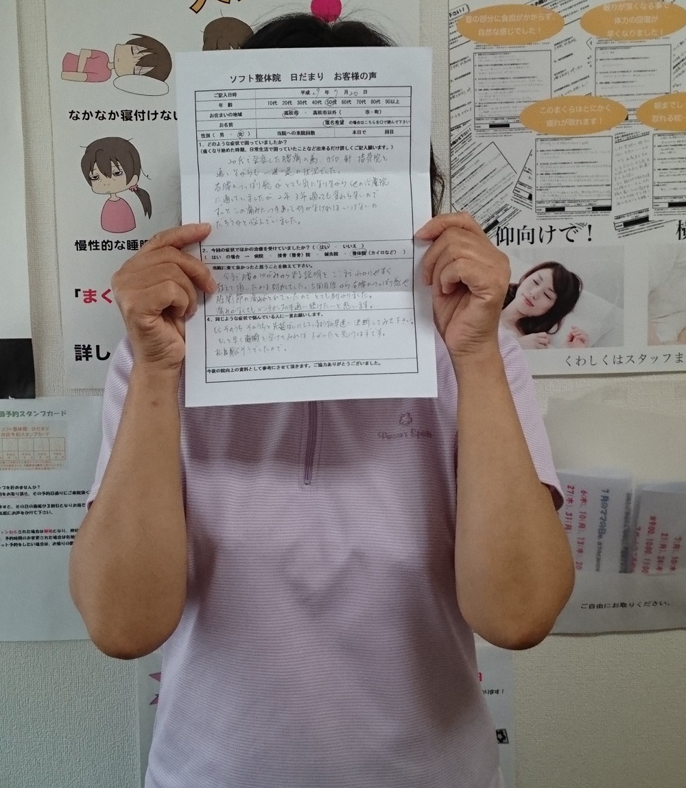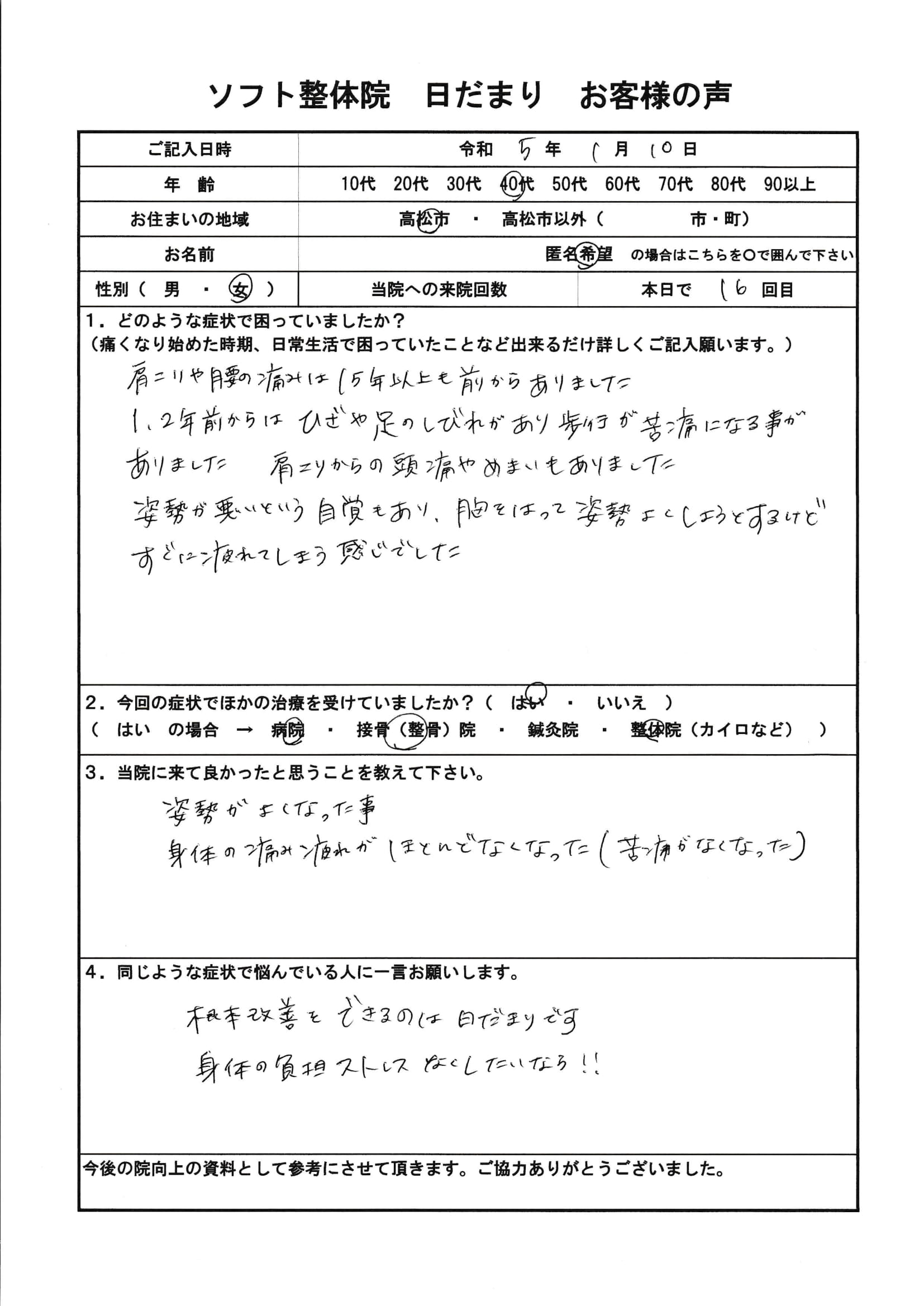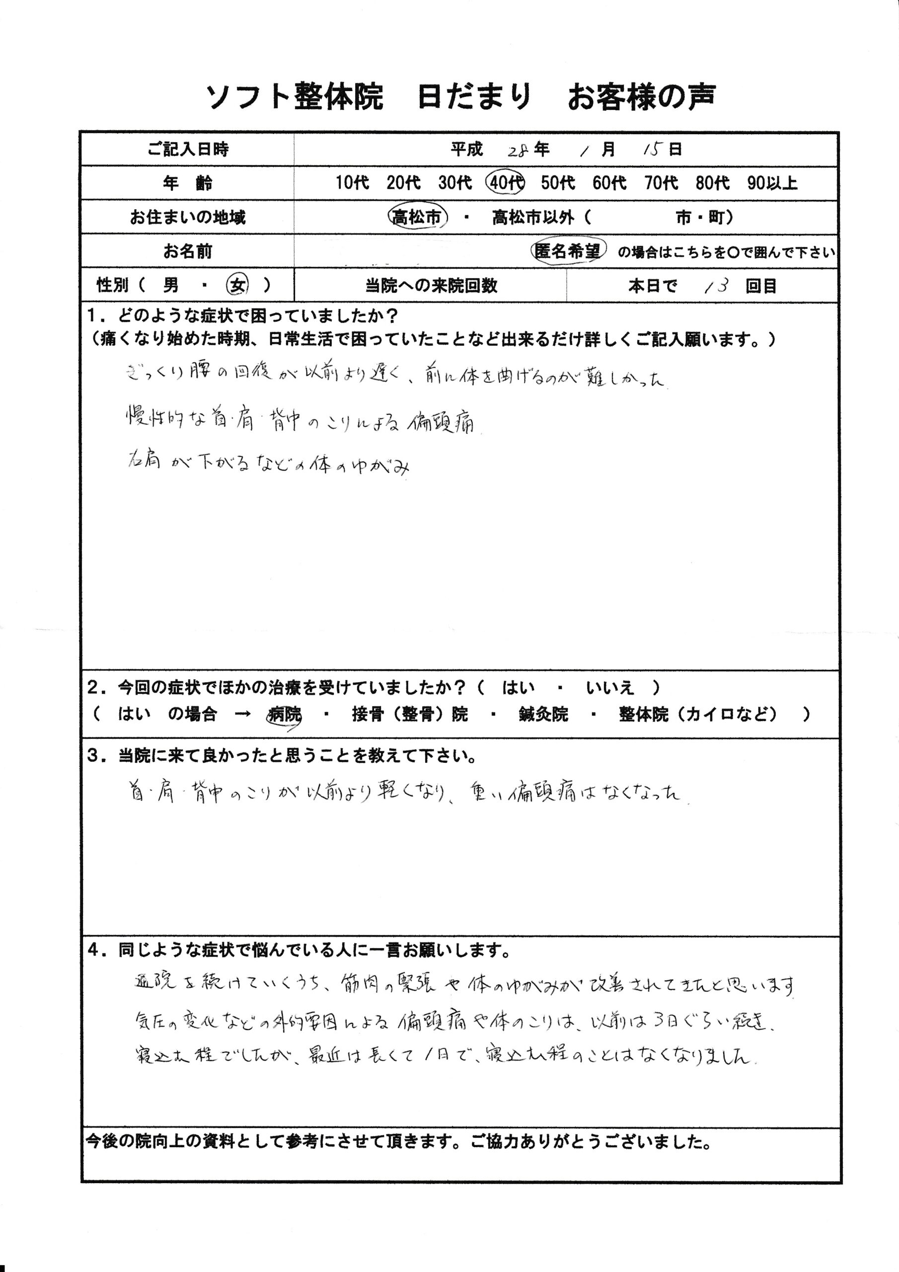 腰痛は、まだ時々ありますが、以前のようにひどく痛むことはなくなりました。首のこり、頭痛もすごく楽になって、まだ首がこることは時々ありますが、頭痛はしなくなりました。姿勢や歩き方、イス、布団、枕の硬さなど、日常生活で体がゆがまないように気をつけなければいけないことを教えてくださるので、有難いです。