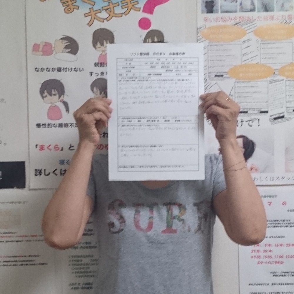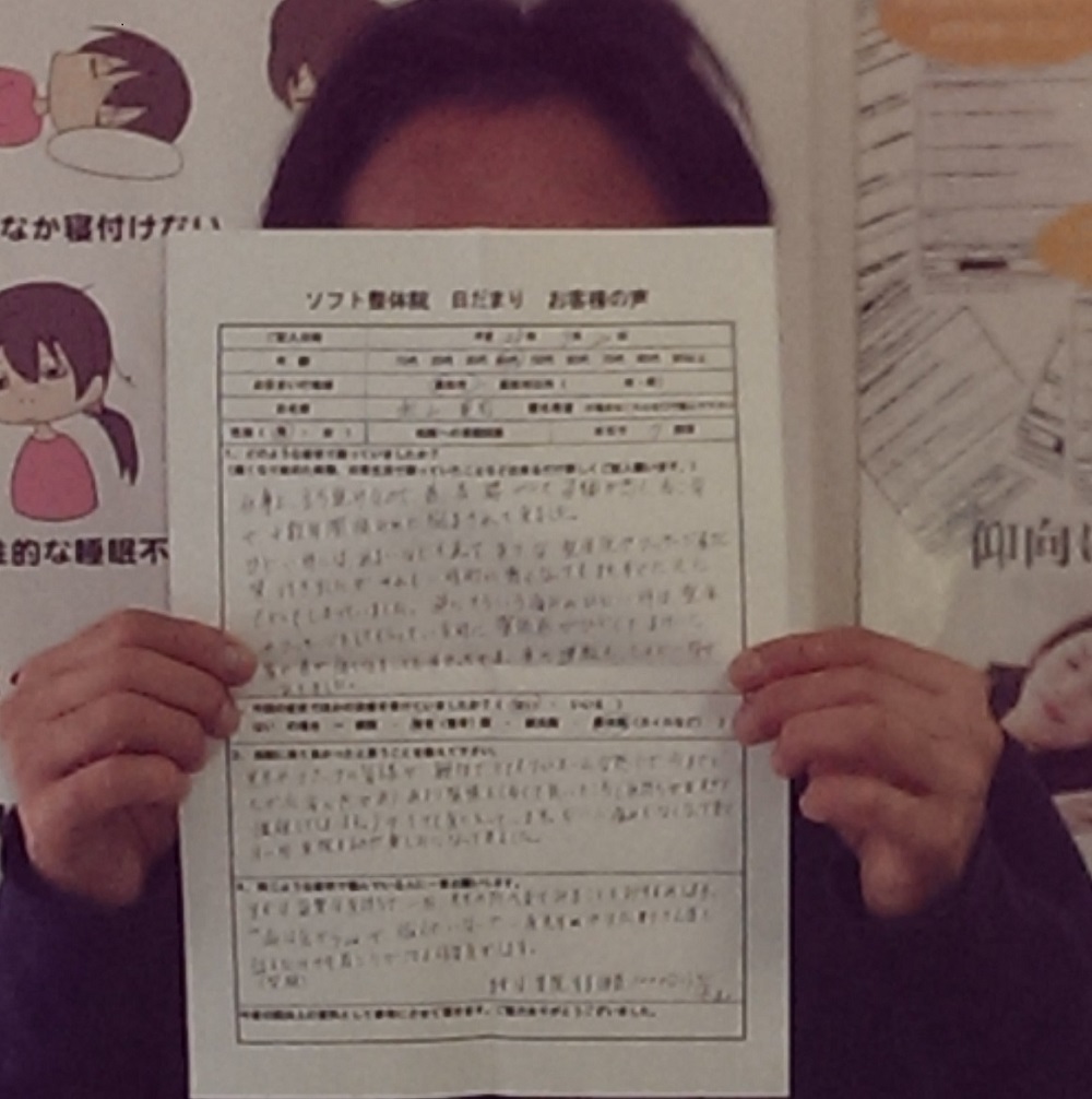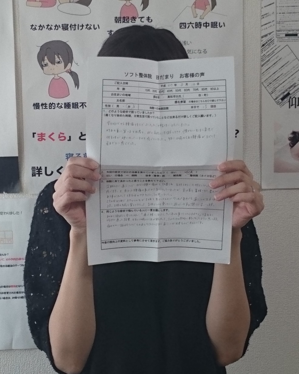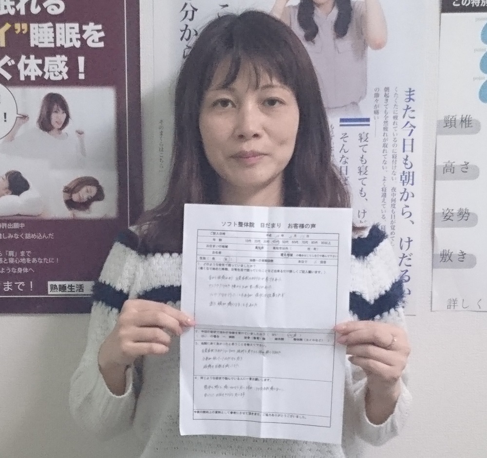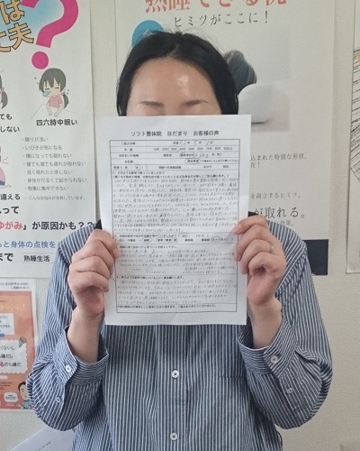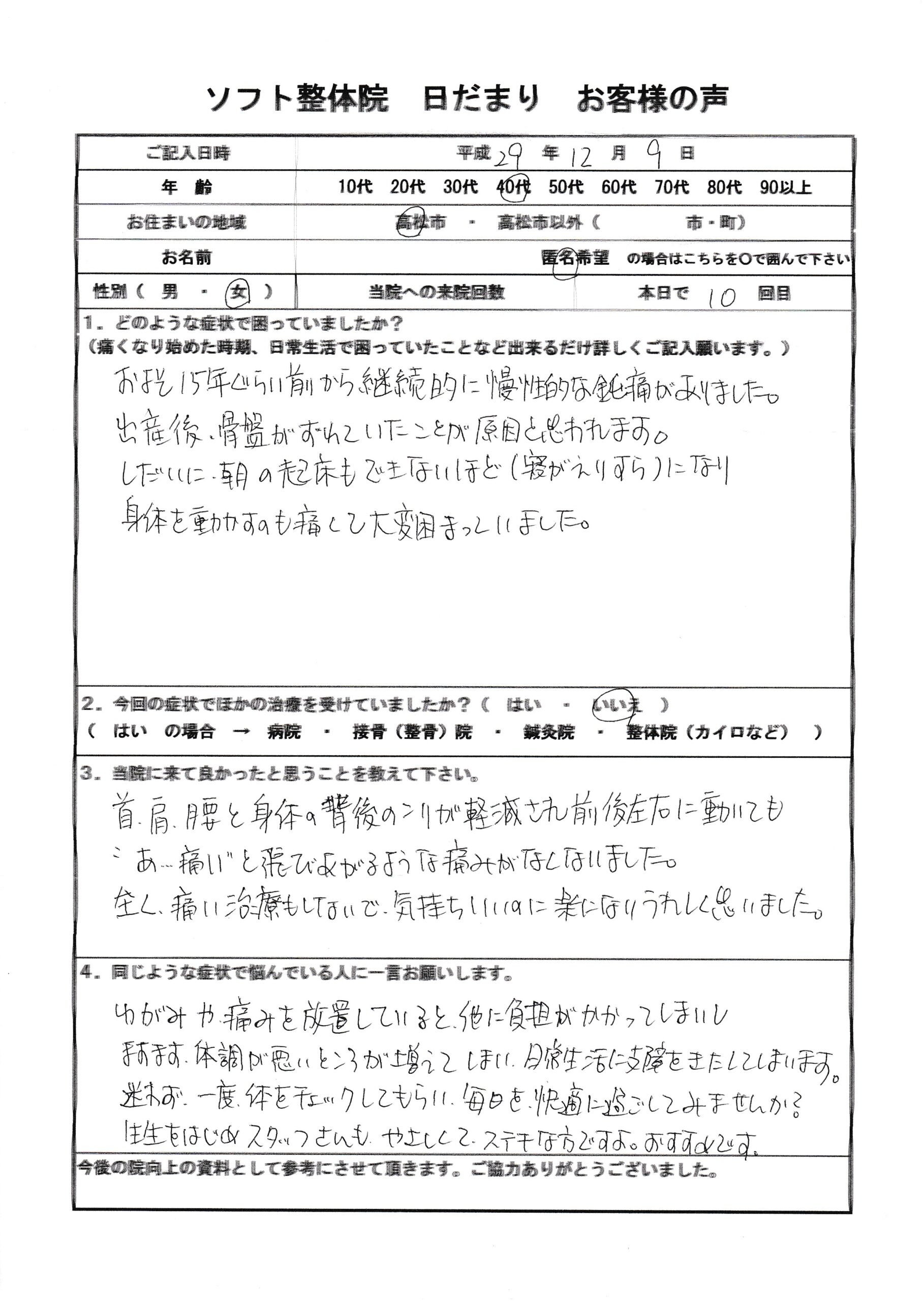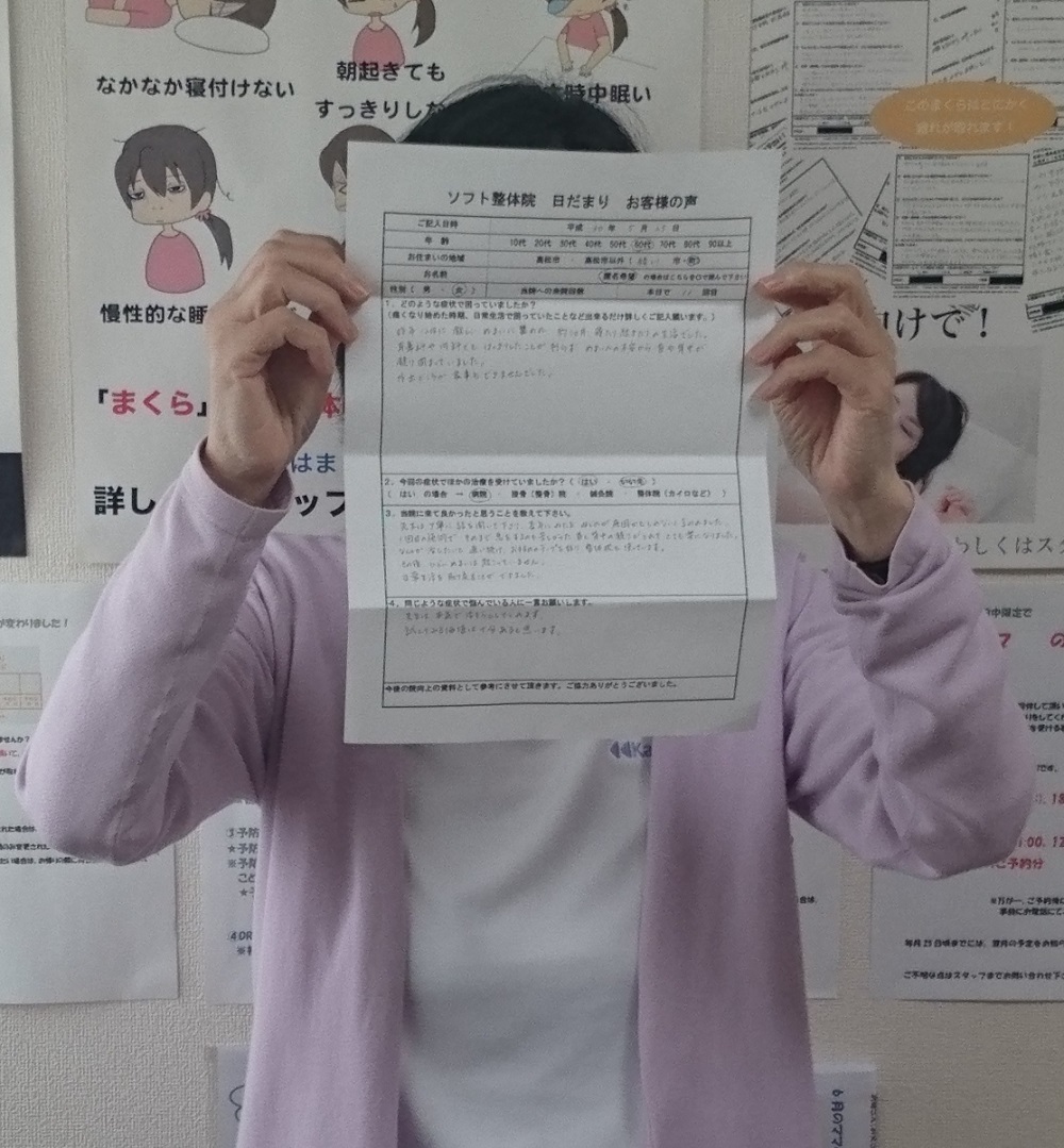 腰痛は、まだ時々ありますが、以前のようにひどく痛むことはなくなりました。首のこり、頭痛もすごく楽になって、まだ首がこることは時々ありますが、頭痛はしなくなりました。姿勢や歩き方、イス、布団、枕の硬さなど、日常生活で体がゆがまないように気をつけなければいけないことを教えてくださるので、有難いです。