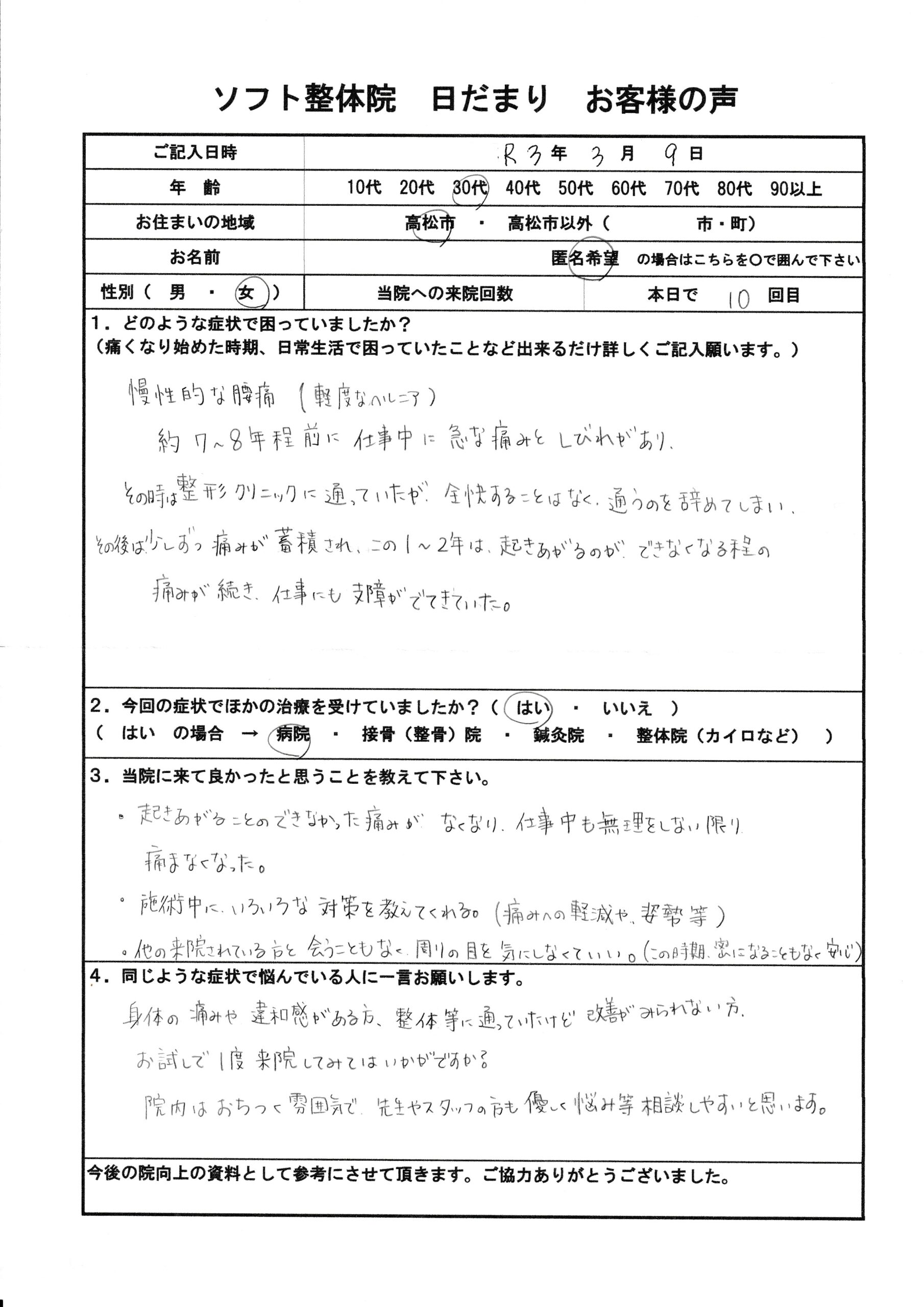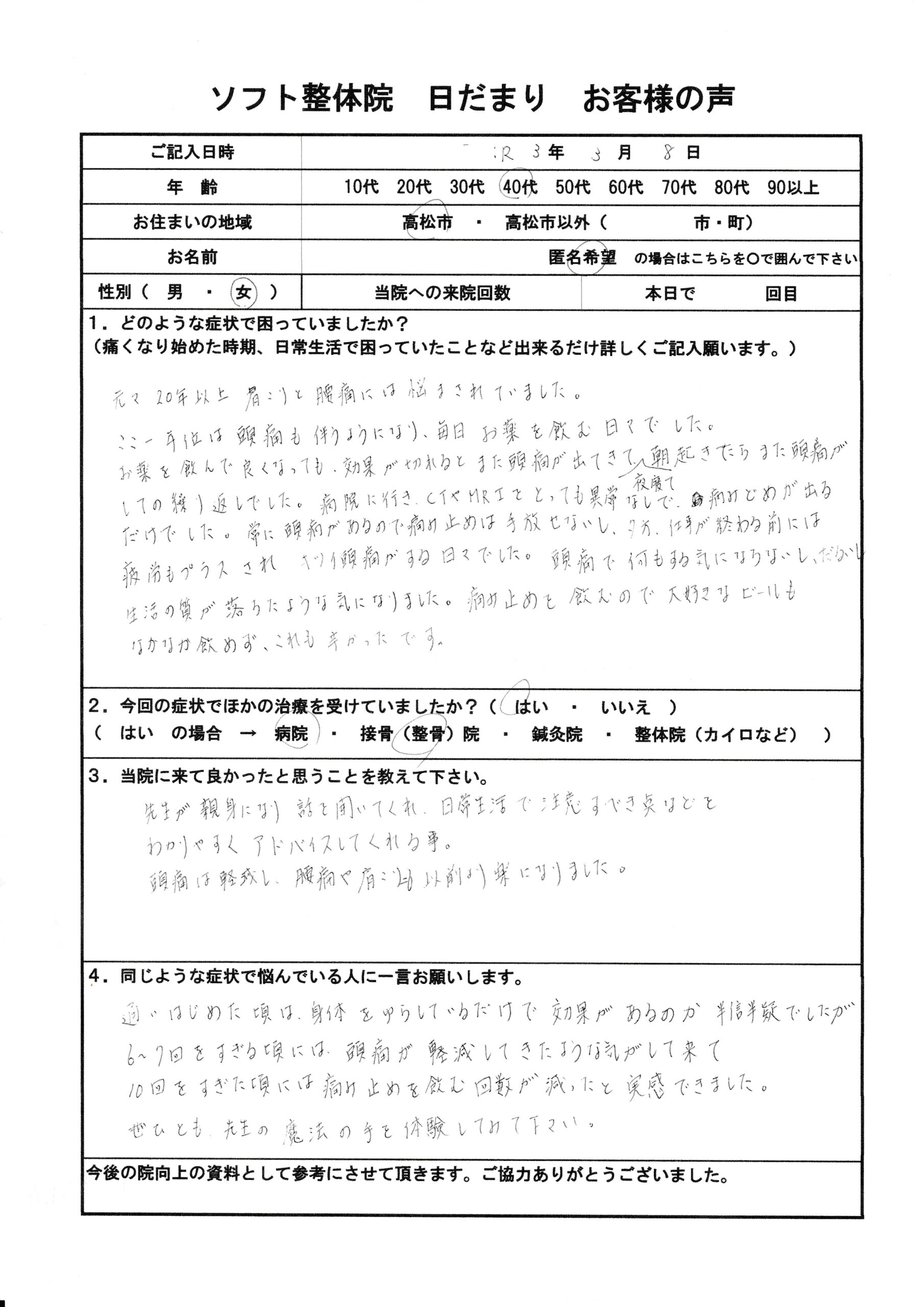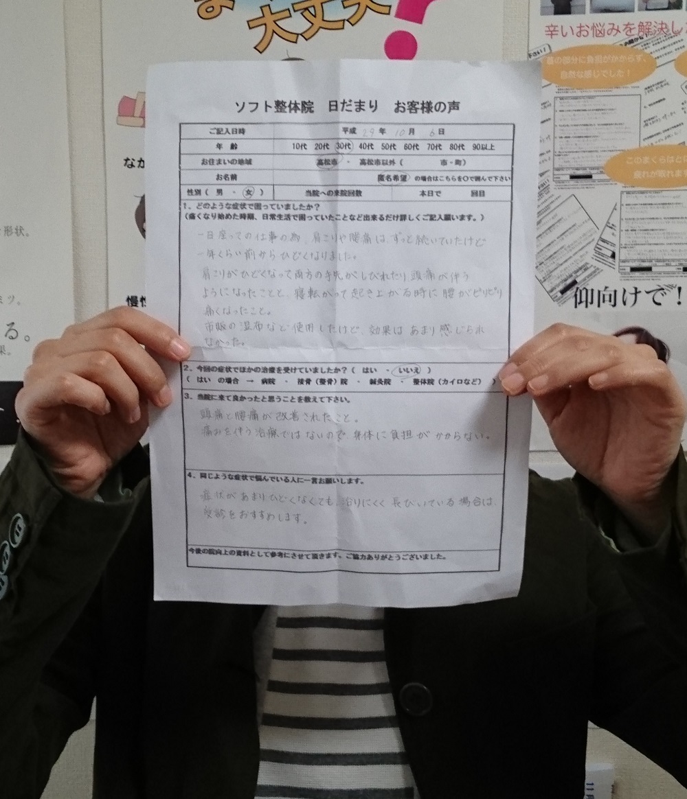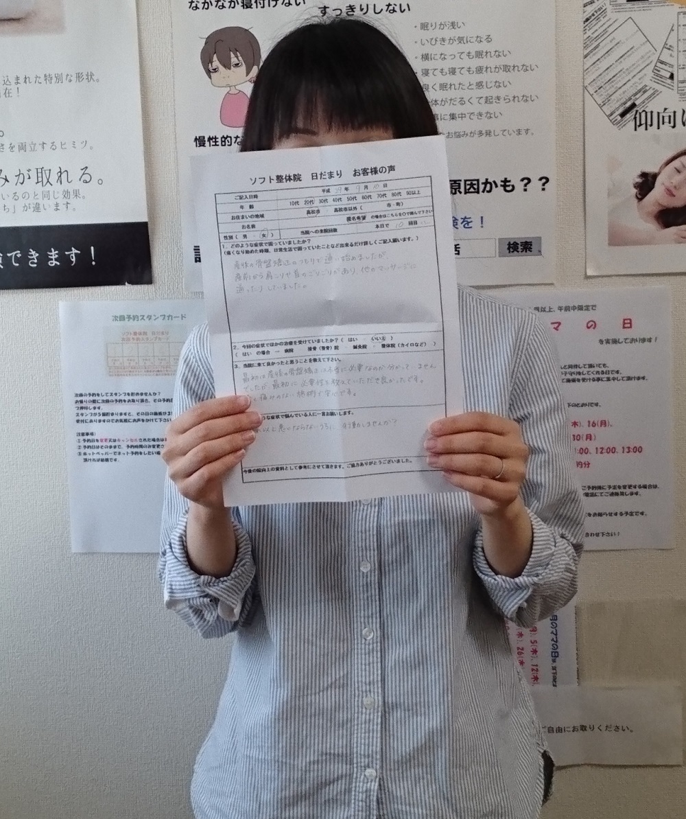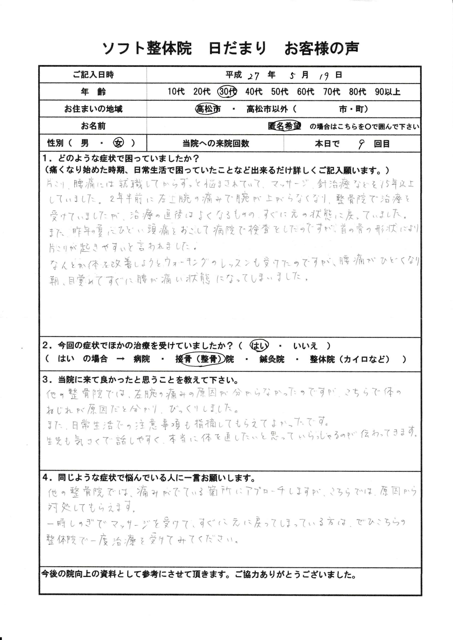 腰痛は、まだ時々ありますが、以前のようにひどく痛むことはなくなりました。首のこり、頭痛もすごく楽になって、まだ首がこることは時々ありますが、頭痛はしなくなりました。姿勢や歩き方、イス、布団、枕の硬さなど、日常生活で体がゆがまないように気をつけなければいけないことを教えてくださるので、有難いです。