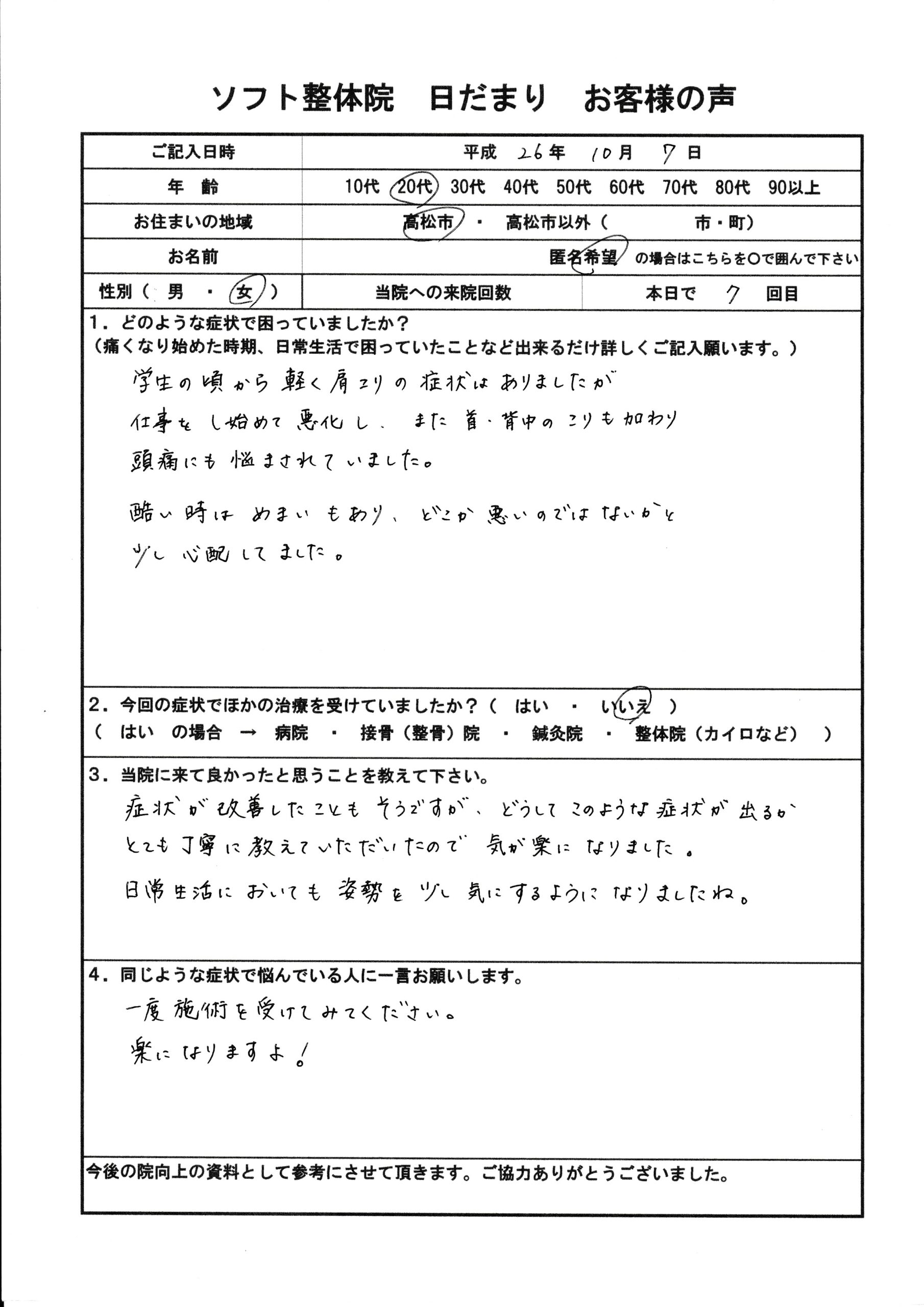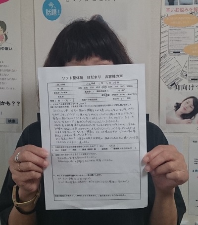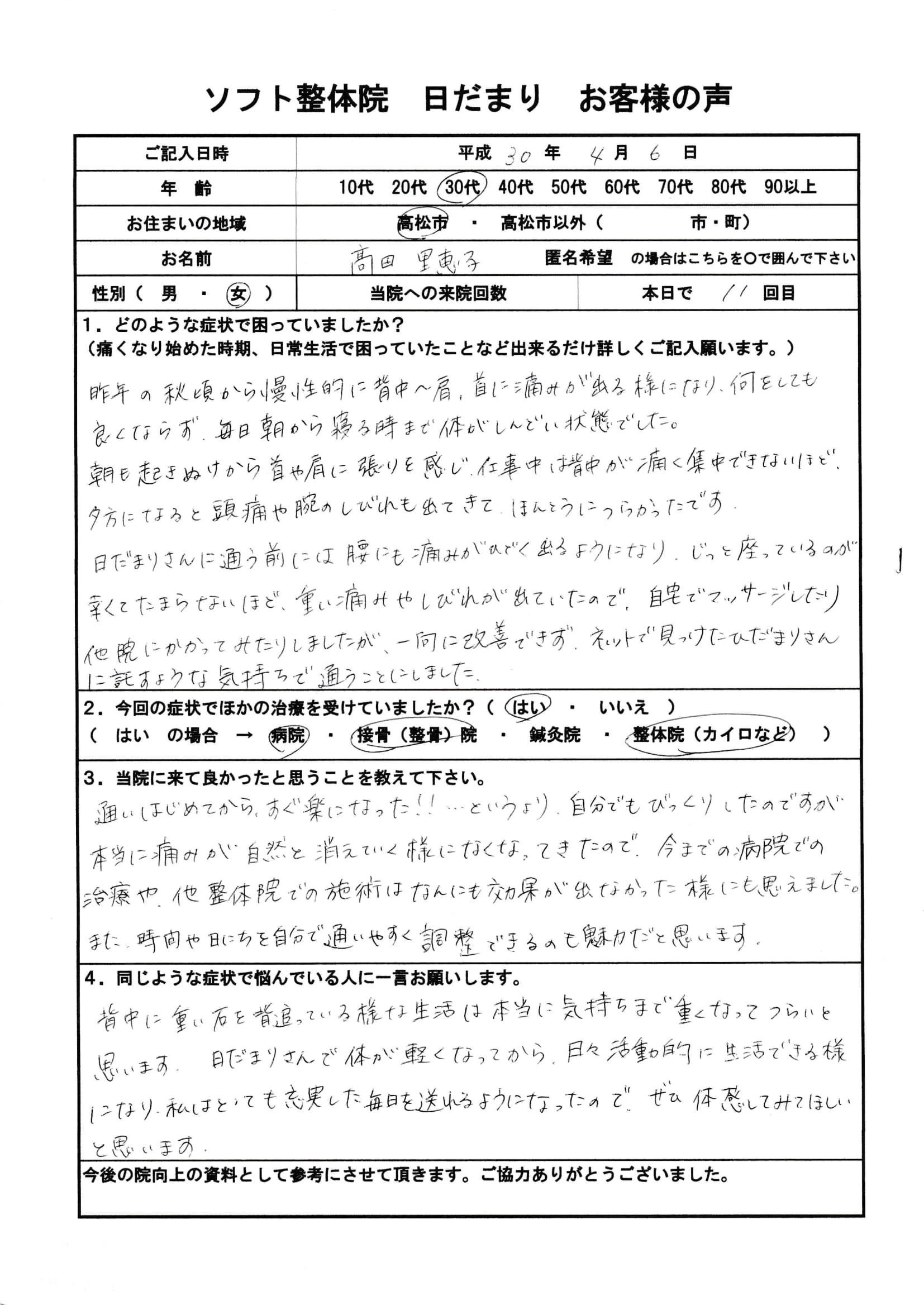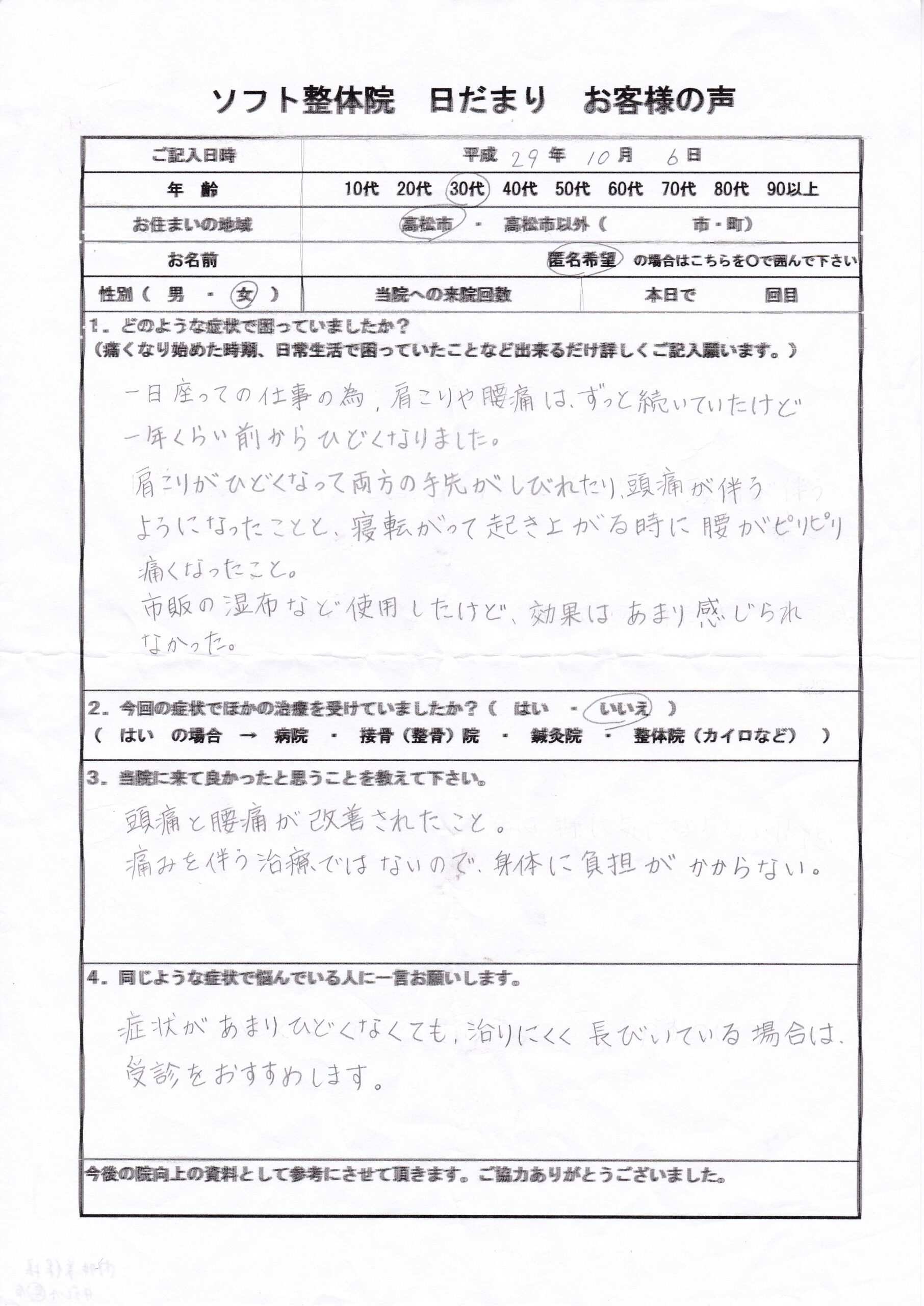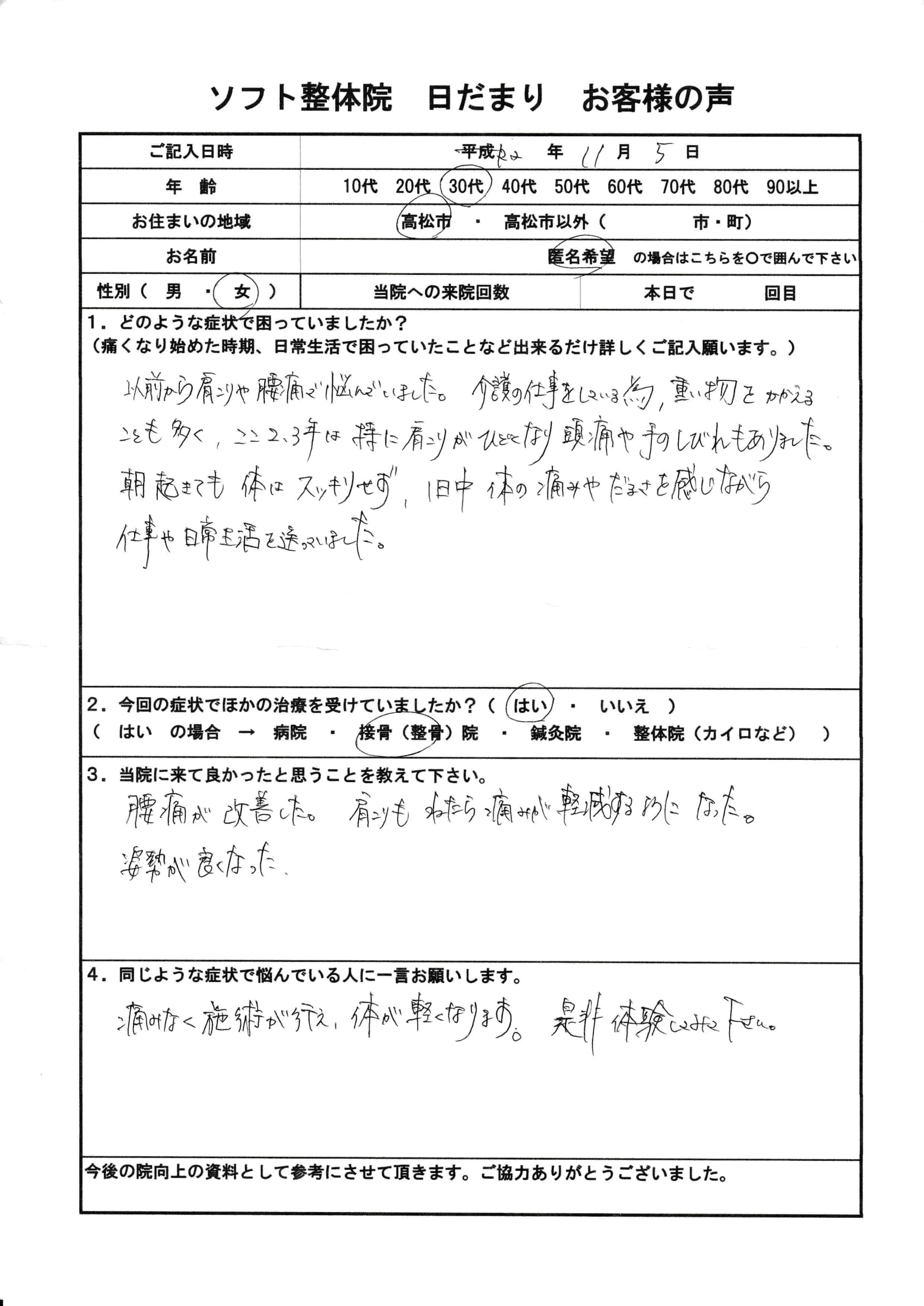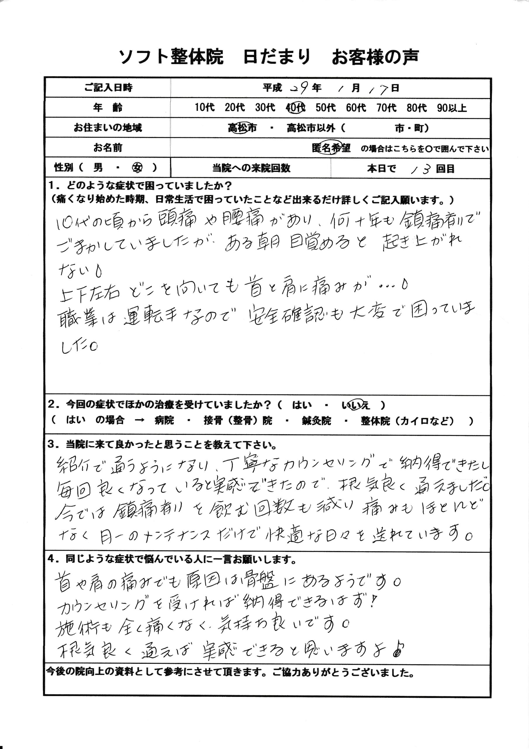 腰痛は、まだ時々ありますが、以前のようにひどく痛むことはなくなりました。首のこり、頭痛もすごく楽になって、まだ首がこることは時々ありますが、頭痛はしなくなりました。姿勢や歩き方、イス、布団、枕の硬さなど、日常生活で体がゆがまないように気をつけなければいけないことを教えてくださるので、有難いです。