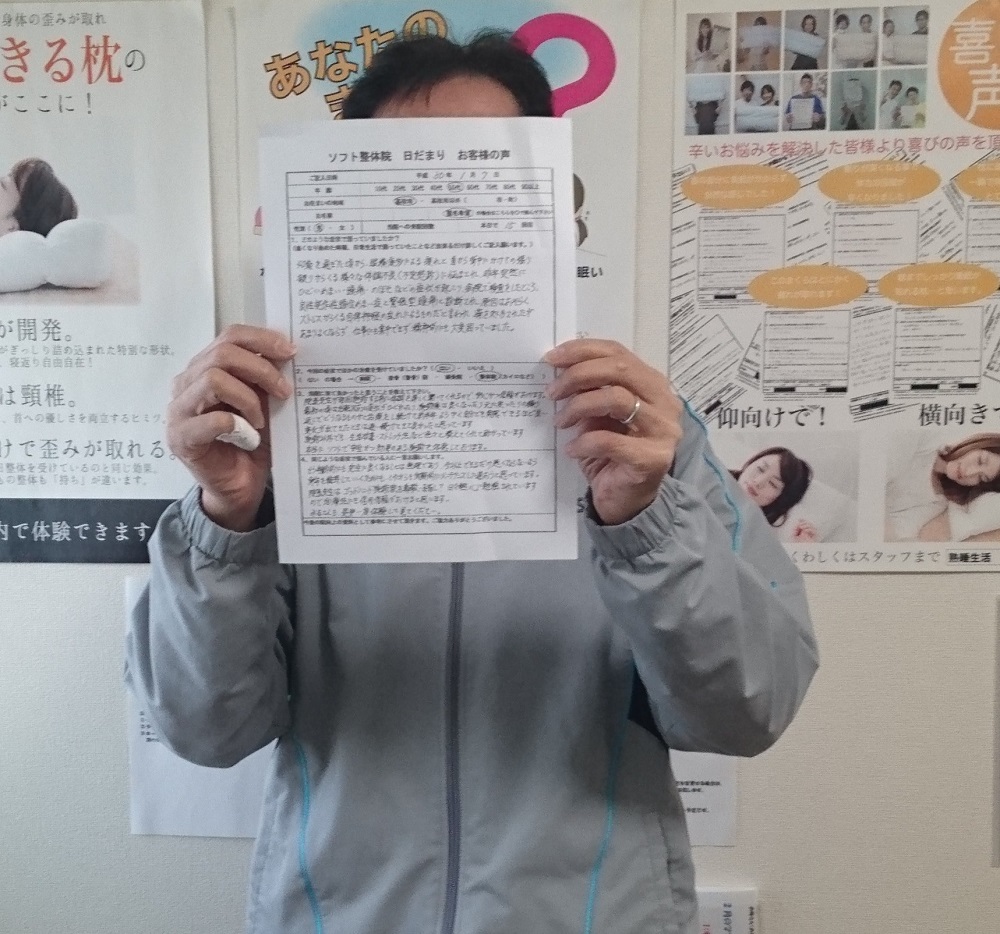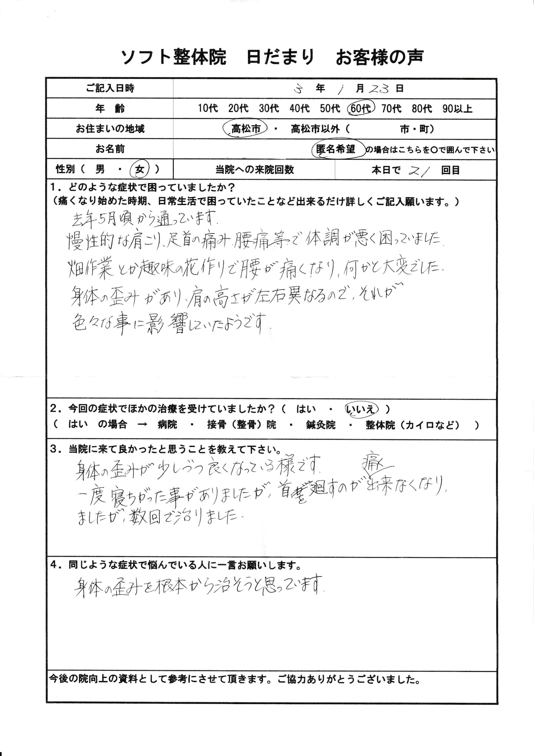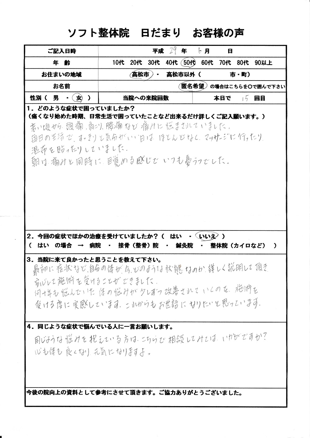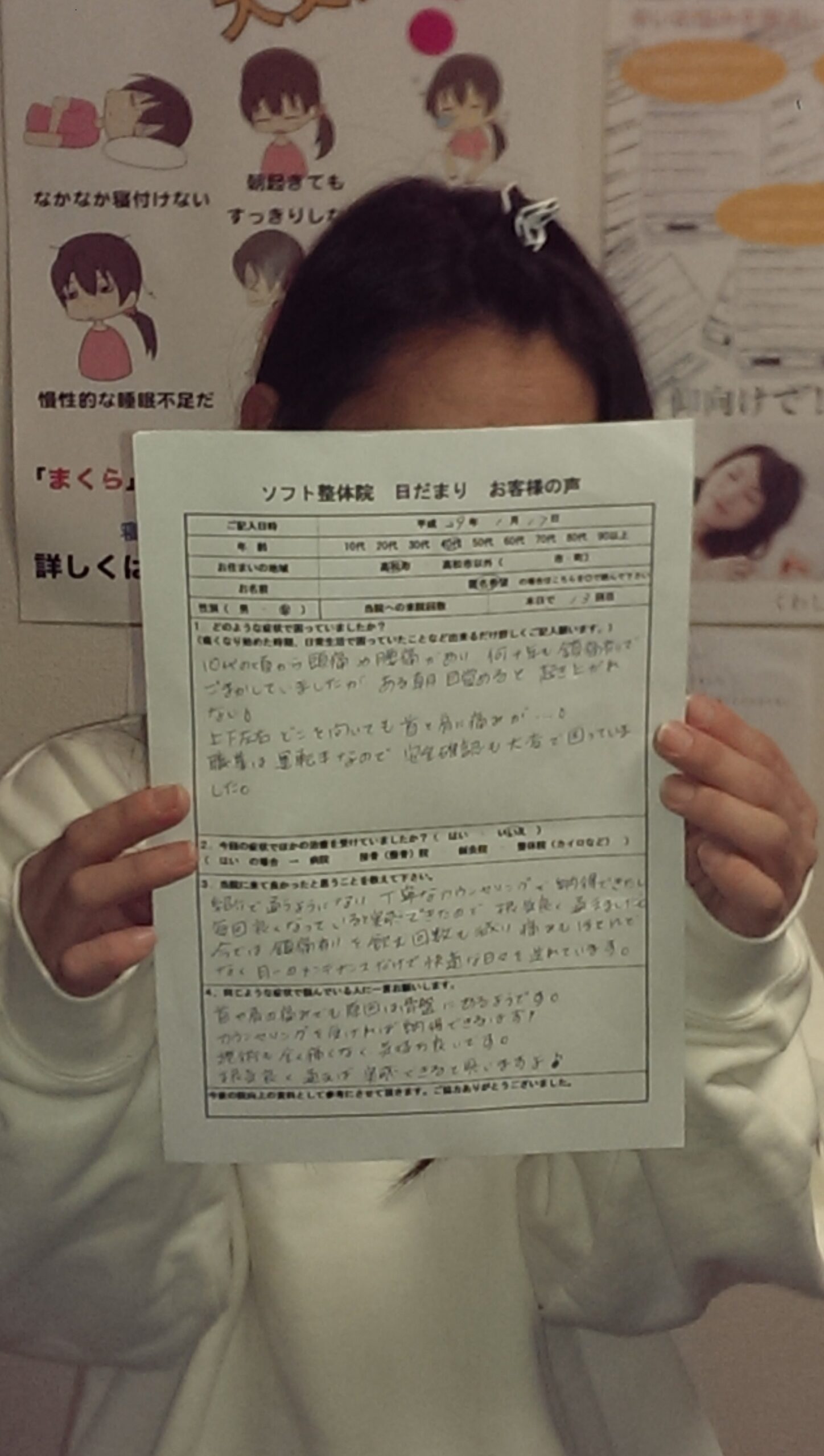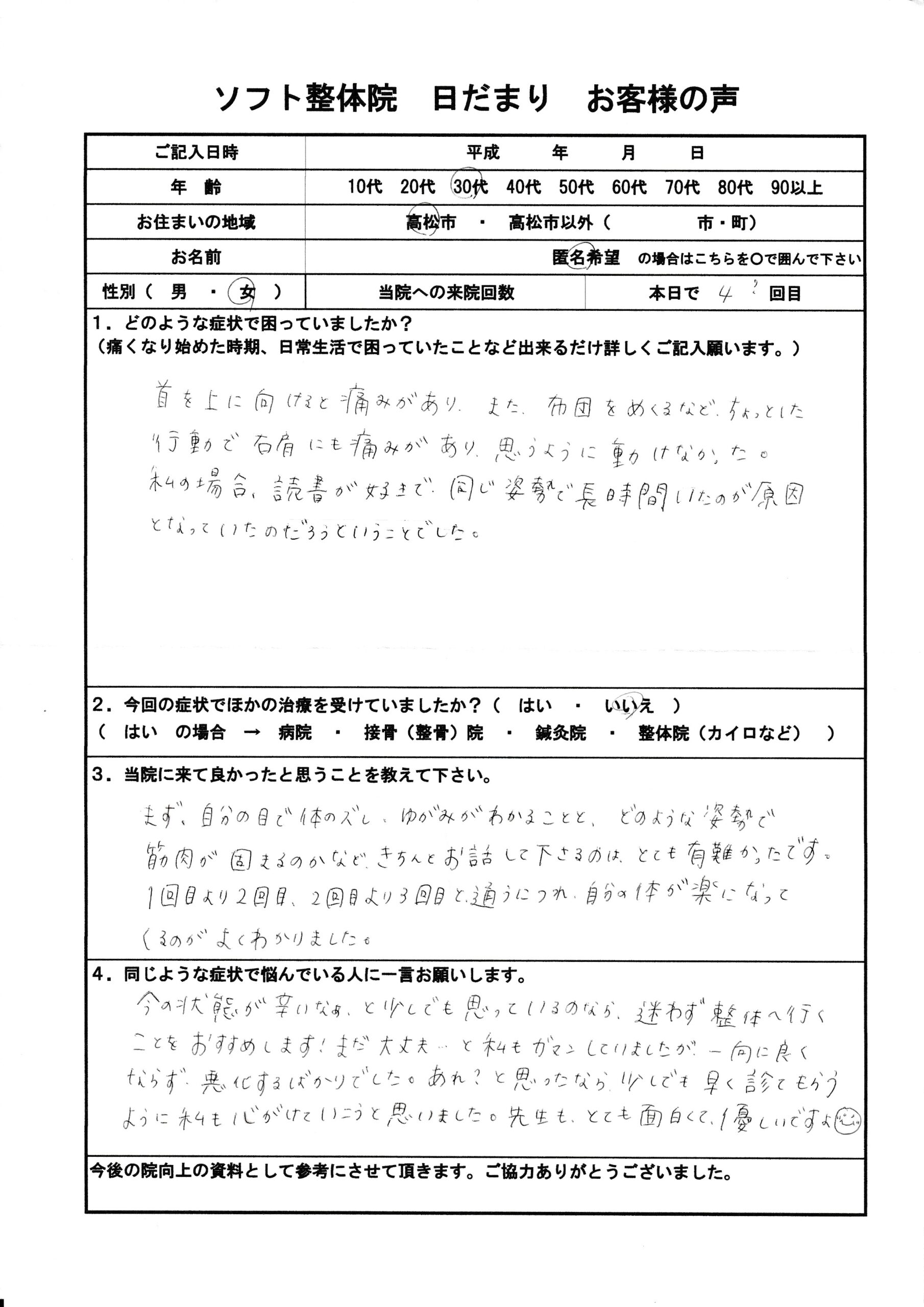 腰痛は、まだ時々ありますが、以前のようにひどく痛むことはなくなりました。首のこり、頭痛もすごく楽になって、まだ首がこることは時々ありますが、頭痛はしなくなりました。姿勢や歩き方、イス、布団、枕の硬さなど、日常生活で体がゆがまないように気をつけなければいけないことを教えてくださるので、有難いです。