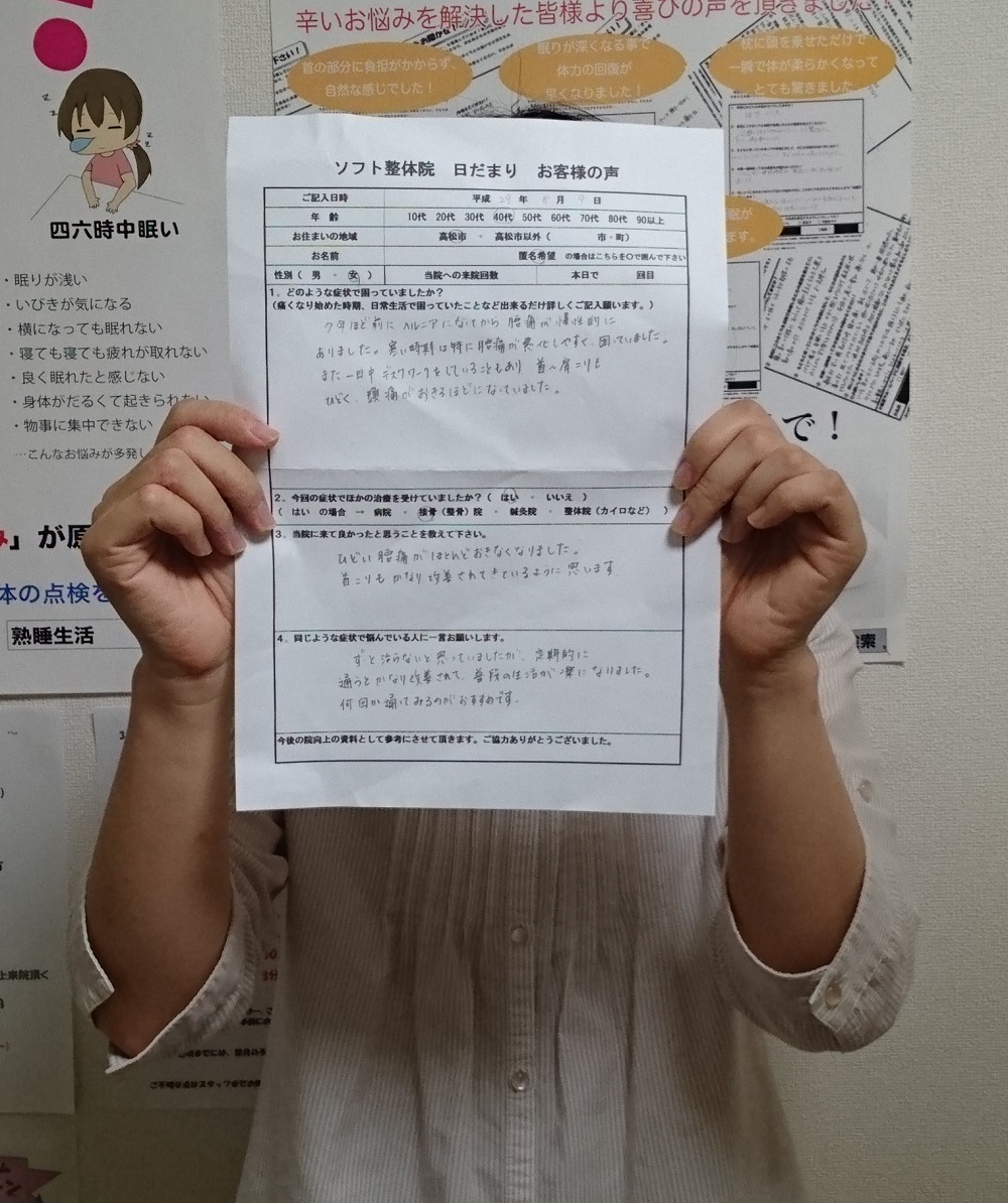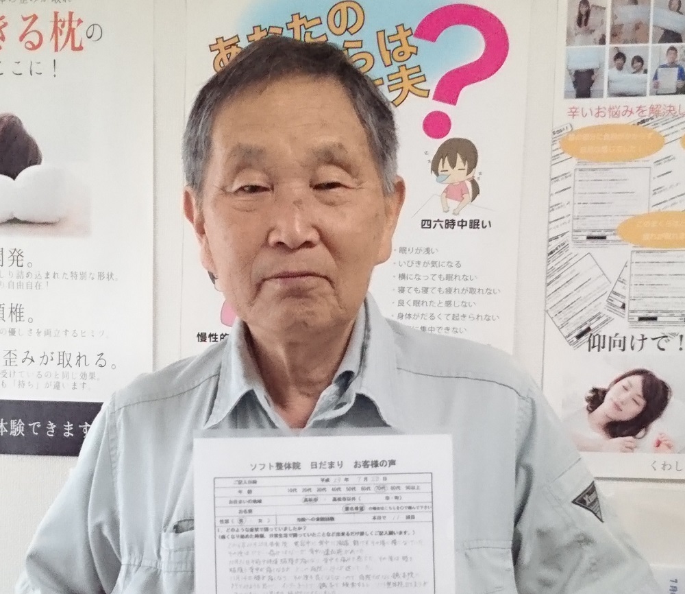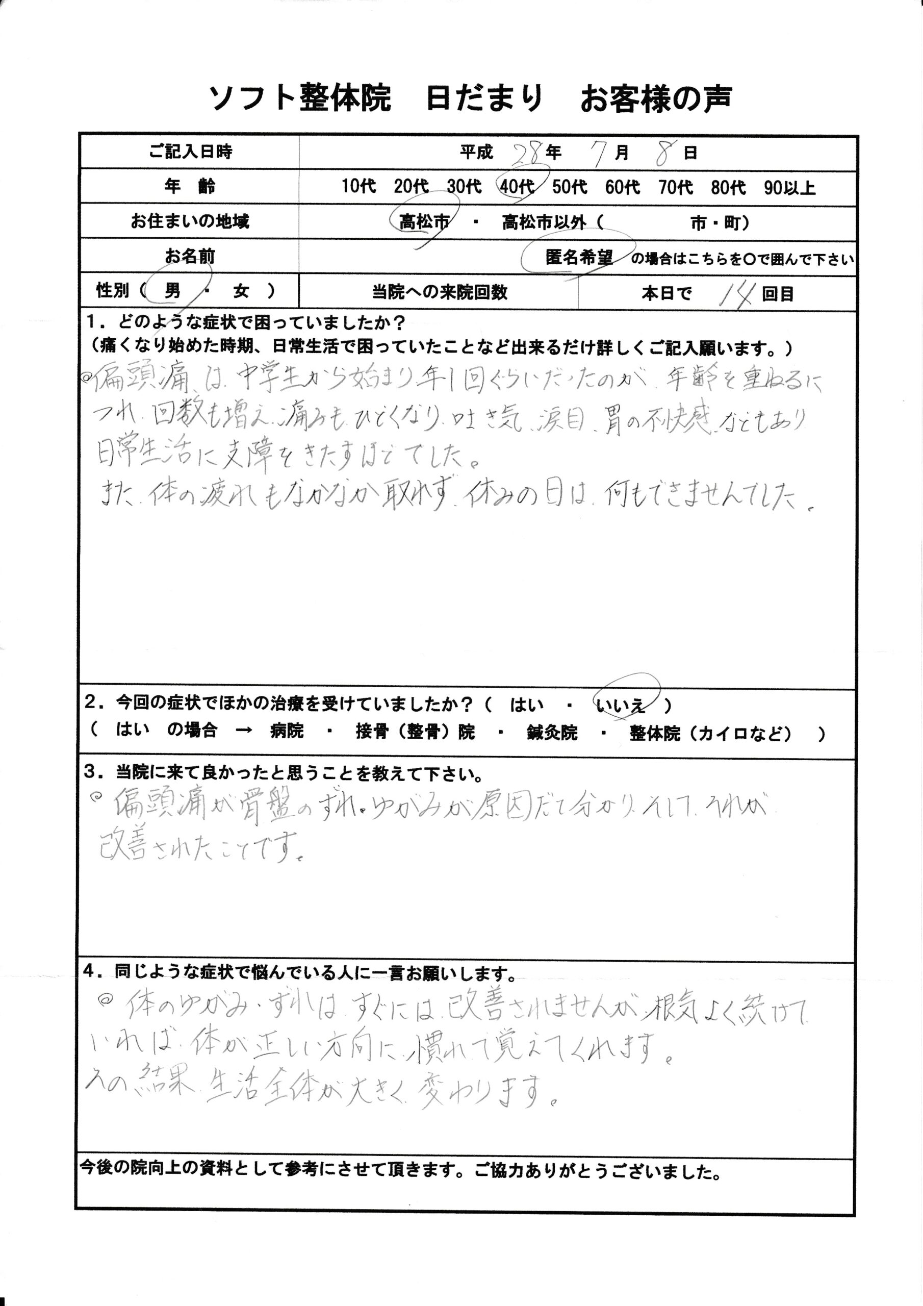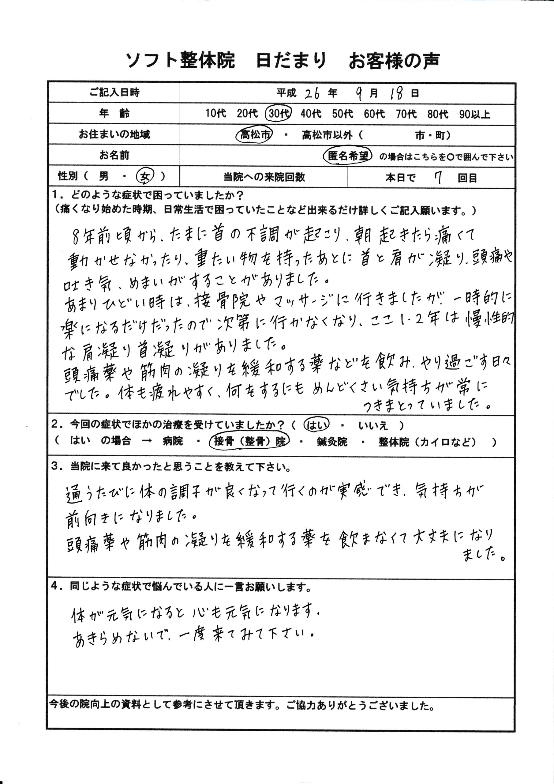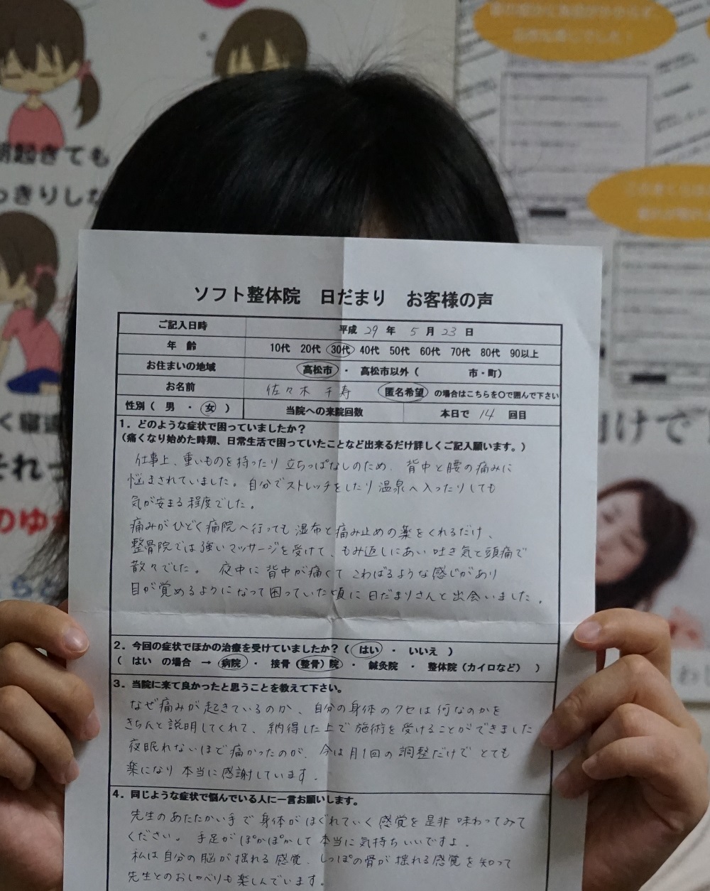 腰痛は、まだ時々ありますが、以前のようにひどく痛むことはなくなりました。首のこり、頭痛もすごく楽になって、まだ首がこることは時々ありますが、頭痛はしなくなりました。姿勢や歩き方、イス、布団、枕の硬さなど、日常生活で体がゆがまないように気をつけなければいけないことを教えてくださるので、有難いです。