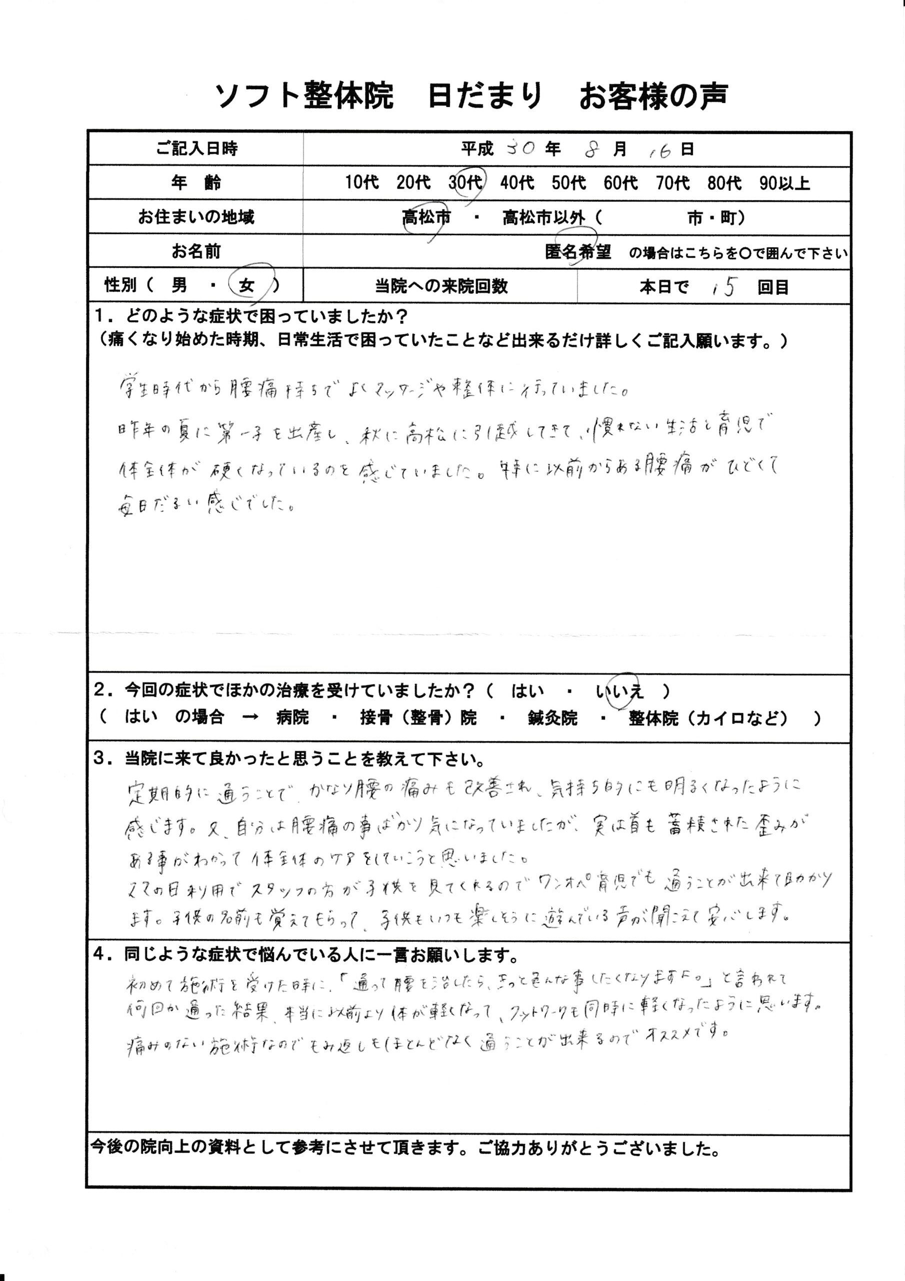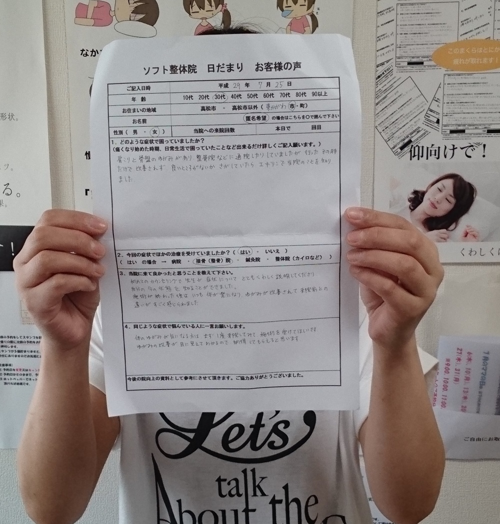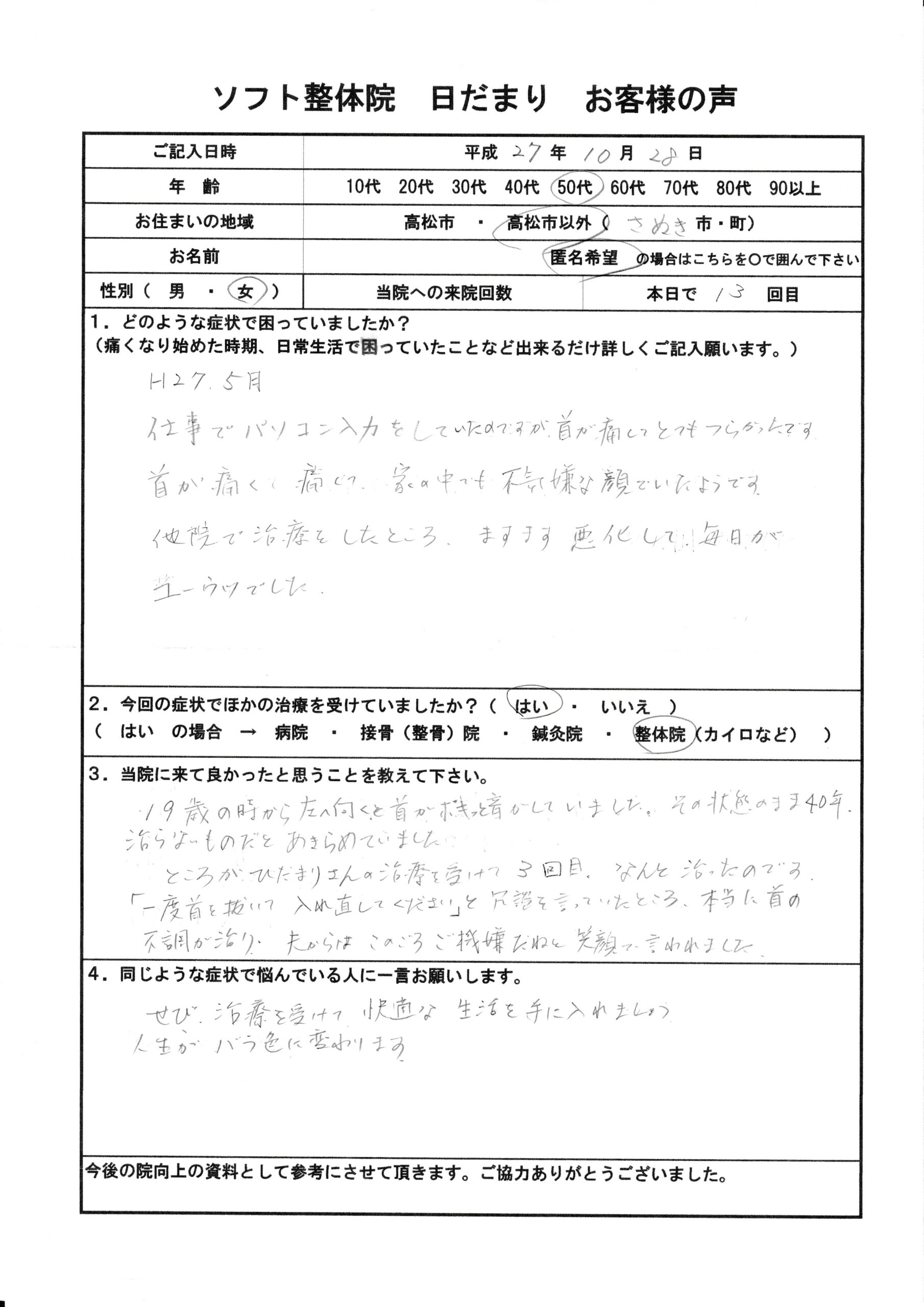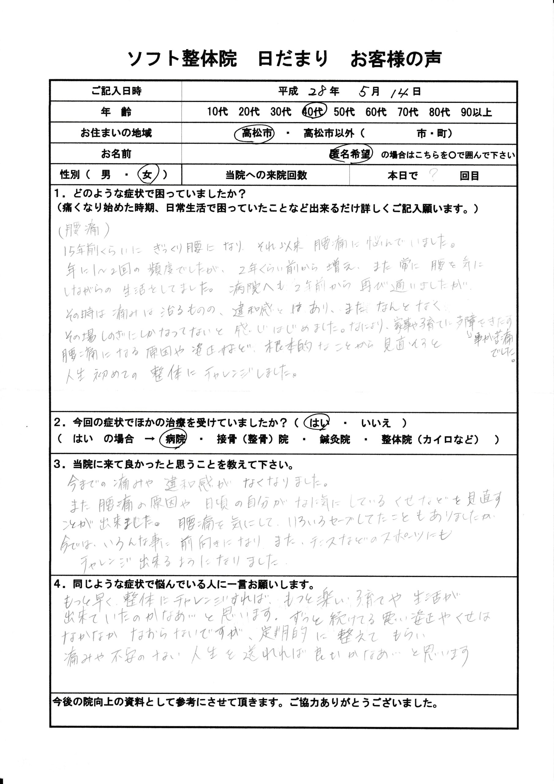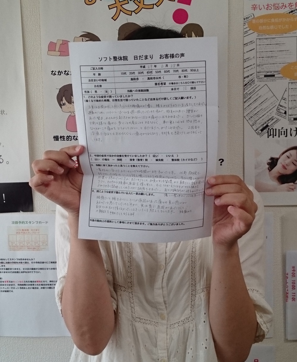 腰痛は、まだ時々ありますが、以前のようにひどく痛むことはなくなりました。首のこり、頭痛もすごく楽になって、まだ首がこることは時々ありますが、頭痛はしなくなりました。姿勢や歩き方、イス、布団、枕の硬さなど、日常生活で体がゆがまないように気をつけなければいけないことを教えてくださるので、有難いです。