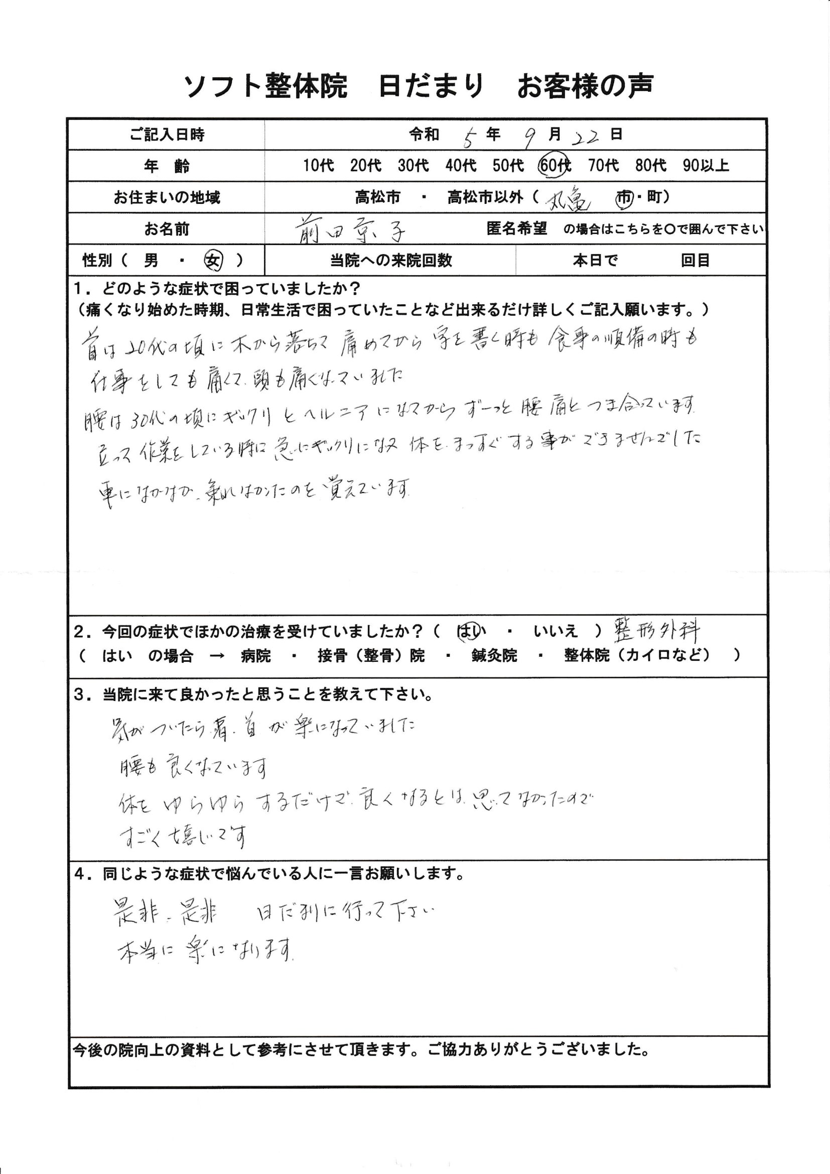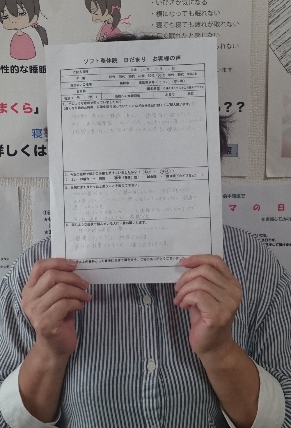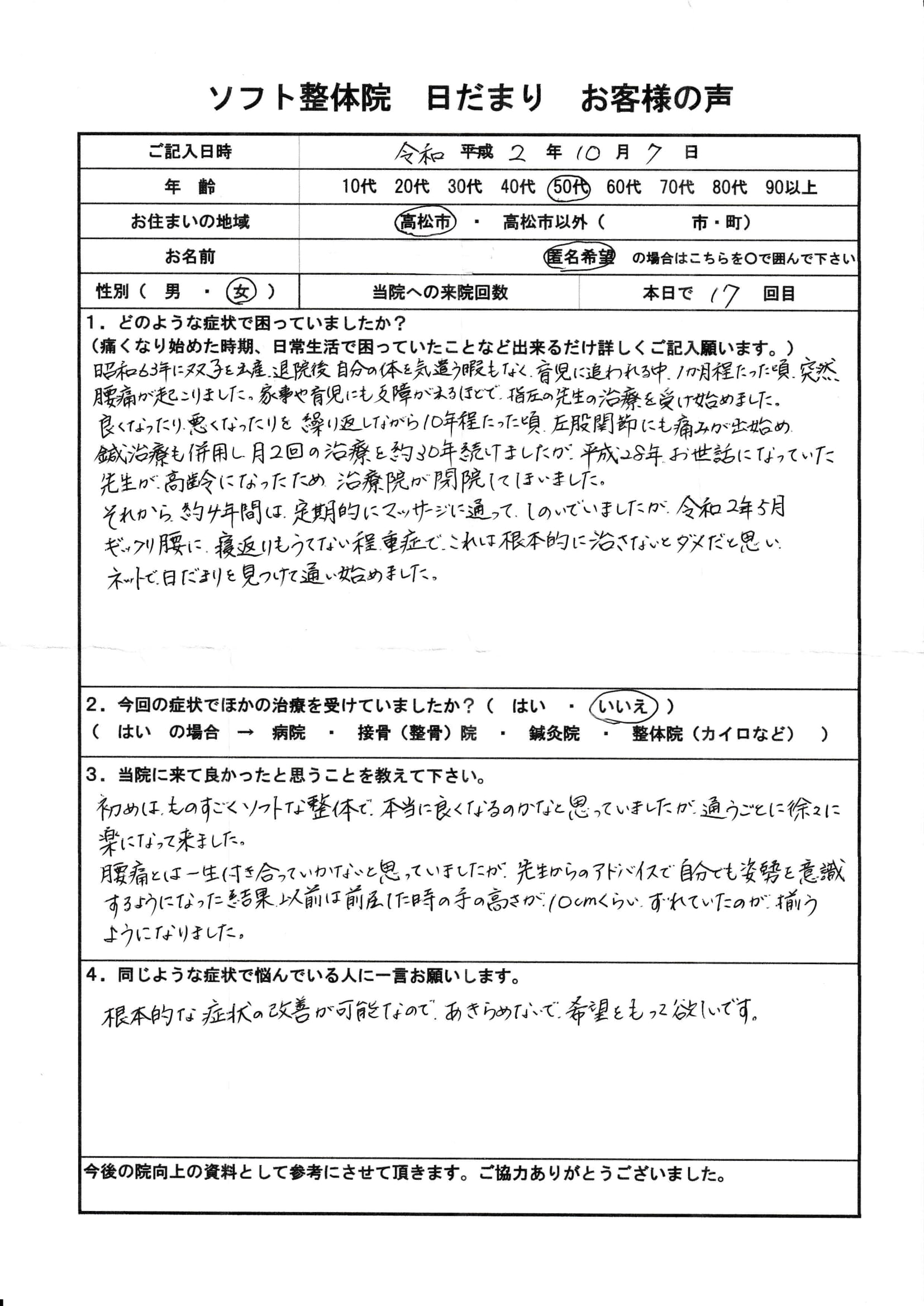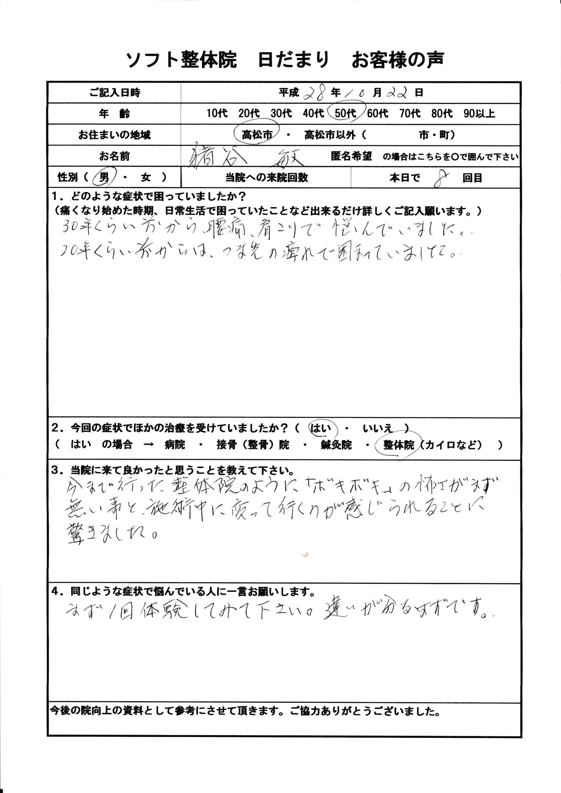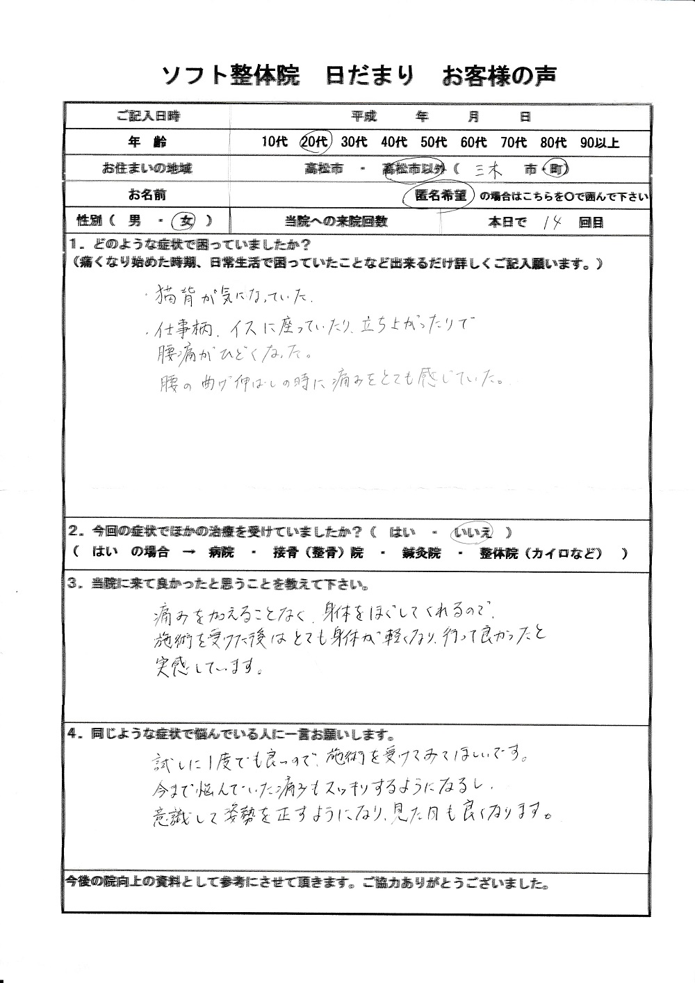 腰痛は、まだ時々ありますが、以前のようにひどく痛むことはなくなりました。首のこり、頭痛もすごく楽になって、まだ首がこることは時々ありますが、頭痛はしなくなりました。姿勢や歩き方、イス、布団、枕の硬さなど、日常生活で体がゆがまないように気をつけなければいけないことを教えてくださるので、有難いです。
