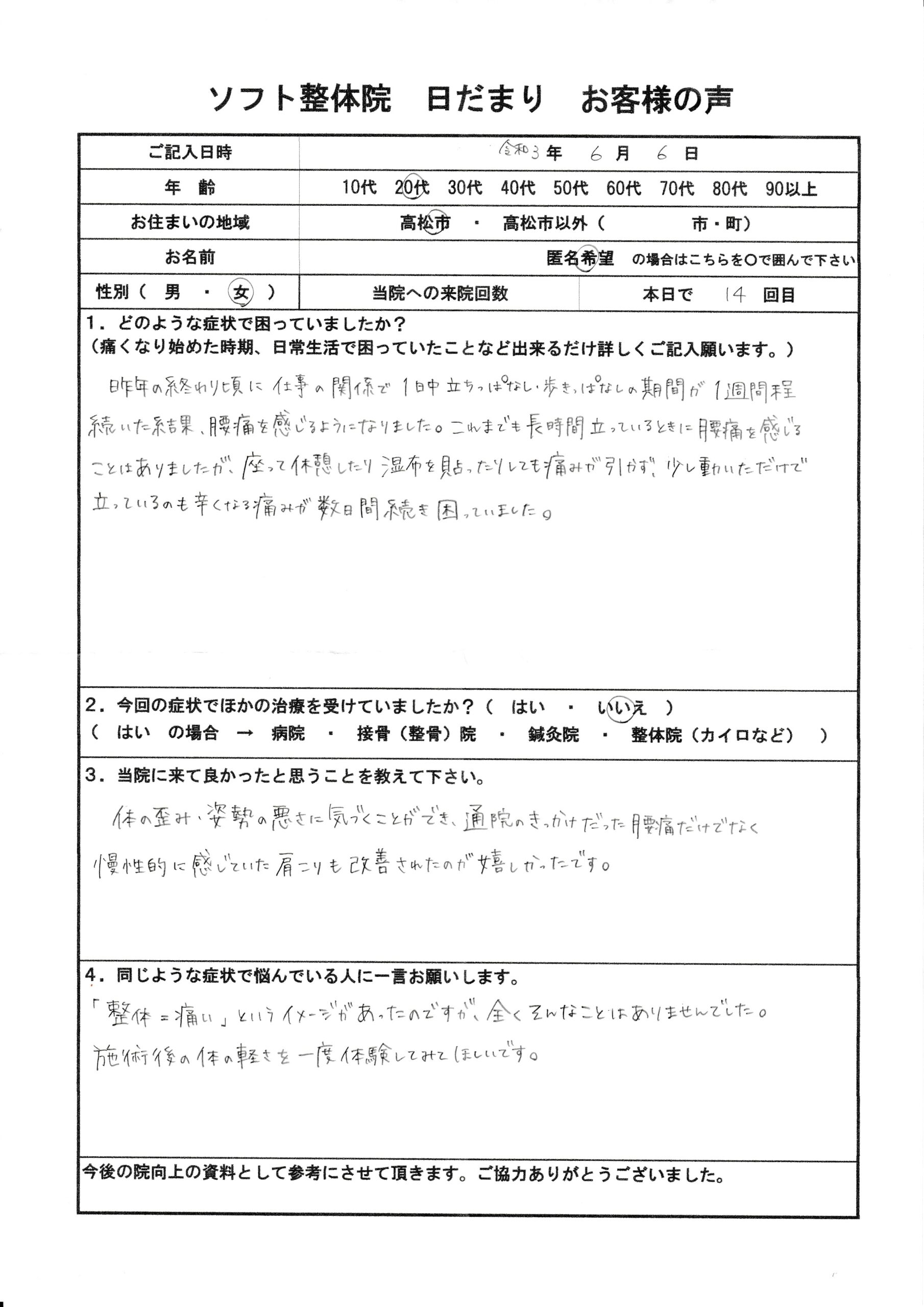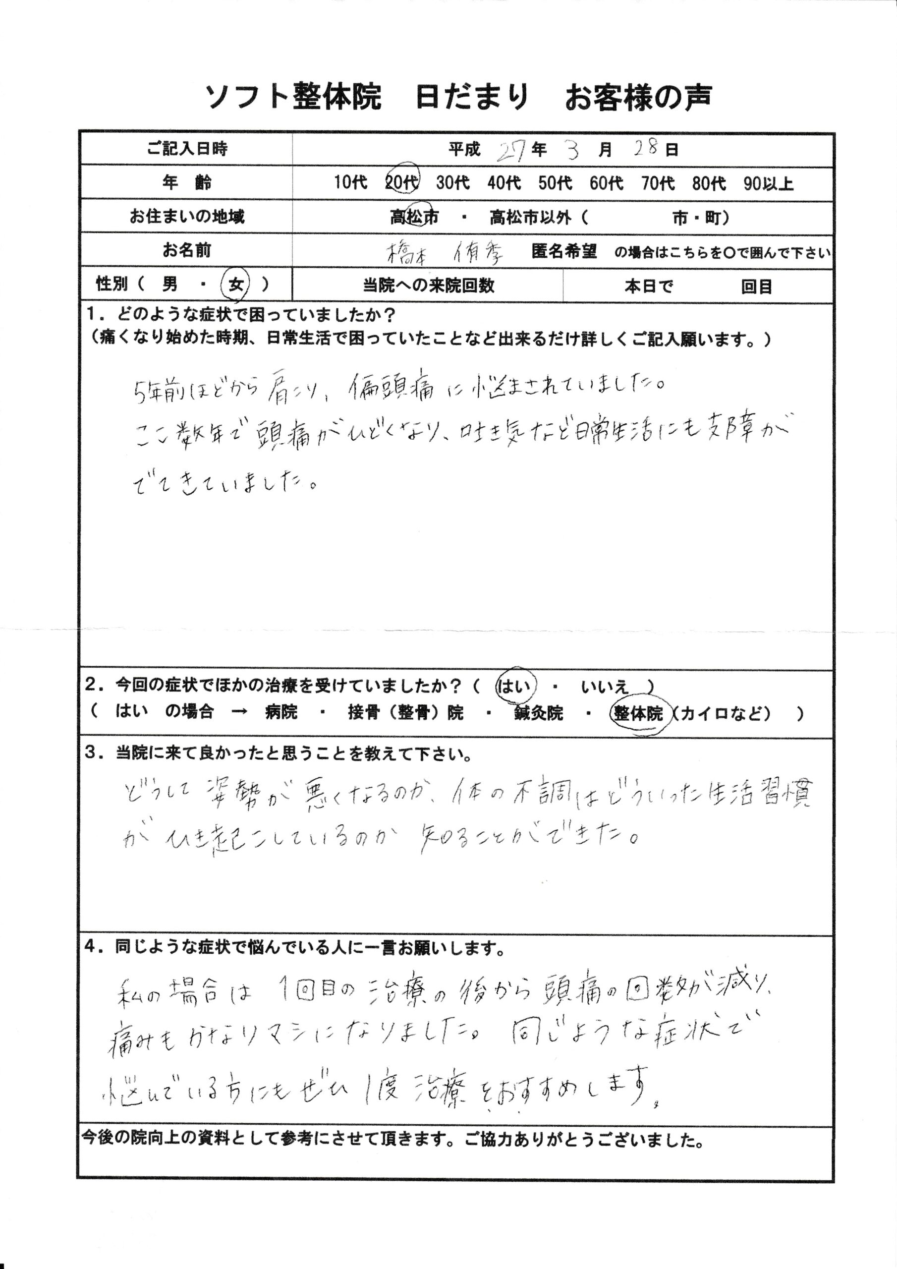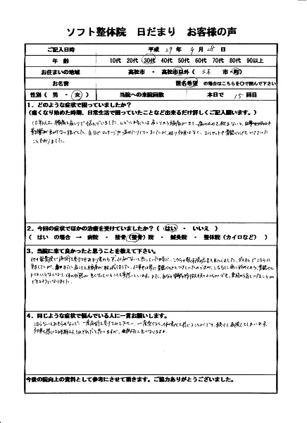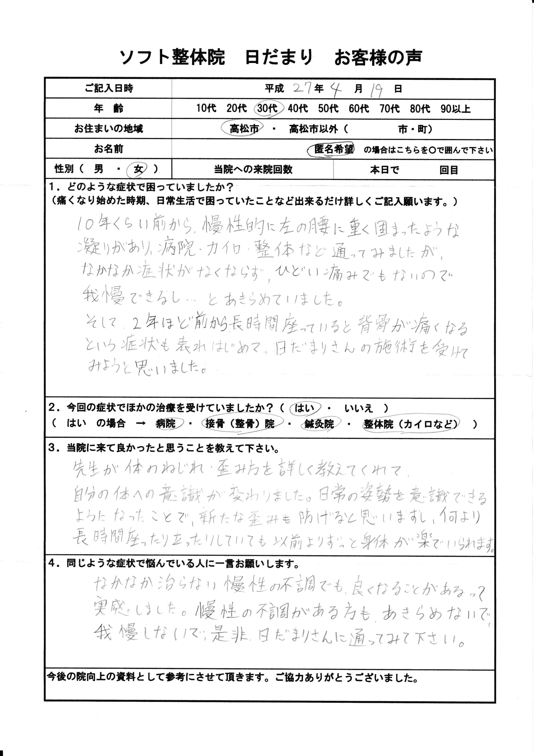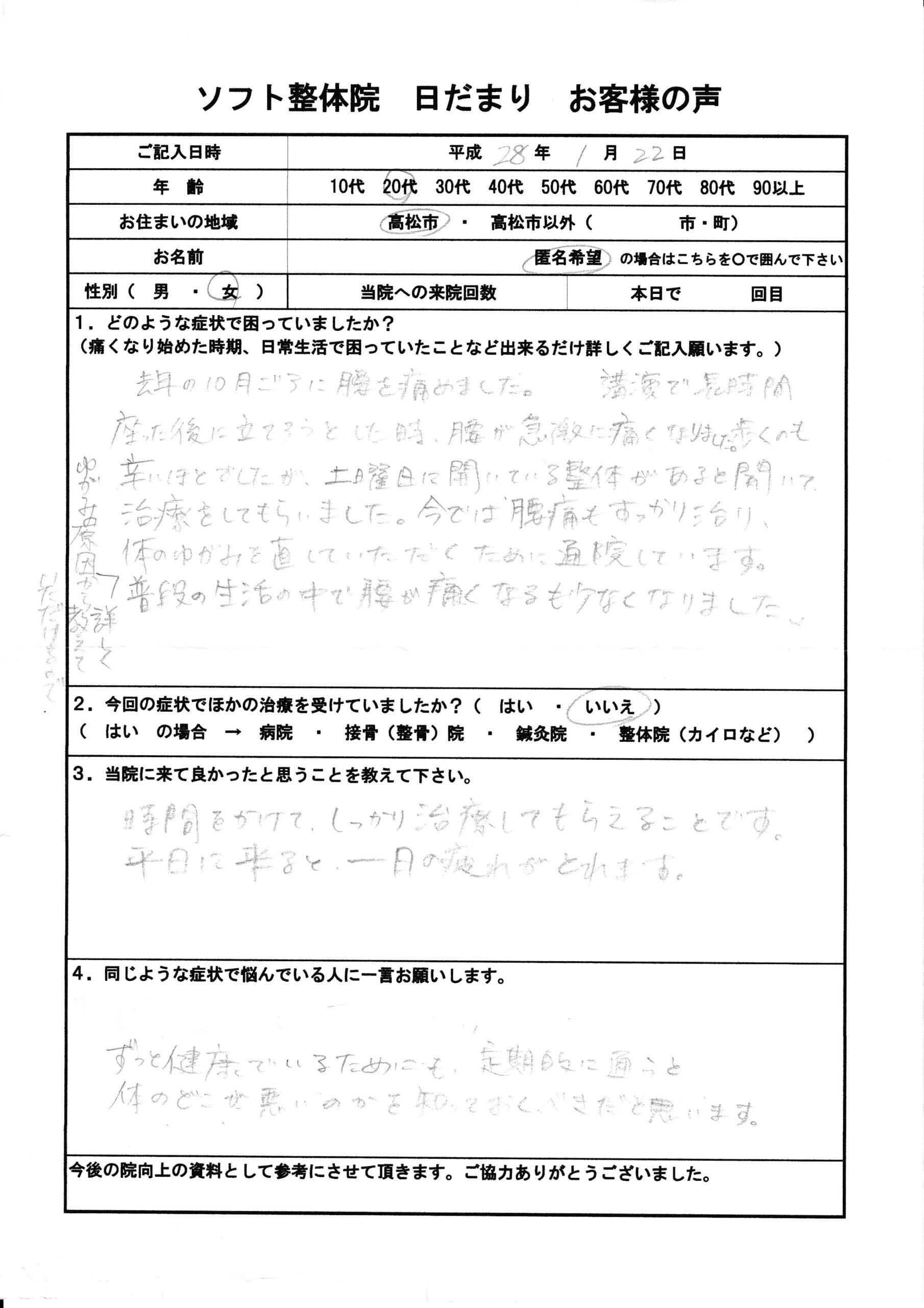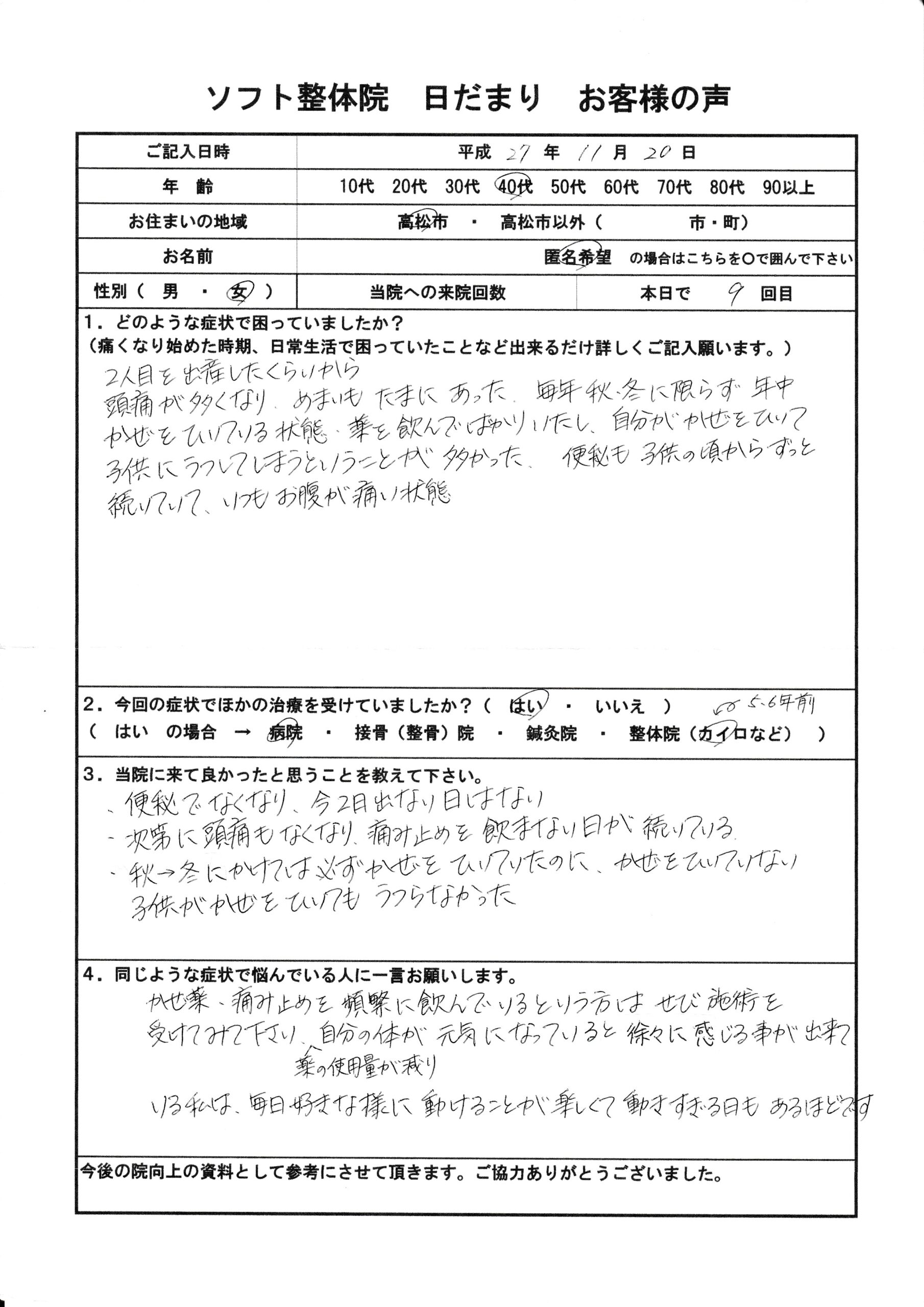 腰痛は、まだ時々ありますが、以前のようにひどく痛むことはなくなりました。首のこり、頭痛もすごく楽になって、まだ首がこることは時々ありますが、頭痛はしなくなりました。姿勢や歩き方、イス、布団、枕の硬さなど、日常生活で体がゆがまないように気をつけなければいけないことを教えてくださるので、有難いです。