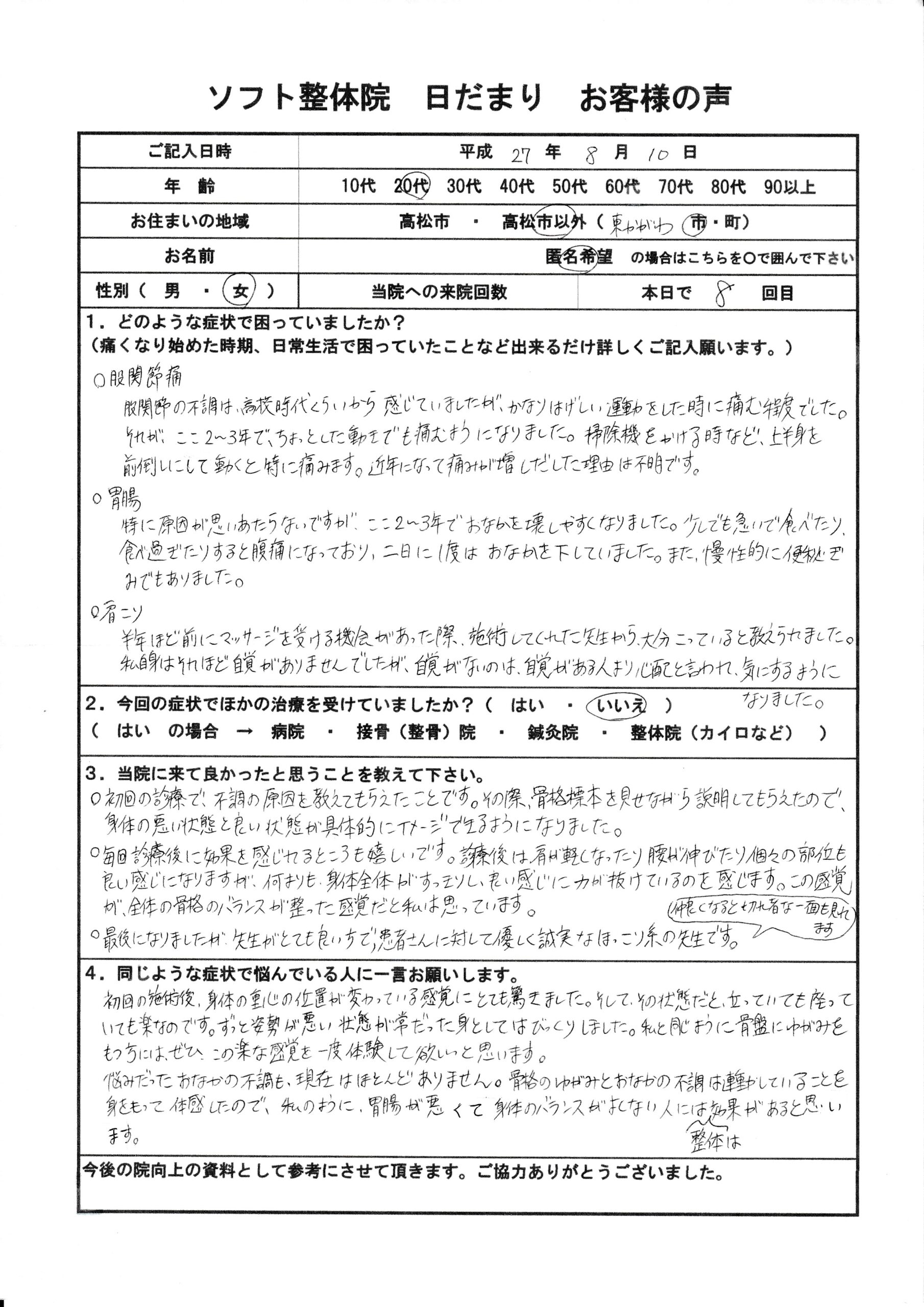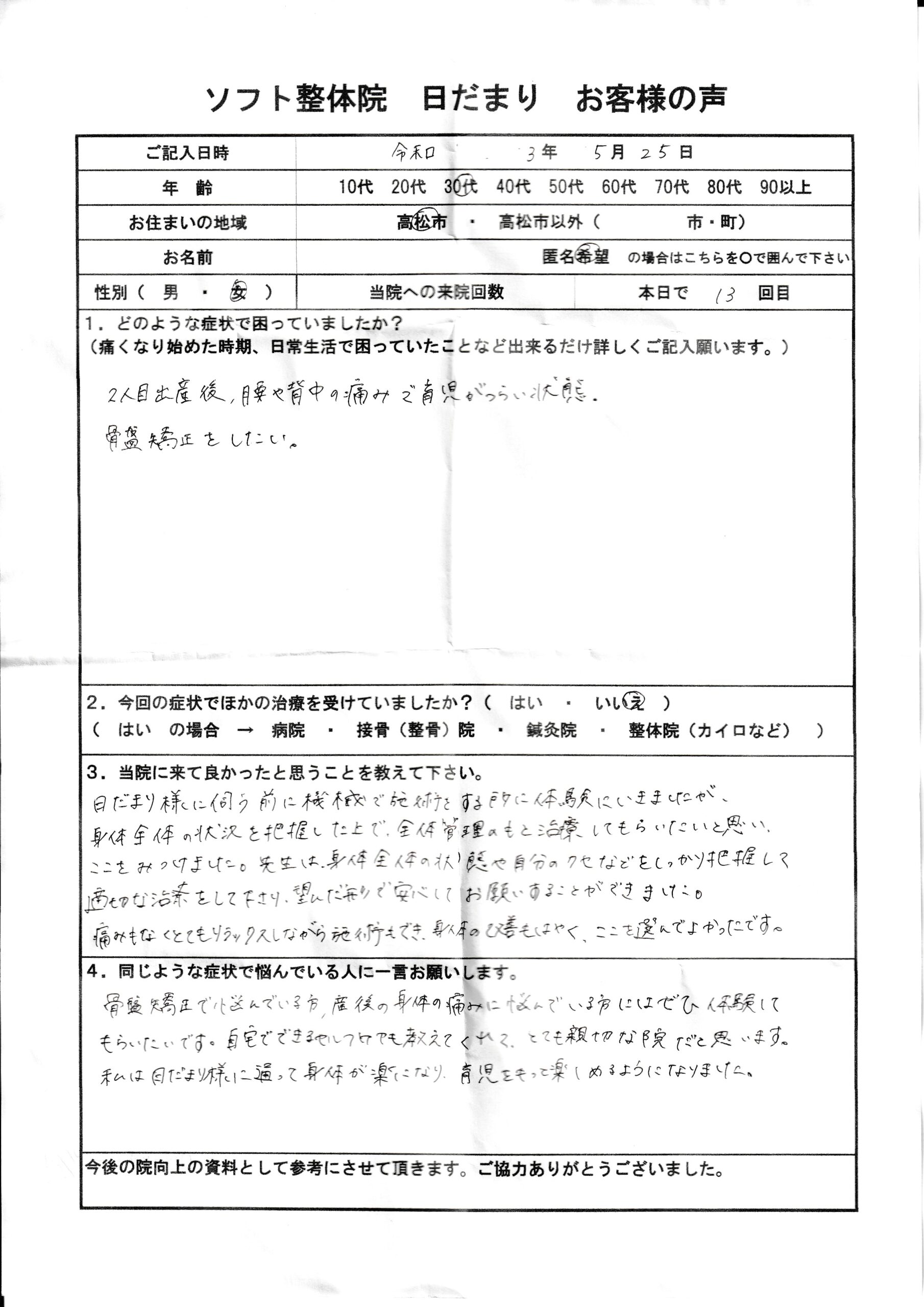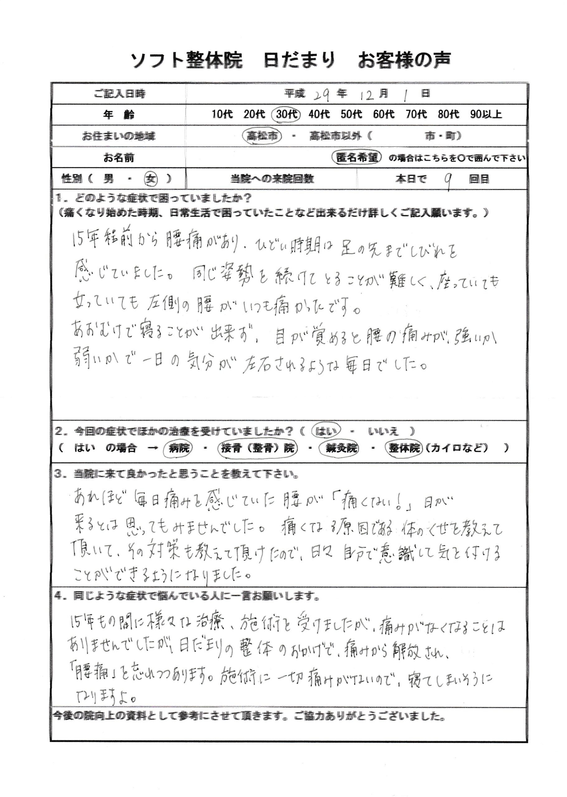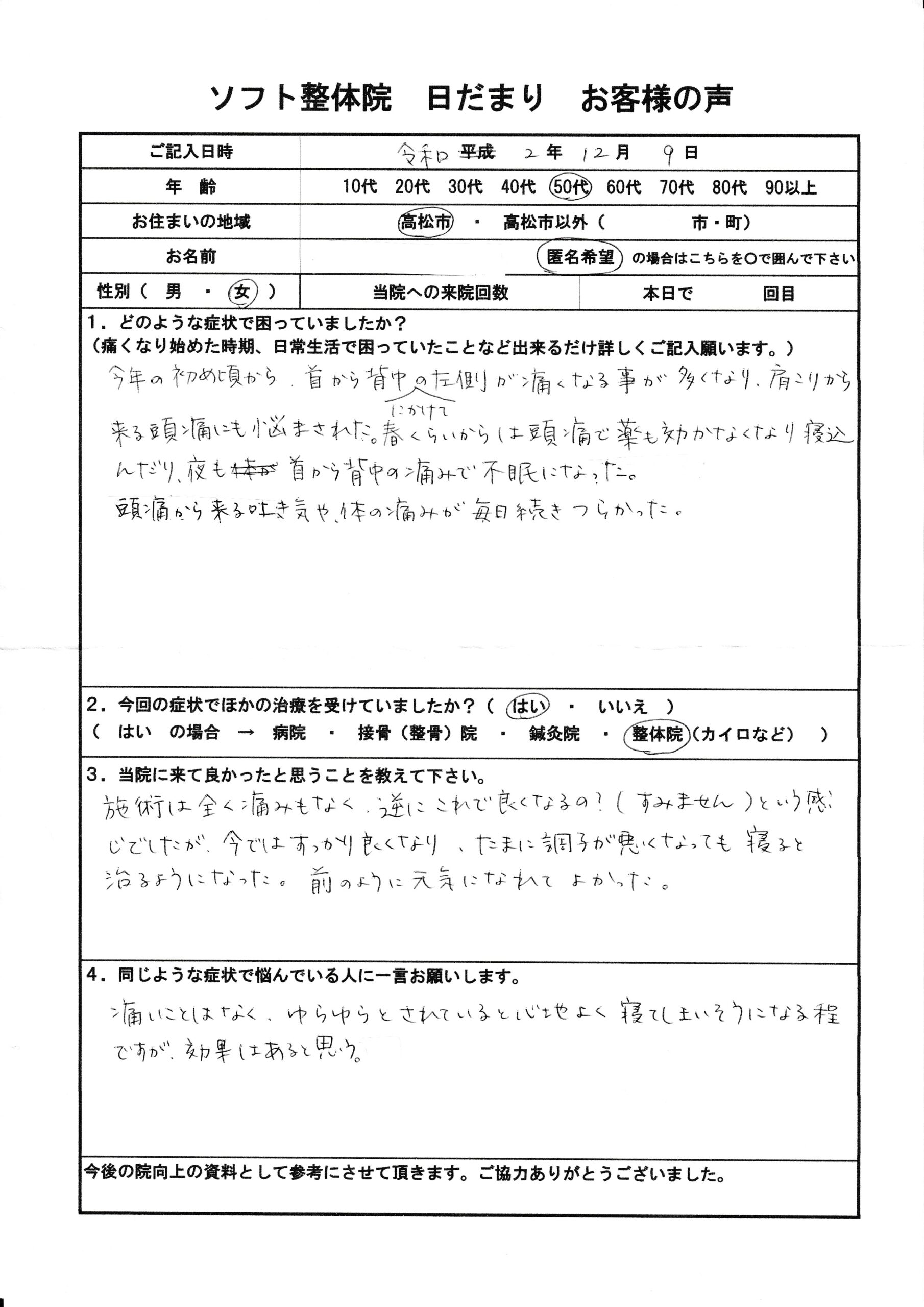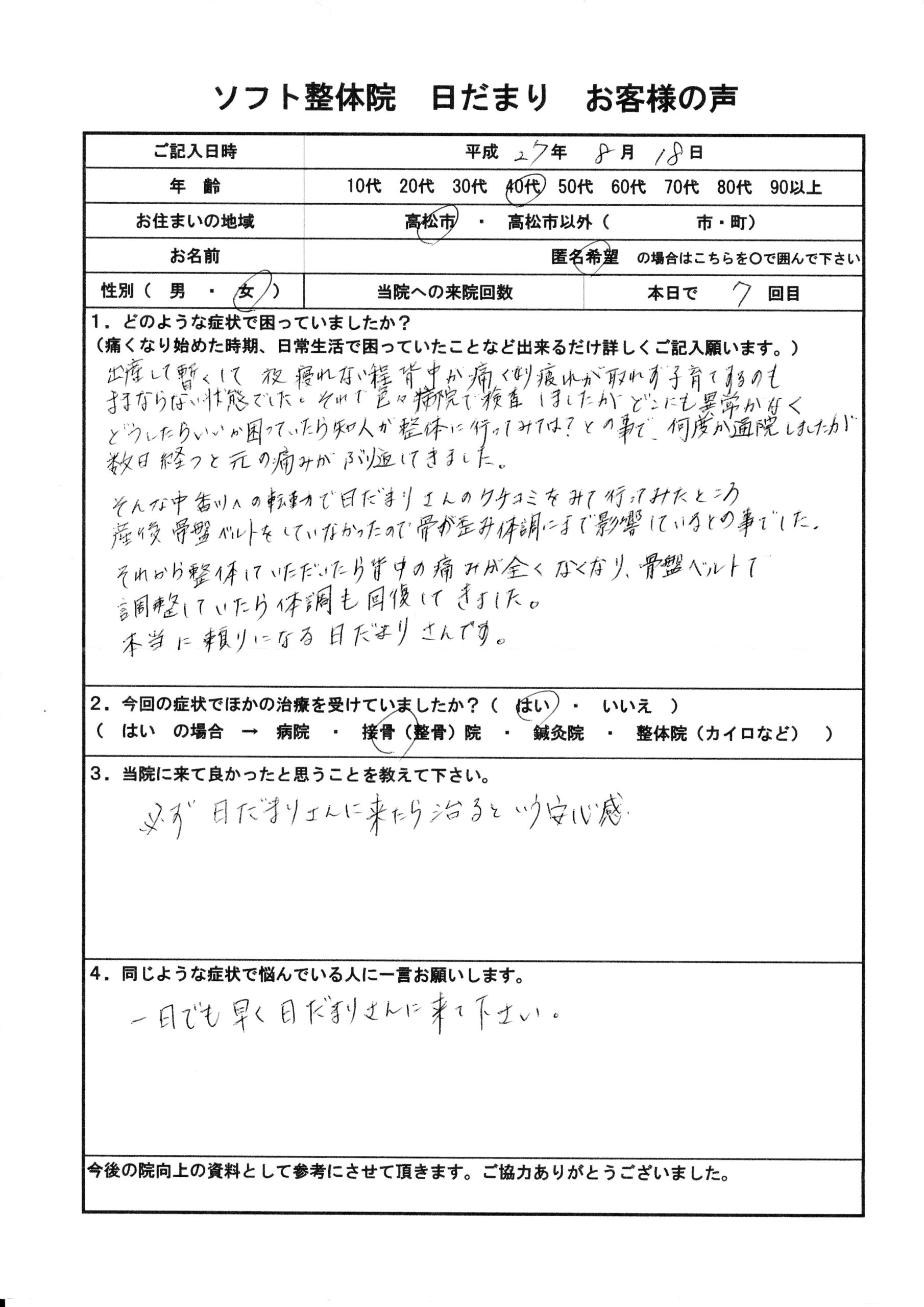 腰痛は、まだ時々ありますが、以前のようにひどく痛むことはなくなりました。首のこり、頭痛もすごく楽になって、まだ首がこることは時々ありますが、頭痛はしなくなりました。姿勢や歩き方、イス、布団、枕の硬さなど、日常生活で体がゆがまないように気をつけなければいけないことを教えてくださるので、有難いです。