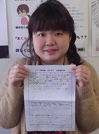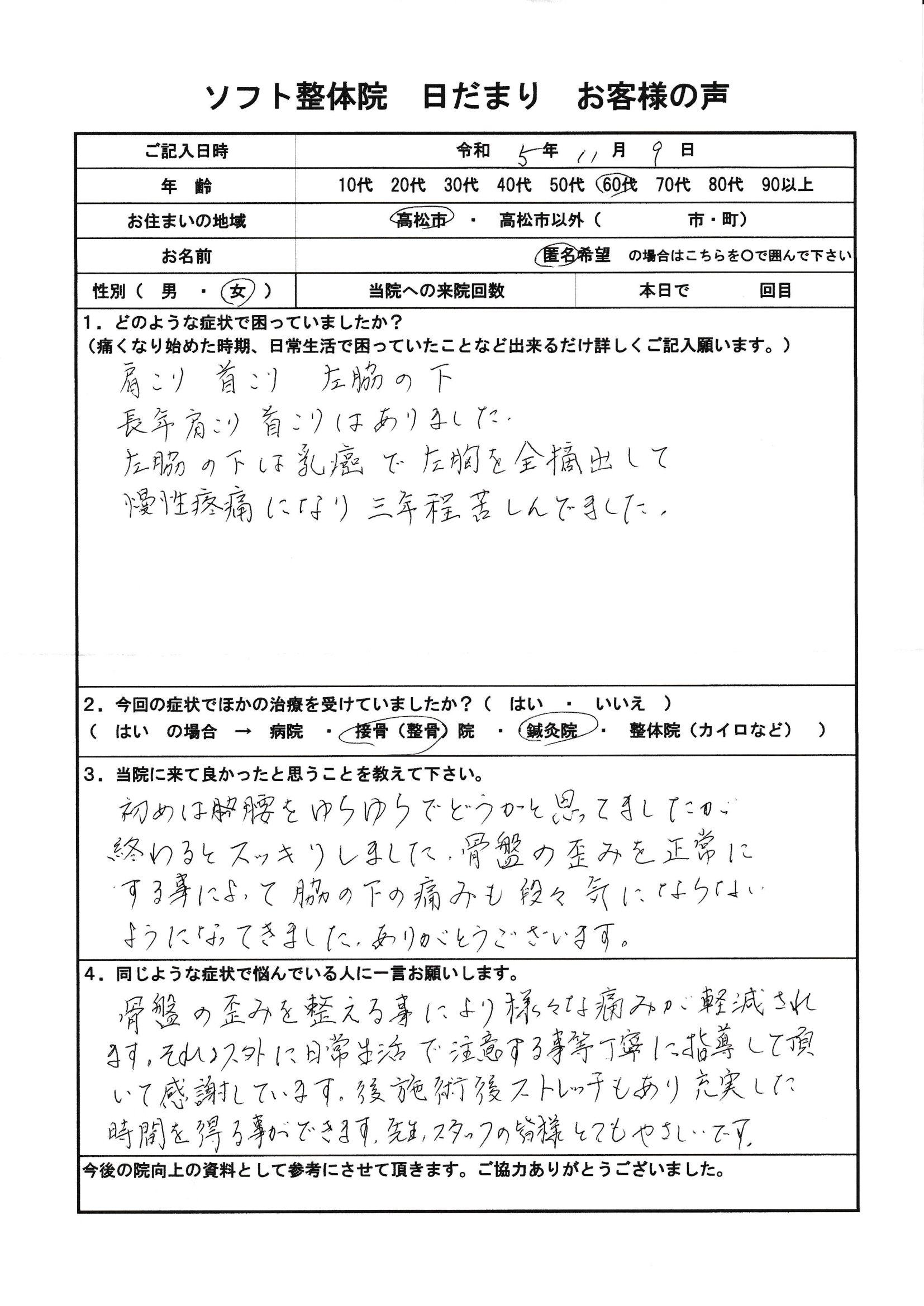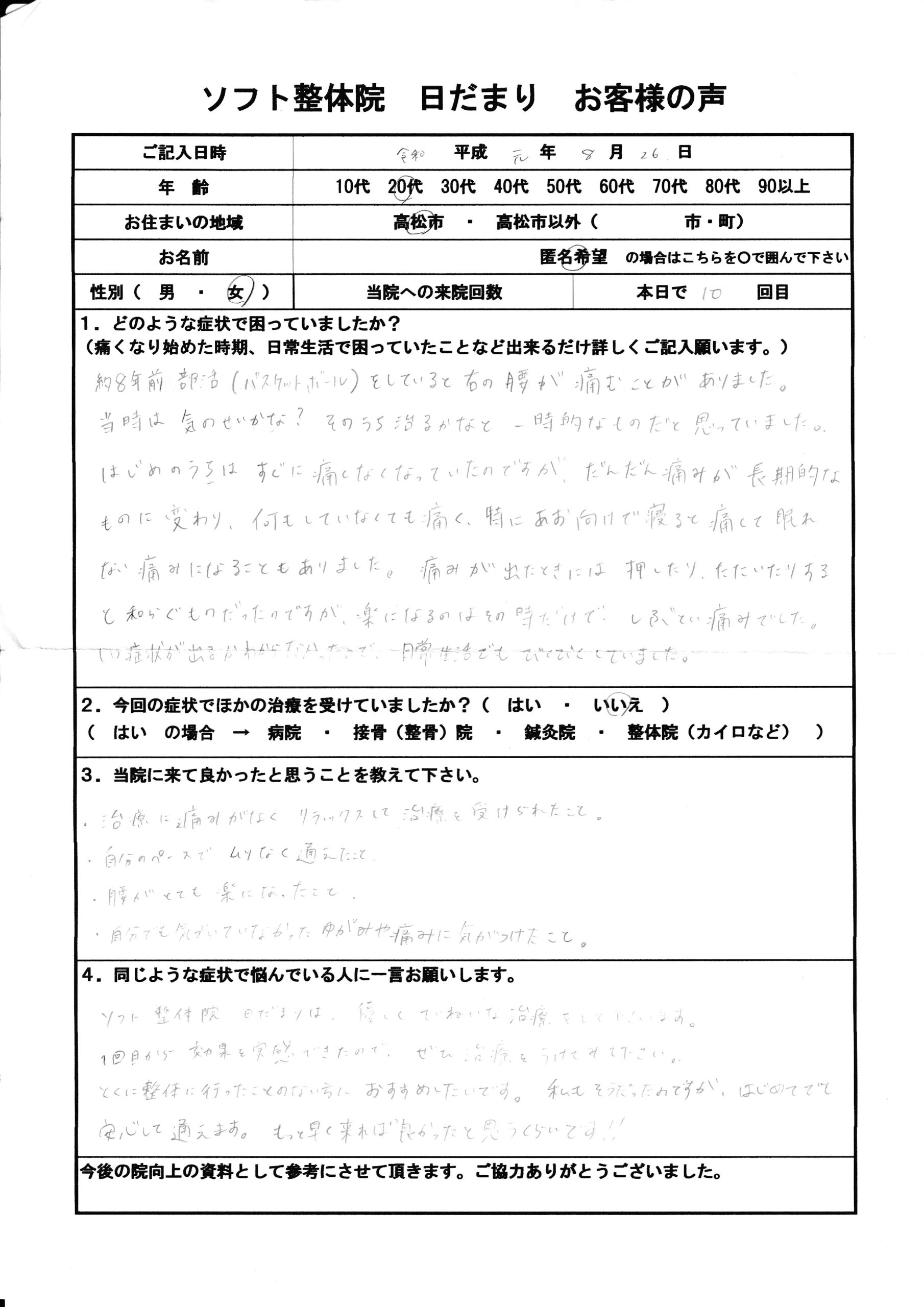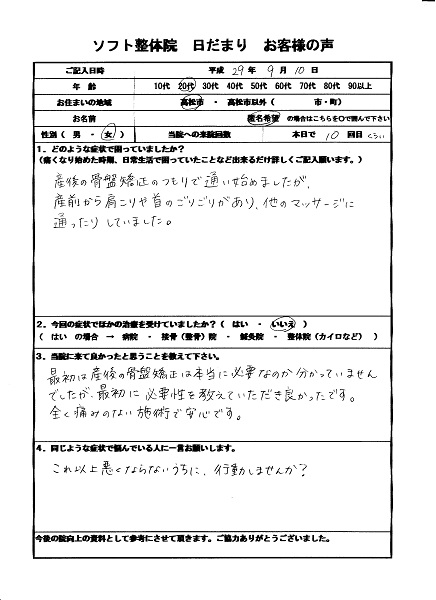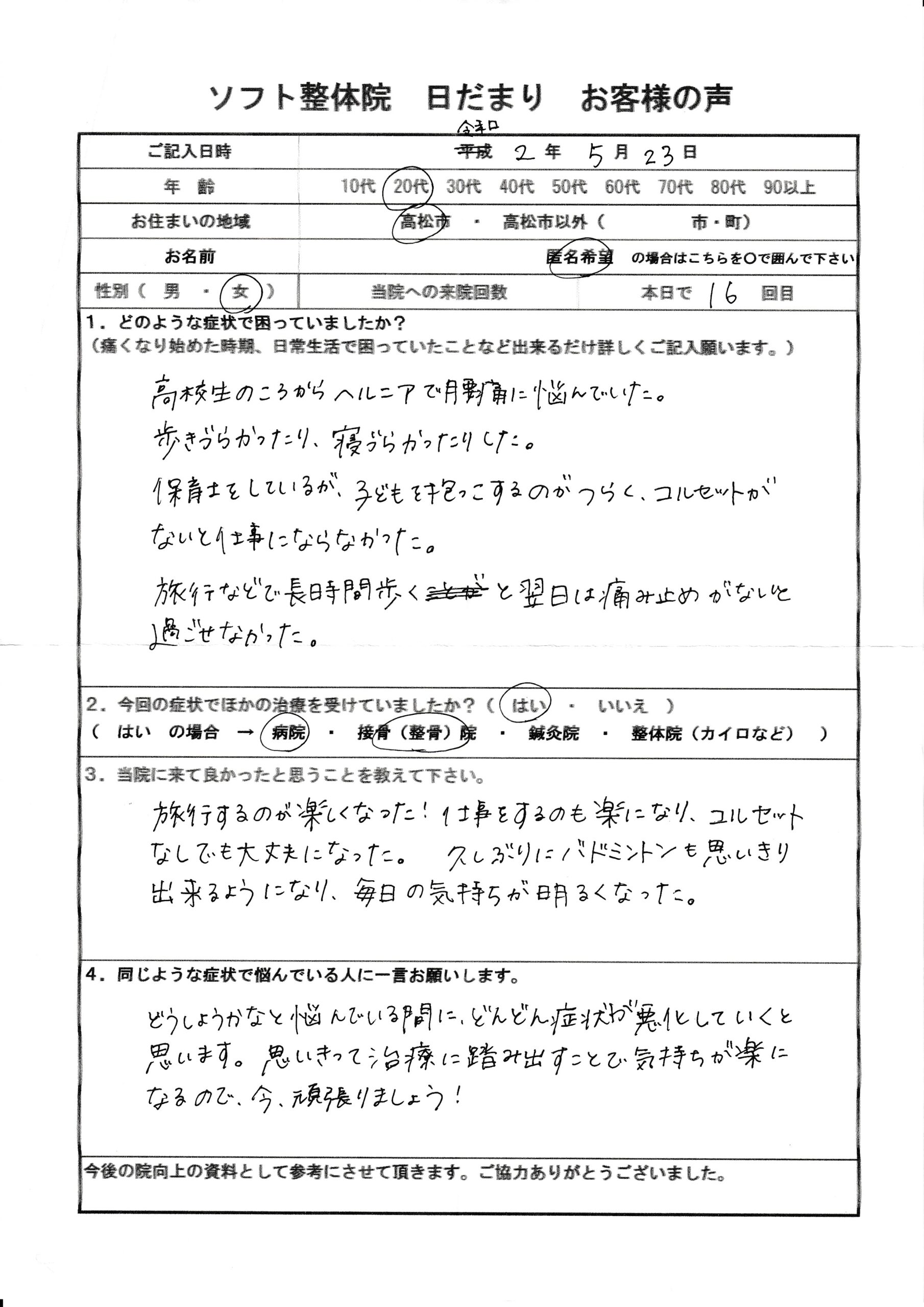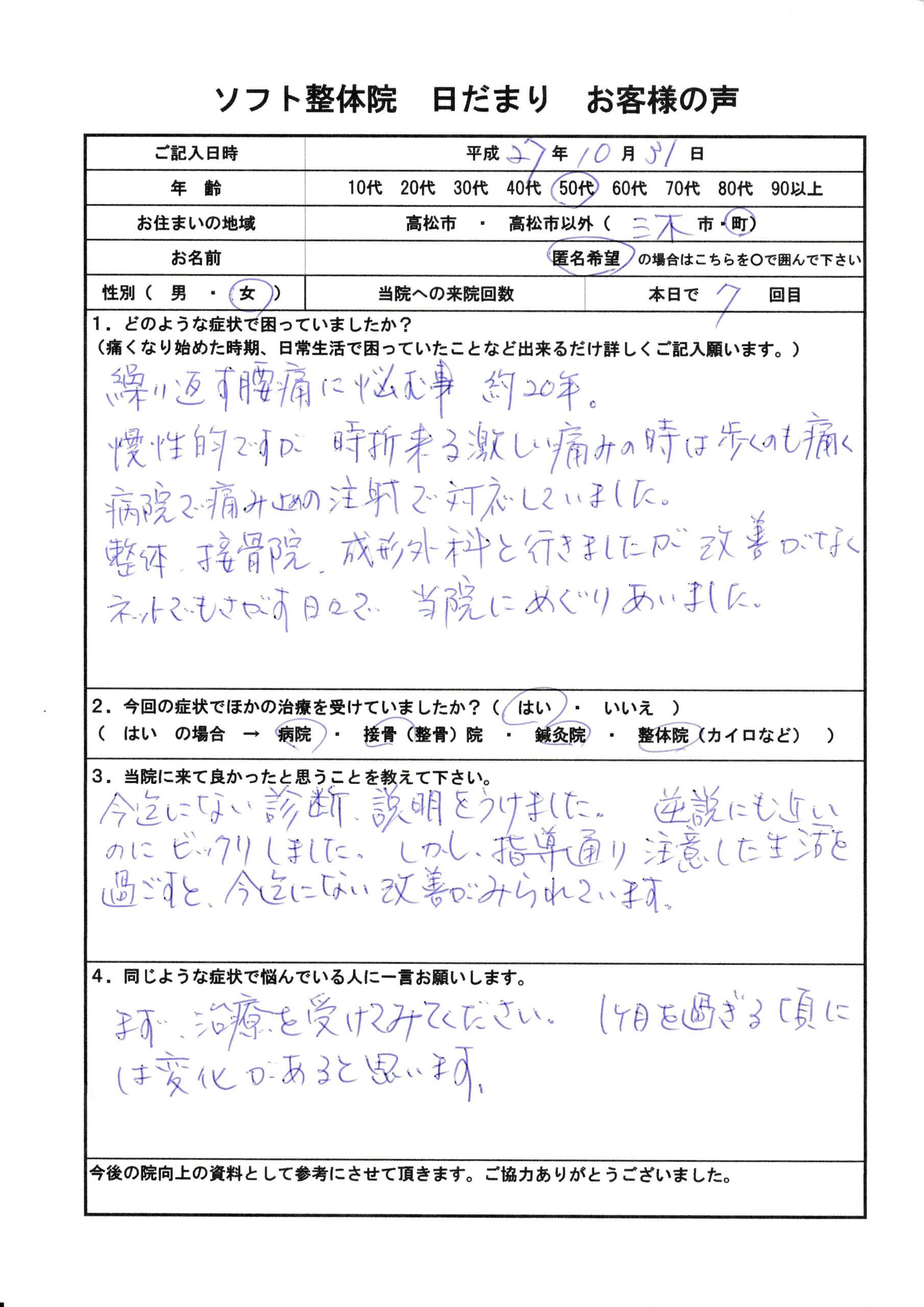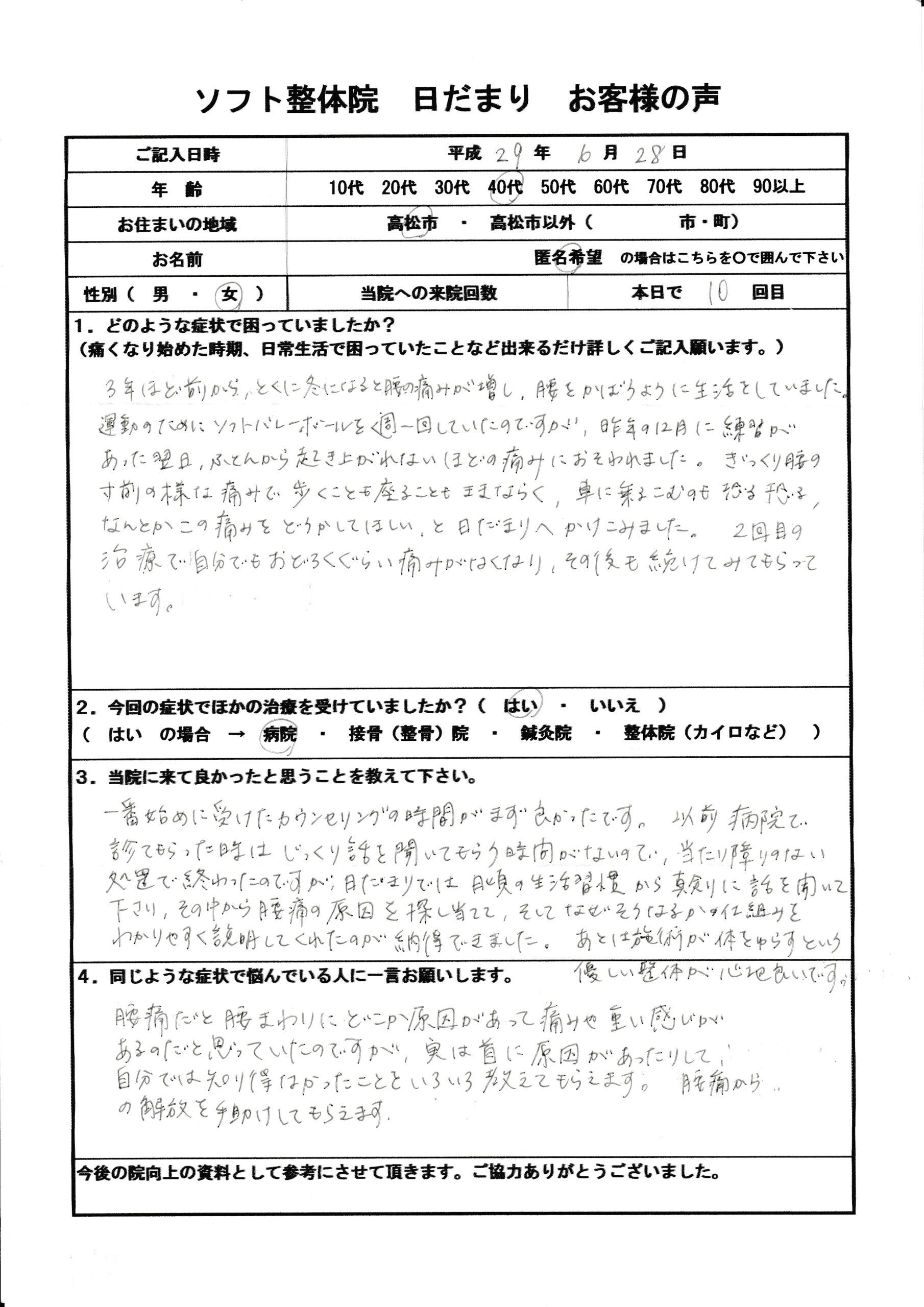 腰痛は、まだ時々ありますが、以前のようにひどく痛むことはなくなりました。首のこり、頭痛もすごく楽になって、まだ首がこることは時々ありますが、頭痛はしなくなりました。姿勢や歩き方、イス、布団、枕の硬さなど、日常生活で体がゆがまないように気をつけなければいけないことを教えてくださるので、有難いです。