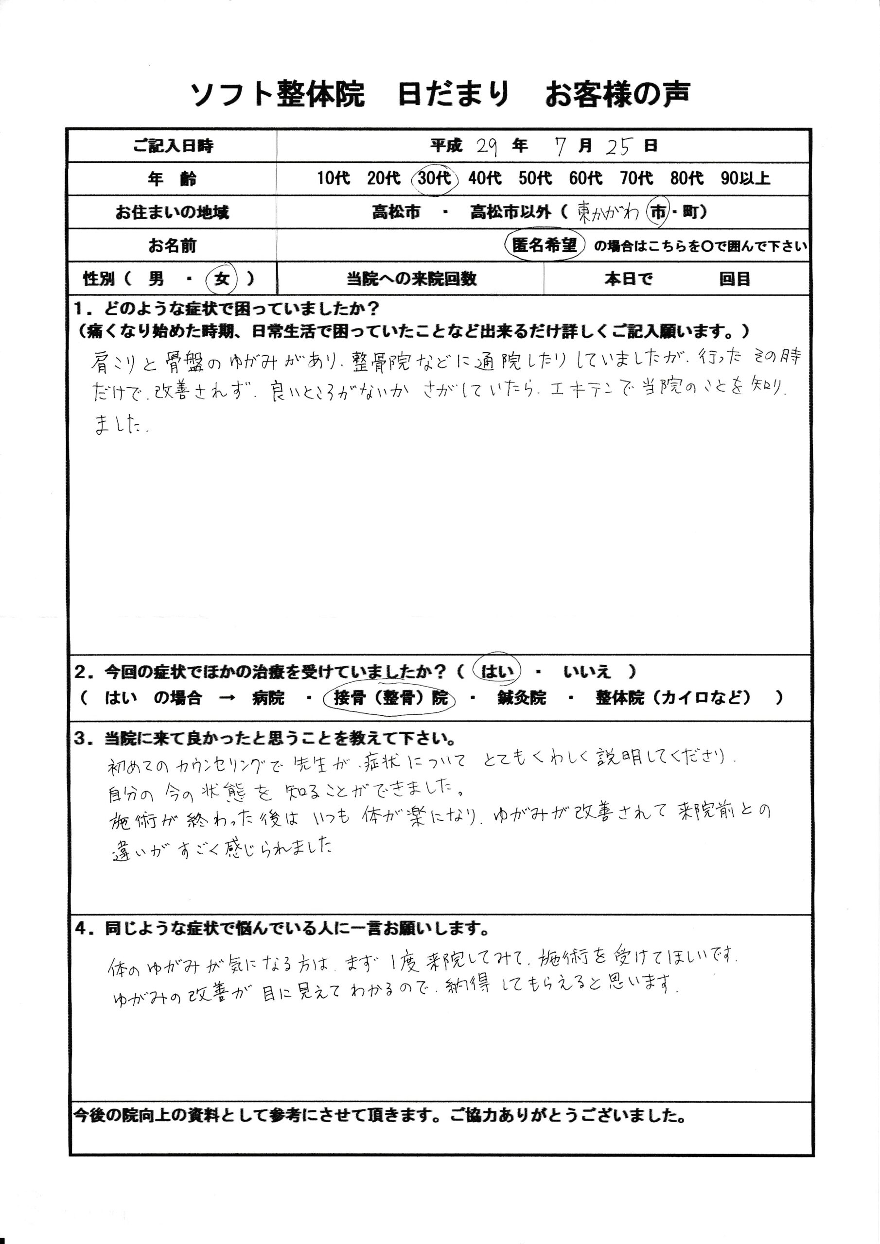 体の歪み、姿勢の悪さに気づくことができ、通院のきっかけだった腰痛だけではなく慢性的に感じていた肩こりも改善されたのが嬉しかったです。