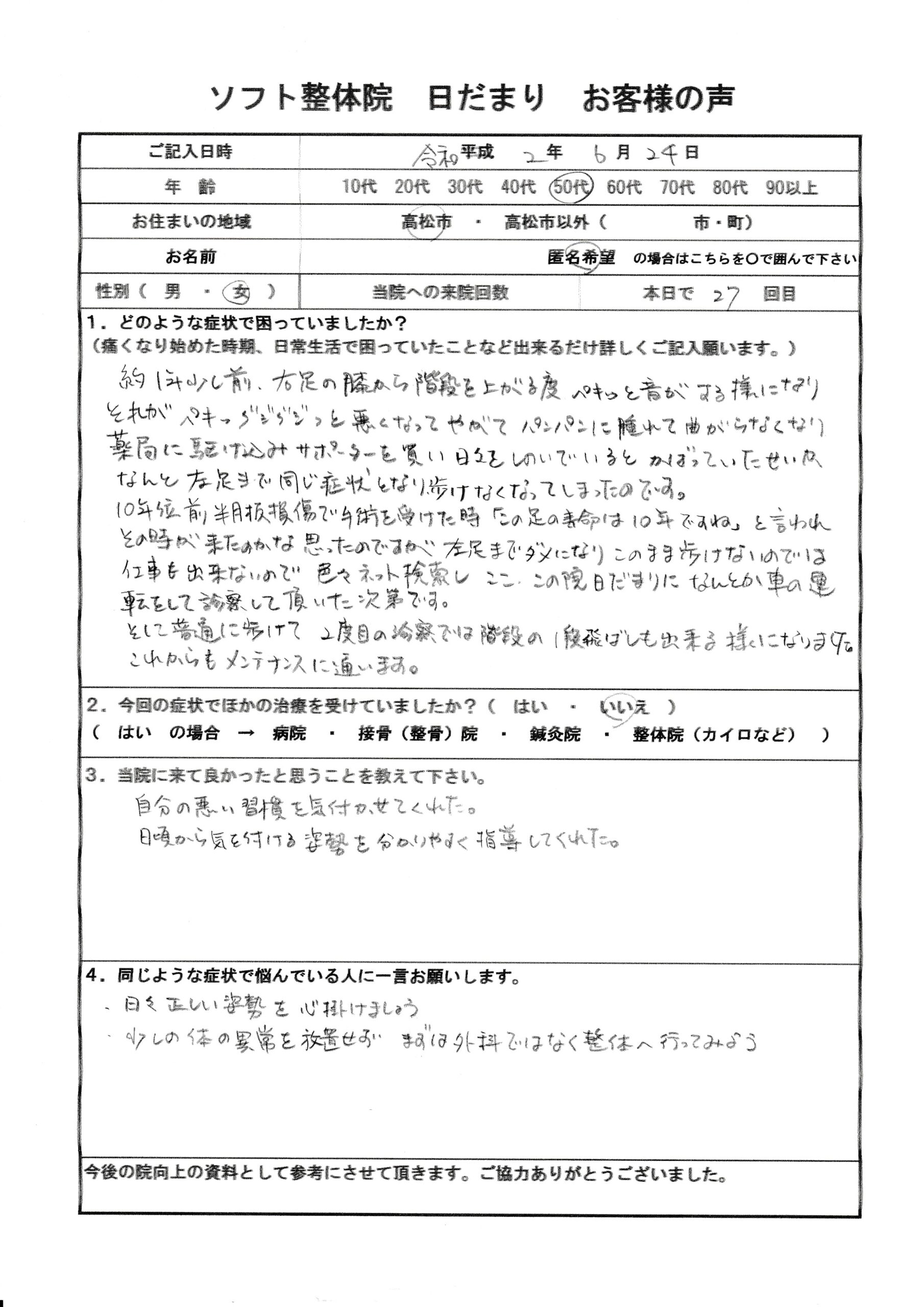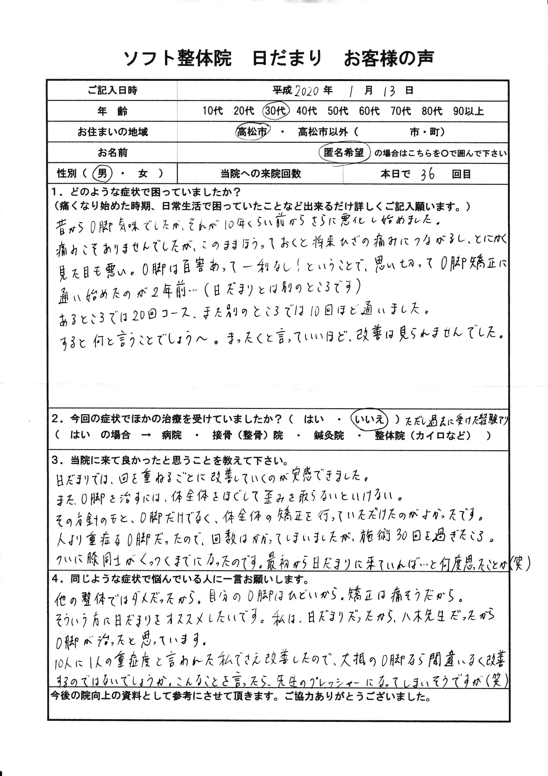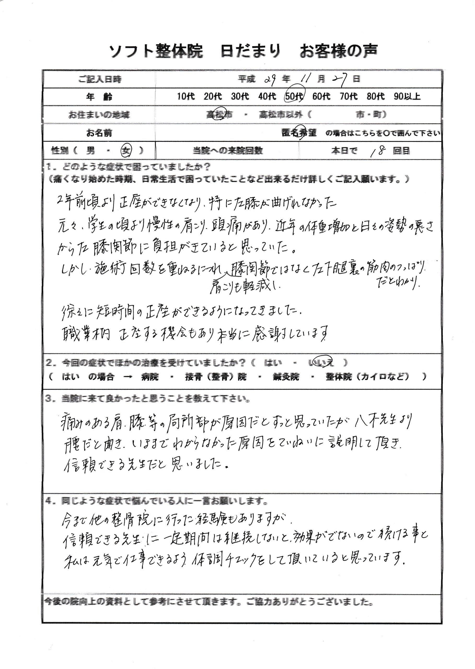 2年前より正座ができなくなり、特に左膝が曲げられなかった。元々、学生の頃より慢性の肩こり、頭痛があり、近年の体重増加と日々の姿勢の悪さから左股関節に負担がきていると思っていた。しかし、施術回数を重ねるにつれ、肩こりも軽減し、膝関節ではなく左大腿裏の関節のつっぱりだとわかり、徐々に短時間の正座ができるようになってきました。職業柄正座する機会もあり本当に感謝しています。