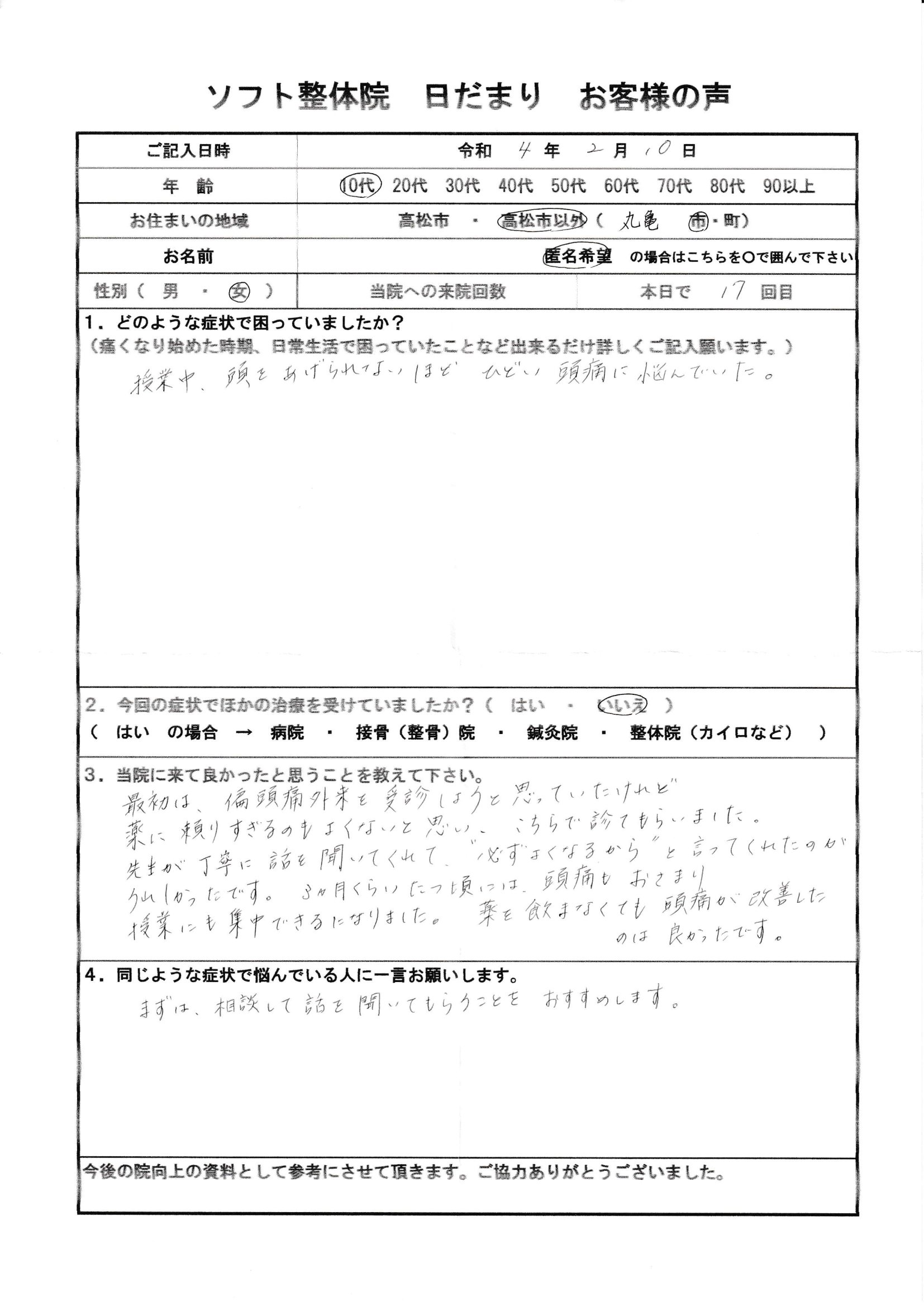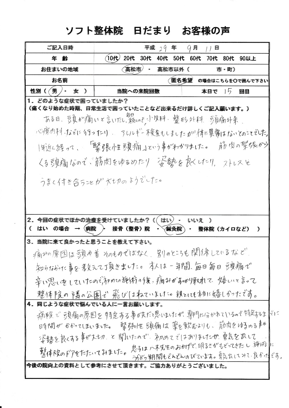 痛みの原因は頭や首そのものではなく、別のところも関係しているなど、知らなかった事を教えて頂きました。本人は一年間、毎日毎日頭痛で辛い思いをしていたので、初めての施術の後、痛みがすっかり取れて嬉しいと言って整体院の隣の公園で飛びはねていました。親としても本当に嬉しかったです。