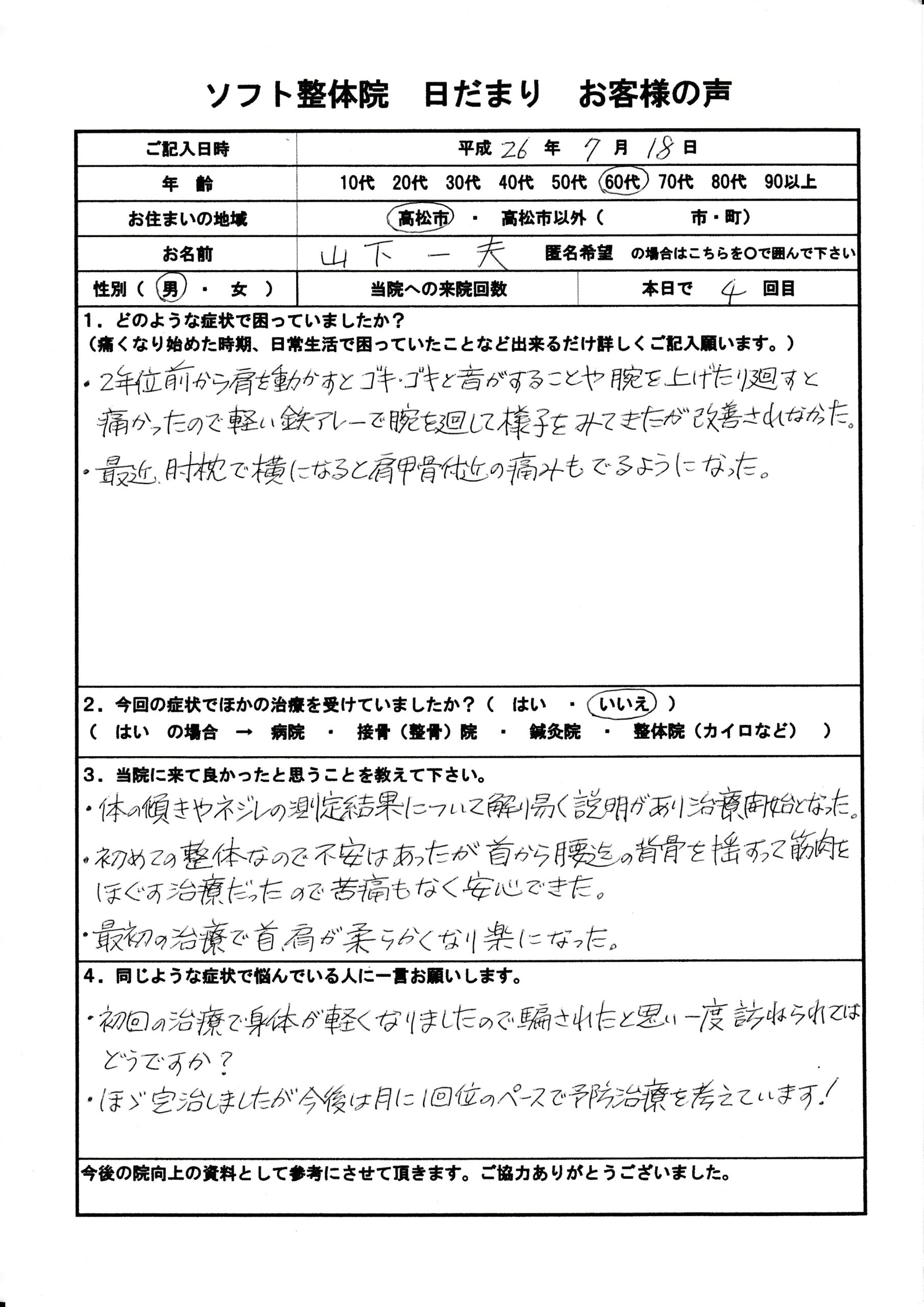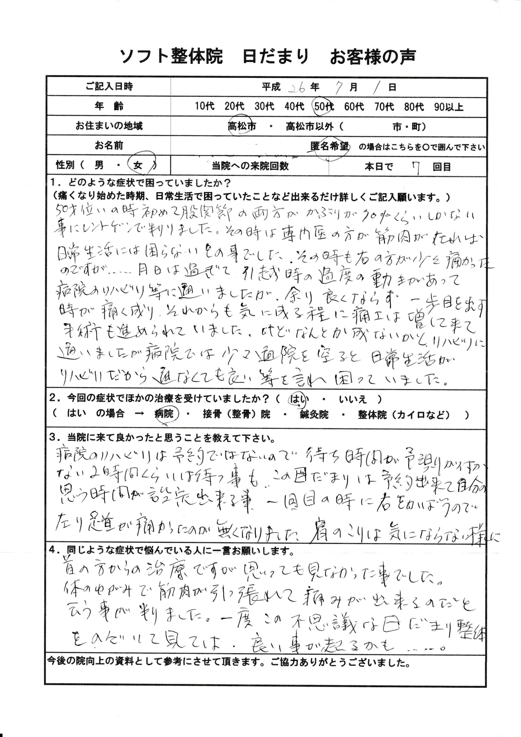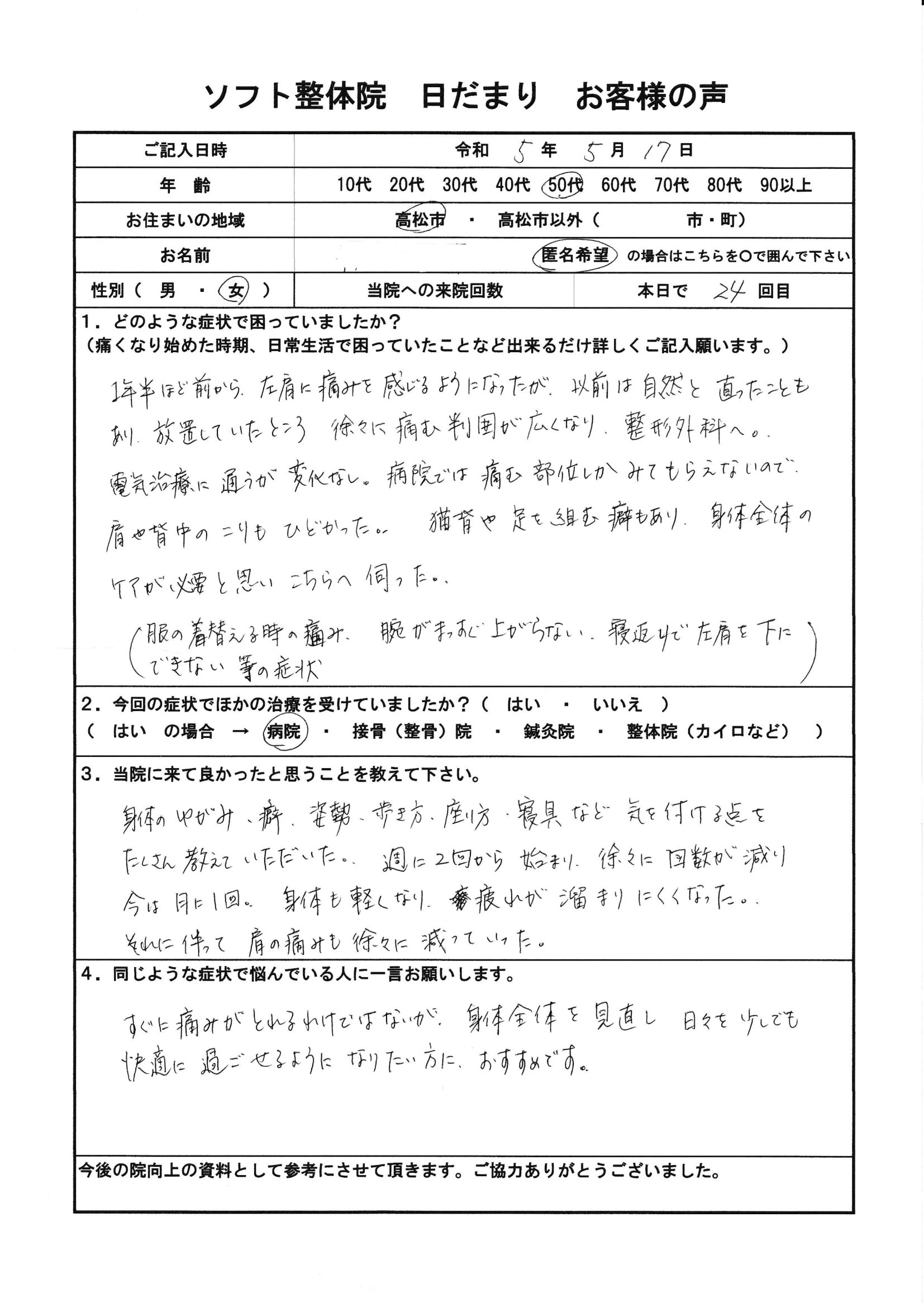 2年ほど前から右肩があがりにくくなっていました。別の整体に通っていましたが、なかなか治りませんでした。そのうち寝返りを打っても肩にいたみが走るようになり、日中も少し動かすだけで、痛くなり仕事に支障がでるようになりました。