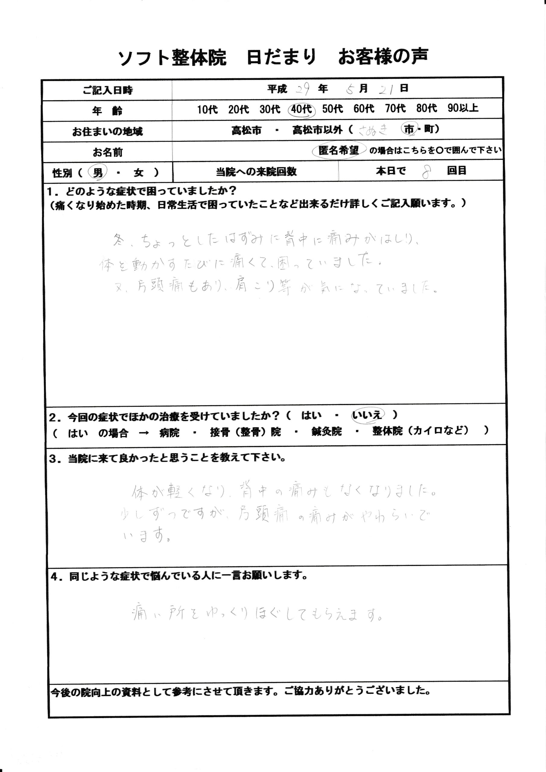 現在、約1カ月前後で治療を受けているため、肩こりや背中の張りが悪化することなく過ごせている。また、治療を受けた後は体がスッキリするので良かったと思う。