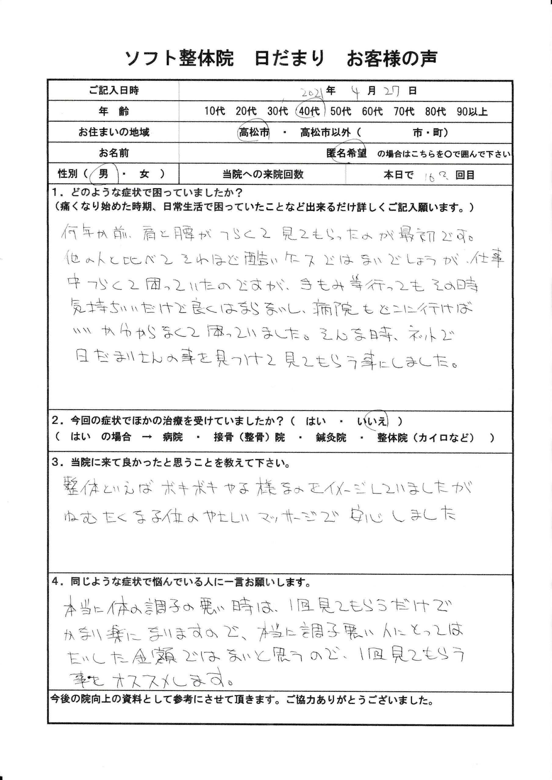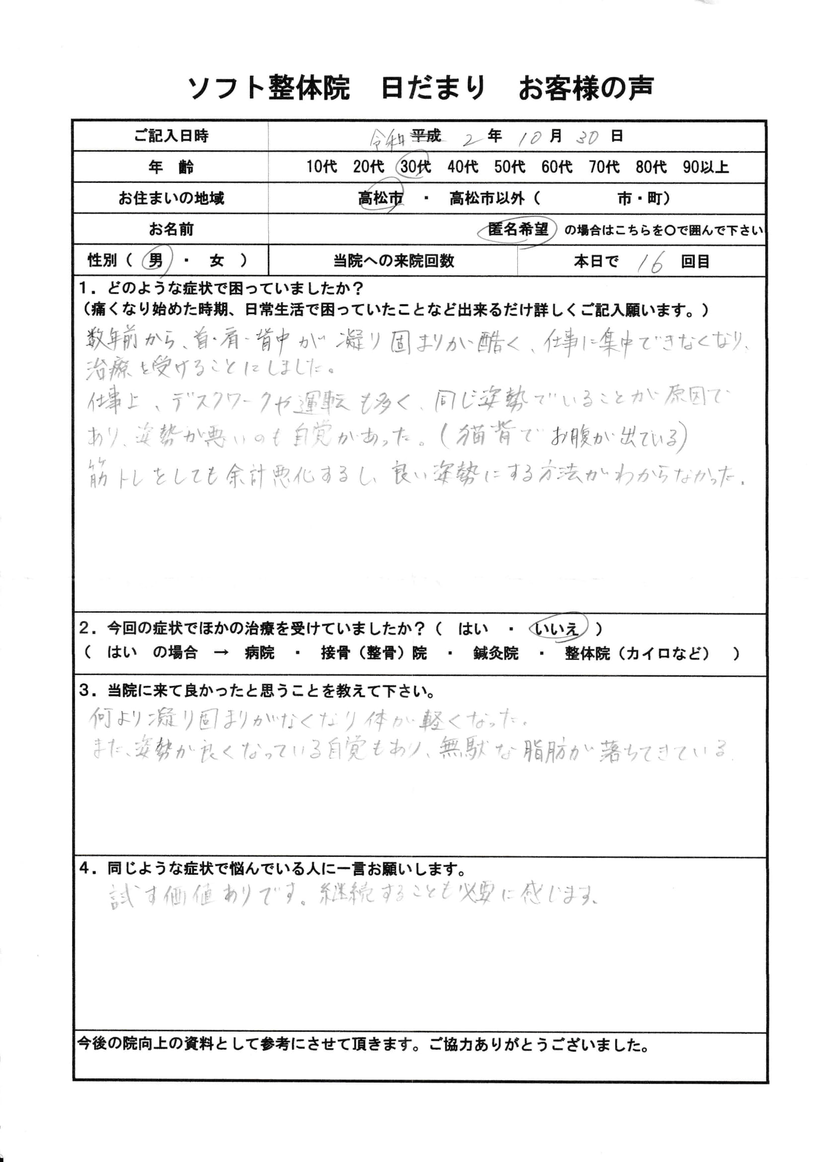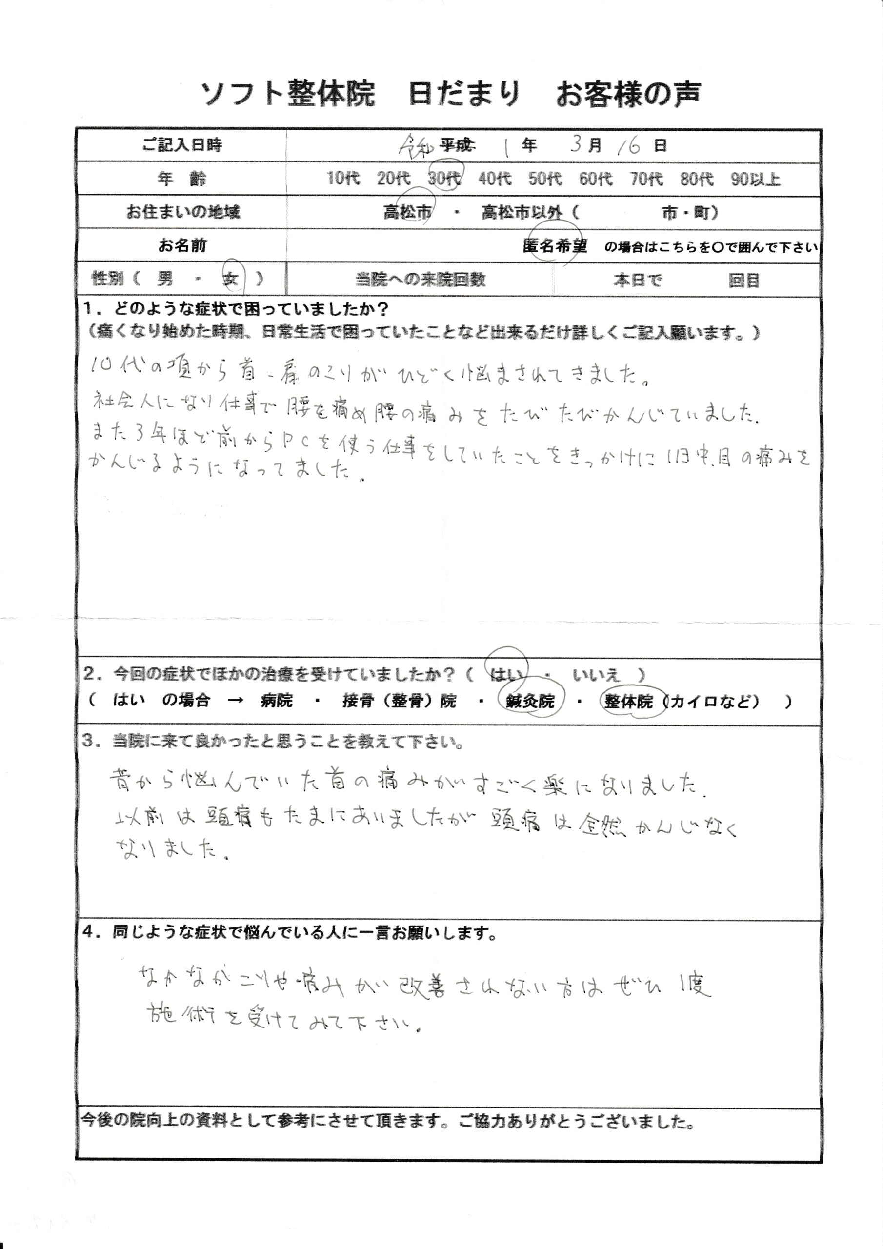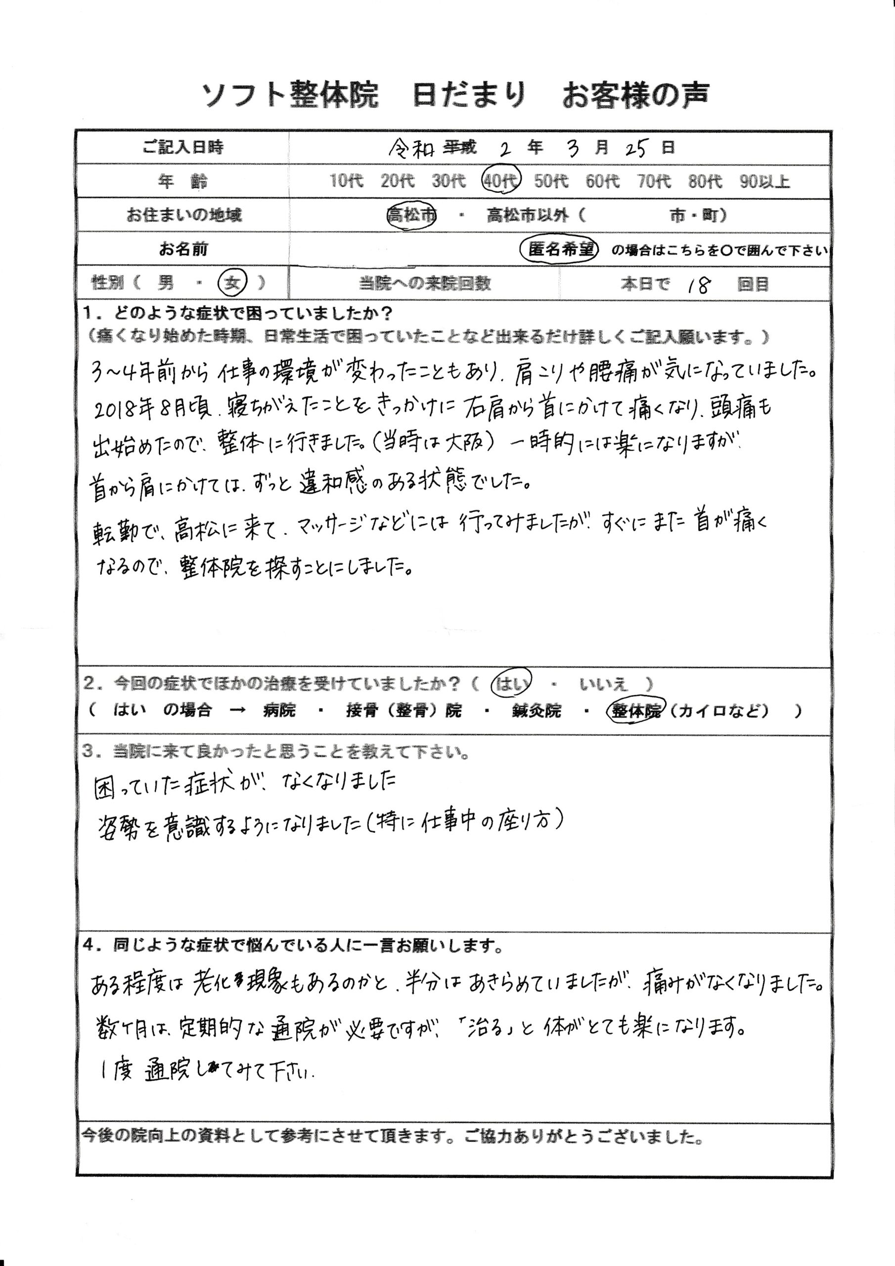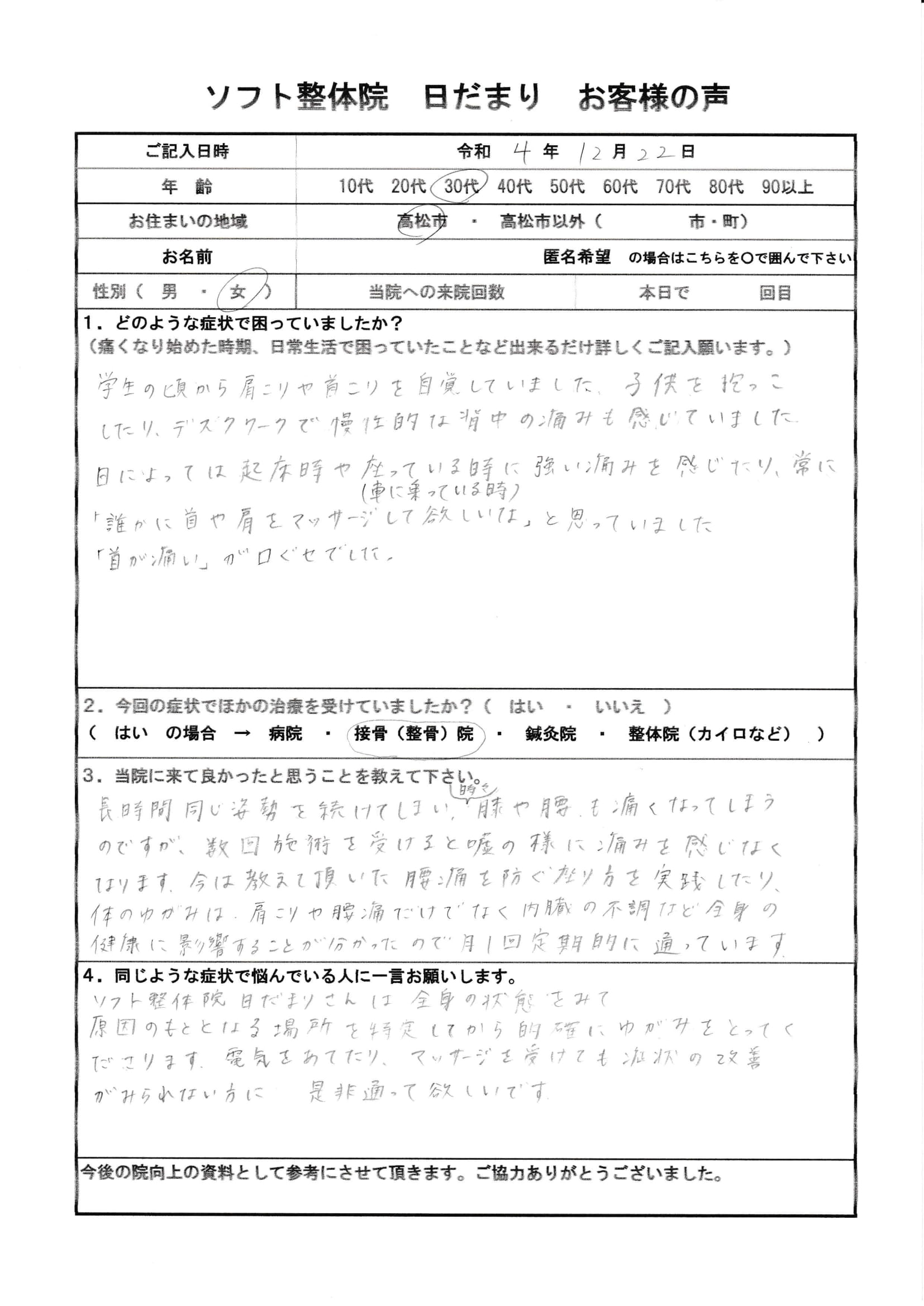 3~4年前から仕事の環境が変わったこともあり、肩こりや腰痛が気になっていました。2018年8月頃、寝ちがえたことをきっかけに右肩から首にかけて痛くなり、頭痛も出始めたので、整体に行きました(当時は大阪)一時的には楽になりますが、首から肩にかけては、ずっと違和感のある状態でした。転勤で、高松に来て、マッサージなどには行ってみましたが、すぐにまた首が痛くなるので、整体院を探すことにしました。