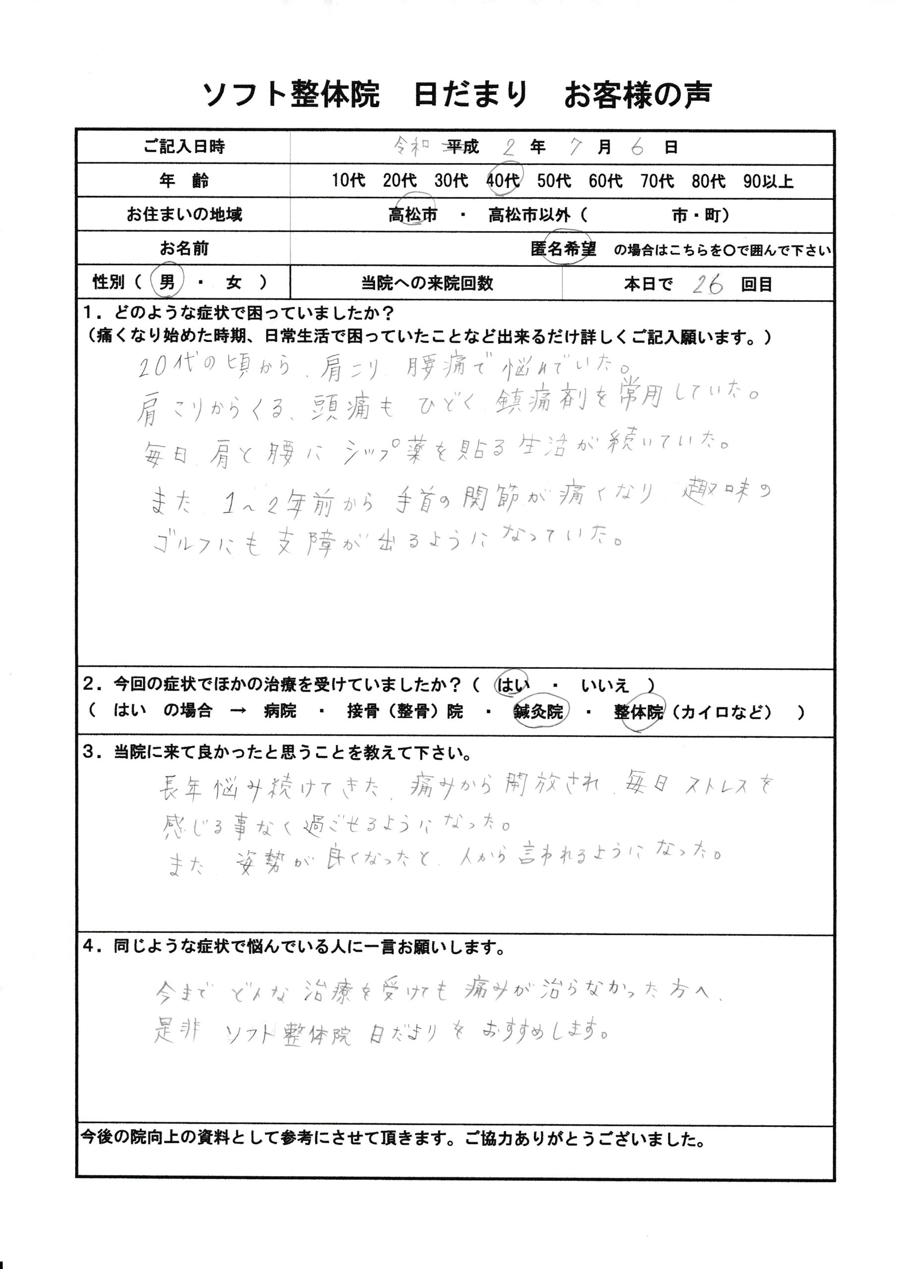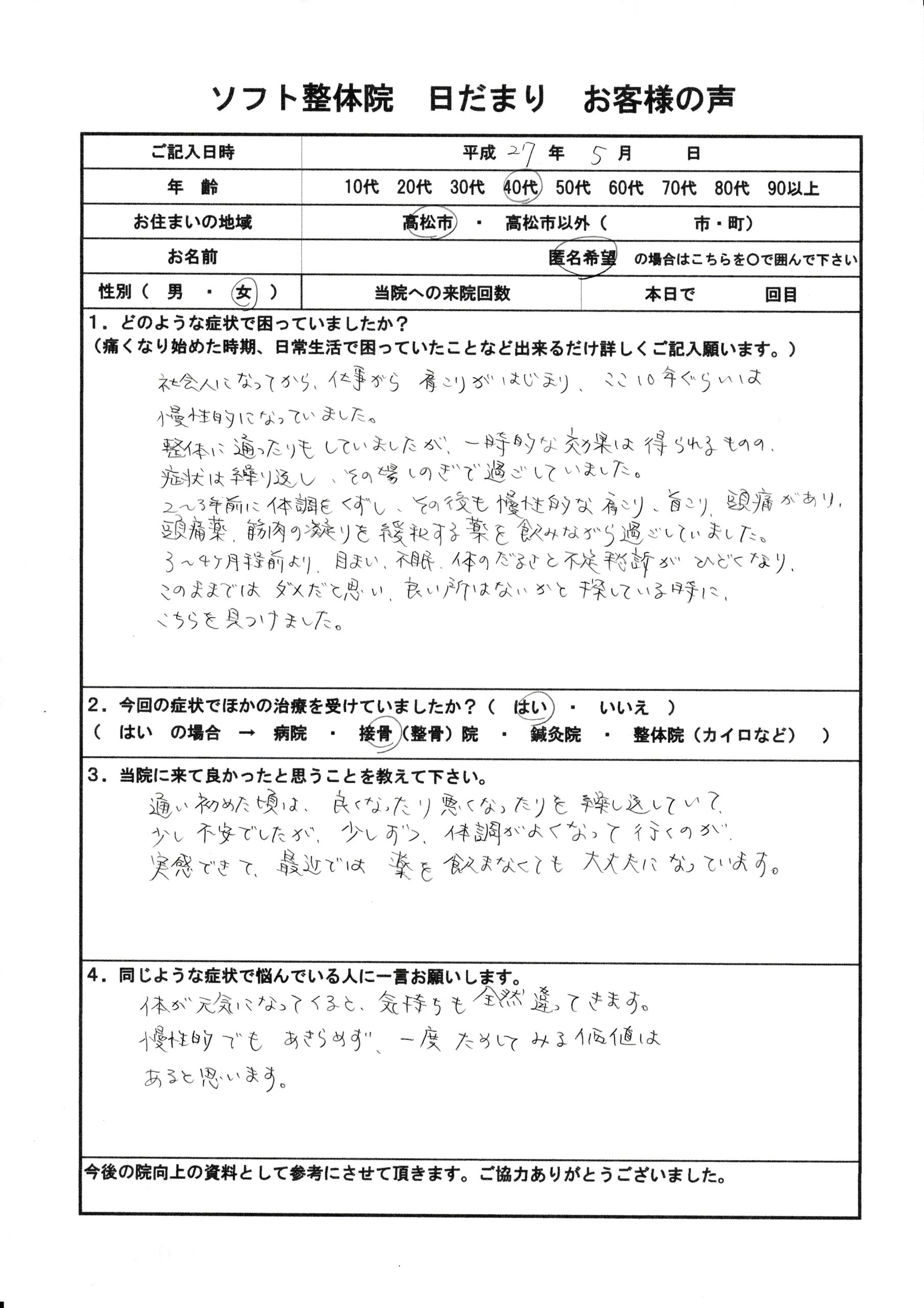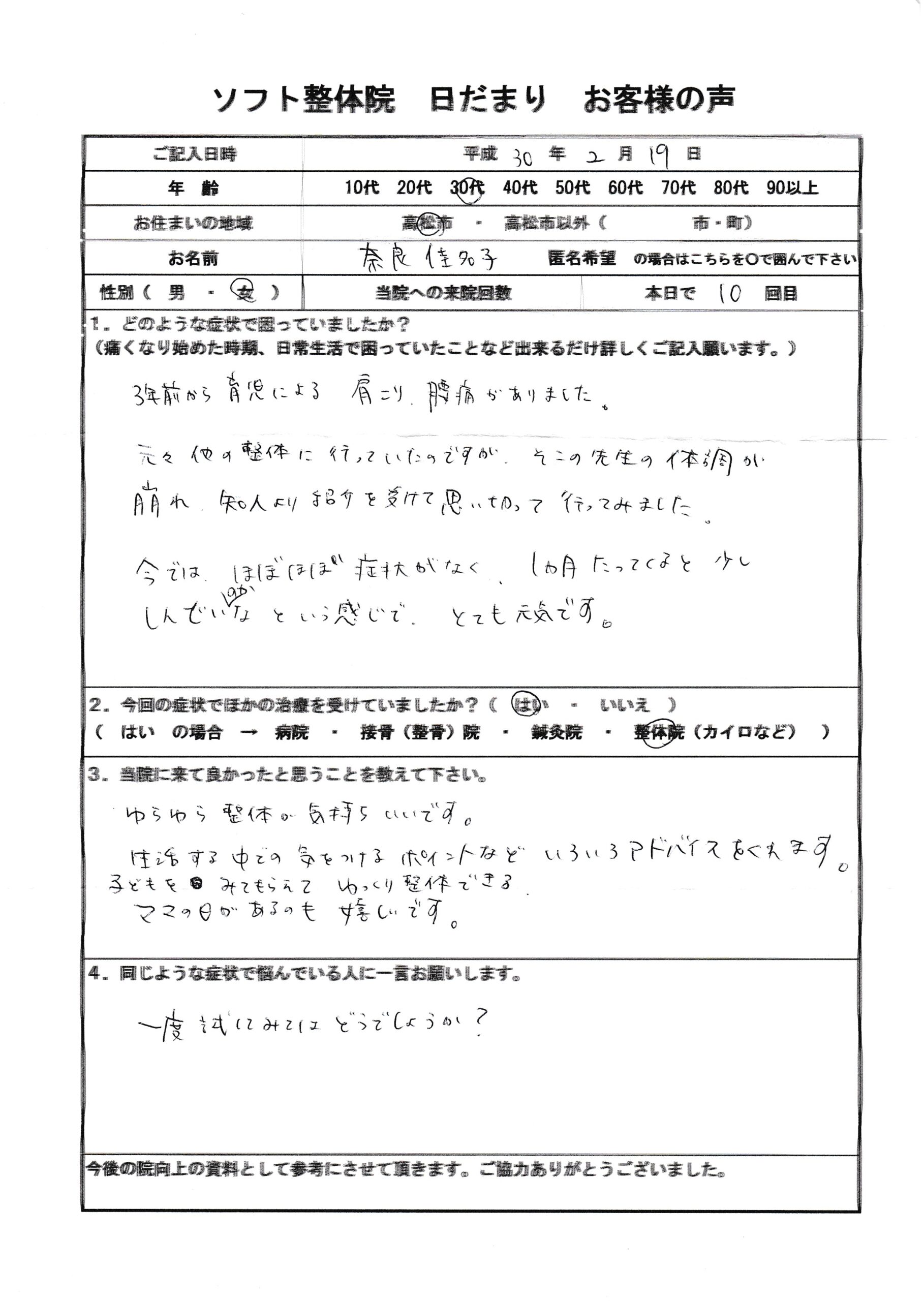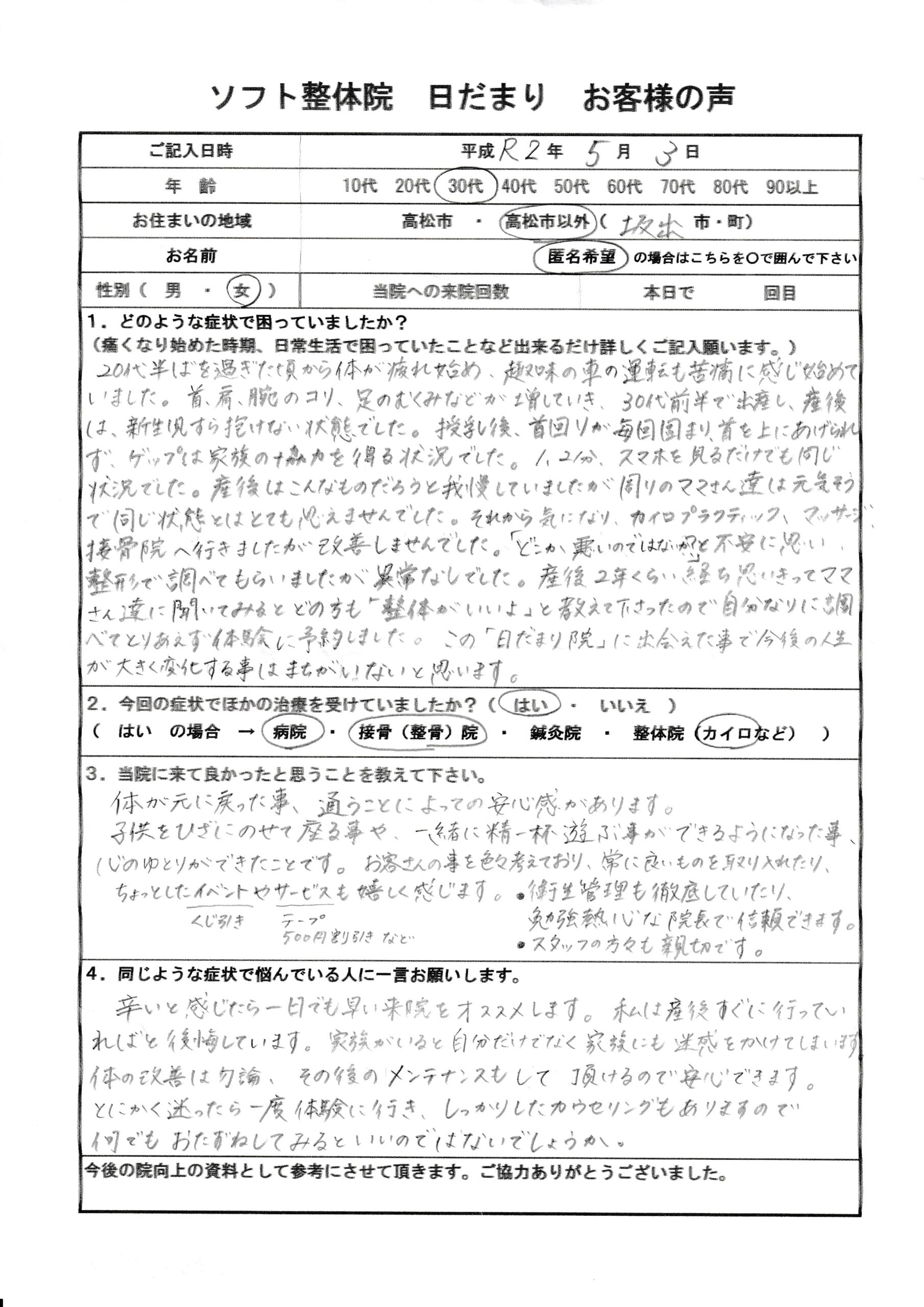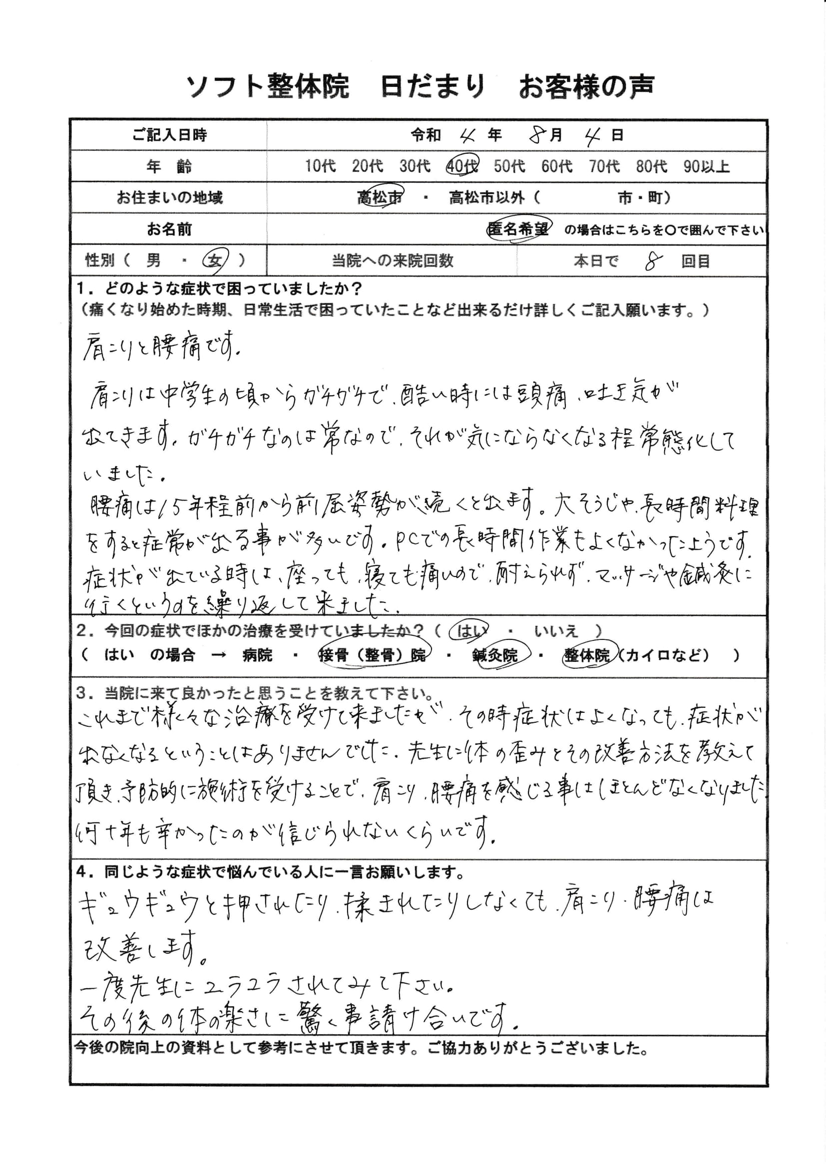 3~4年前から仕事の環境が変わったこともあり、肩こりや腰痛が気になっていました。2018年8月頃、寝ちがえたことをきっかけに右肩から首にかけて痛くなり、頭痛も出始めたので、整体に行きました(当時は大阪)一時的には楽になりますが、首から肩にかけては、ずっと違和感のある状態でした。転勤で、高松に来て、マッサージなどには行ってみましたが、すぐにまた首が痛くなるので、整体院を探すことにしました。