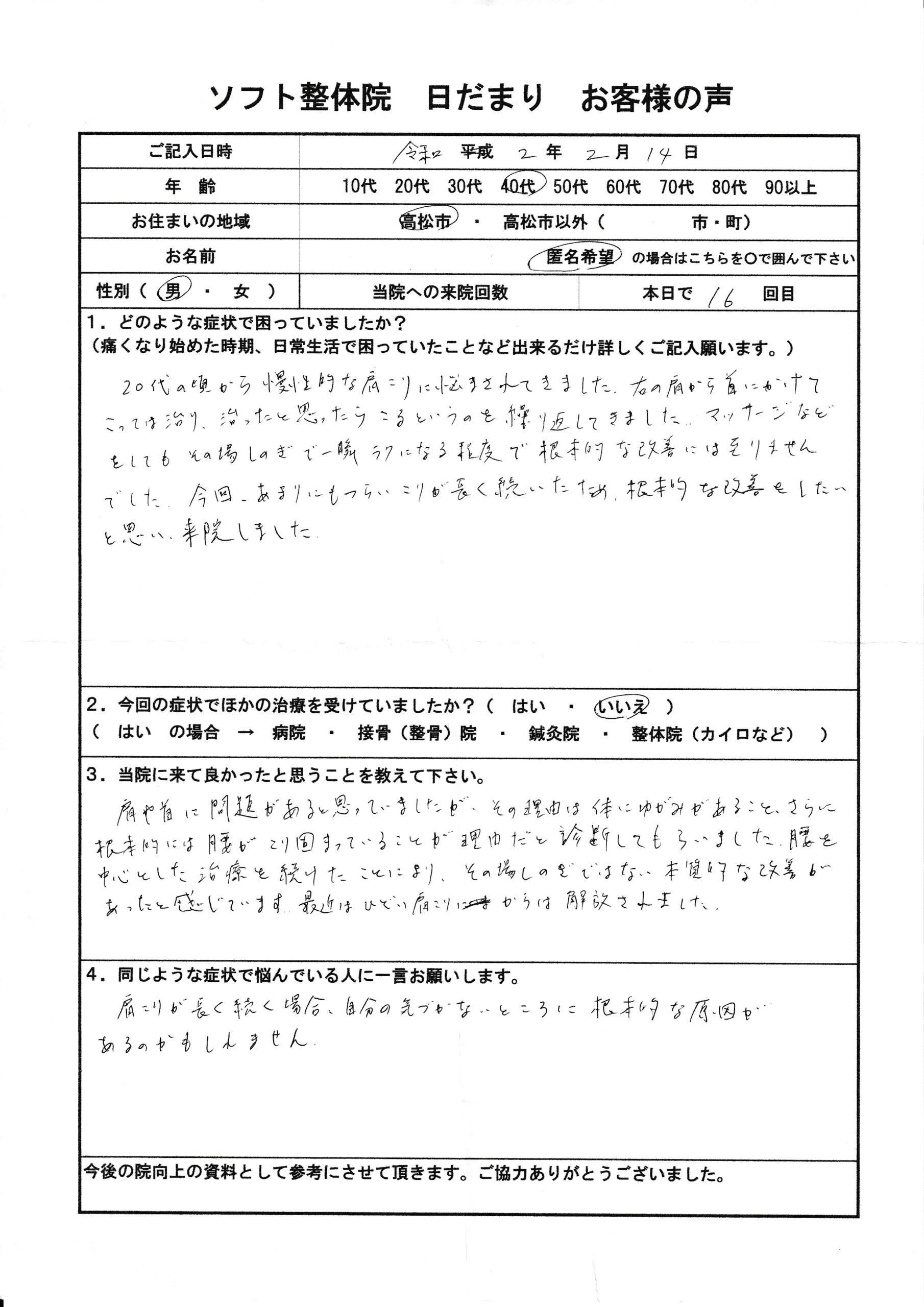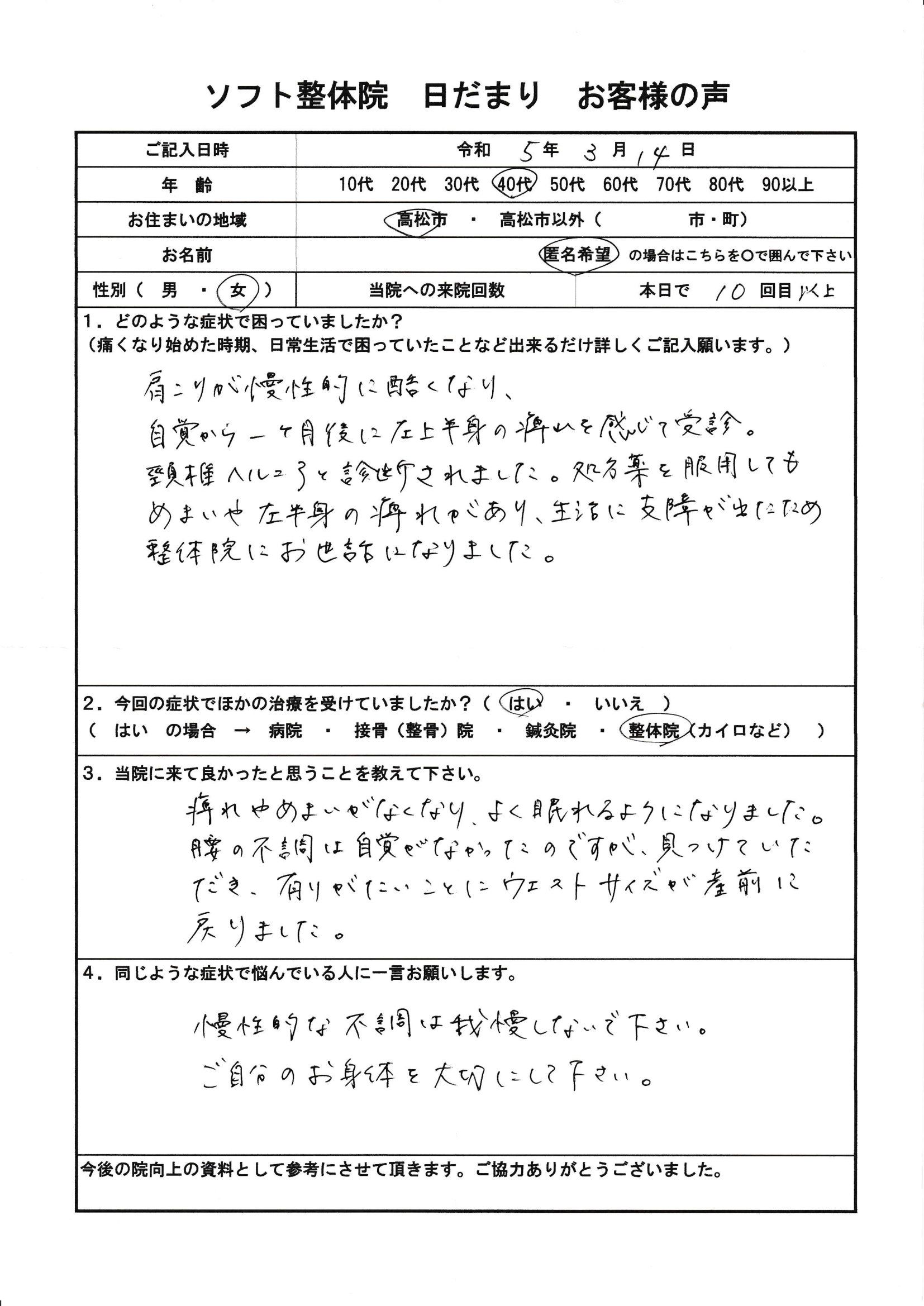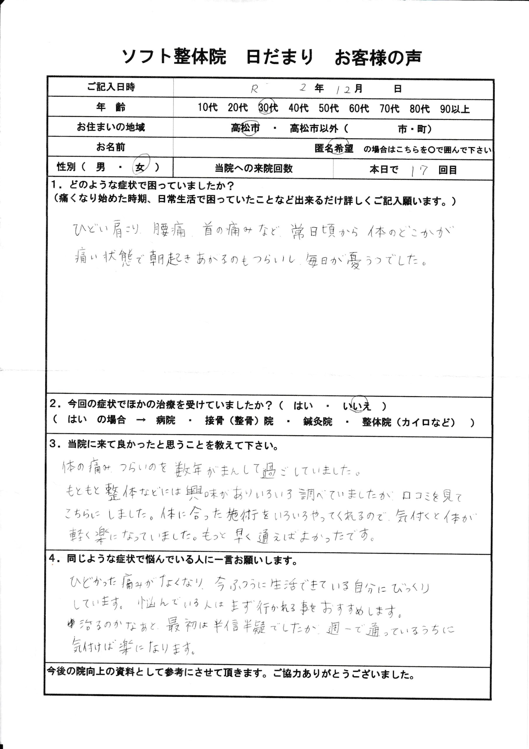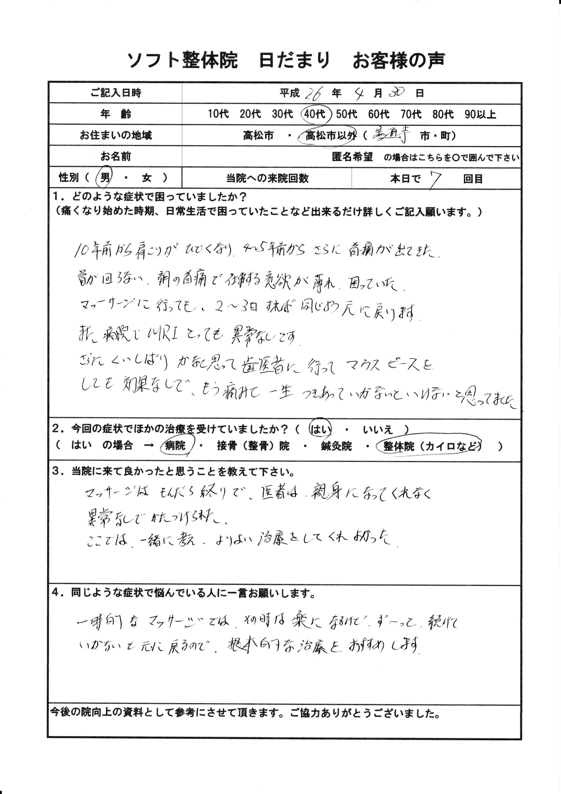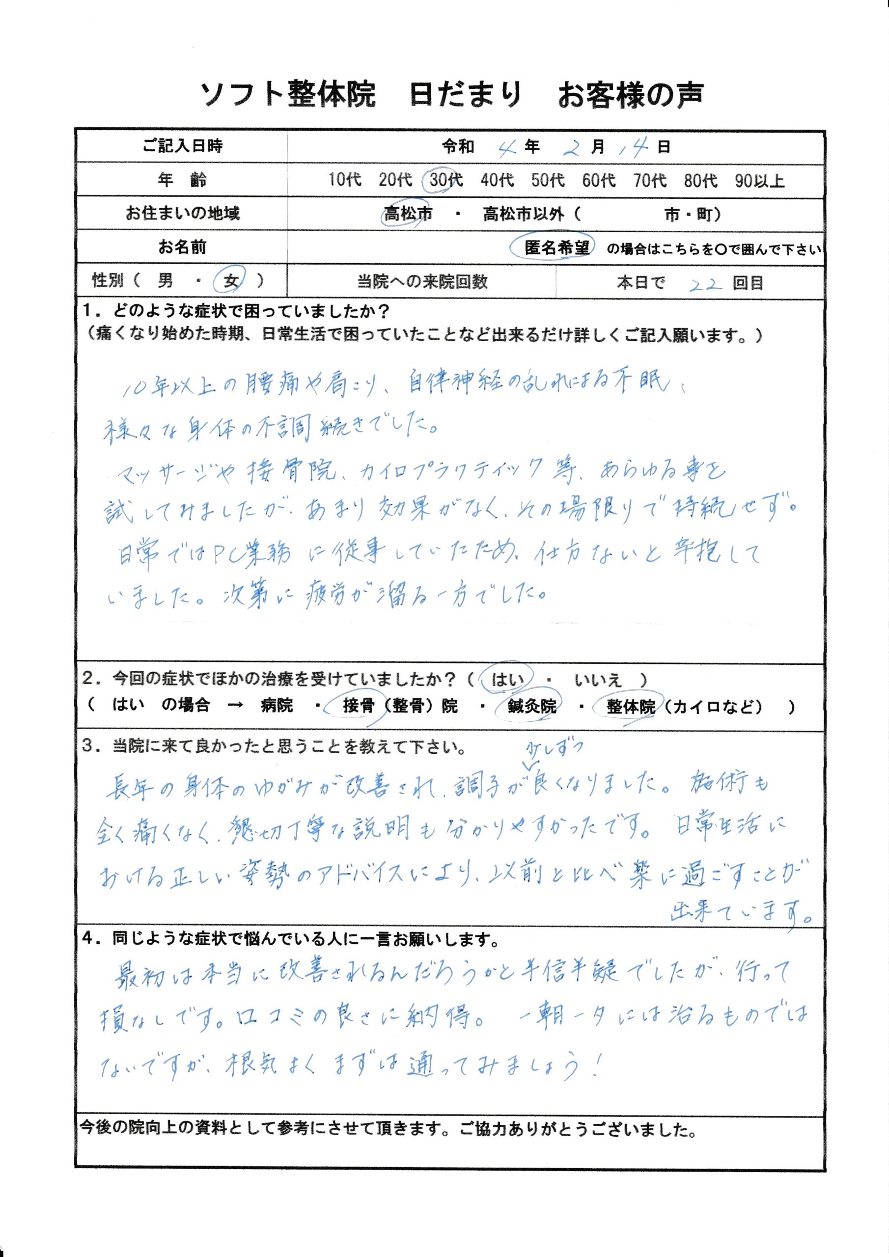 3~4年前から仕事の環境が変わったこともあり、肩こりや腰痛が気になっていました。2018年8月頃、寝ちがえたことをきっかけに右肩から首にかけて痛くなり、頭痛も出始めたので、整体に行きました(当時は大阪)一時的には楽になりますが、首から肩にかけては、ずっと違和感のある状態でした。転勤で、高松に来て、マッサージなどには行ってみましたが、すぐにまた首が痛くなるので、整体院を探すことにしました。