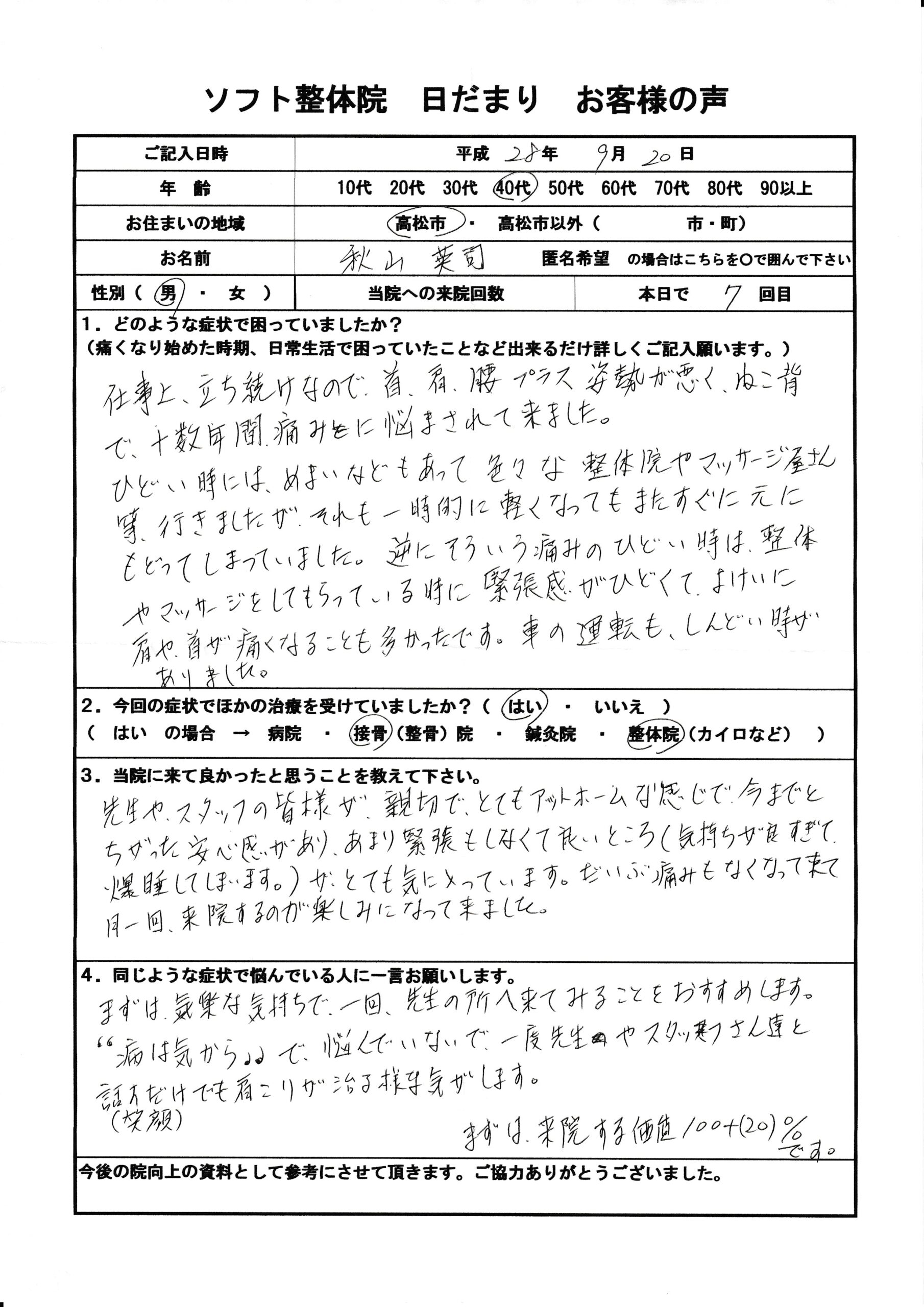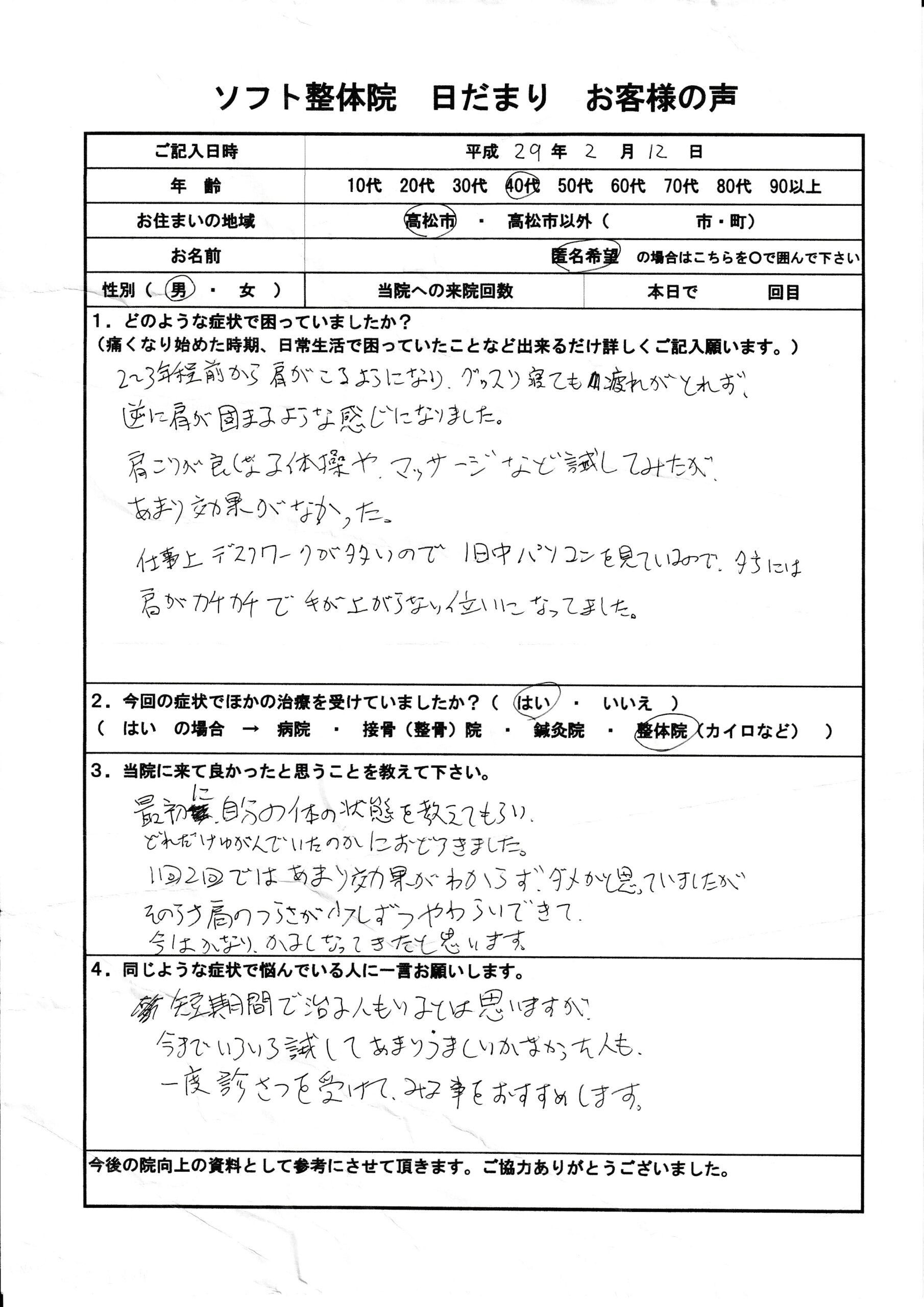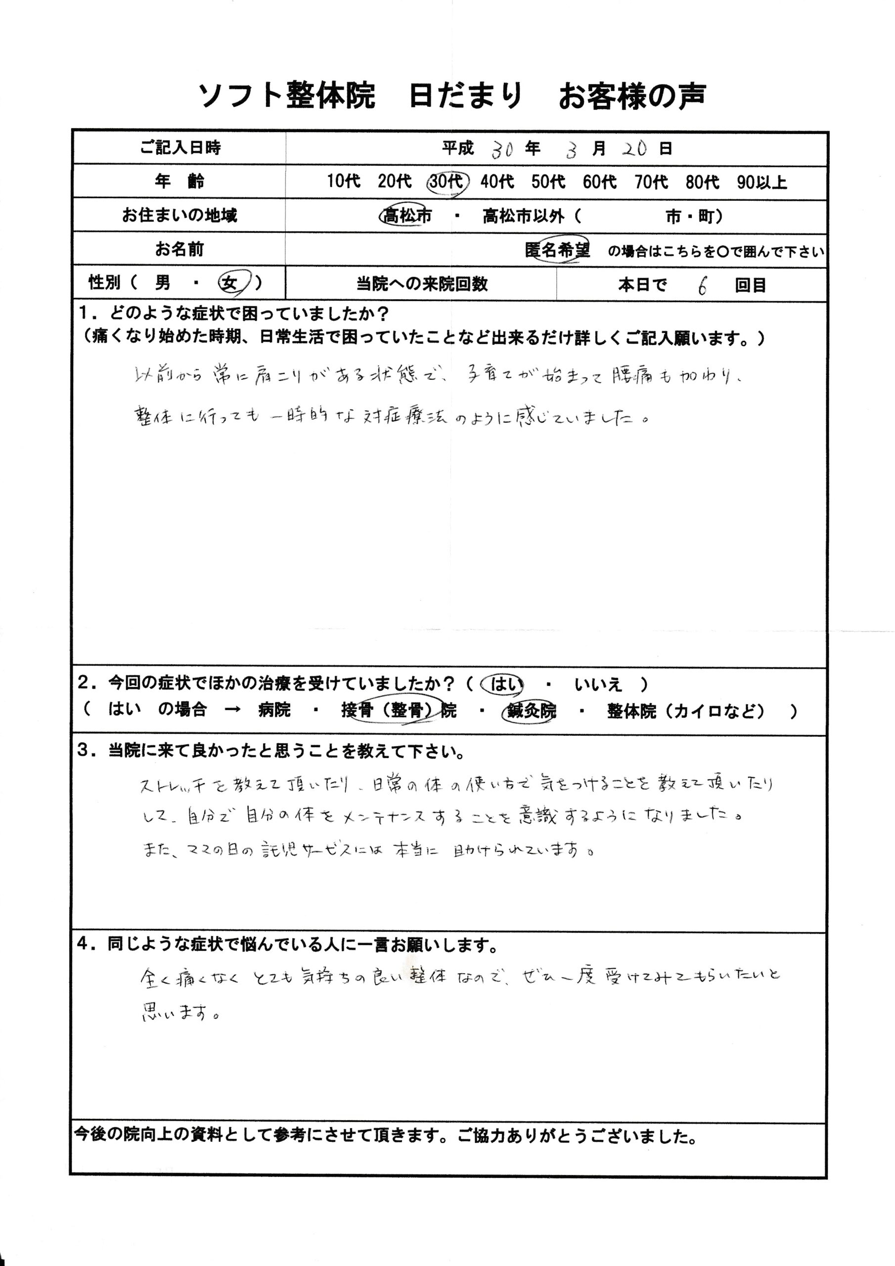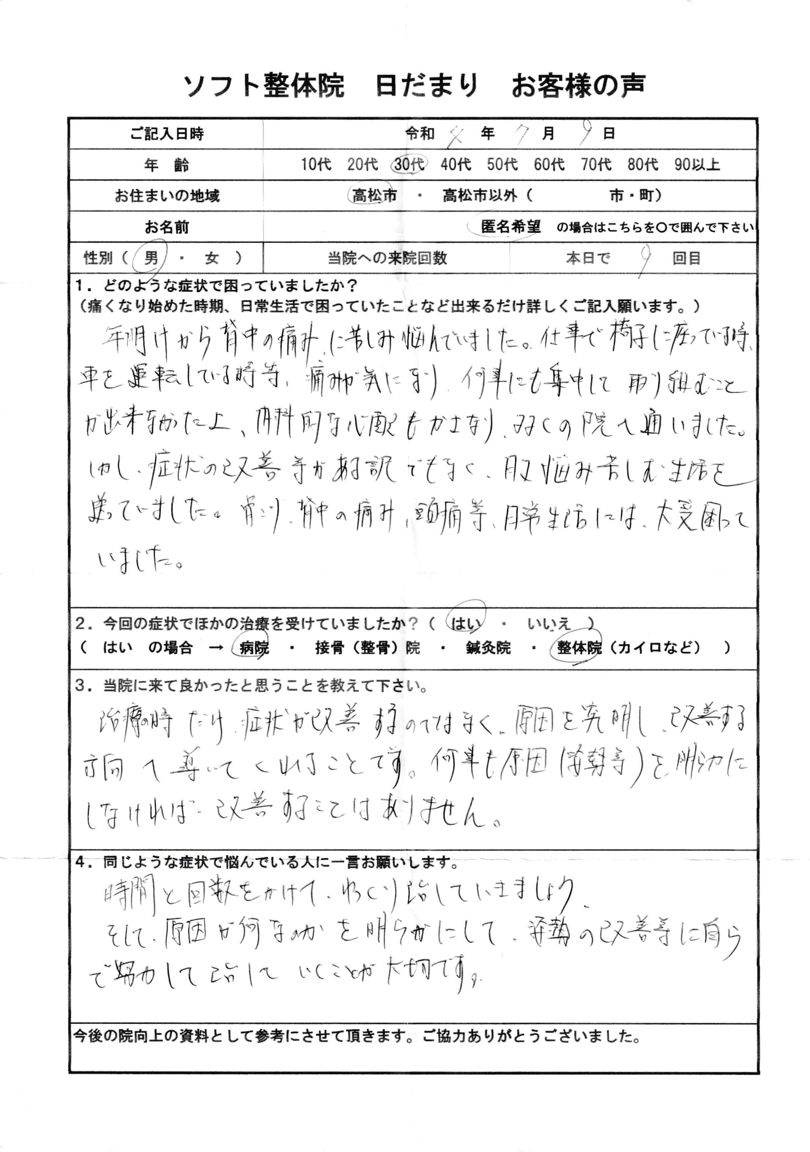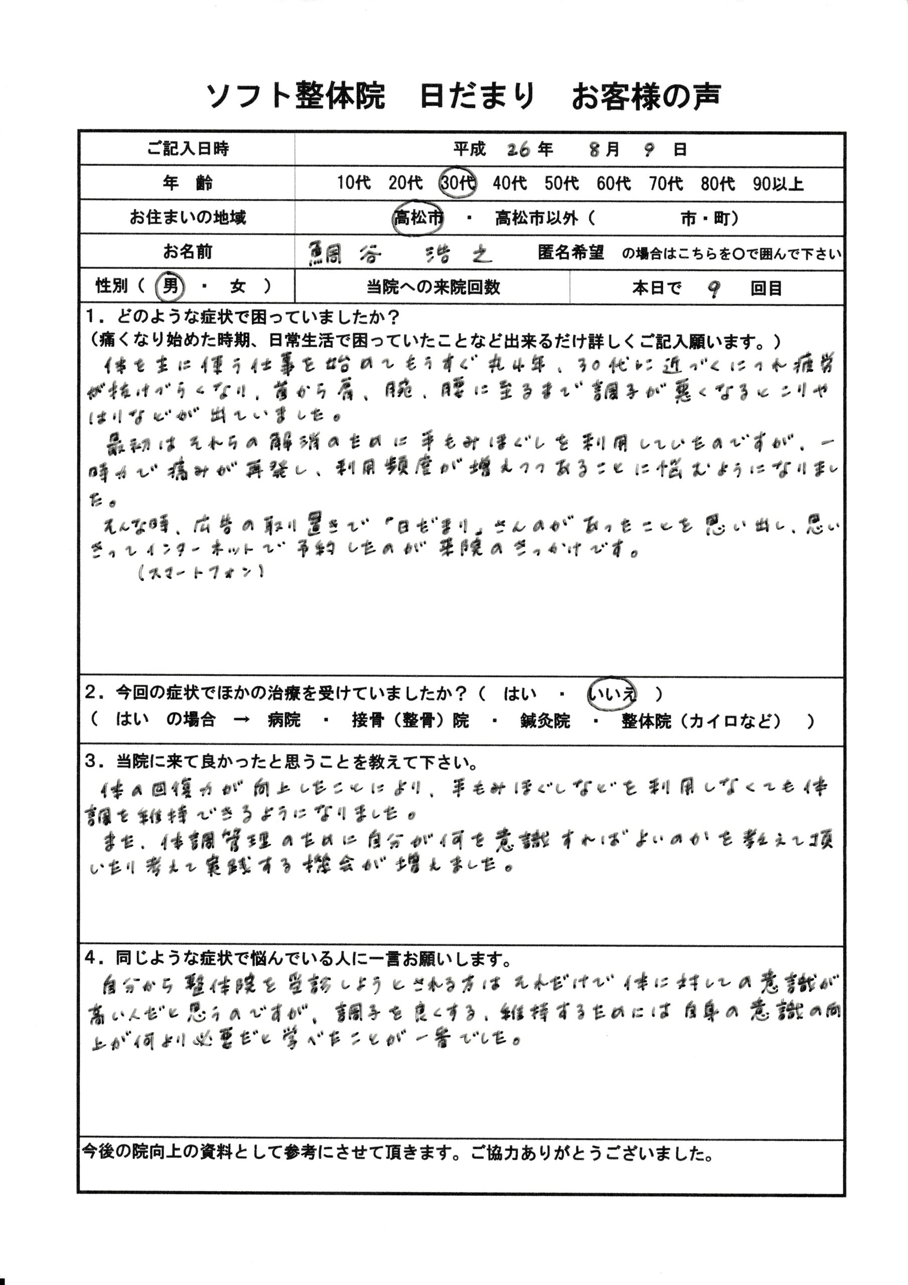 3~4年前から仕事の環境が変わったこともあり、肩こりや腰痛が気になっていました。2018年8月頃、寝ちがえたことをきっかけに右肩から首にかけて痛くなり、頭痛も出始めたので、整体に行きました(当時は大阪)一時的には楽になりますが、首から肩にかけては、ずっと違和感のある状態でした。転勤で、高松に来て、マッサージなどには行ってみましたが、すぐにまた首が痛くなるので、整体院を探すことにしました。
