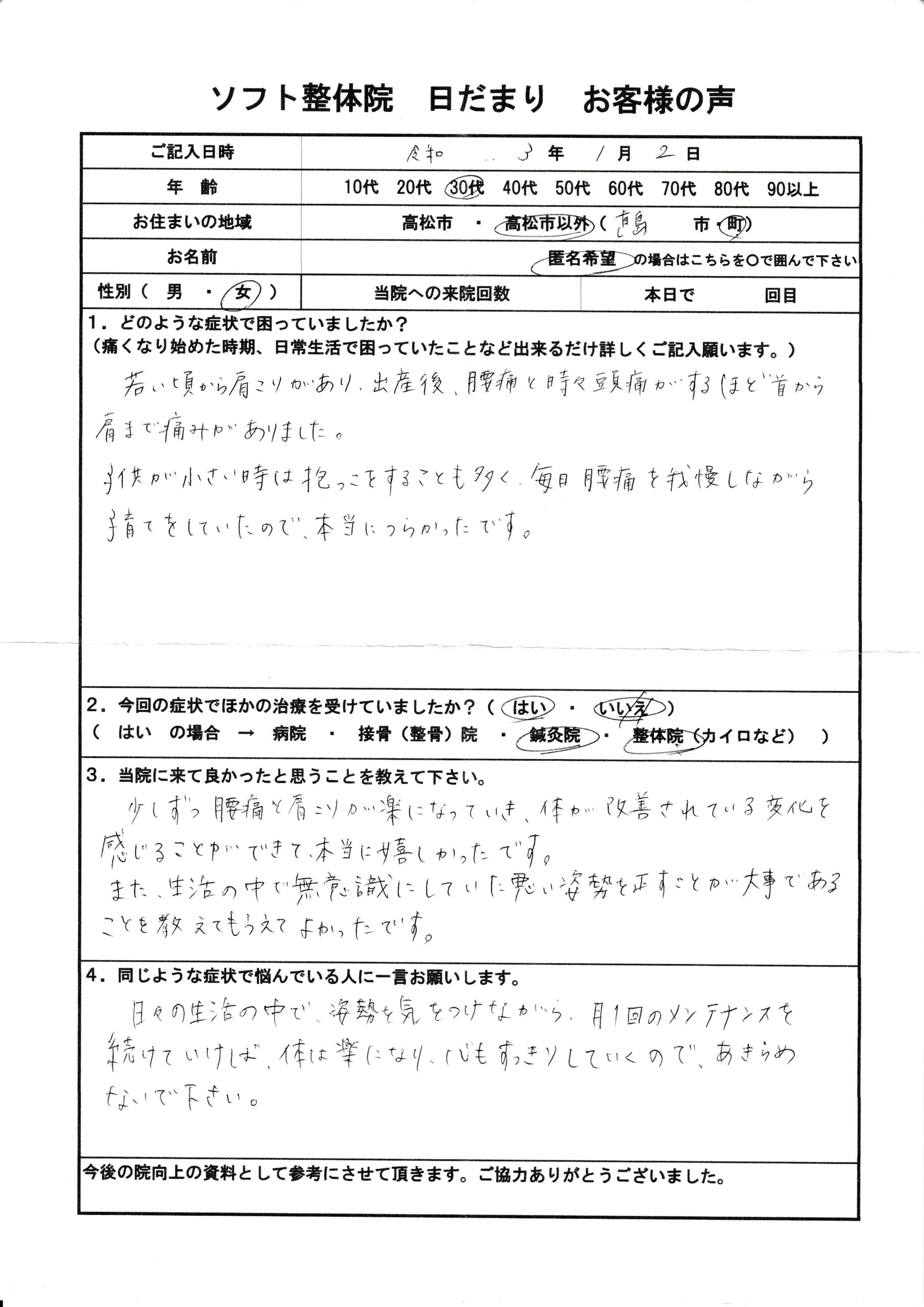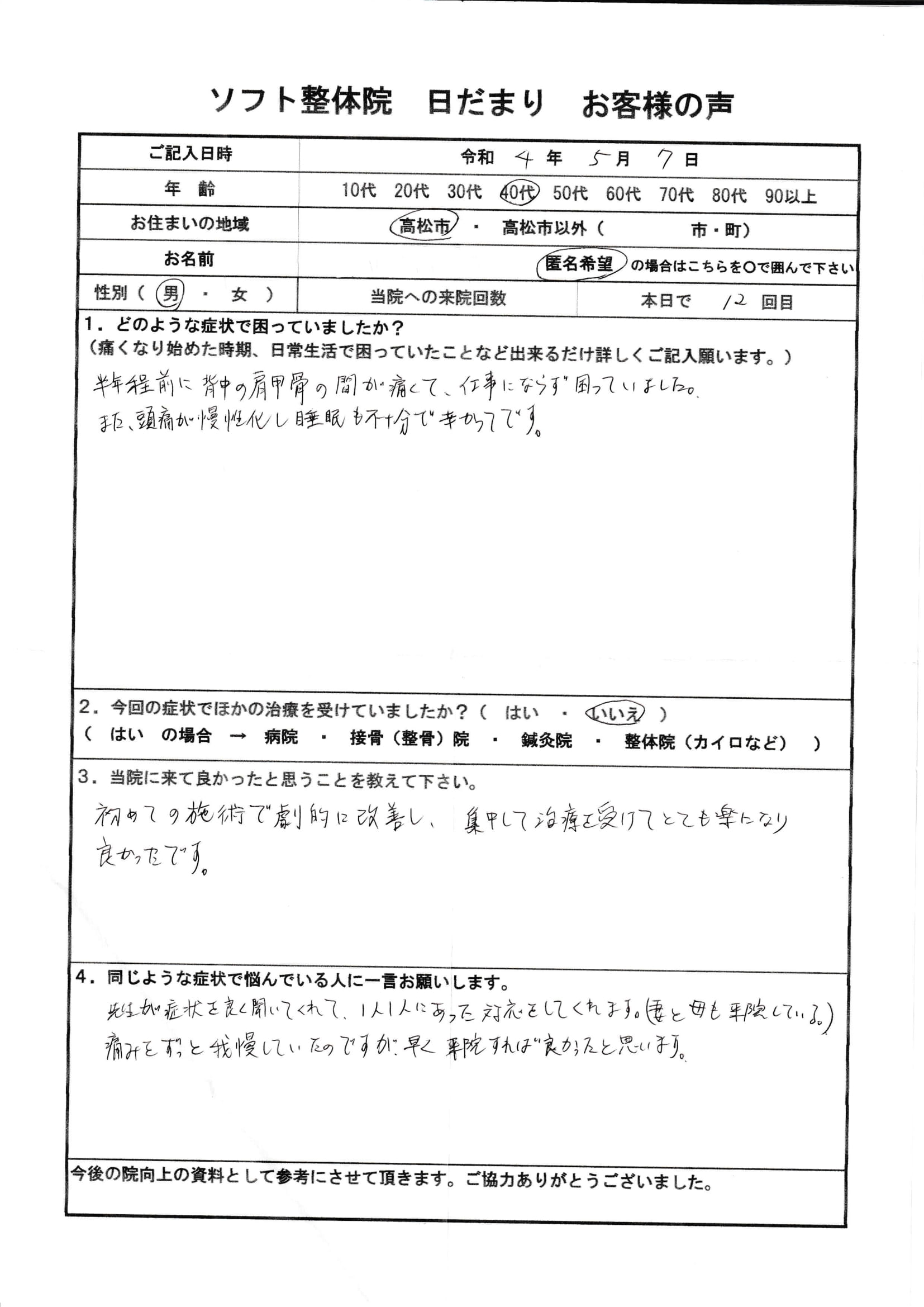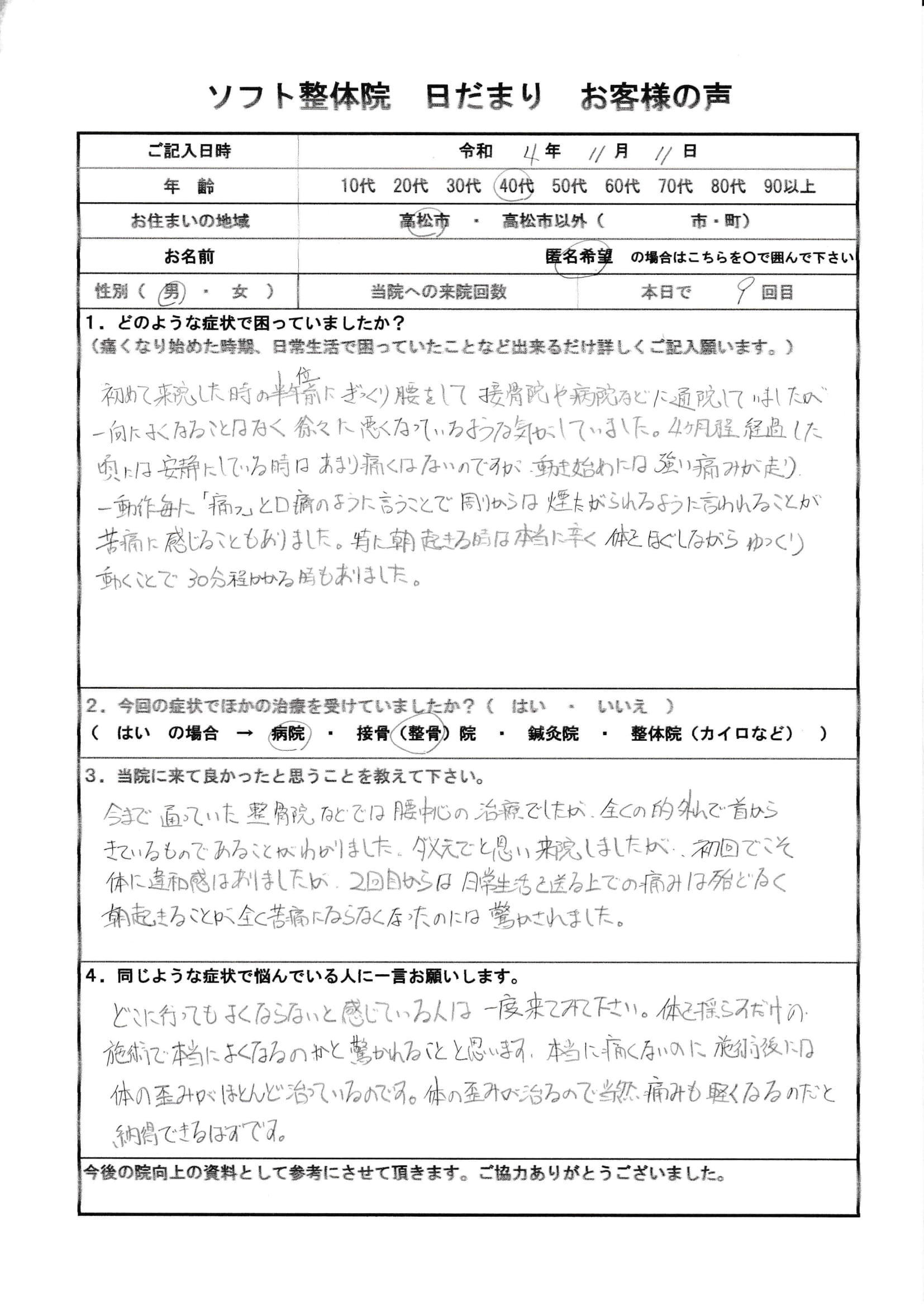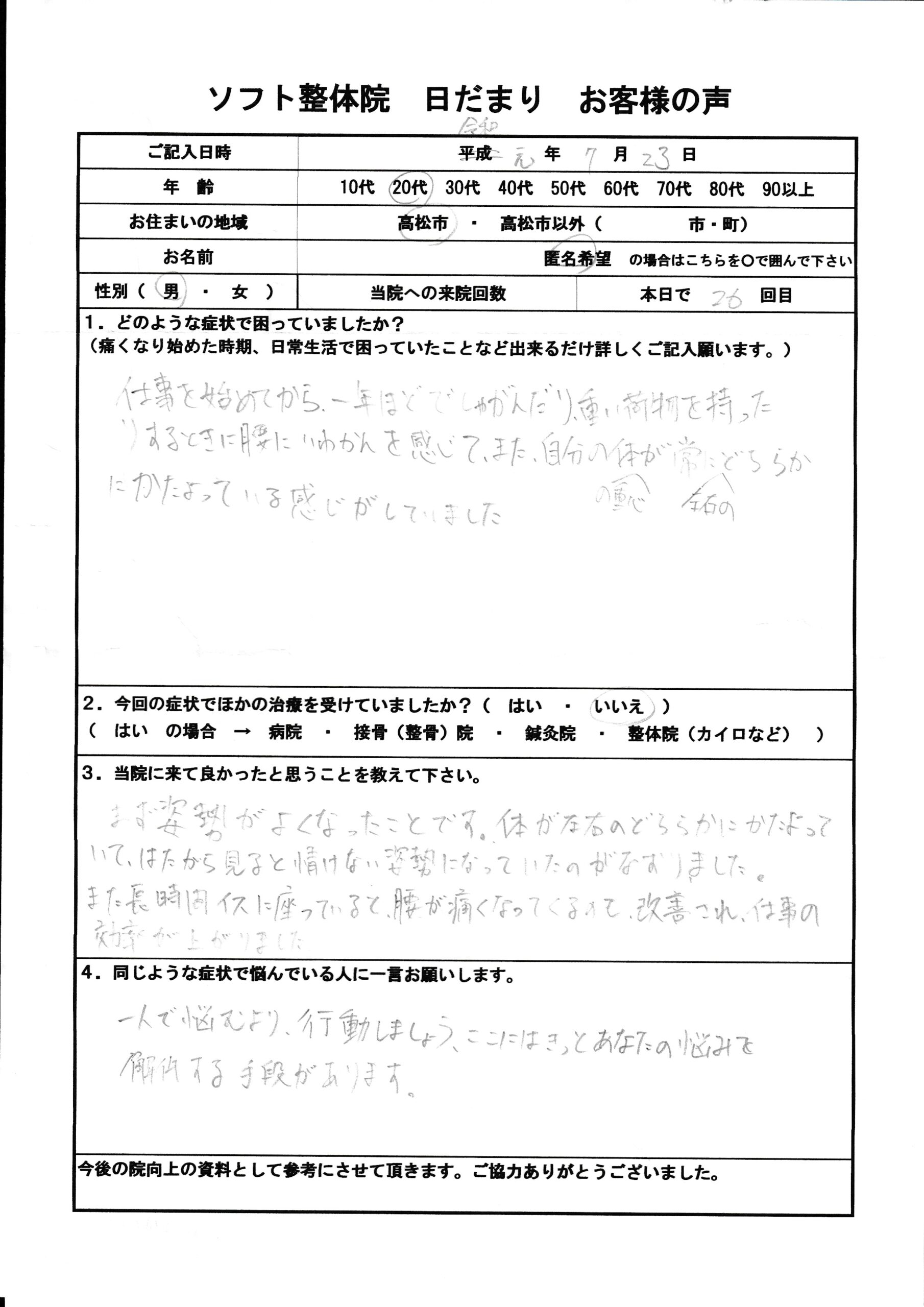 3~4年前から仕事の環境が変わったこともあり、肩こりや腰痛が気になっていました。2018年8月頃、寝ちがえたことをきっかけに右肩から首にかけて痛くなり、頭痛も出始めたので、整体に行きました(当時は大阪)一時的には楽になりますが、首から肩にかけては、ずっと違和感のある状態でした。転勤で、高松に来て、マッサージなどには行ってみましたが、すぐにまた首が痛くなるので、整体院を探すことにしました。
