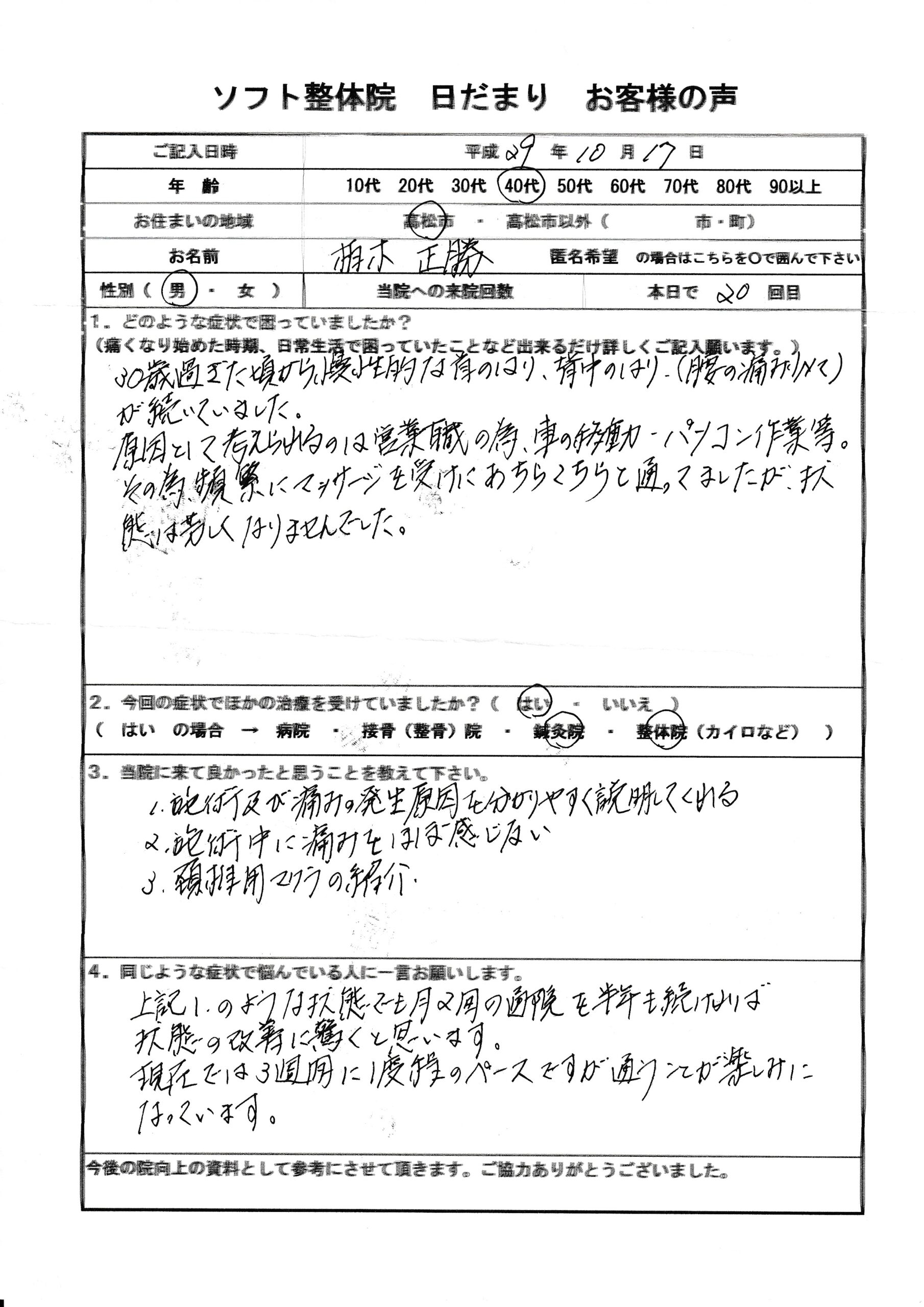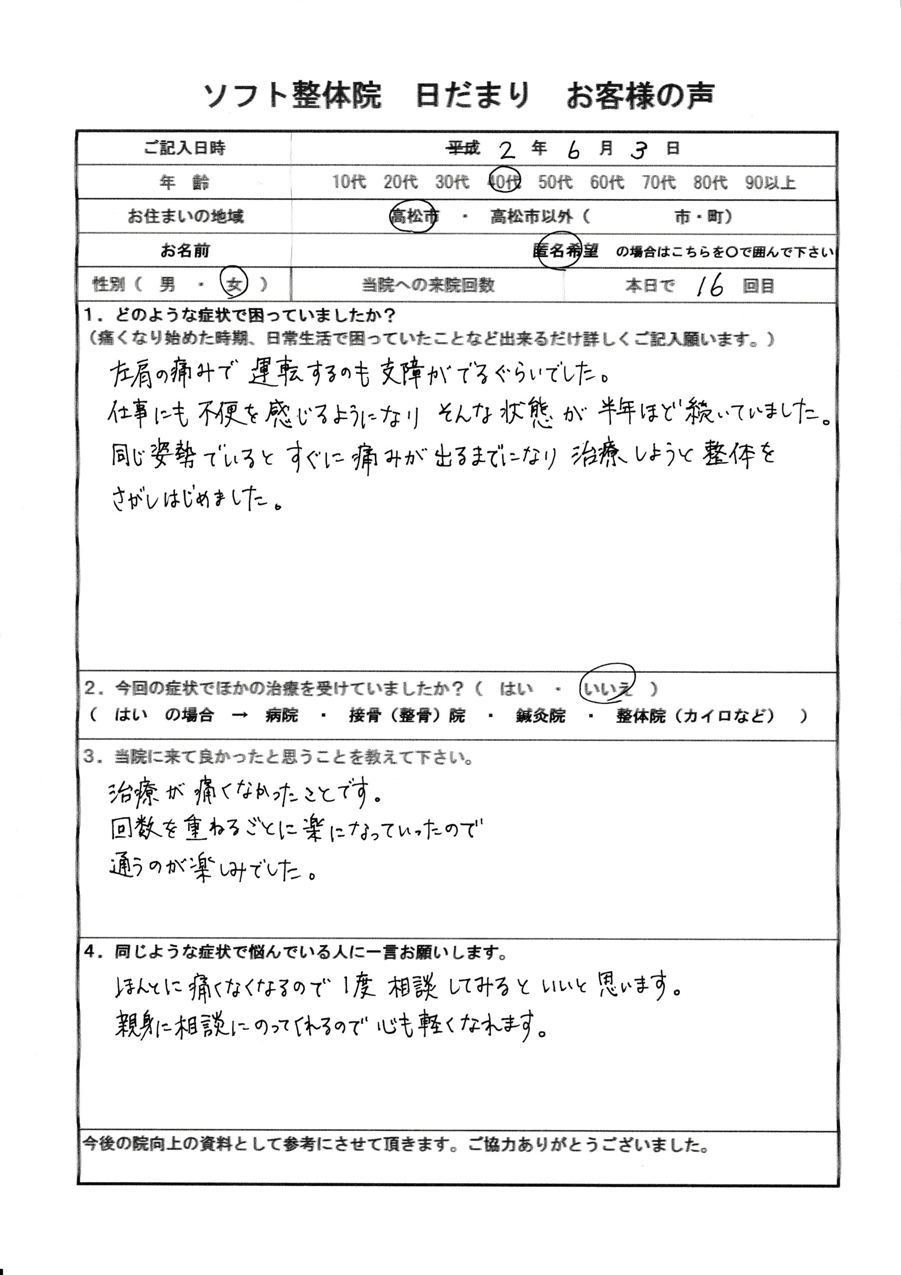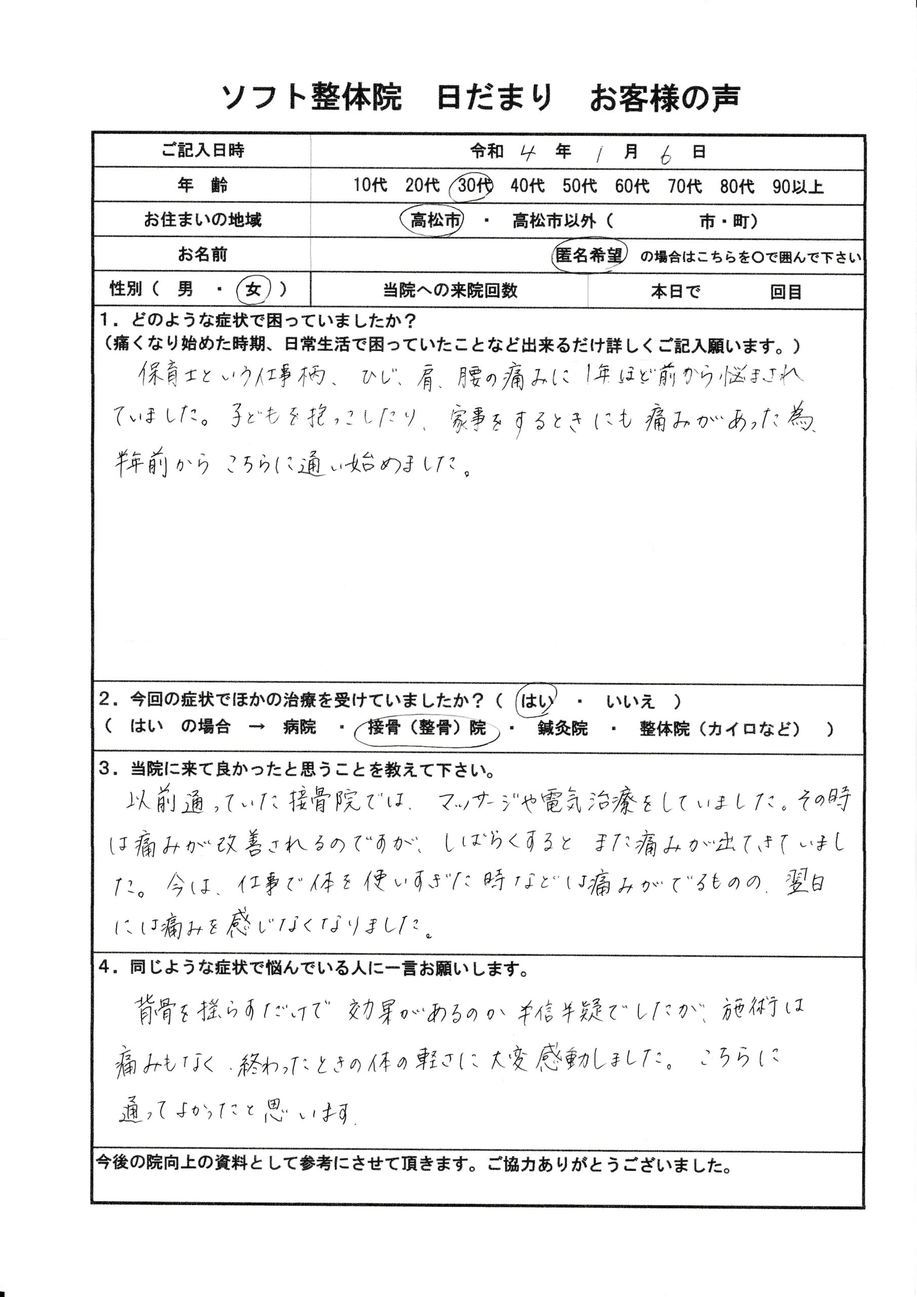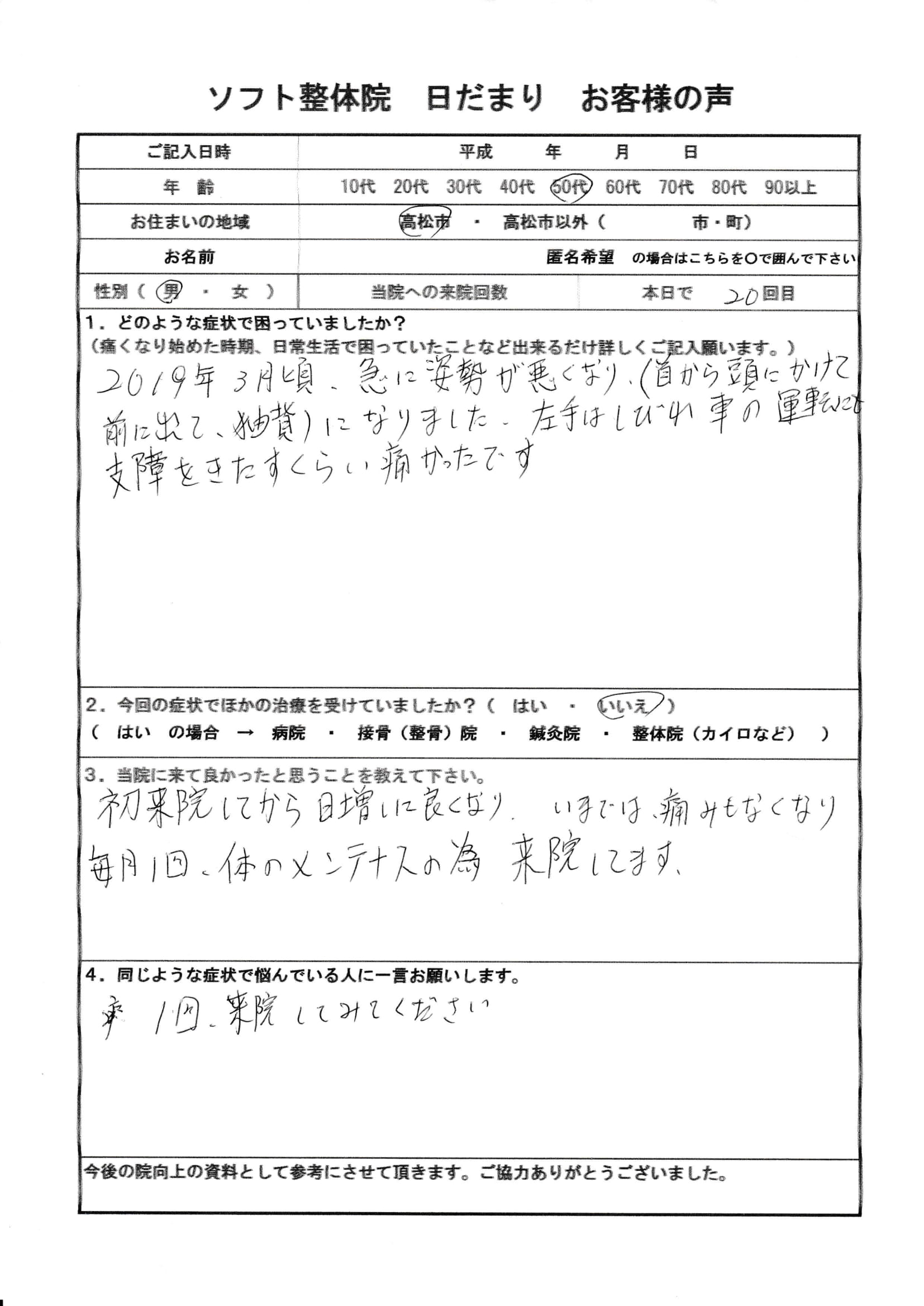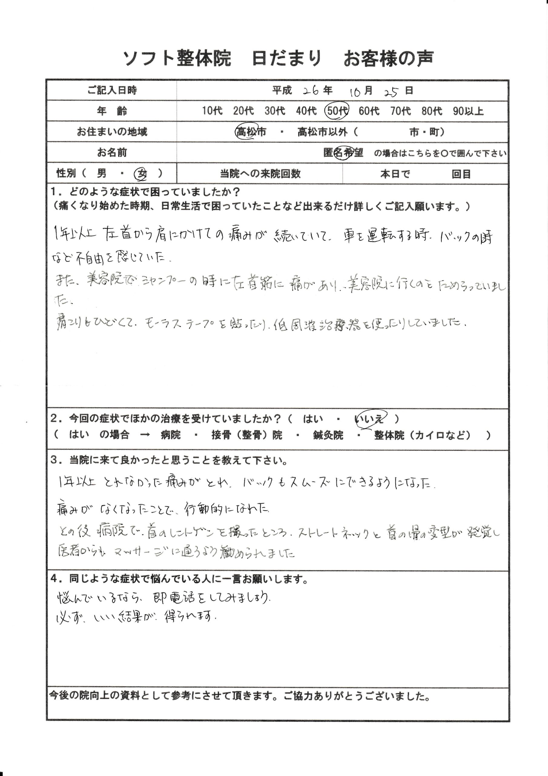 3~4年前から仕事の環境が変わったこともあり、肩こりや腰痛が気になっていました。2018年8月頃、寝ちがえたことをきっかけに右肩から首にかけて痛くなり、頭痛も出始めたので、整体に行きました(当時は大阪)一時的には楽になりますが、首から肩にかけては、ずっと違和感のある状態でした。転勤で、高松に来て、マッサージなどには行ってみましたが、すぐにまた首が痛くなるので、整体院を探すことにしました。