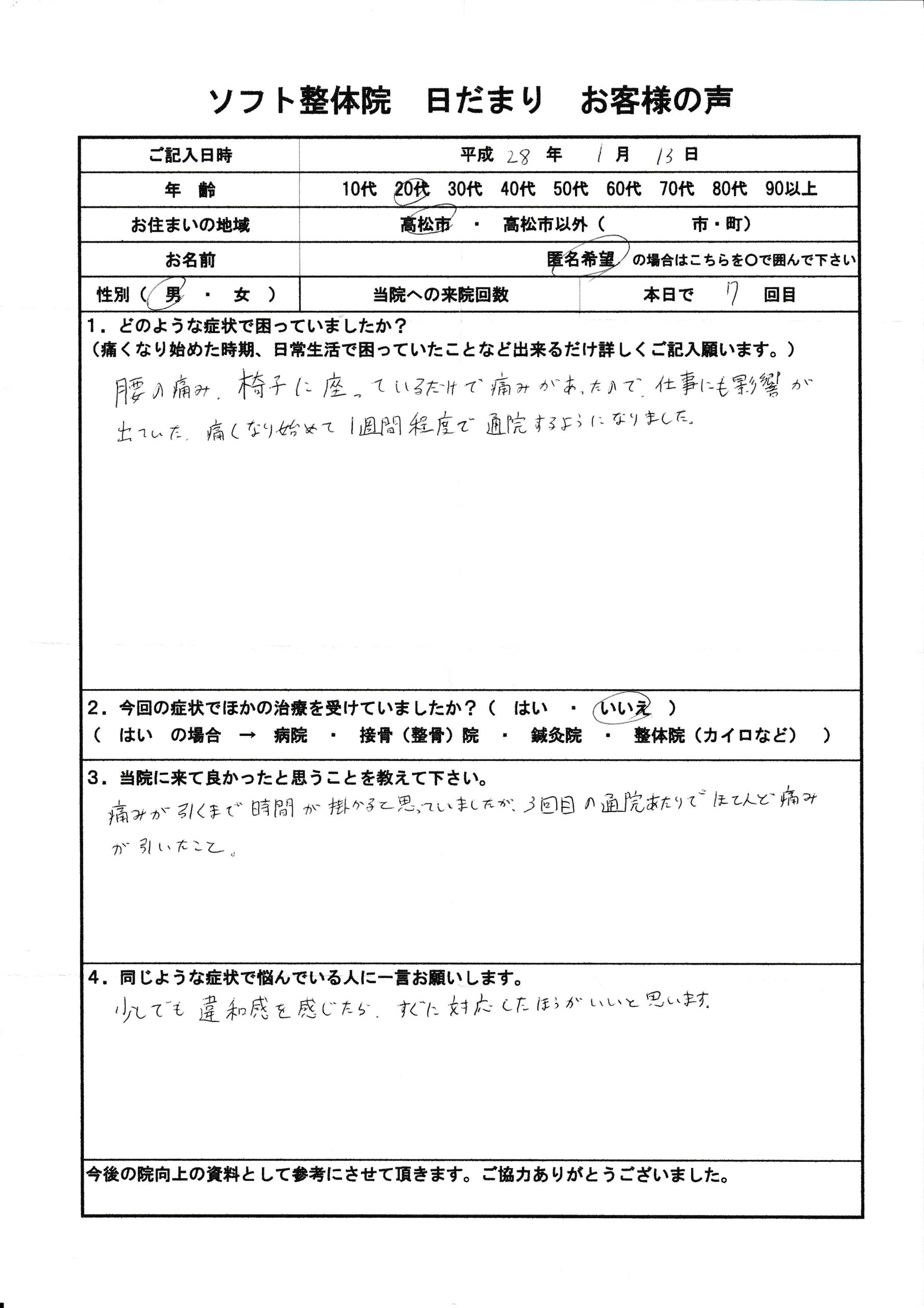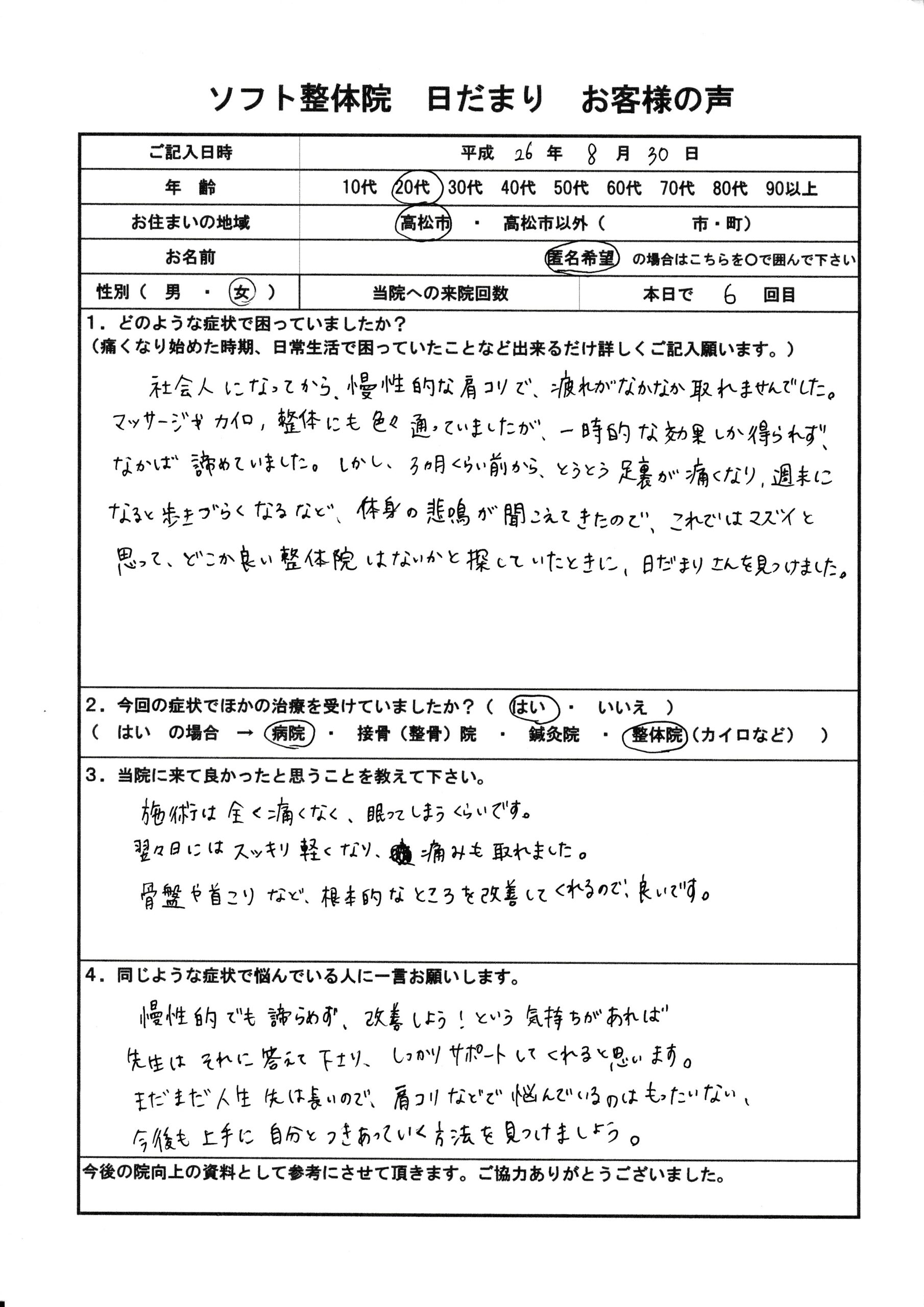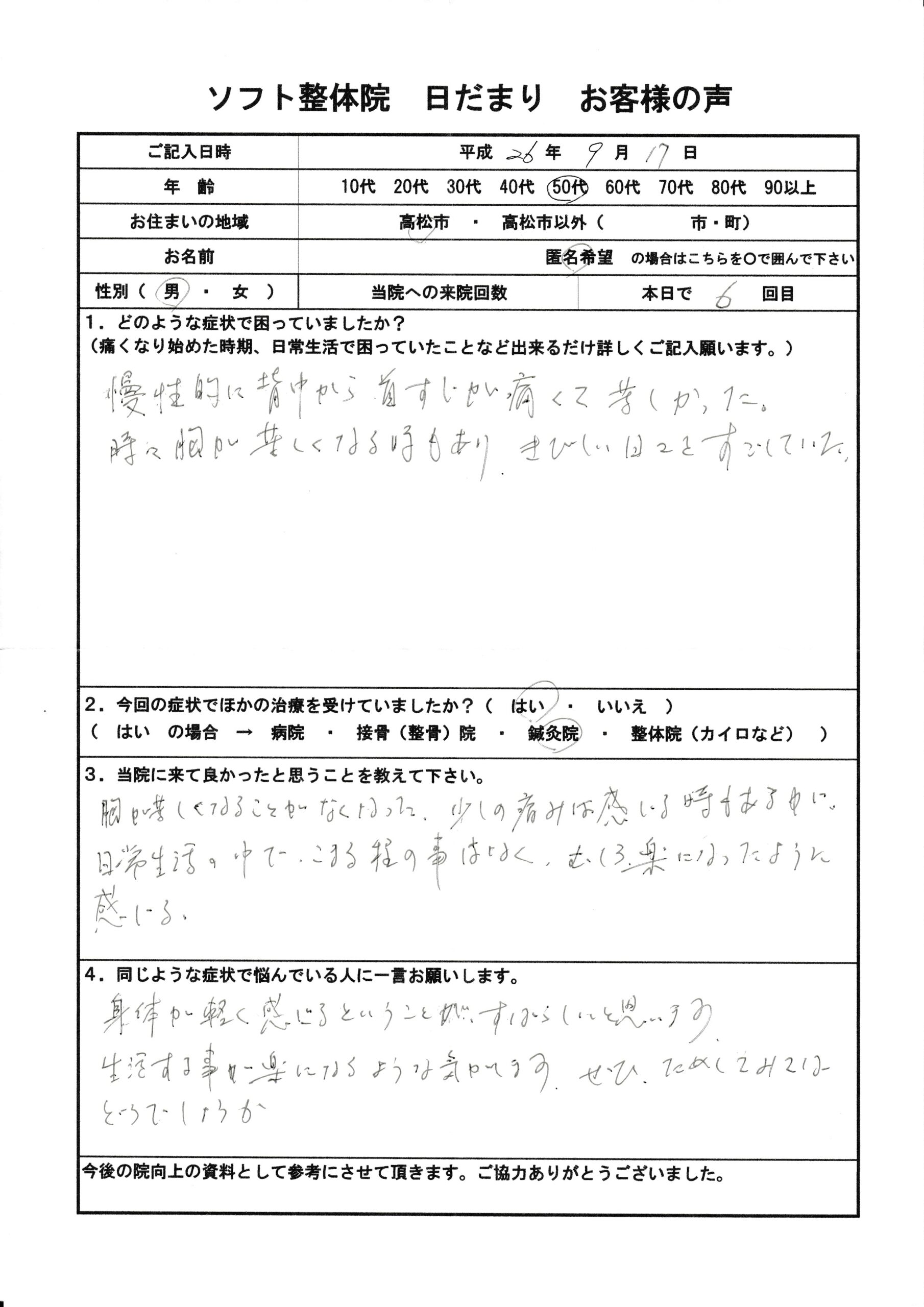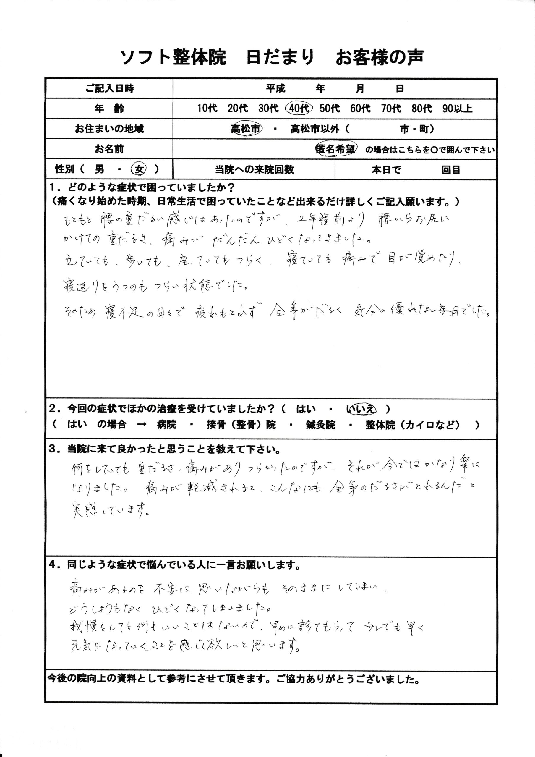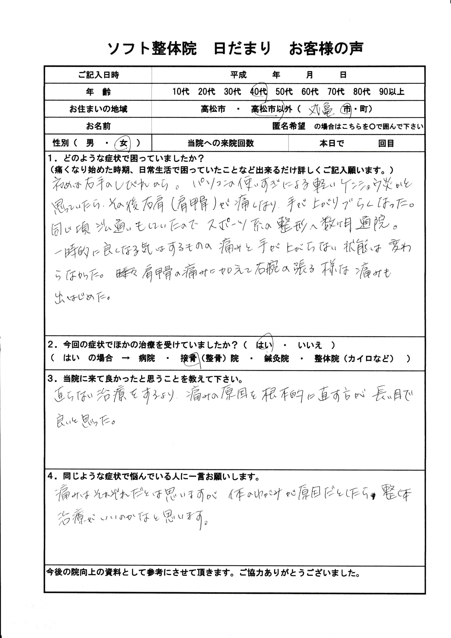 3~4年前から仕事の環境が変わったこともあり、肩こりや腰痛が気になっていました。2018年8月頃、寝ちがえたことをきっかけに右肩から首にかけて痛くなり、頭痛も出始めたので、整体に行きました(当時は大阪)一時的には楽になりますが、首から肩にかけては、ずっと違和感のある状態でした。転勤で、高松に来て、マッサージなどには行ってみましたが、すぐにまた首が痛くなるので、整体院を探すことにしました。