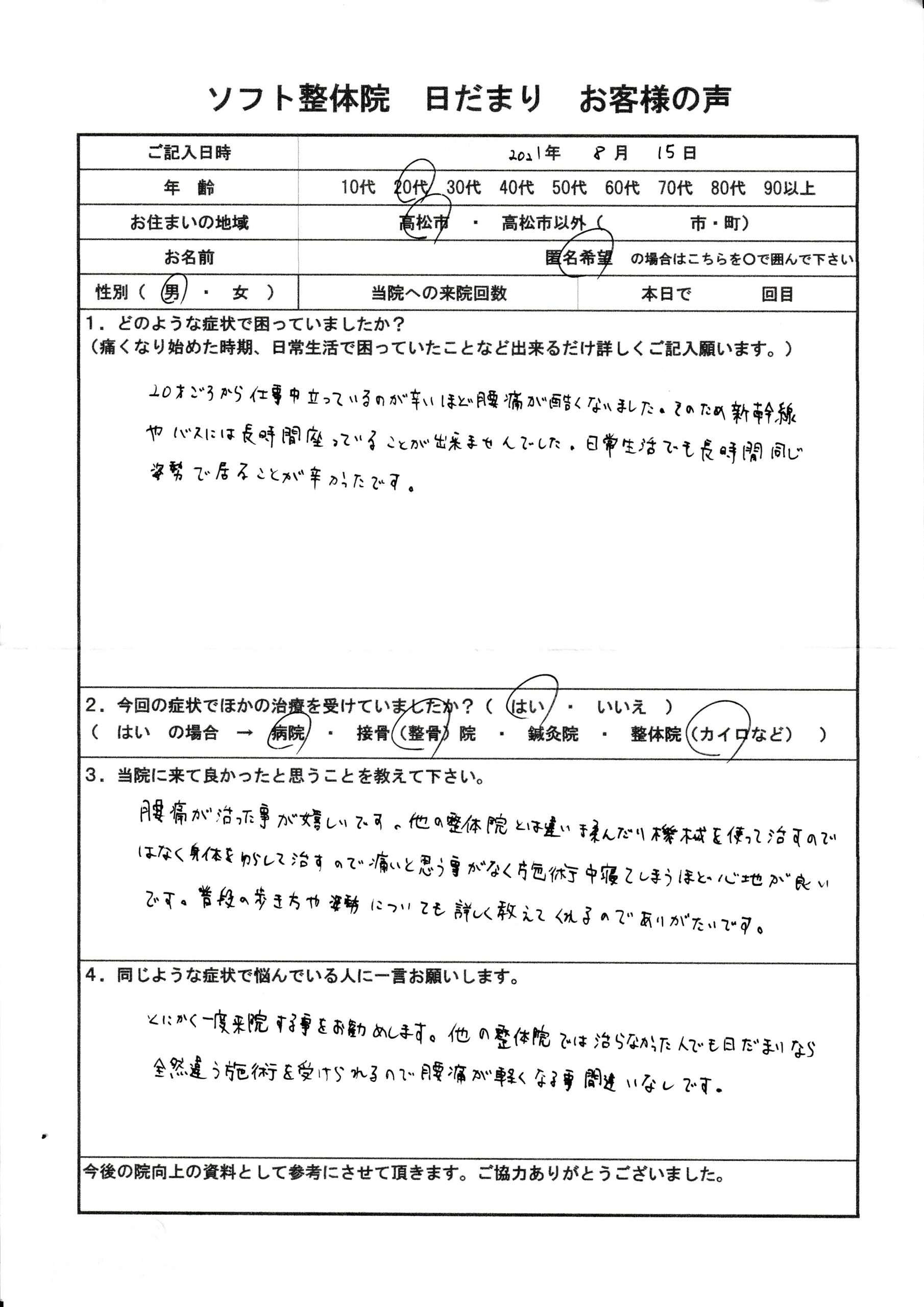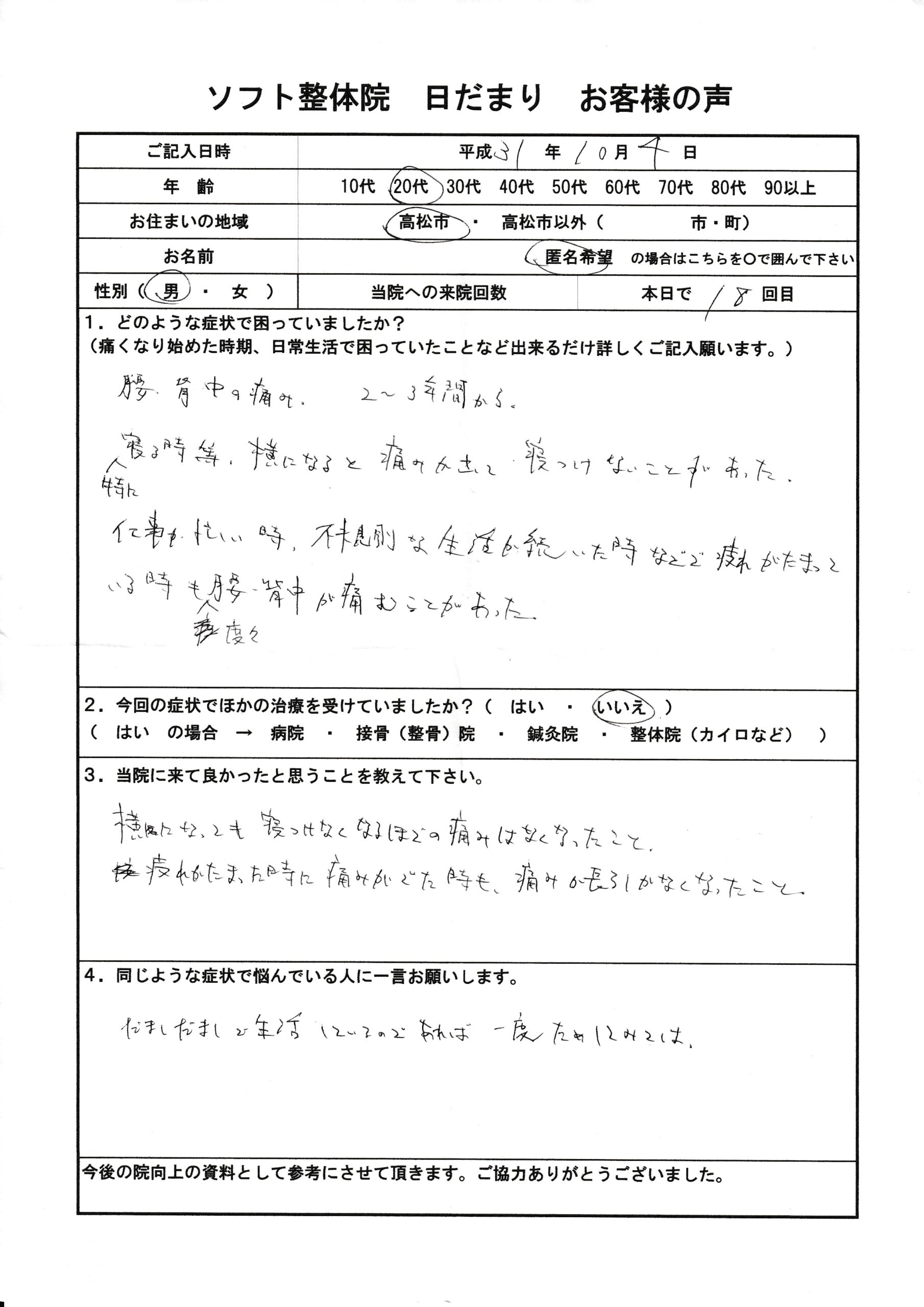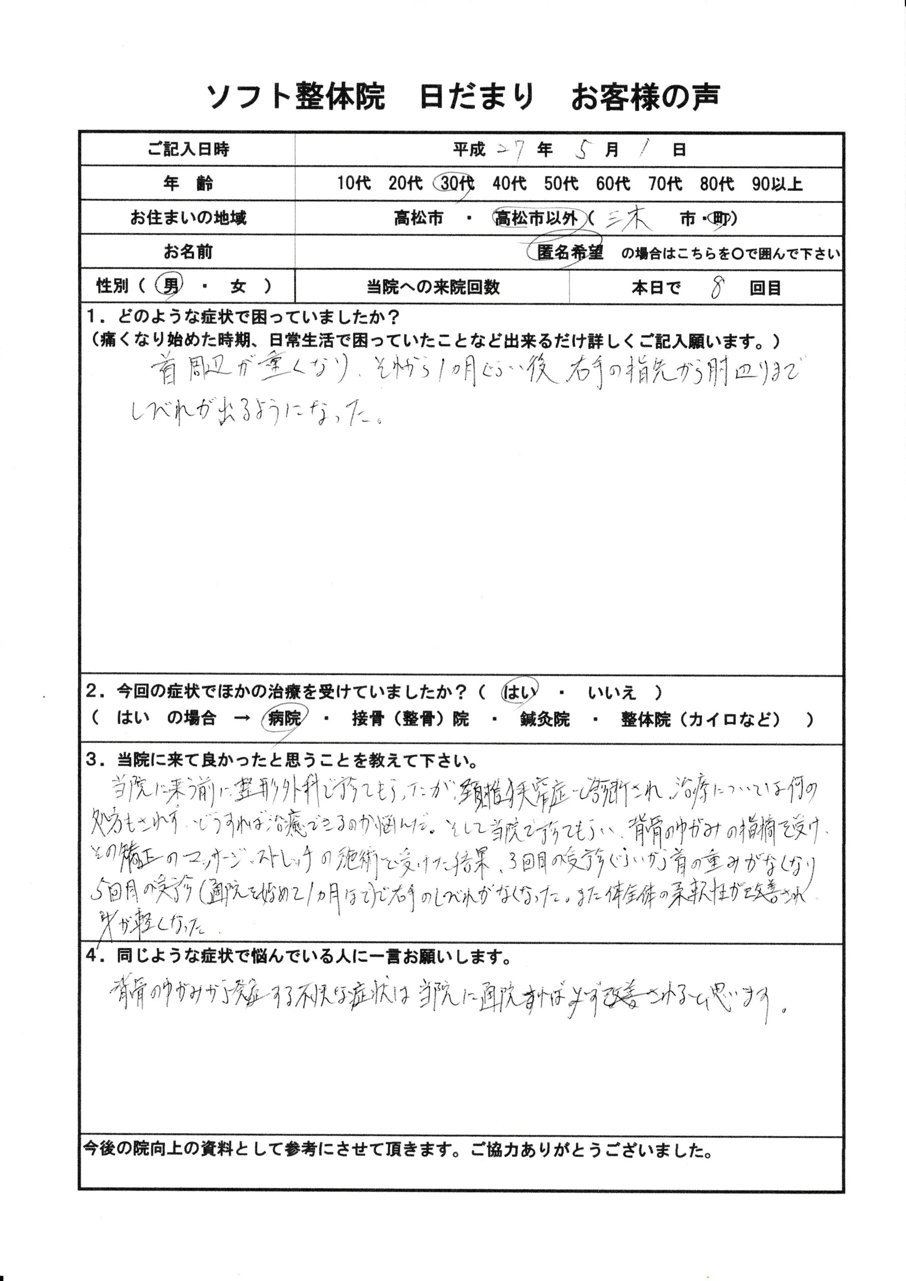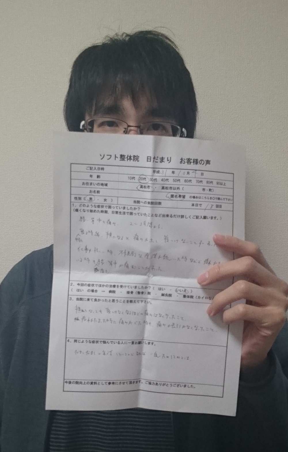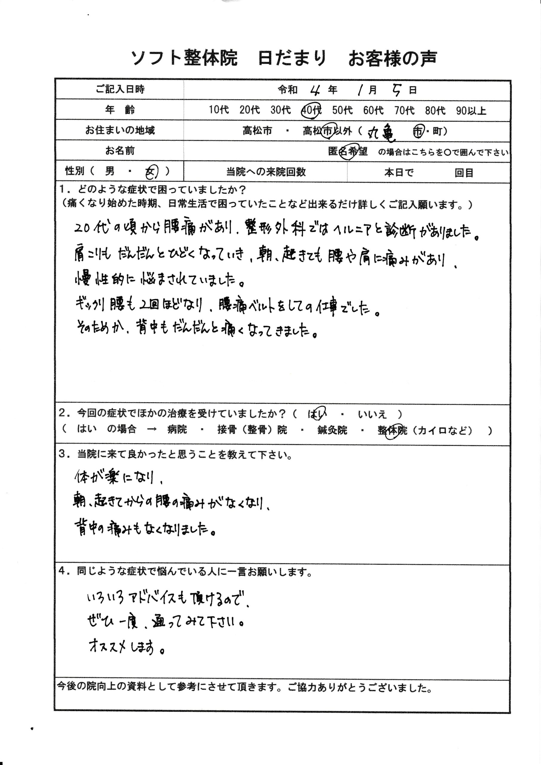 3~4年前から仕事の環境が変わったこともあり、肩こりや腰痛が気になっていました。2018年8月頃、寝ちがえたことをきっかけに右肩から首にかけて痛くなり、頭痛も出始めたので、整体に行きました(当時は大阪)一時的には楽になりますが、首から肩にかけては、ずっと違和感のある状態でした。転勤で、高松に来て、マッサージなどには行ってみましたが、すぐにまた首が痛くなるので、整体院を探すことにしました。