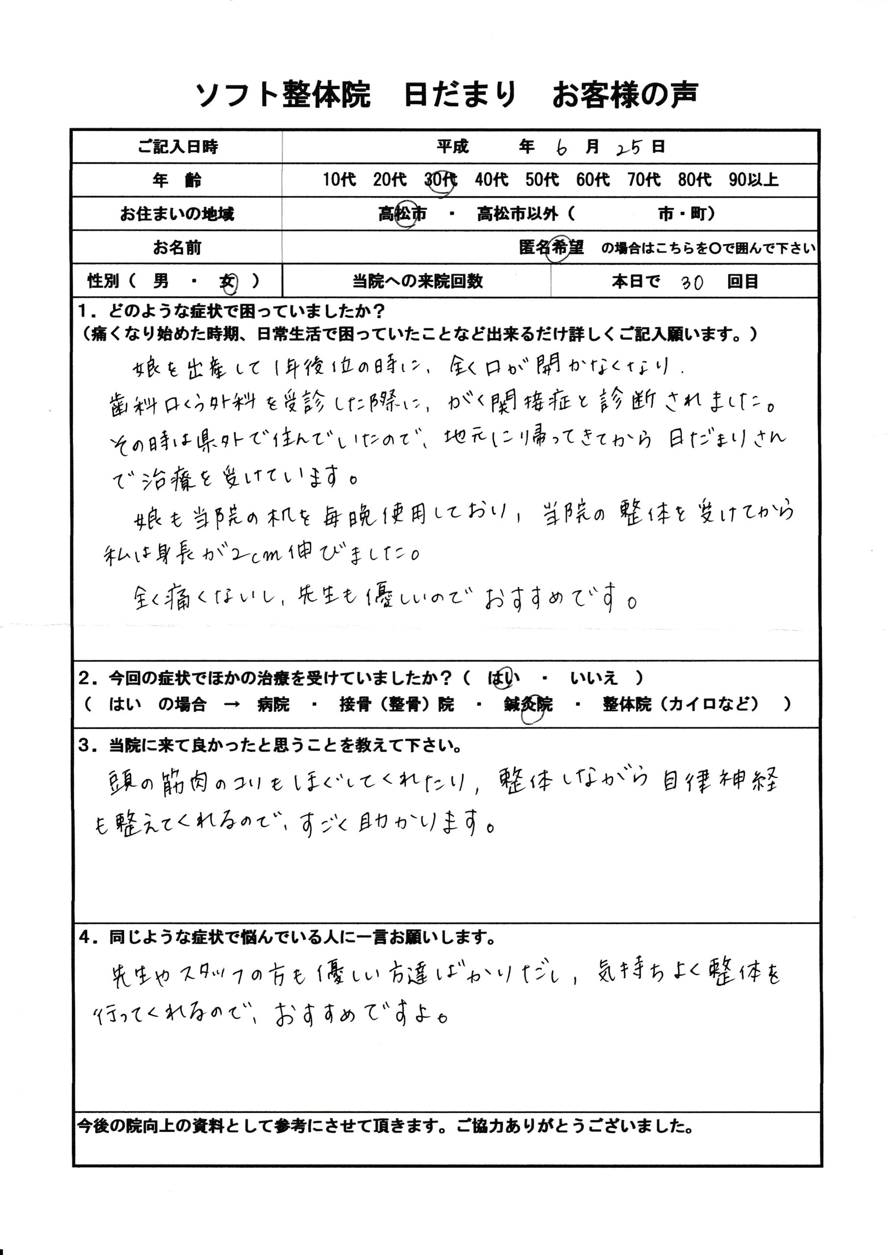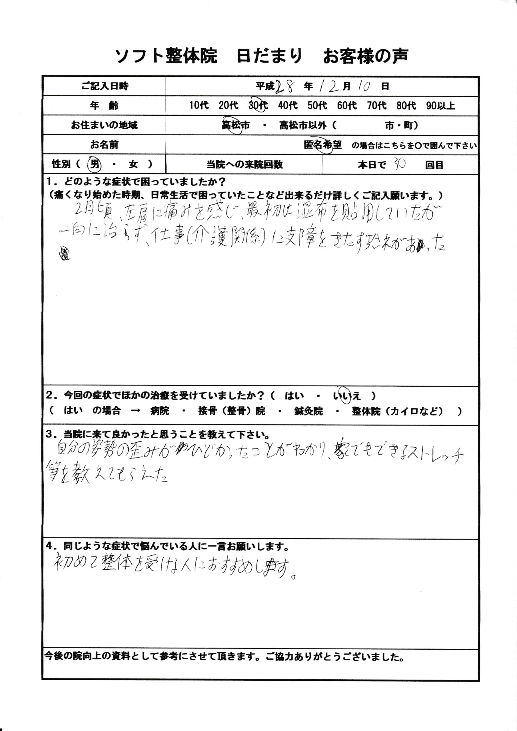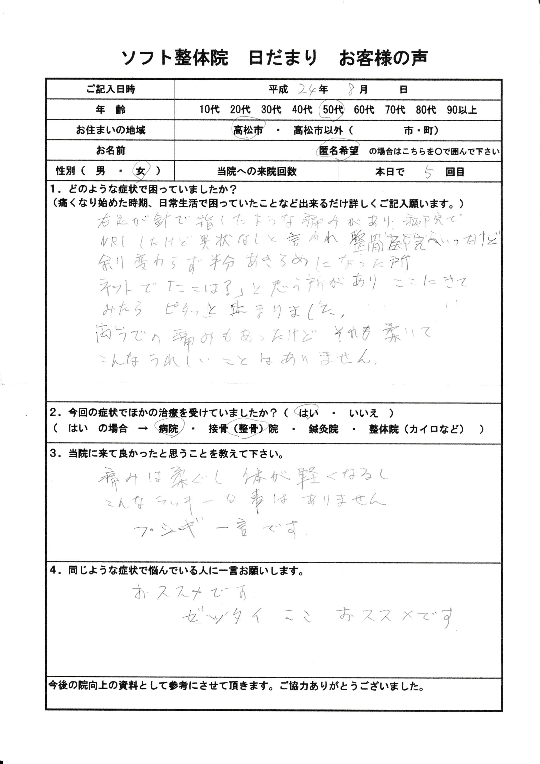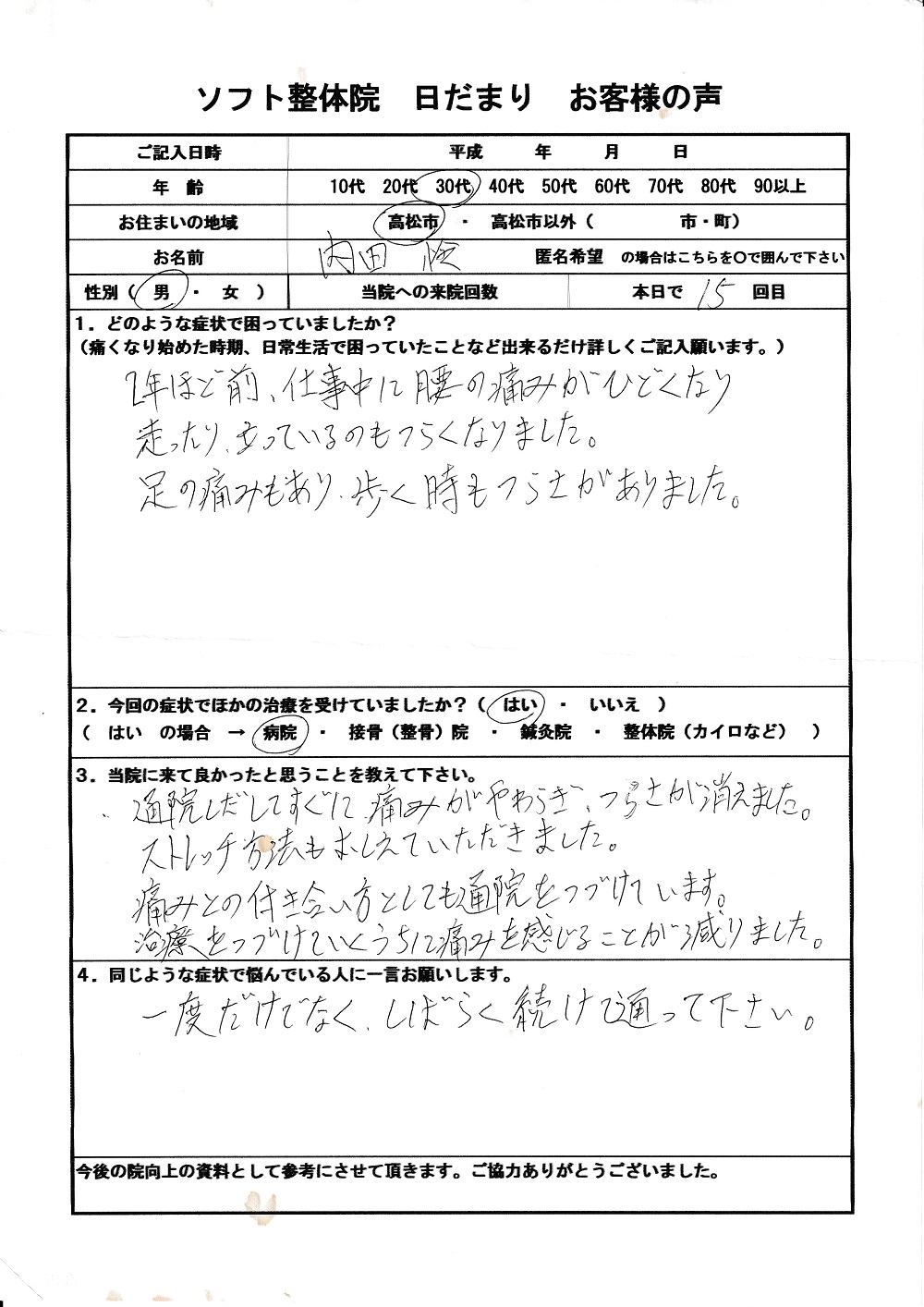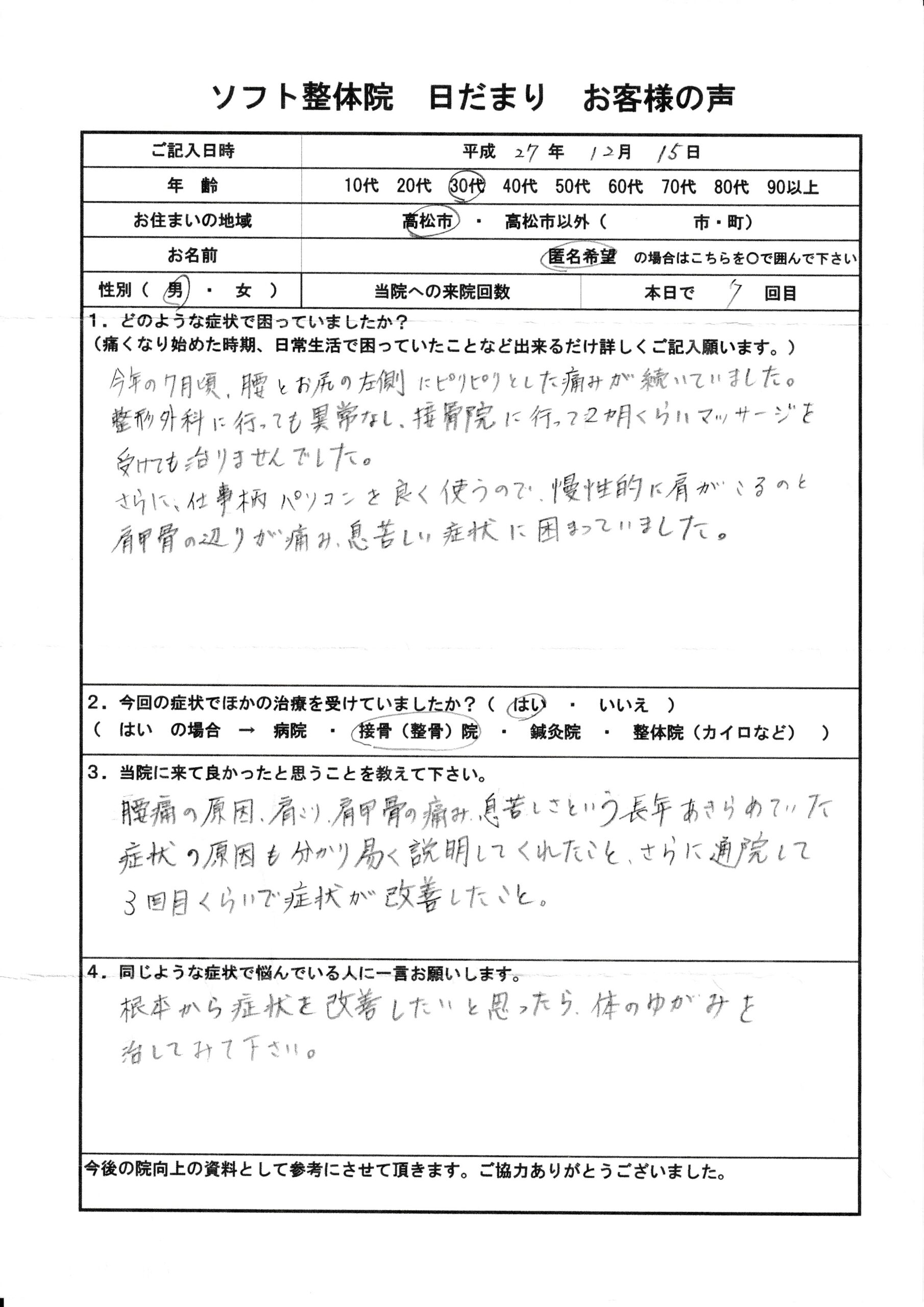 3~4年前から仕事の環境が変わったこともあり、肩こりや腰痛が気になっていました。2018年8月頃、寝ちがえたことをきっかけに右肩から首にかけて痛くなり、頭痛も出始めたので、整体に行きました(当時は大阪)一時的には楽になりますが、首から肩にかけては、ずっと違和感のある状態でした。転勤で、高松に来て、マッサージなどには行ってみましたが、すぐにまた首が痛くなるので、整体院を探すことにしました。
