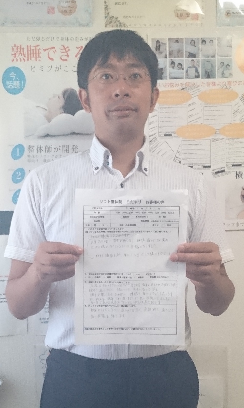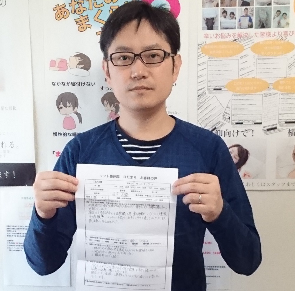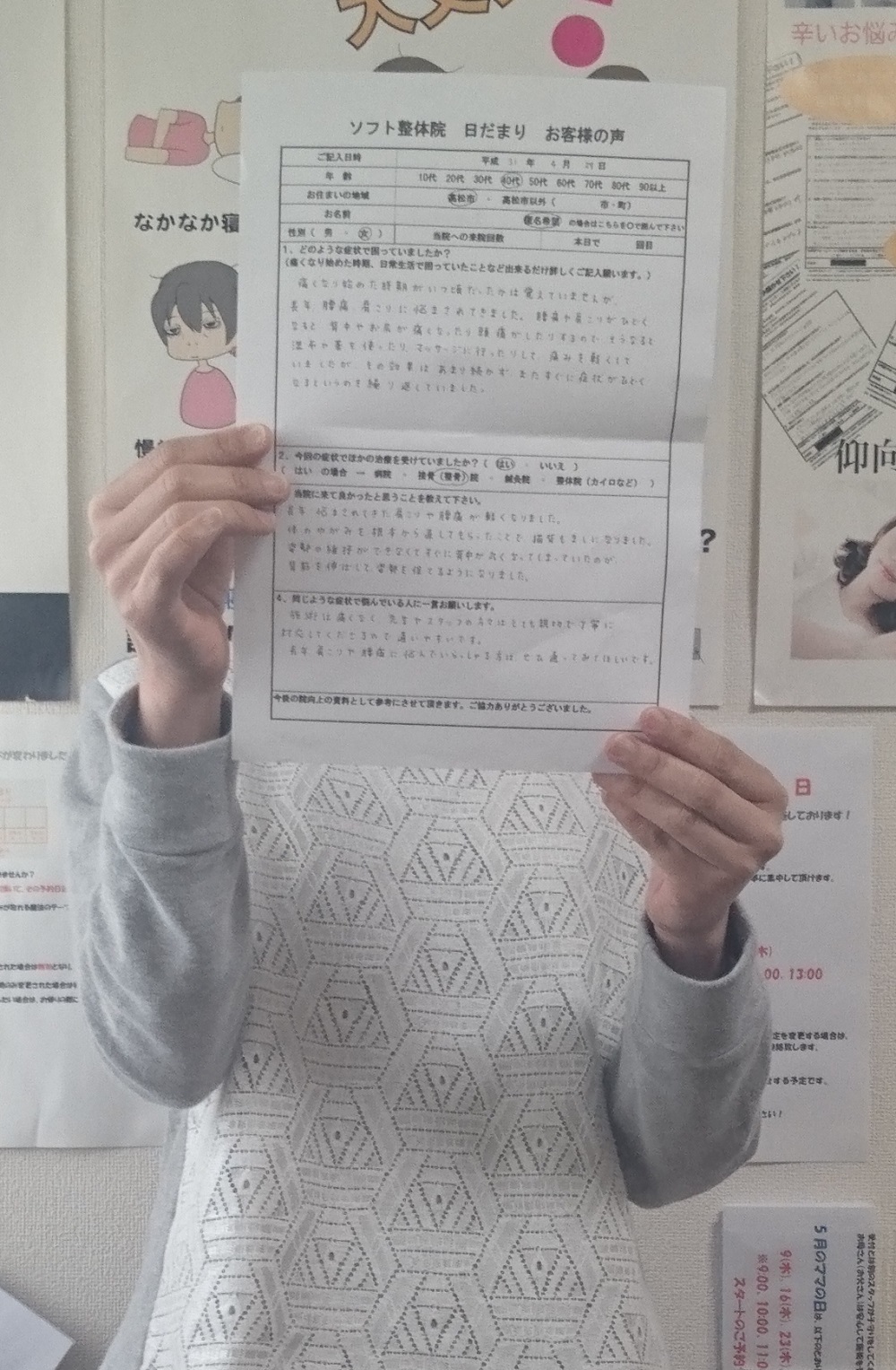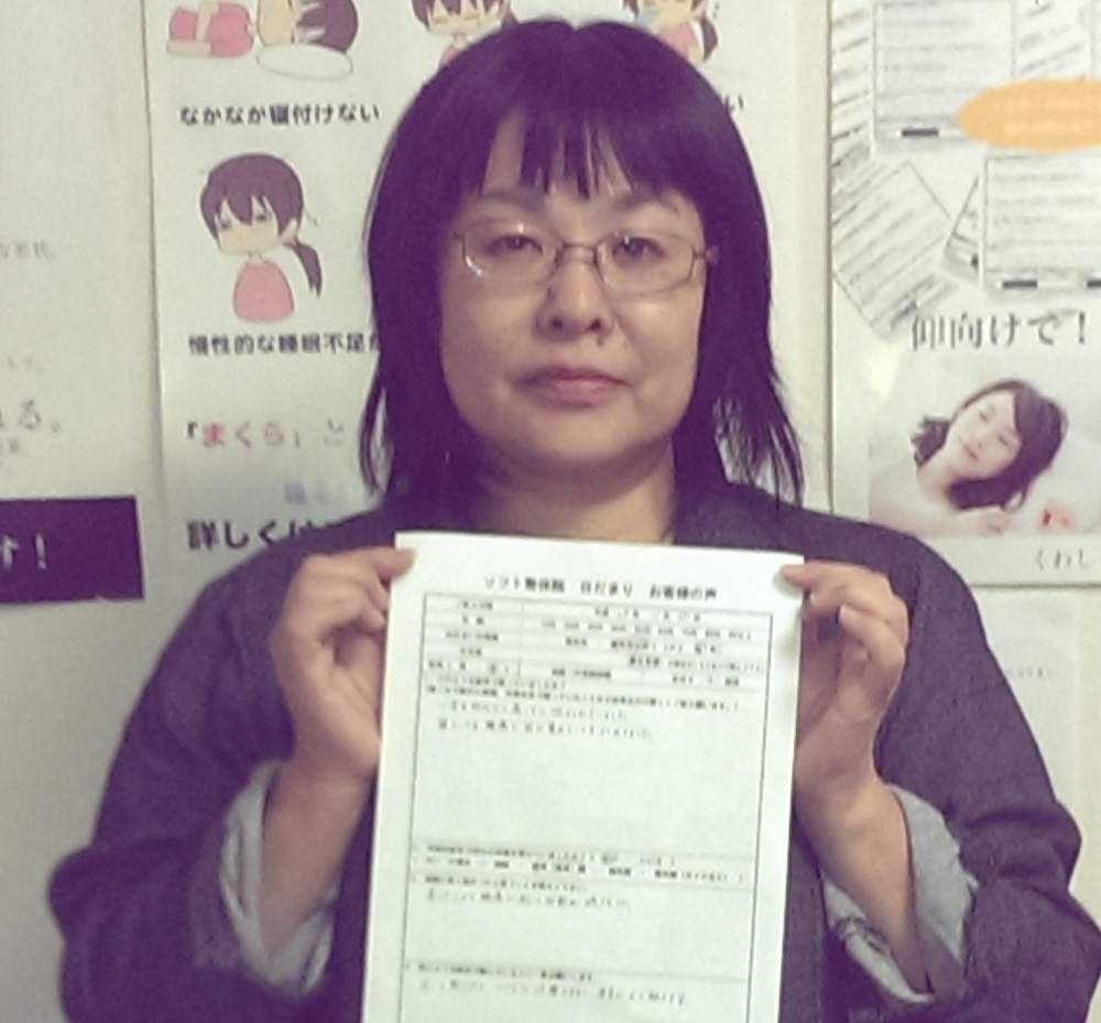 何年か前、肩と腰がつらくて見てもらったのが最初です。他の人に比べてそれほど酷いケースではないでしょうが、仕事中つらくて困っていたのですが、手もみ等行ってもその時気持ちいいだけで良くはならないし、病院もどこに行けばいいか分からなくて困っていました。そんな時、ネットで日だまりさんの事を見つけて見てもらう事にしました。