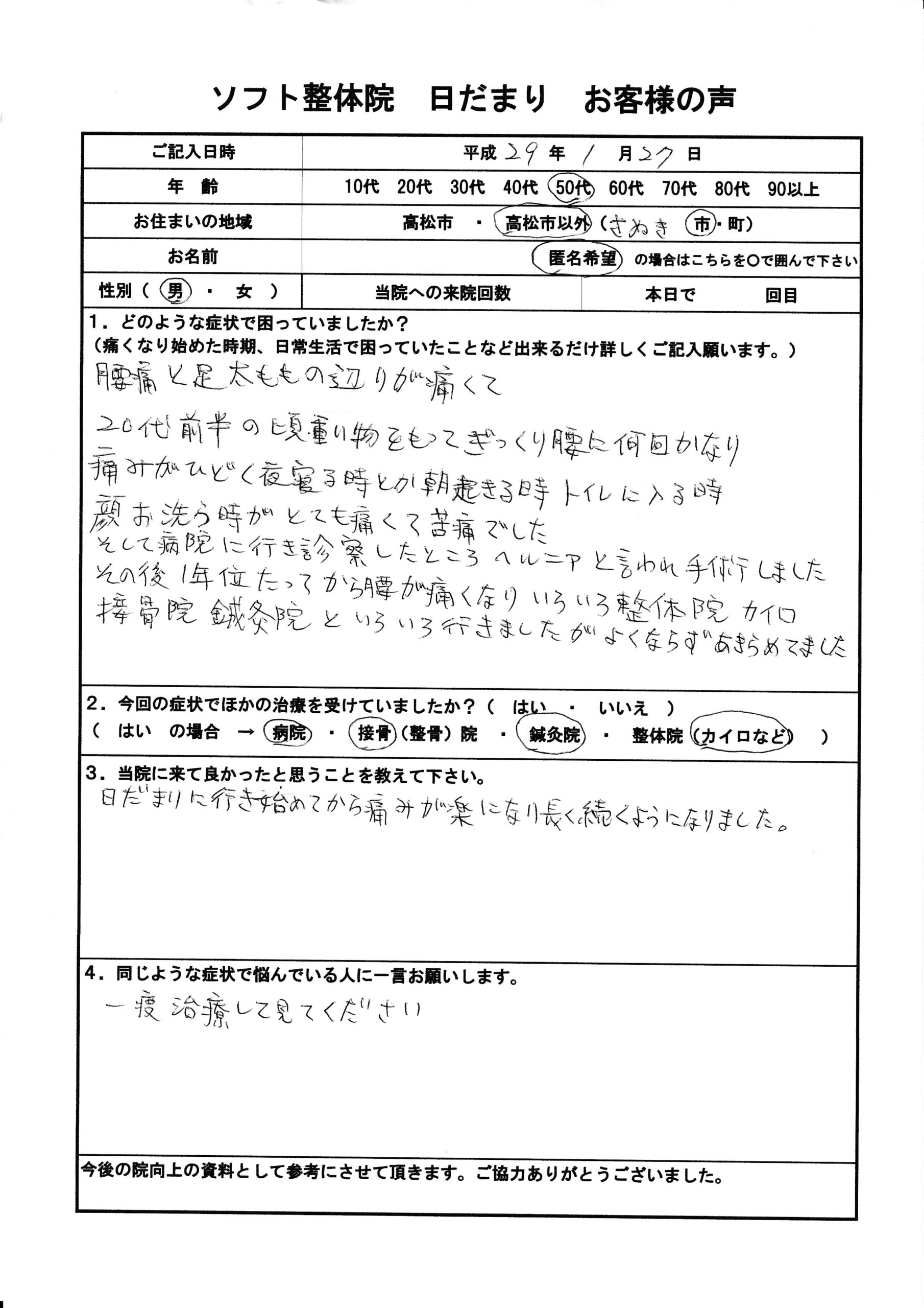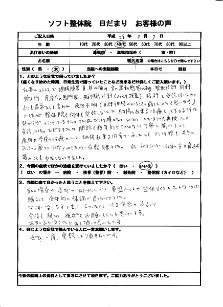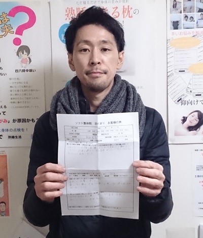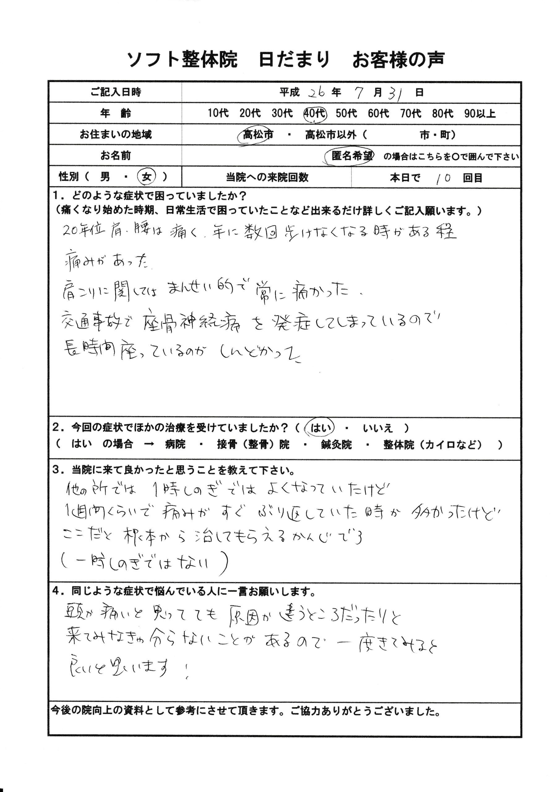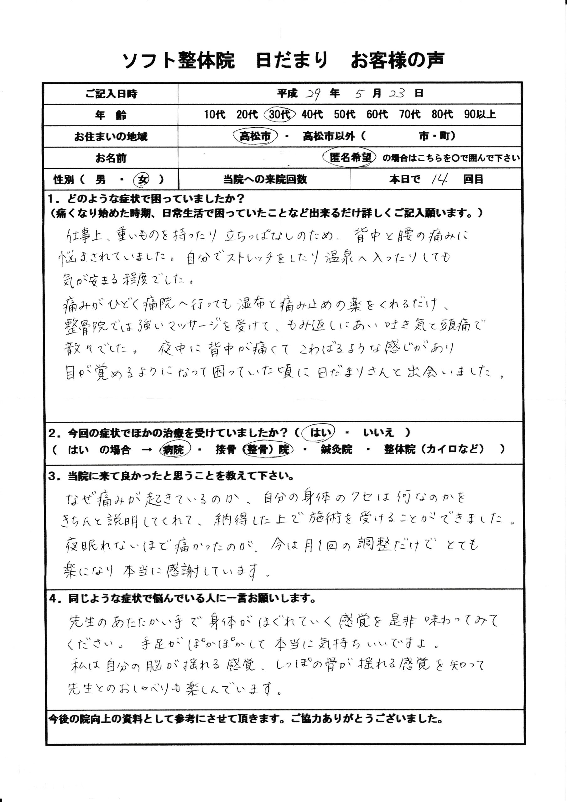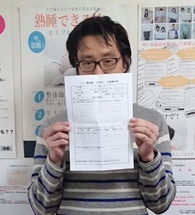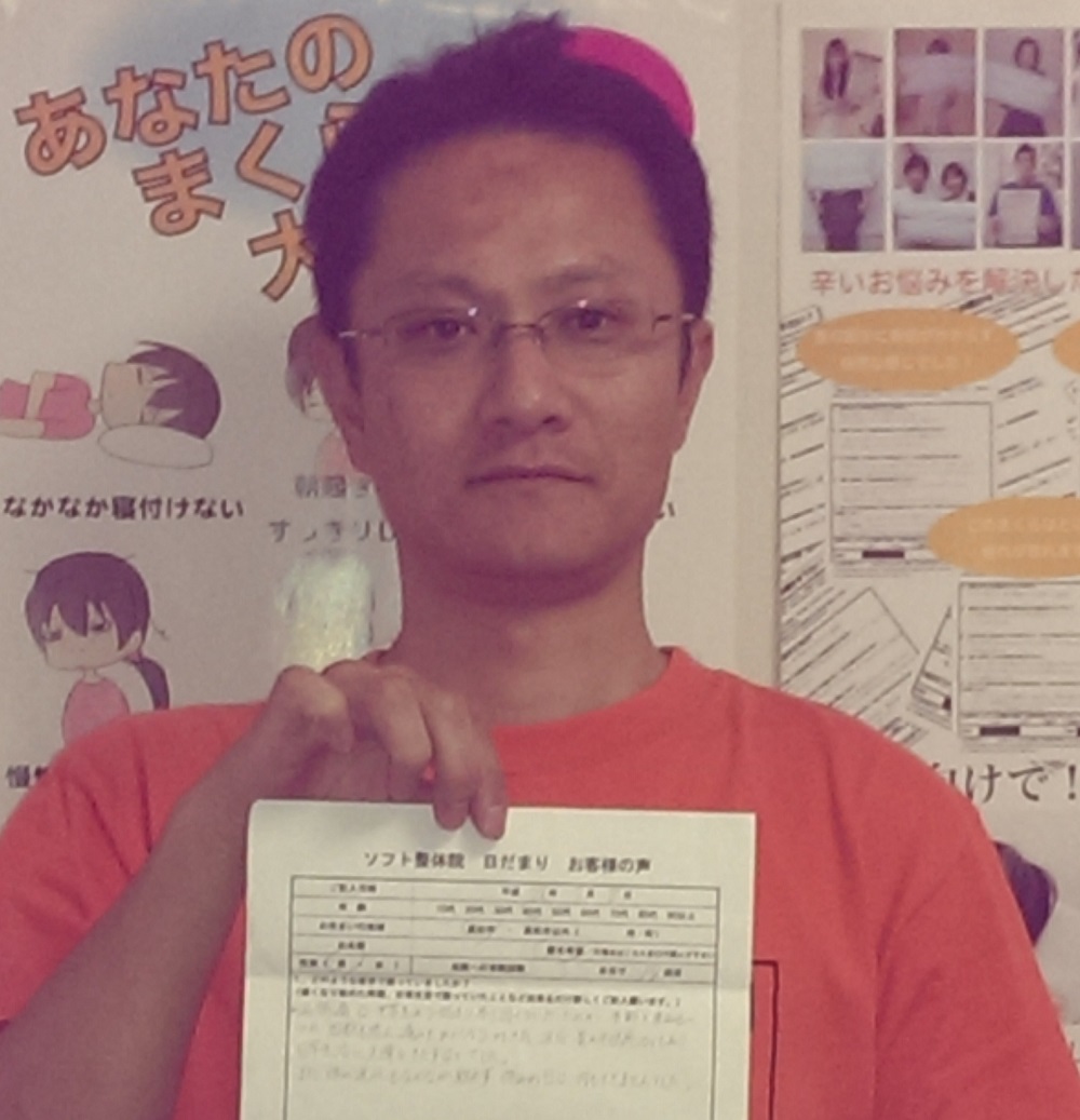 何年か前、肩と腰がつらくて見てもらったのが最初です。他の人に比べてそれほど酷いケースではないでしょうが、仕事中つらくて困っていたのですが、手もみ等行ってもその時気持ちいいだけで良くはならないし、病院もどこに行けばいいか分からなくて困っていました。そんな時、ネットで日だまりさんの事を見つけて見てもらう事にしました。
