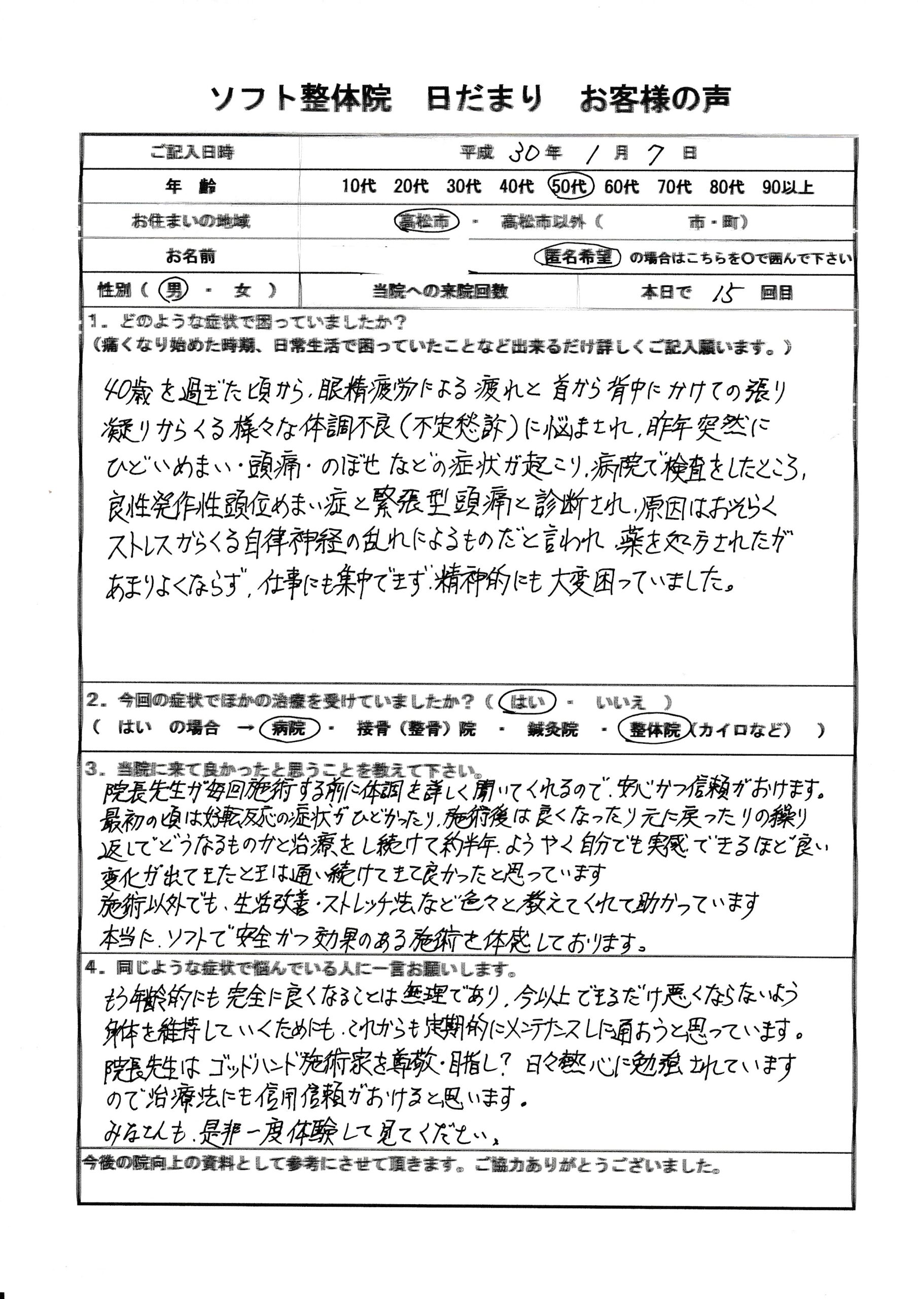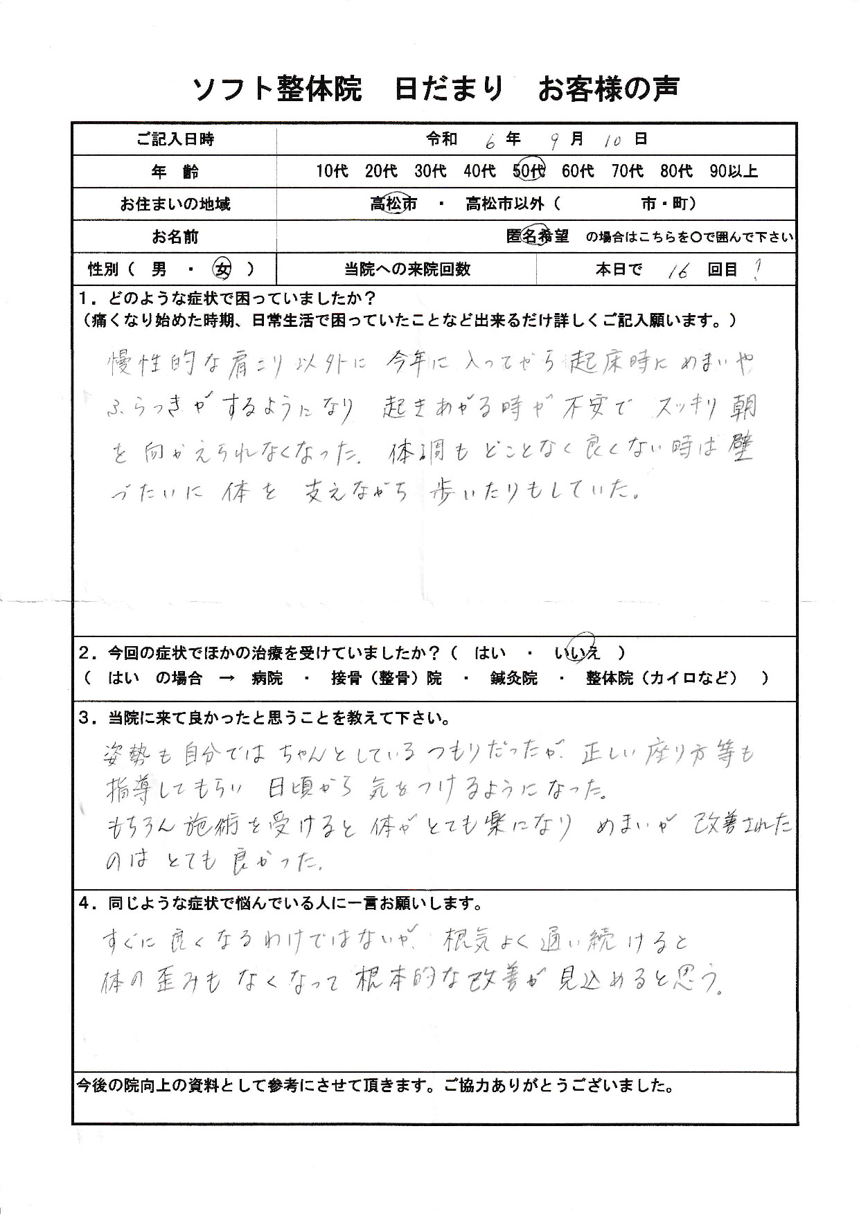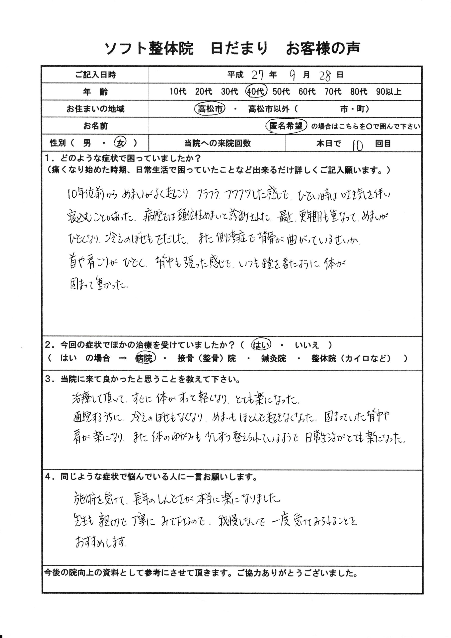 姿勢も自分ではちゃんとしているつもりだったが、正しい座り方等も指導してもらい日頃から気をつけるようになった。もちろん施術を受けると体がとても楽になりめまいが改善されたのはとても良かった。