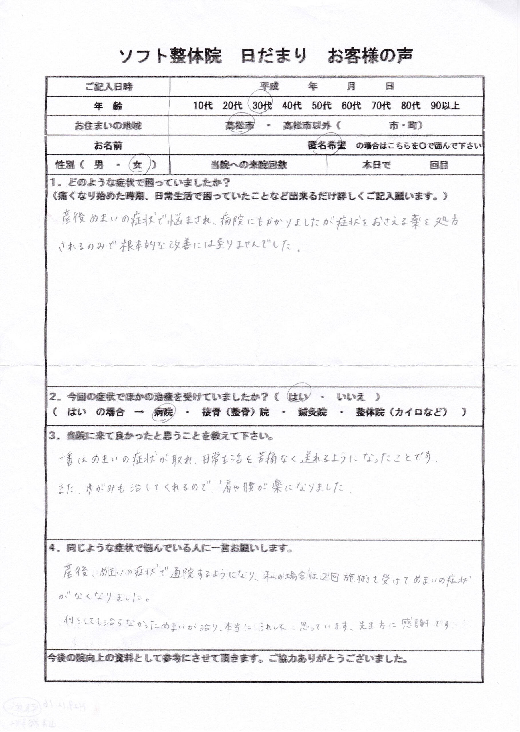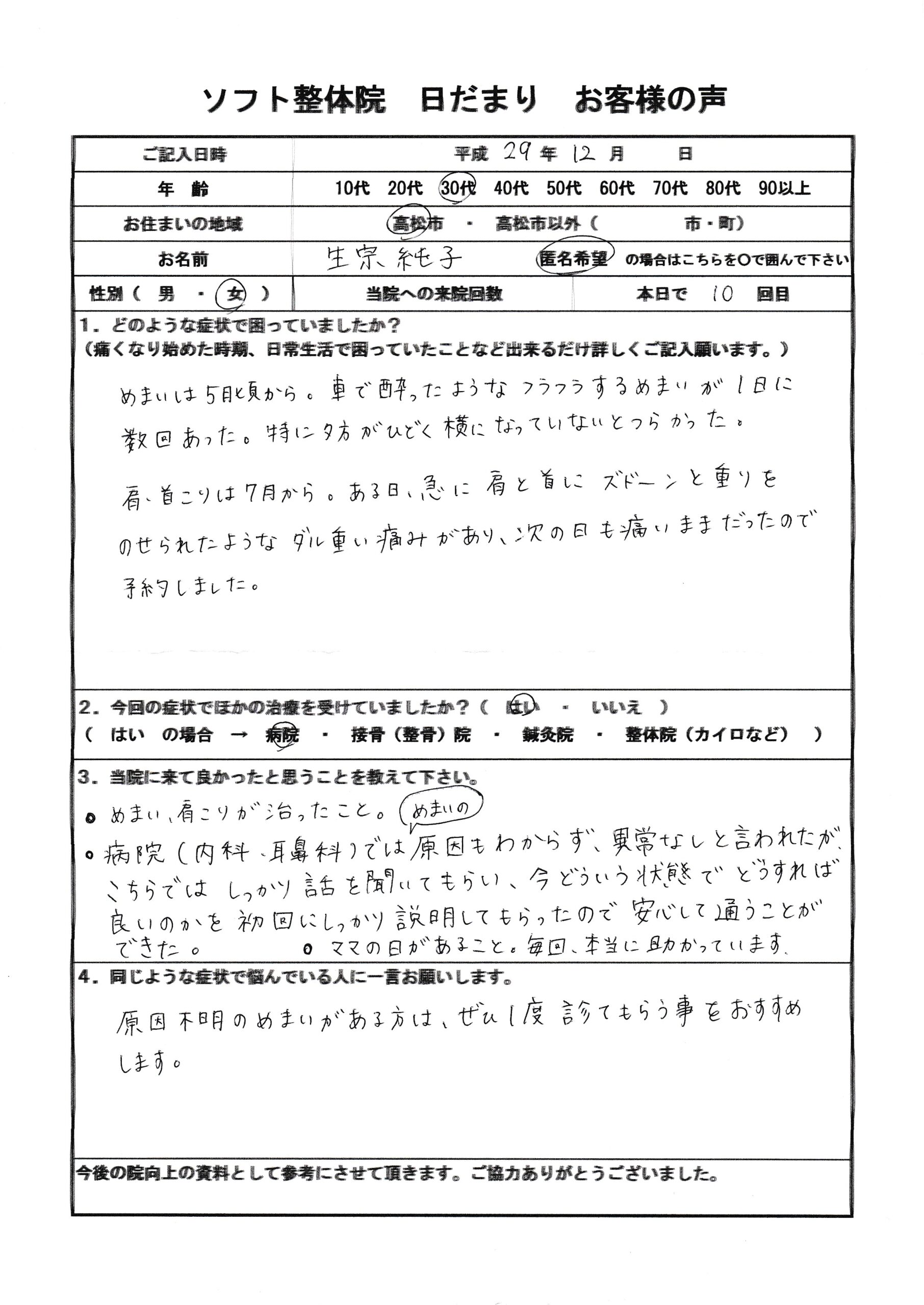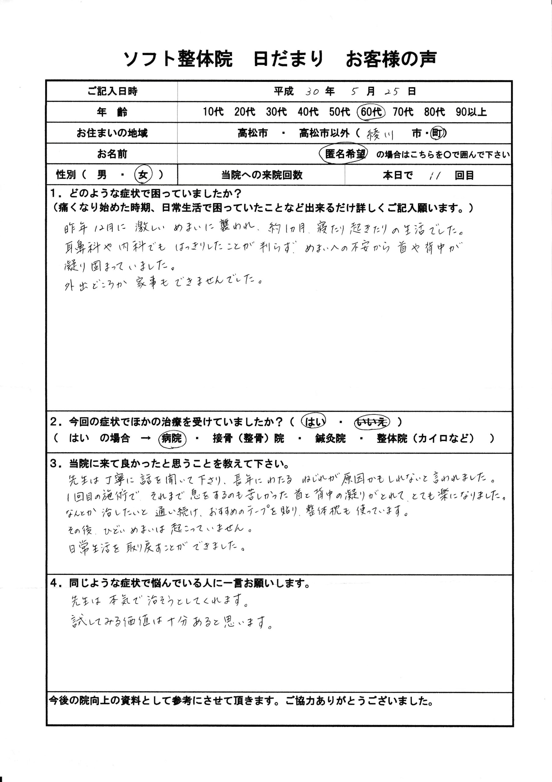 姿勢も自分ではちゃんとしているつもりだったが、正しい座り方等も指導してもらい日頃から気をつけるようになった。もちろん施術を受けると体がとても楽になりめまいが改善されたのはとても良かった。