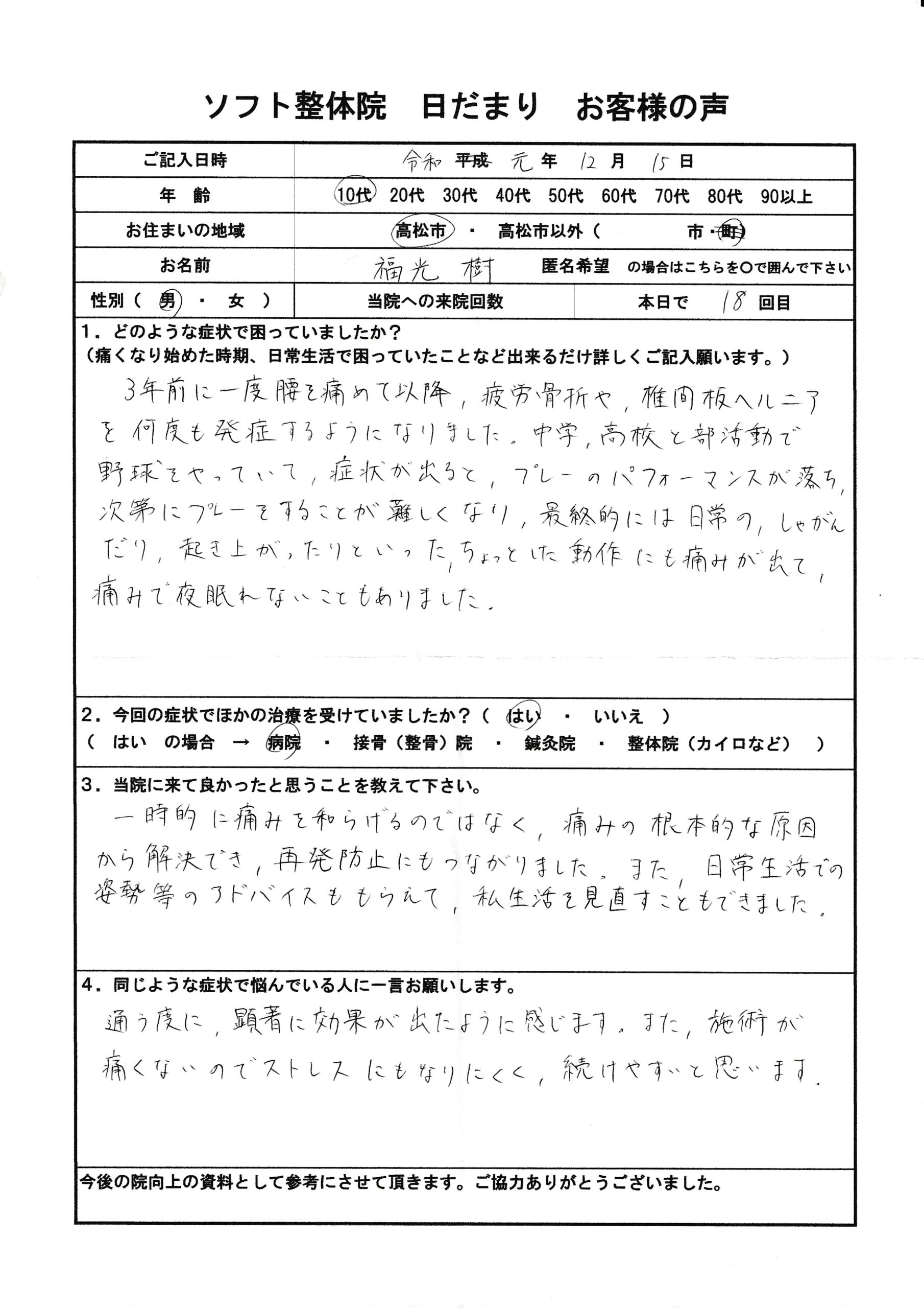 3年前に一度腰を痛めて以降、疲労骨折や、椎間板ヘルニアを何度も発症するようになりました。中学、高校と部活動で野球をやっていて、症状が出ると、プレーのパフォーマンスが落ち、次第にプレーをすることが難しくなり、最終的には日常の、しゃがんだり、起き上がったりといった、ちょっとした動作にも痛みが出て、痛みで夜眠れないこともありました。