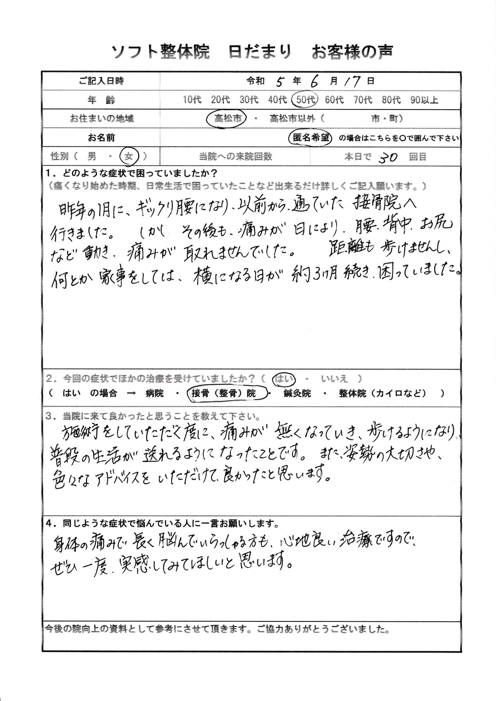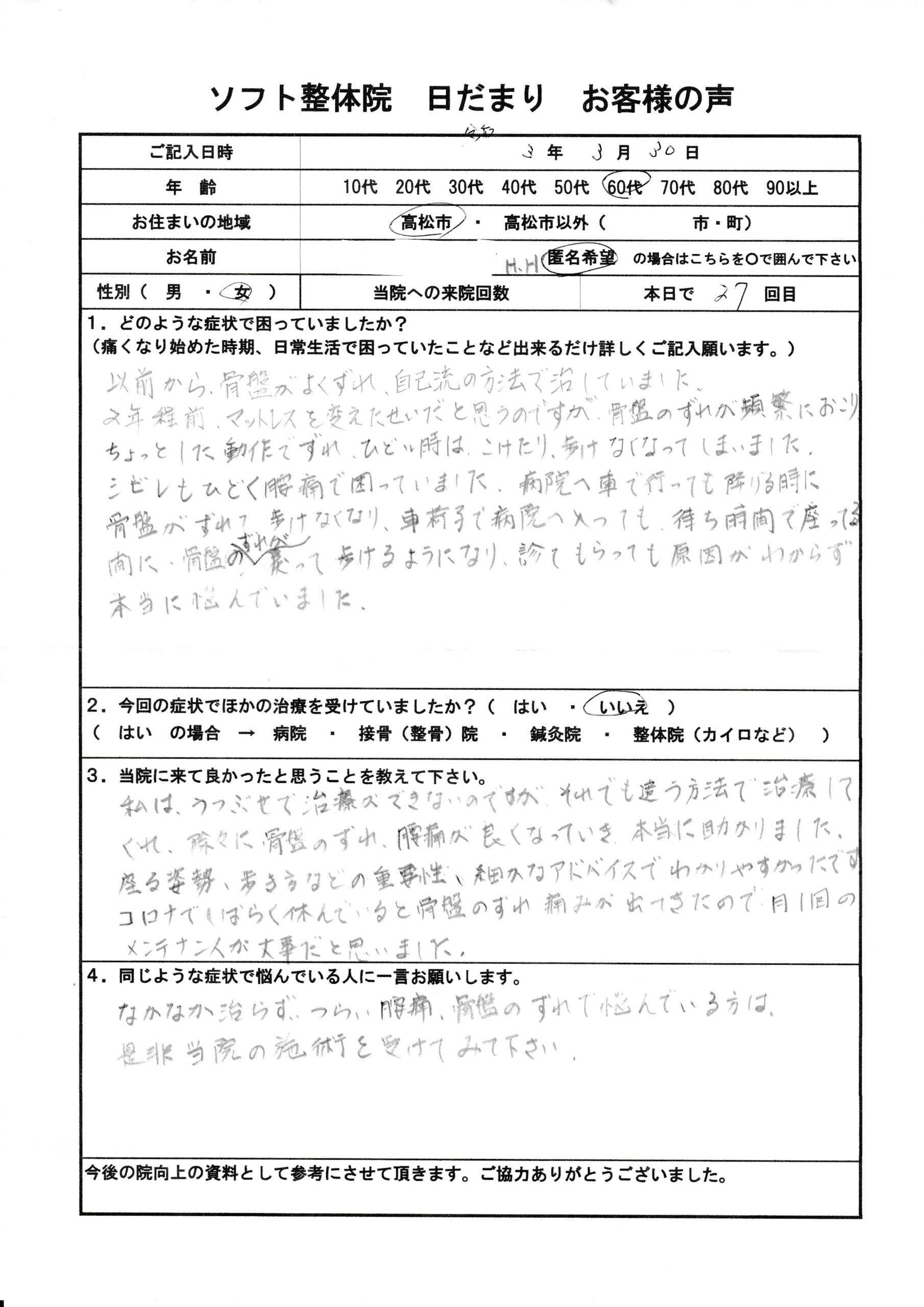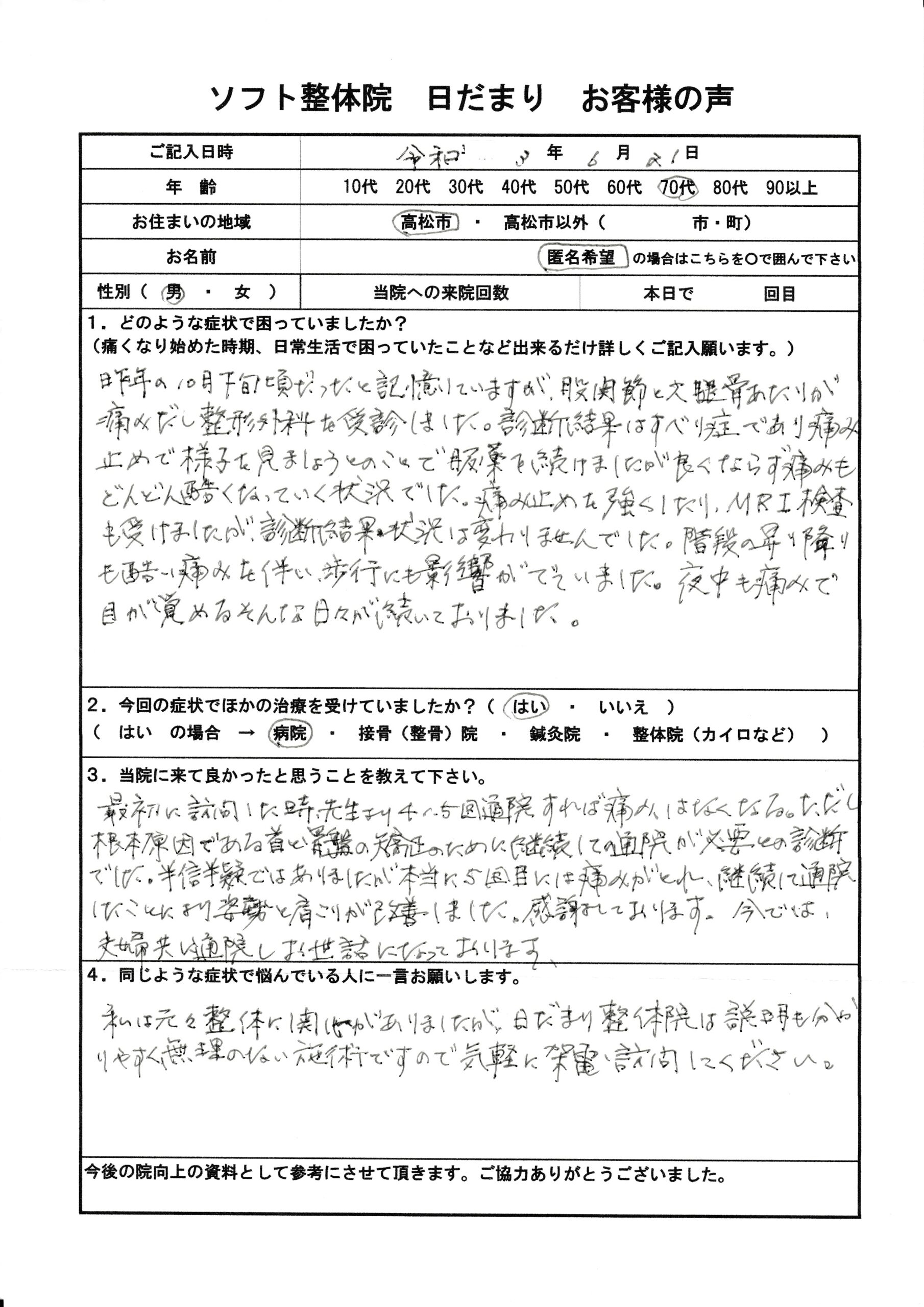 昭和63年に双子を出産、退院後自分の体を気を遣う暇もなく、育児に追われる中、1カ月程たった頃、突然腰痛が起こりました。家事や育児にも支障が出るほどで、指圧の先生の治療を受け始めました。良くなり悪くなりを繰り返しながら10年程たった頃、左股関節にも痛みが出始め鍼治療も併用し、月2回の治療を役30年続けてきましたが、平成28年、お世話になっていた先生が高齢になったため、治療院が閉院してしまいました。それから約4年間は、定期的にマッサージに通って、しのでいましたが、令和2年5月ギックリ腰に、寝返りもうてない程重症で、これは根本的に治さないとダメだと思いネットで、日だまりを見つけて通い始めました。