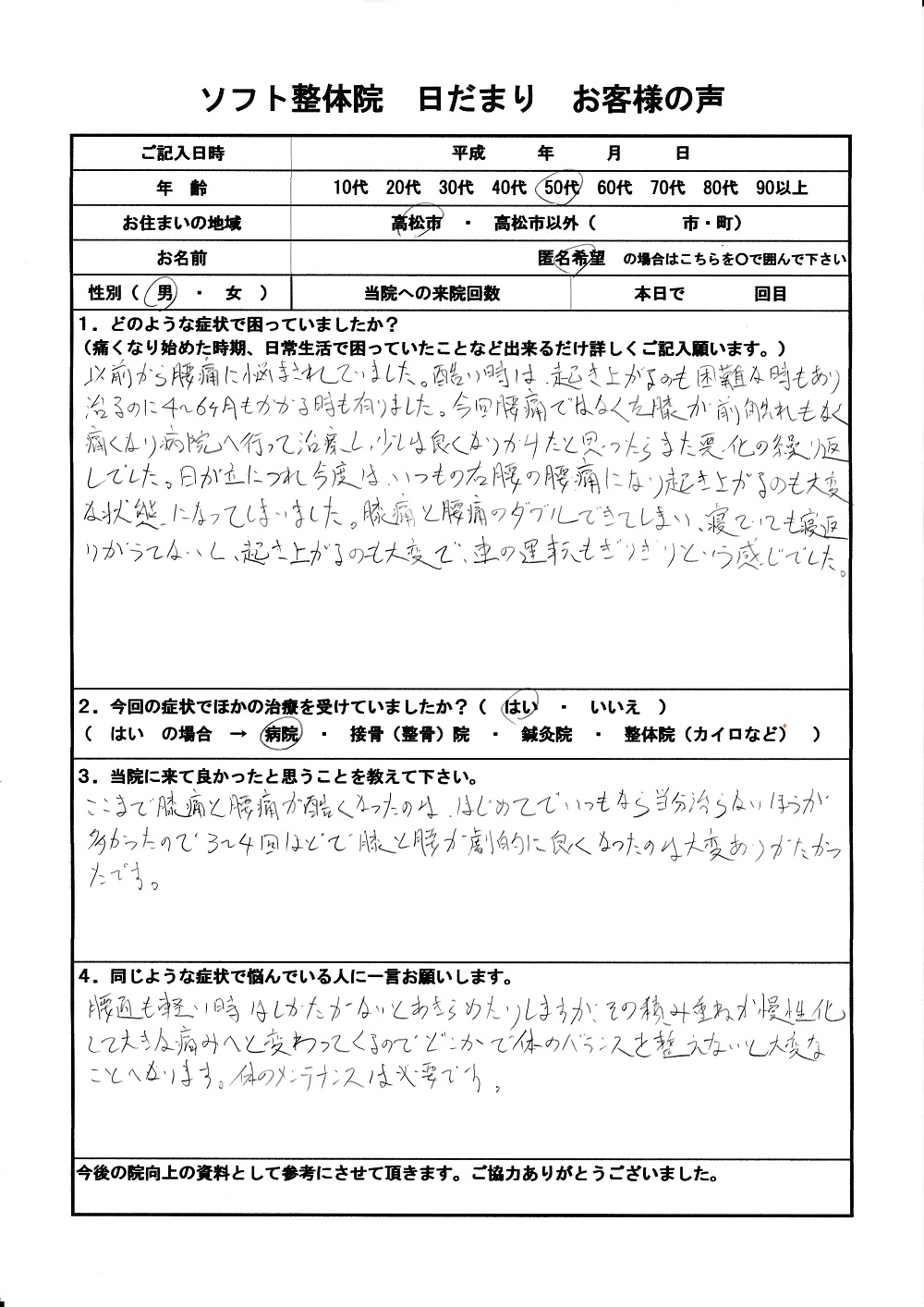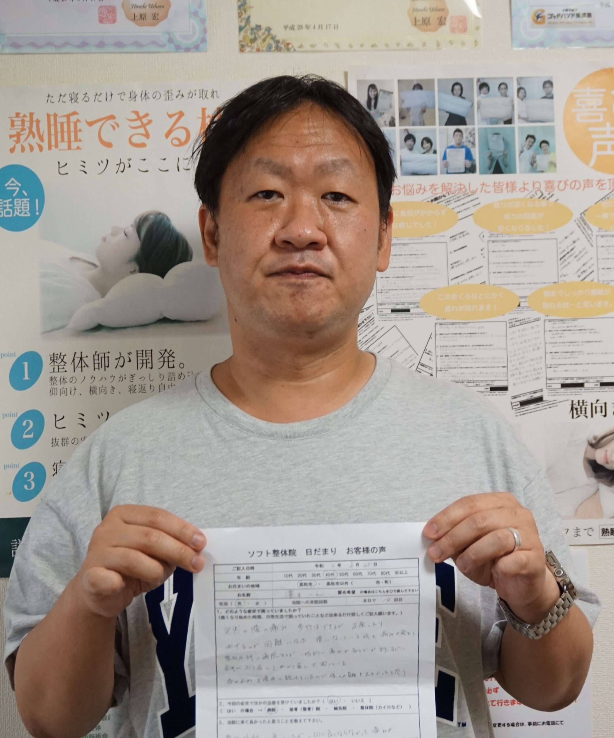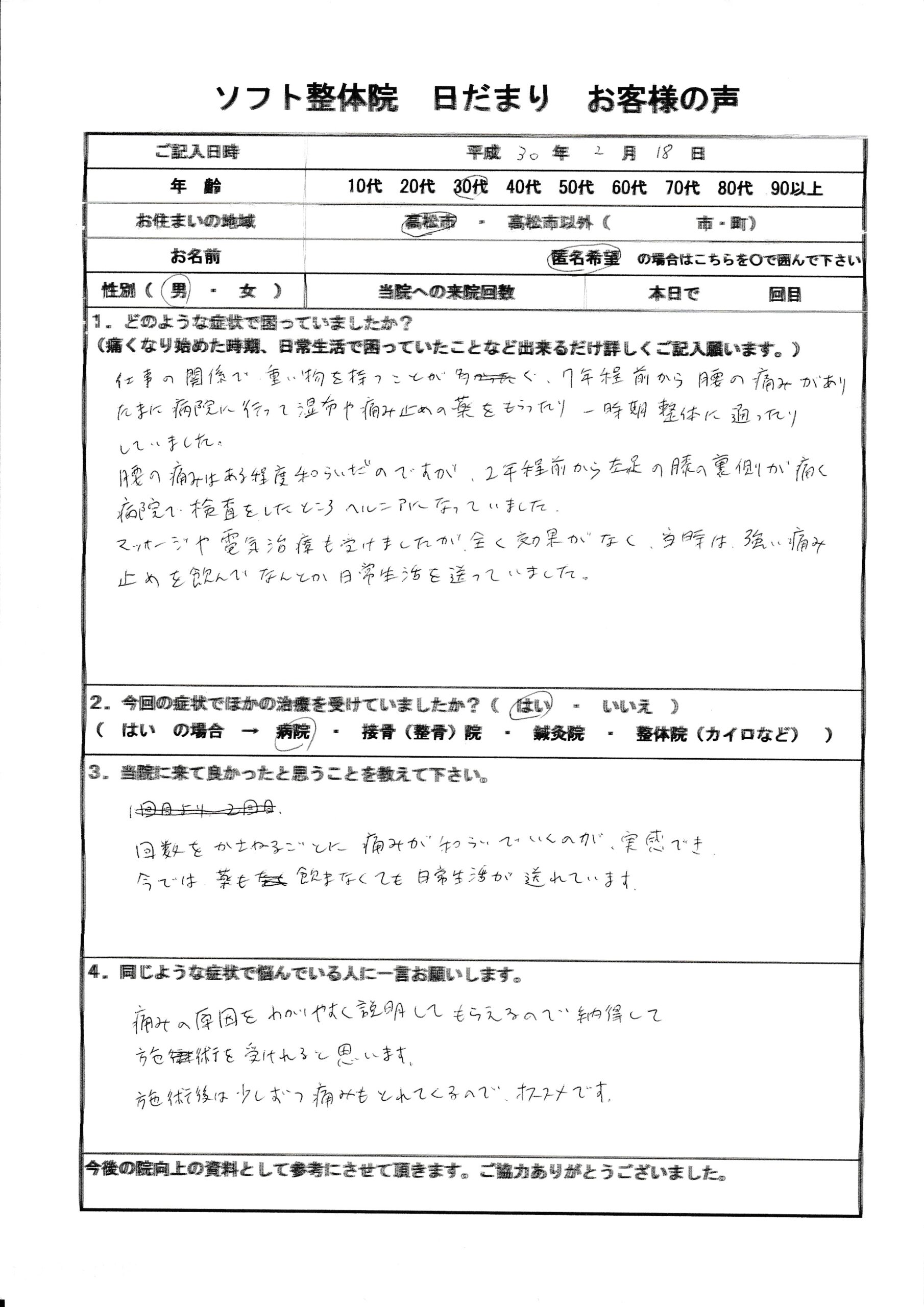 ・4、5年くらい前から、腰痛が治らず困っていました。仕事柄、重たい物を持つ事、長時間運転する事、中腰の姿勢が多い事もあり、仕事中も腰がズキズキと痛み、集中できなかったり、眠れない事も多かったです。