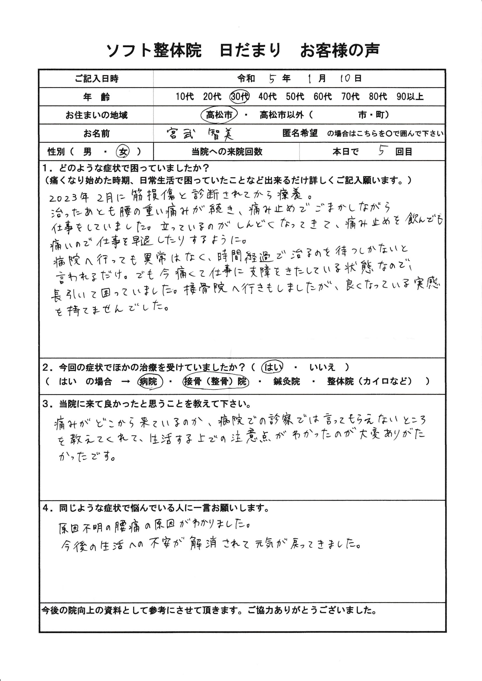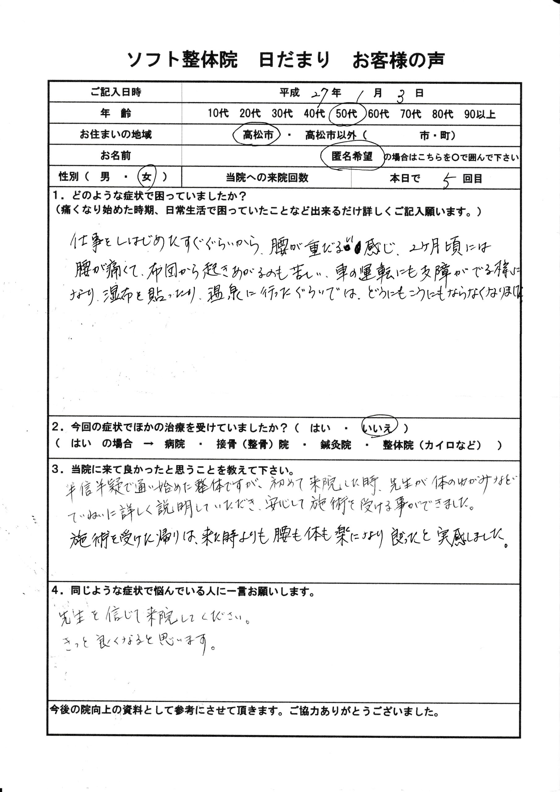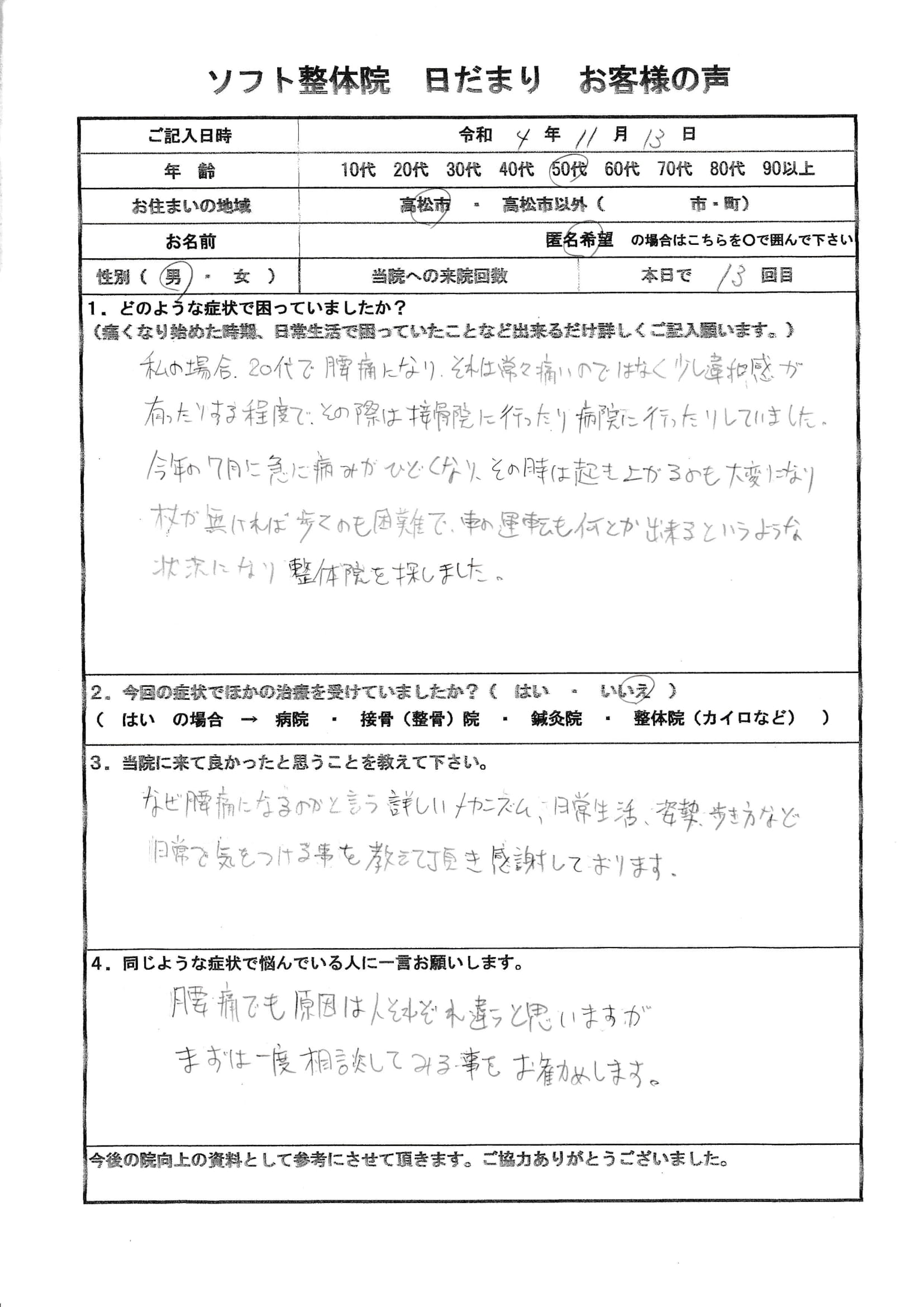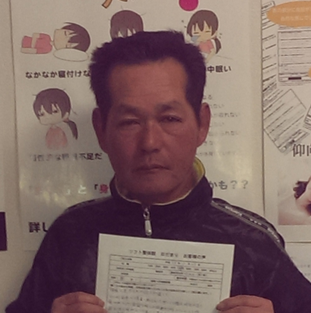 ・4、5年くらい前から、腰痛が治らず困っていました。仕事柄、重たい物を持つ事、長時間運転する事、中腰の姿勢が多い事もあり、仕事中も腰がズキズキと痛み、集中できなかったり、眠れない事も多かったです。