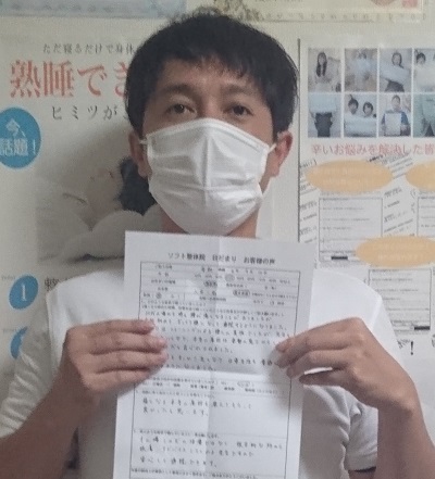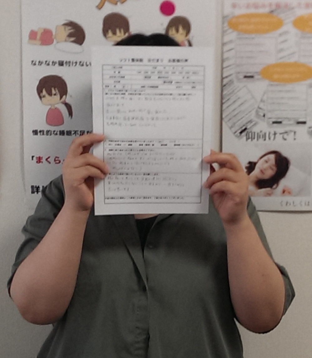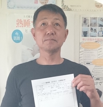 介護職という職業柄、常に腰の痛み、背中の痛みなど、体中の痛みに悩んでいました。腰痛は、イスに座っているのも苦で、車の運転や食事中も辛い時がありました。ほぼ毎日、腰の痛みや背中の痛みで夜中に目が覚め、ひどい時には、「う~痛い・・・」という自分のうめき声で目が覚める事もありました。今年に入ってからは、腕も痛みだし、服を脱ぐ動作が特に辛かったです。