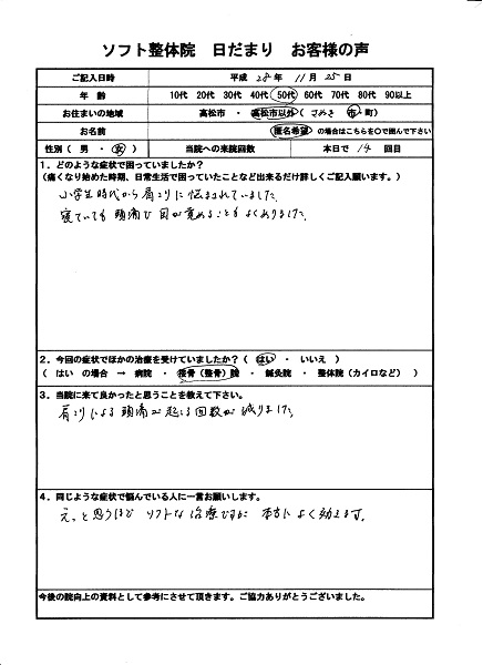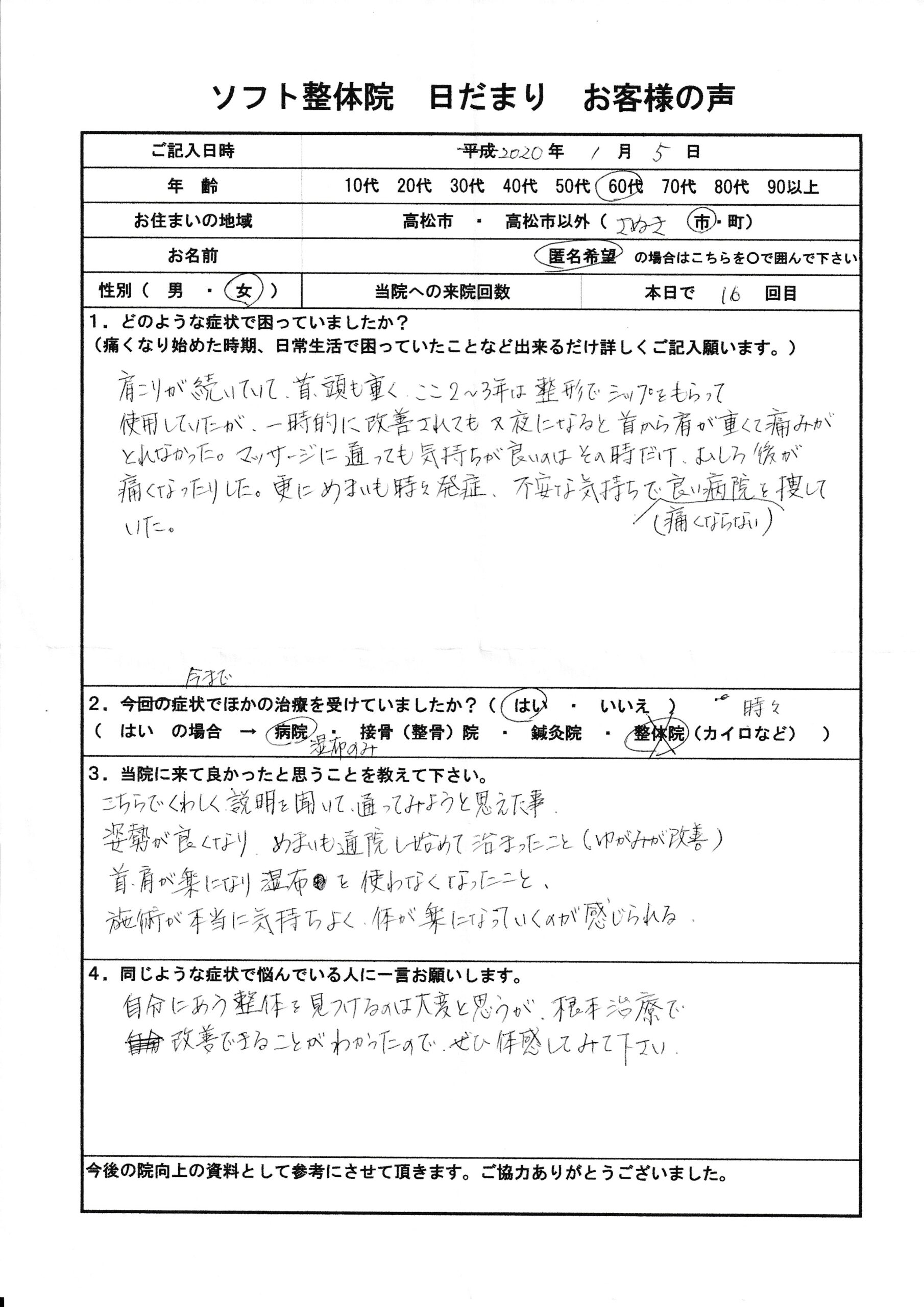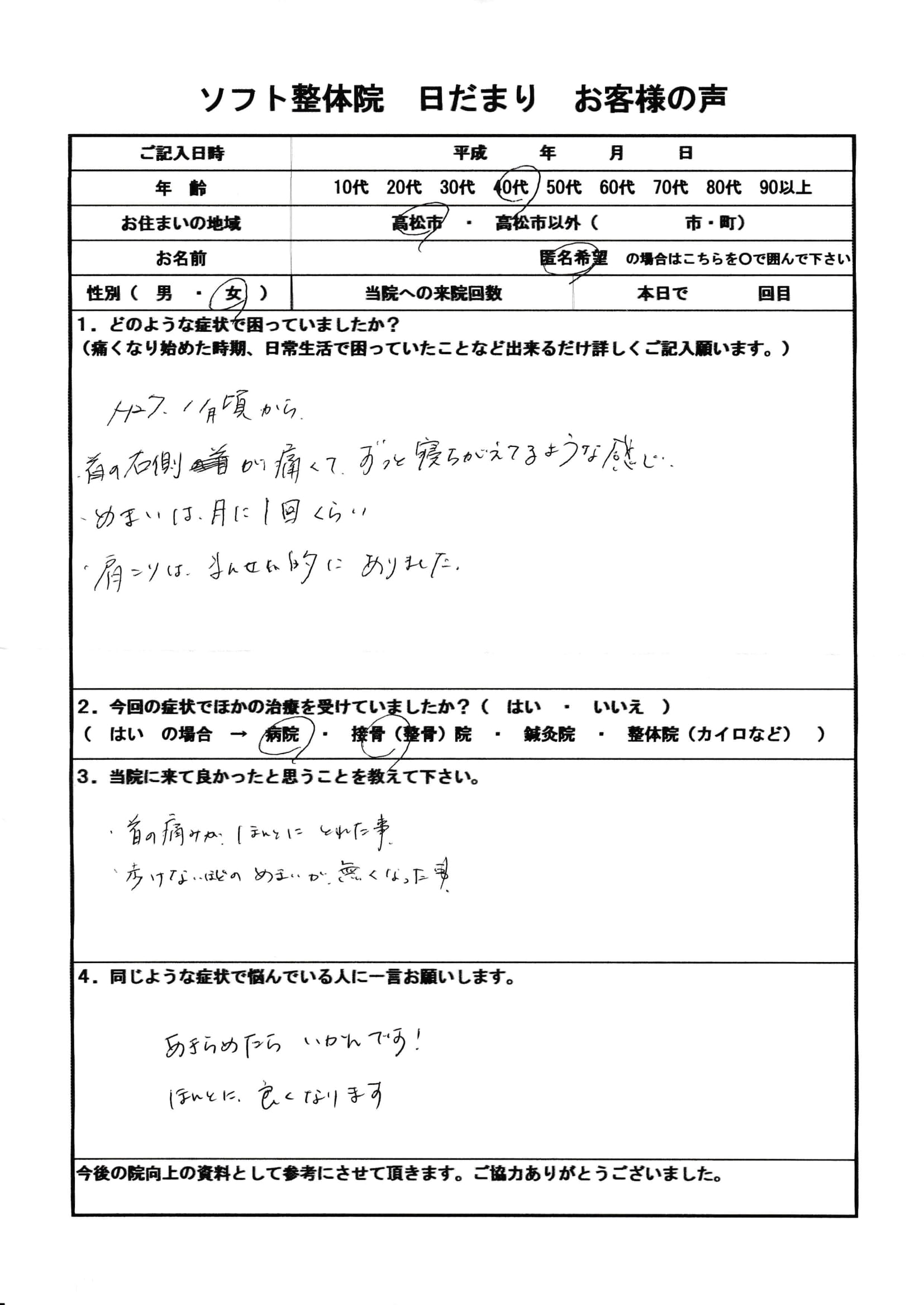 肩こりが続いていて、首、頭も重く、ここ2~3年は整形でシップをもらって使用していたが、一時的に改善されても又、夜になると首から肩が重くて痛みがとれなかった。マッサージに通っても気持ちが良いのはその時だけで、むしろ後が痛くなったりしていた。更にめまいも時々発症、不安な気持ちで(痛くならない)良い病院を捜していた。