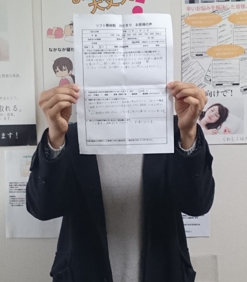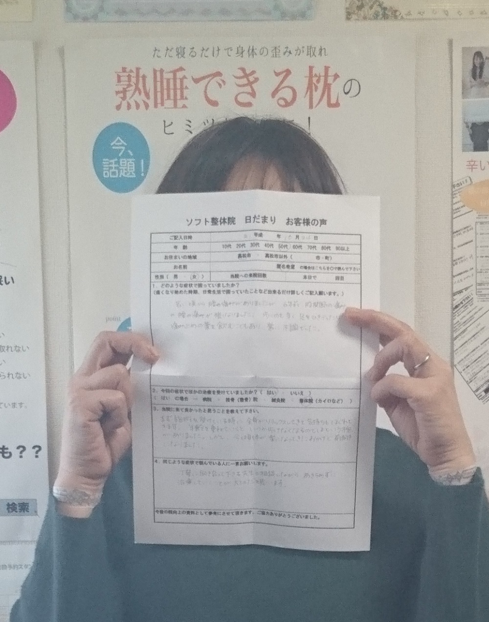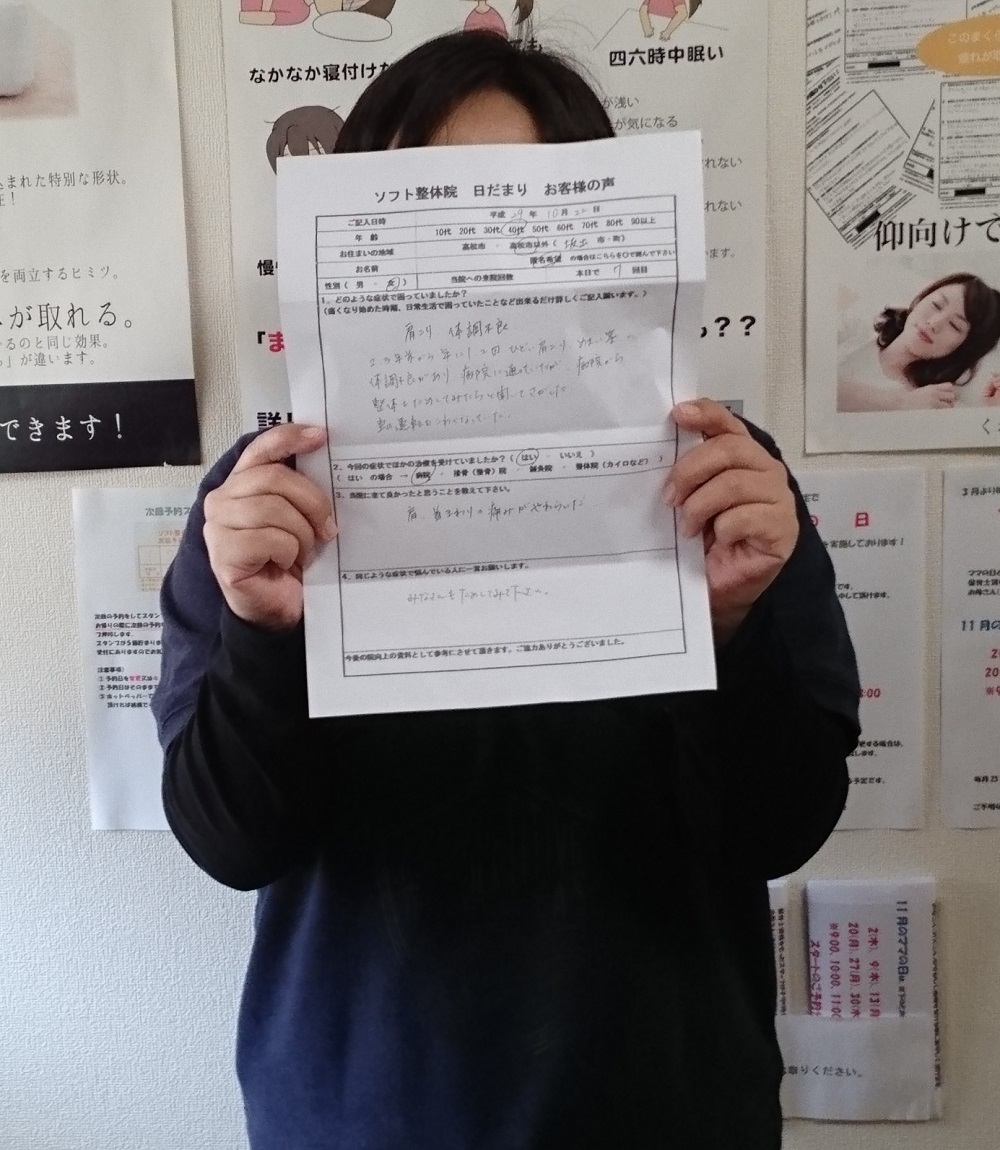 私は40年以上肩凝りに悩まされてきましたが、日だまりさんのおかげで楽になりました。今からでも遅くないです。少しでも早く施術を受けて楽になってほしいです。痛みもなく、ソフトな施術に毎回癒されています。