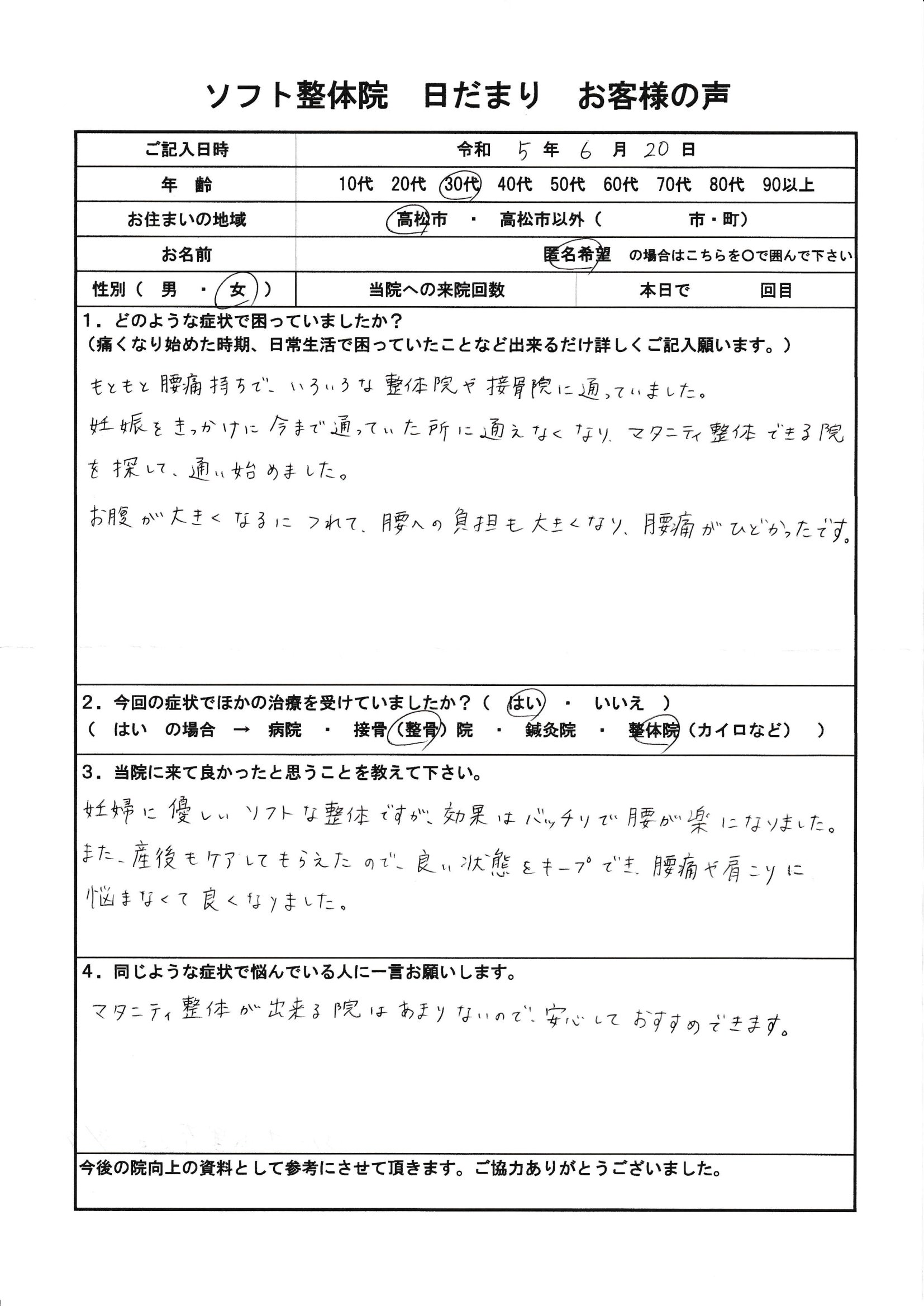 妊娠中はお腹が大きくなって腰が痛くなると聞いていたのですが、こちらに通っていたので、腰痛に悩まされることはありませんでした。足がむくみやすいとも聞いていたのですが、それもあまり感じませんでした。