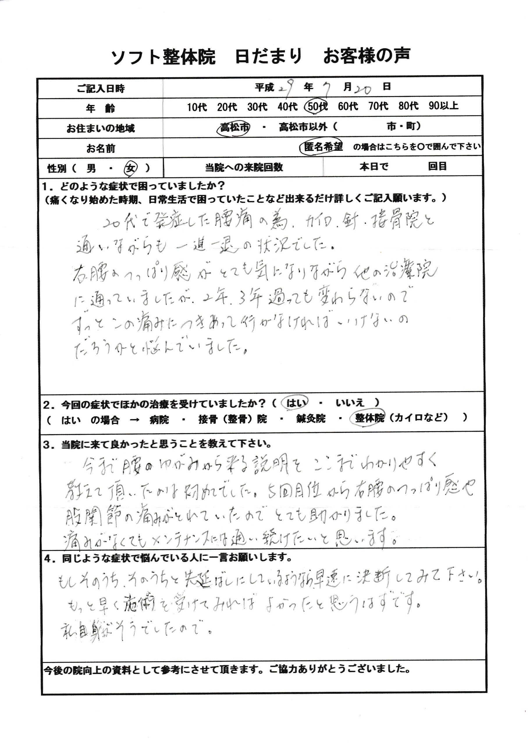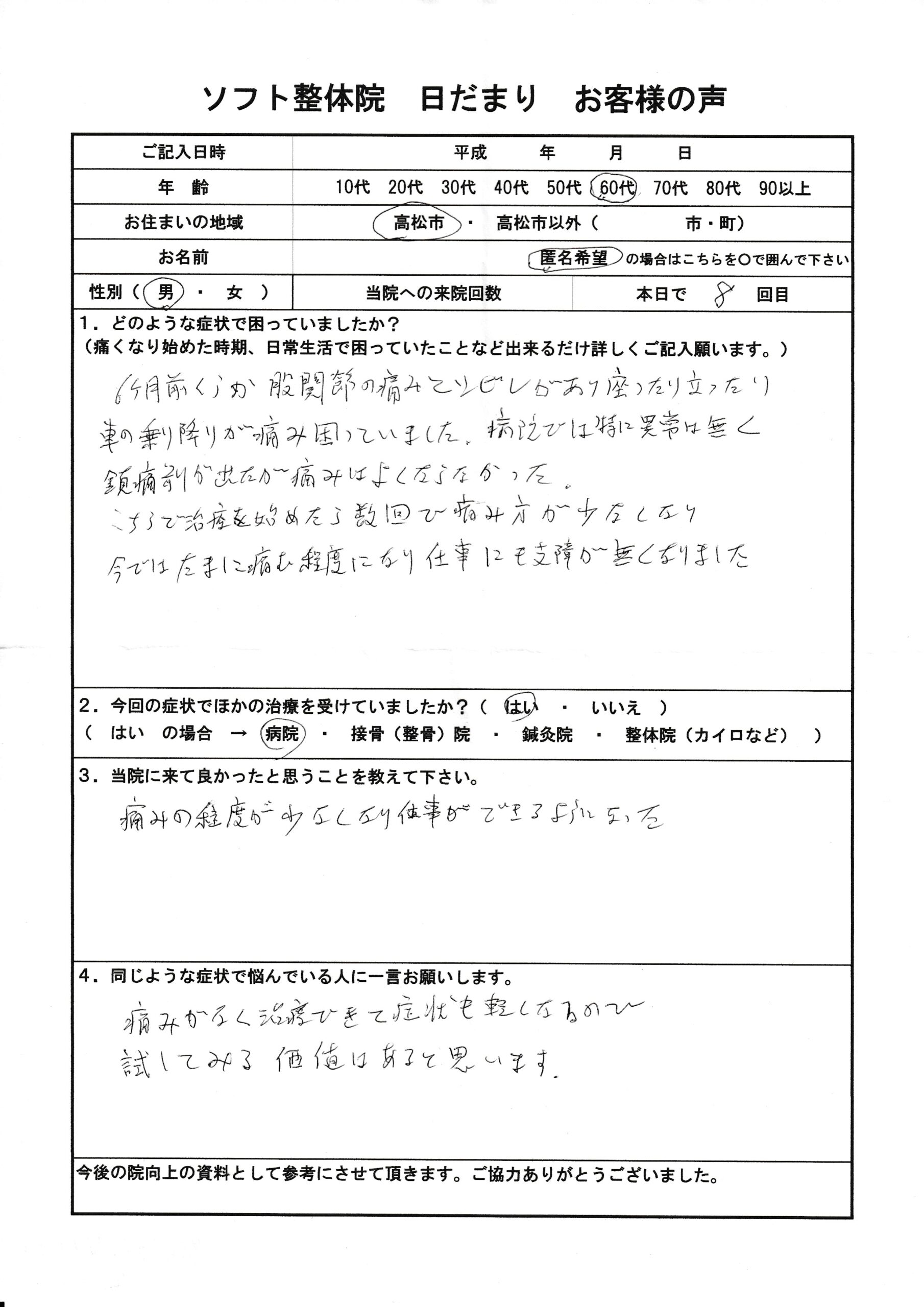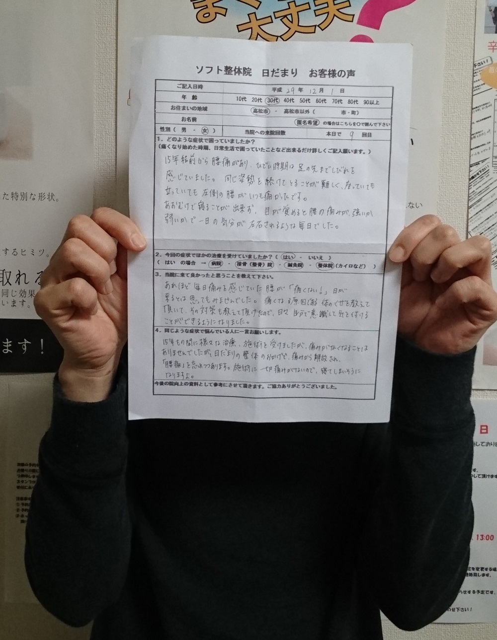 ここまで膝痛と腰痛が酷くなったのは、はじめてでいつもなら当分治らないほうが多かったので3~4回ほどで膝と腰が劇的に良くなったのは大変ありがたかったです。