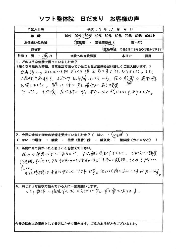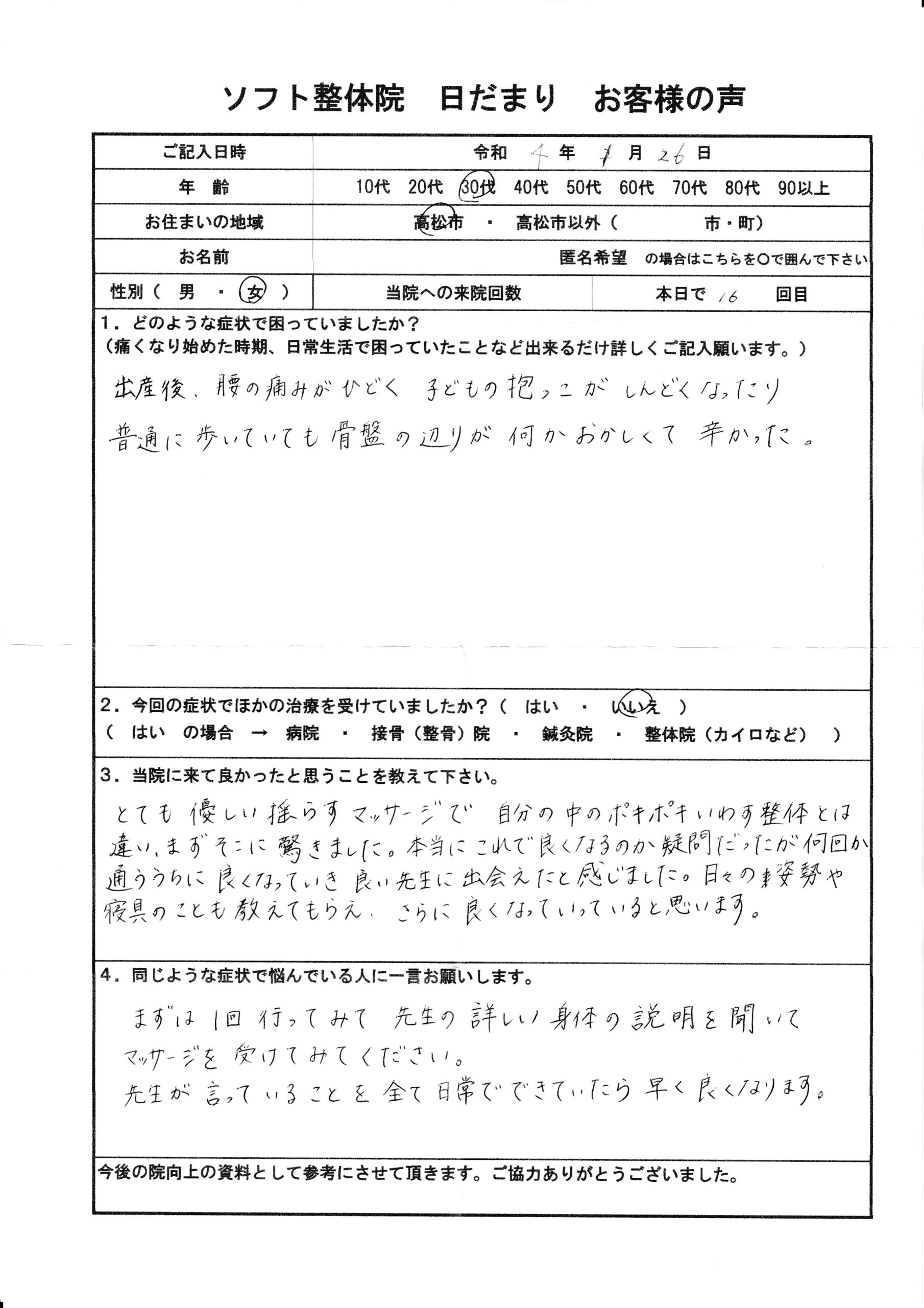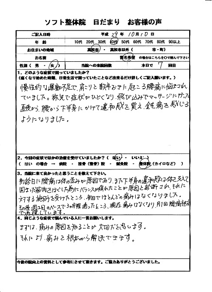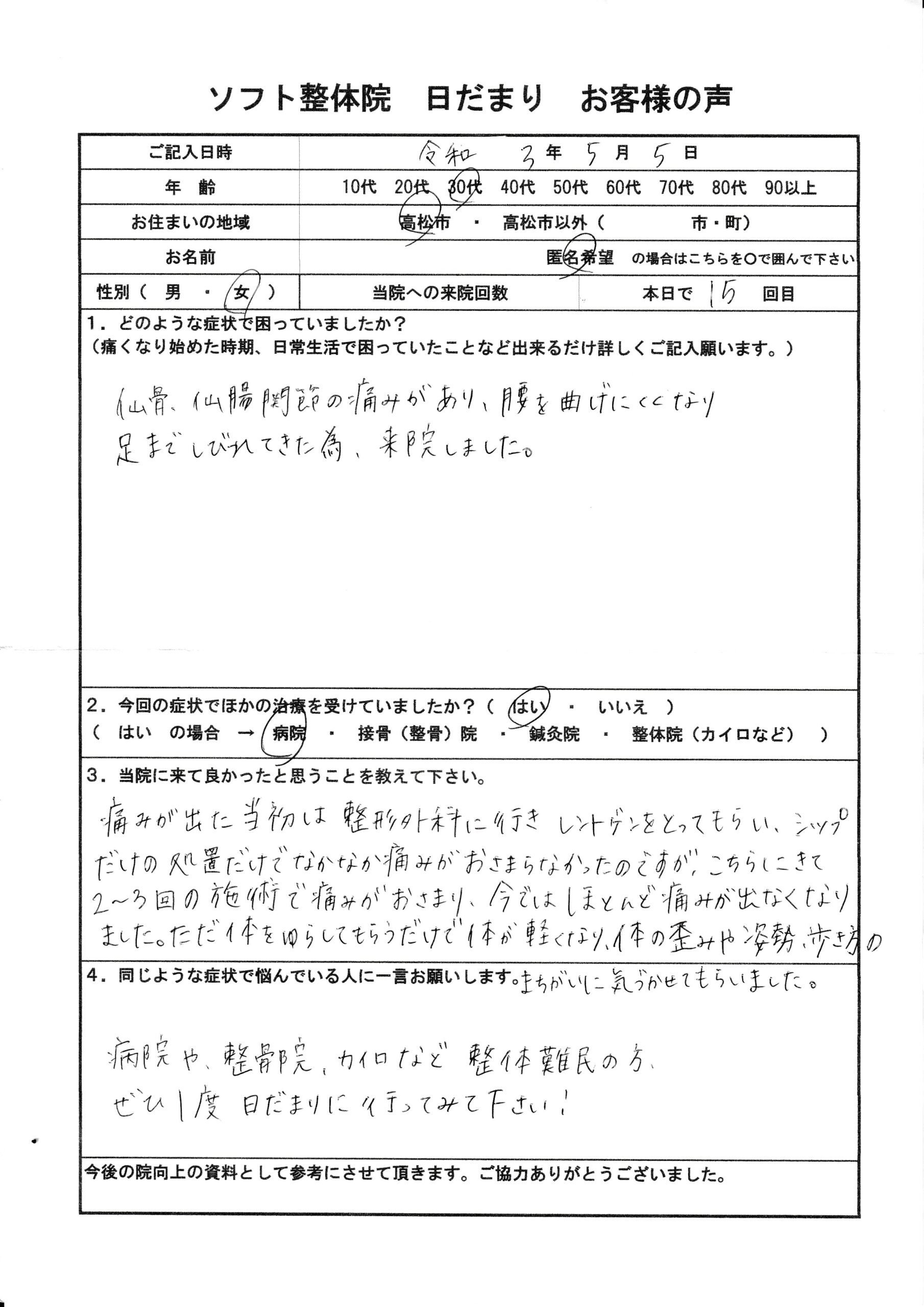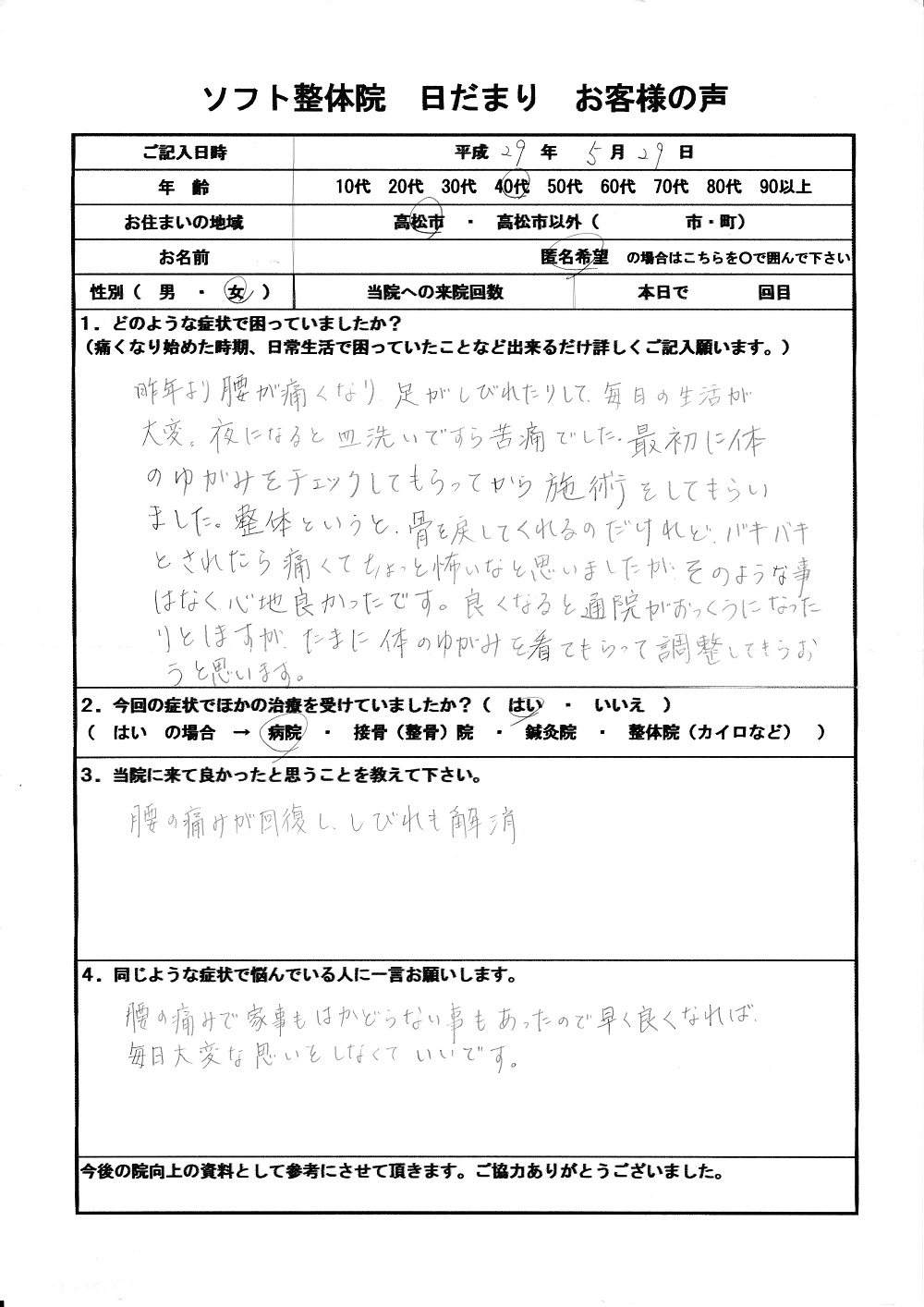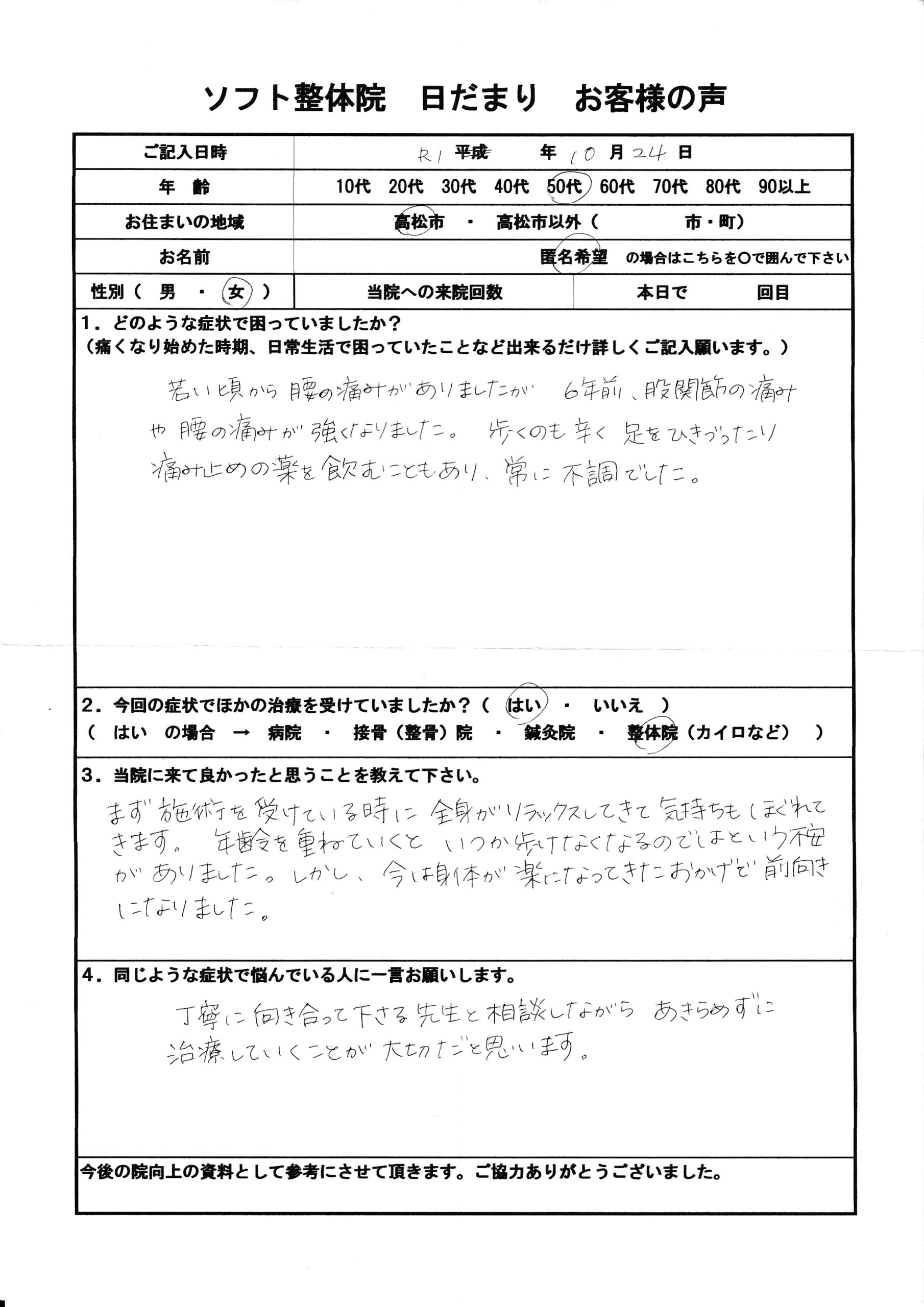 昨年より腰が痛くなり足がしびれたりして、毎日の生活が大変。夜になると皿洗いですら苦痛でした。最初に体のゆがみをチェックしてもらってから施術をしてもらいました。整体というと、骨を戻してくれるのだけれど、バキバキとされたら痛くてちょっと怖いなと思いましたが、そのような事はなく心地よかったです。良くなると通院がおっくうになったりとしますが、たまに体のゆがみを看てもらって調整してもらおうと思います。