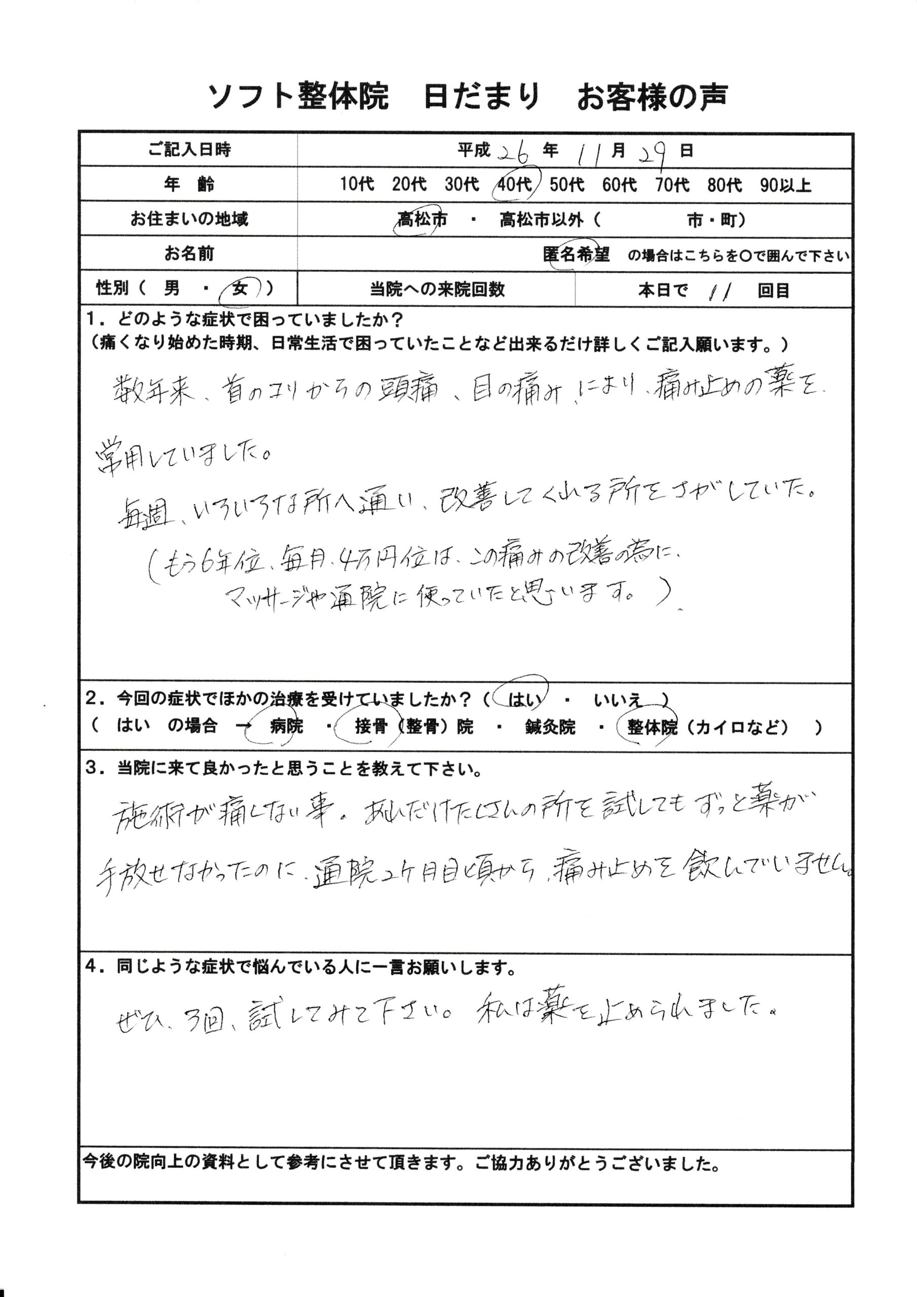 元々20年以上肩こりと腰痛には悩まされていました。ここ一年位は頭痛も伴うようになり、毎日お薬を飲む日々でした。お薬を飲んで良くなっても、効果が切れるとまた頭痛が出てきて、夜寝て朝起きたらまた頭痛がしての繰り返しでした。病院に行き、CTやMRIをとっても異常はなしで、痛み止めが出るだけでした。常に頭痛があるので痛み止めは手放せないし、夕方、仕事が終わる前には疲労もプラスされキツイ頭痛がする日々でした。頭痛で何もする気にならないし、だるいし生活の質が落ちたような気になりました。痛み止めを飲むので大好きなビールもなかなか飲めず、これも辛かったです。