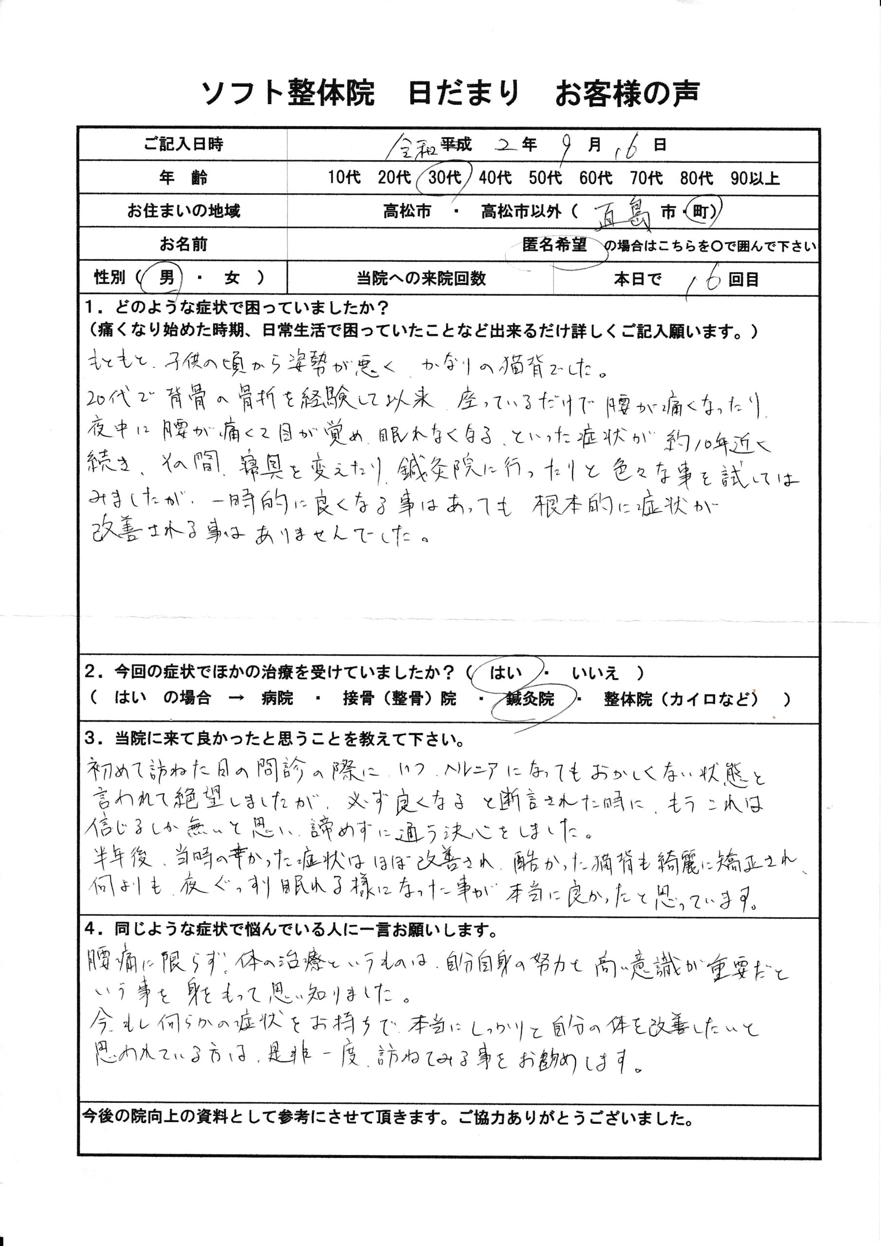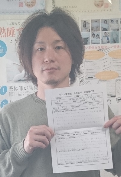 初めて訪れた日の問診の際に、いつヘルニアになってもおかしくない状態と言われて絶望しましたが、必ず良くなると断言された時に、もうこれは信じるしか無いと思い、諦めずに通う決心をしました。半年後、当時の辛かった症状はほぼ改善され、酷かった猫背も綺麗に矯正され何よりも、夜ぐっすり眠れる様になった事が本当に良かったと思っています。