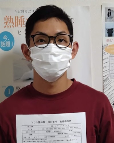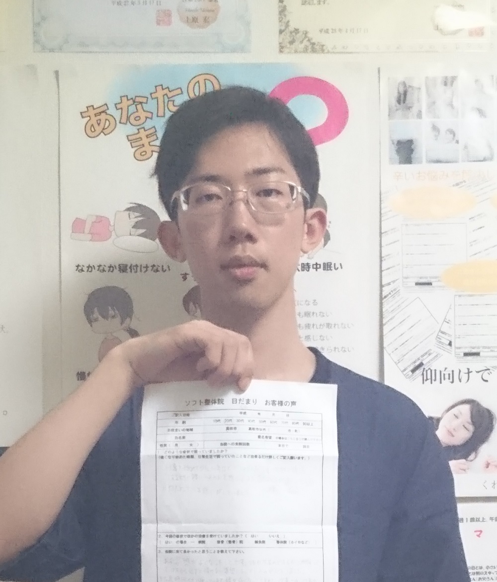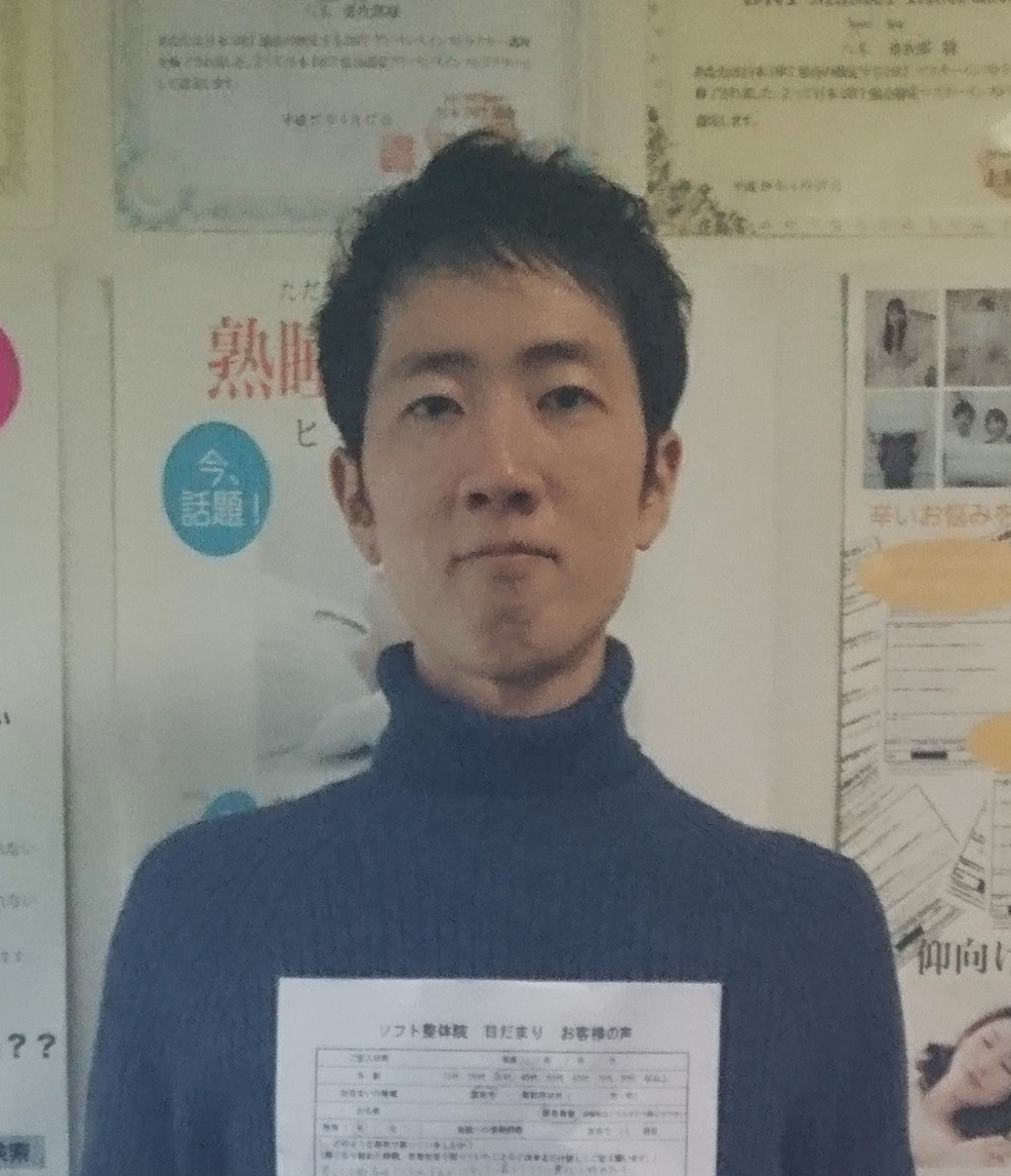 とても優しい揺らすマッサージで自分の中のポキポキいわす整体とは違い、まずそこに驚きました。本当にこれで良くなるのか疑問だったが何回か通ううちに良くなっていき、良い先生に出会えたと感じました。日々の姿勢や寝具のことも教えてもらえ、さらに良くなっていってると思います。
