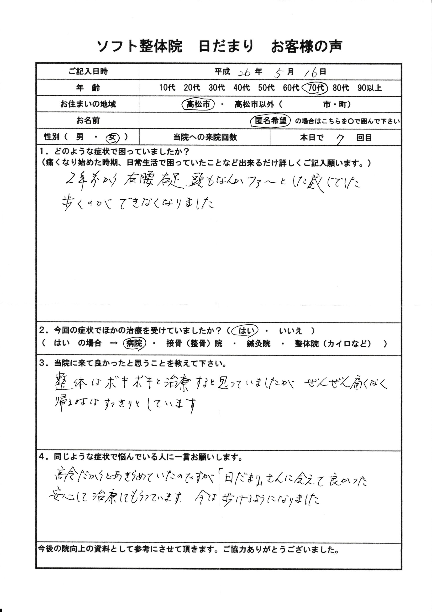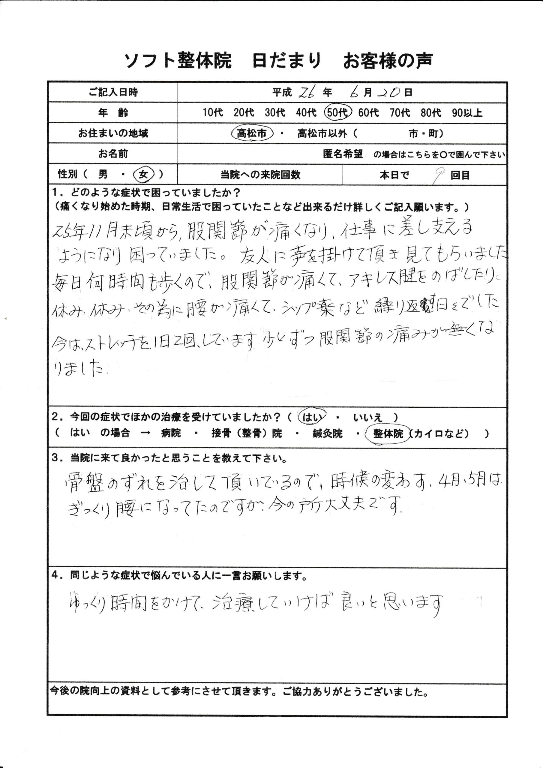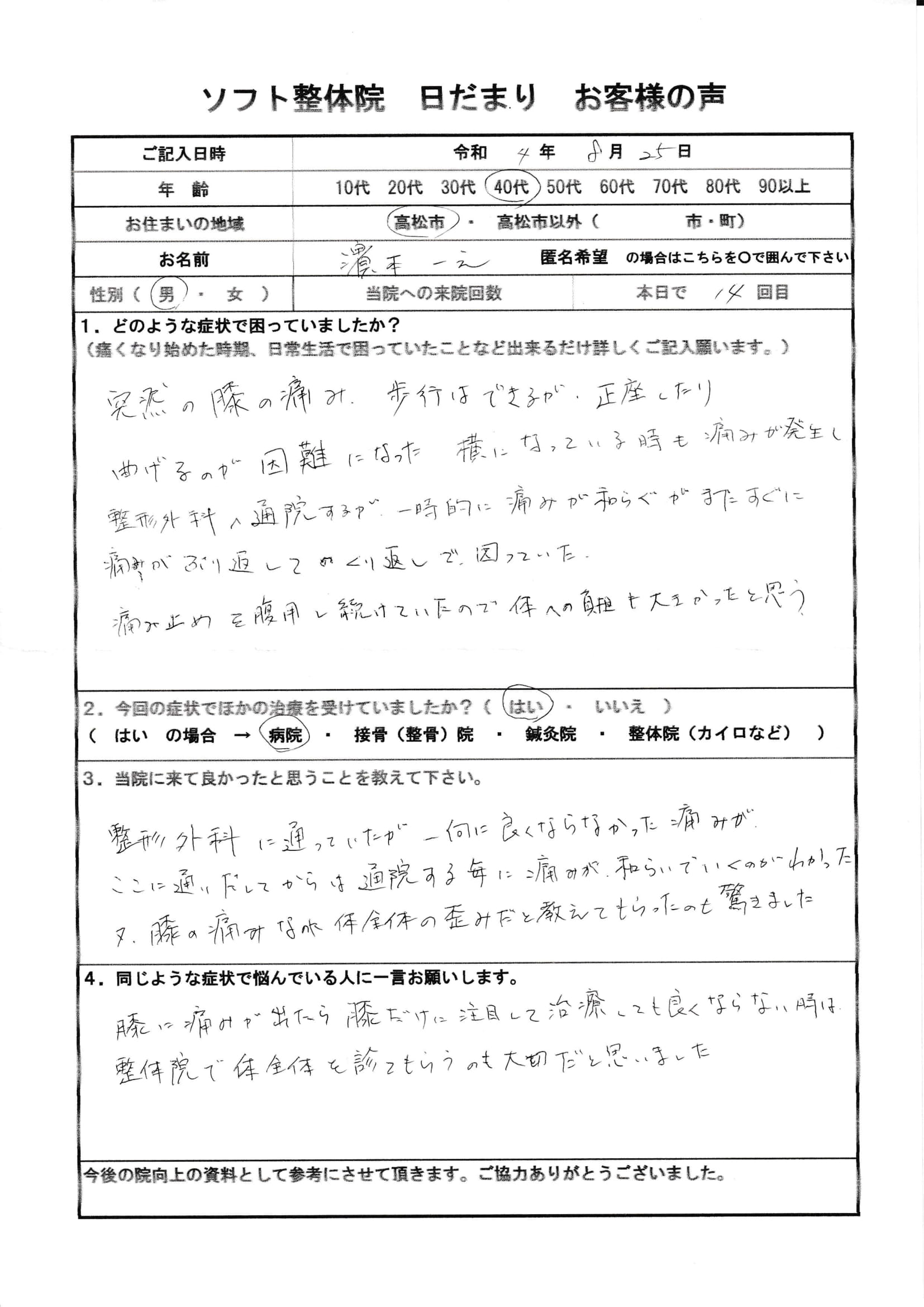整形外科に通っていたが、一向に良くならなかった痛みが、ここに通いだしてからは通院する毎に痛みが和らいでいくのがわかった。又、膝の痛みなのに体全体の歪みだと教えてもらったのも驚きました。
