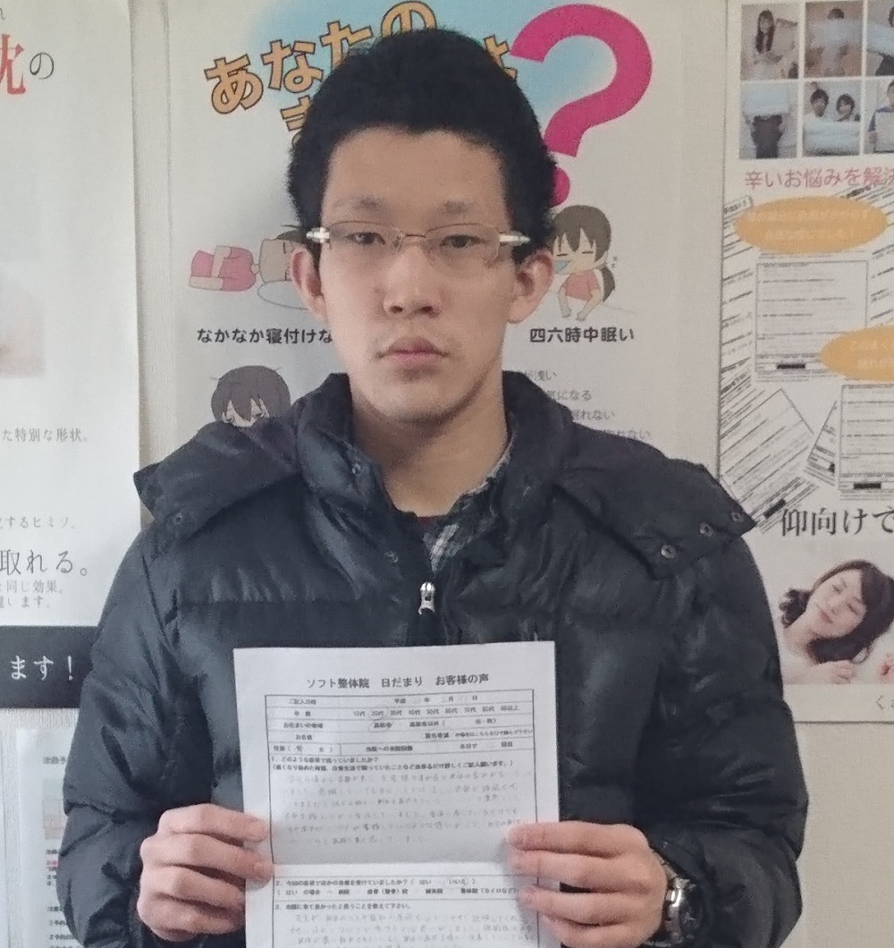 病院で頭痛の原因を特定する事が先だと思いましたが、専門に分かれているので特定するまでに時間がかかってしまいました。緊張性頭痛は薬を飲むよりも、筋肉をゆるめる事や姿勢を良くする事が大切と聞いたので、初めてではありましたが、勇気を出して整体院のドアをたたいてみました。息子は八木先生のおかげで、明るさがもどってきたし、施術にうかがう期間もどんどんのびています。勇気を出してみて良かったです。
