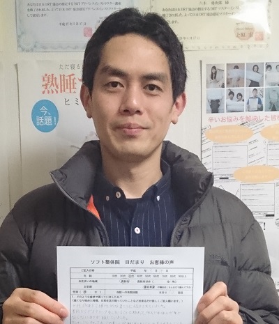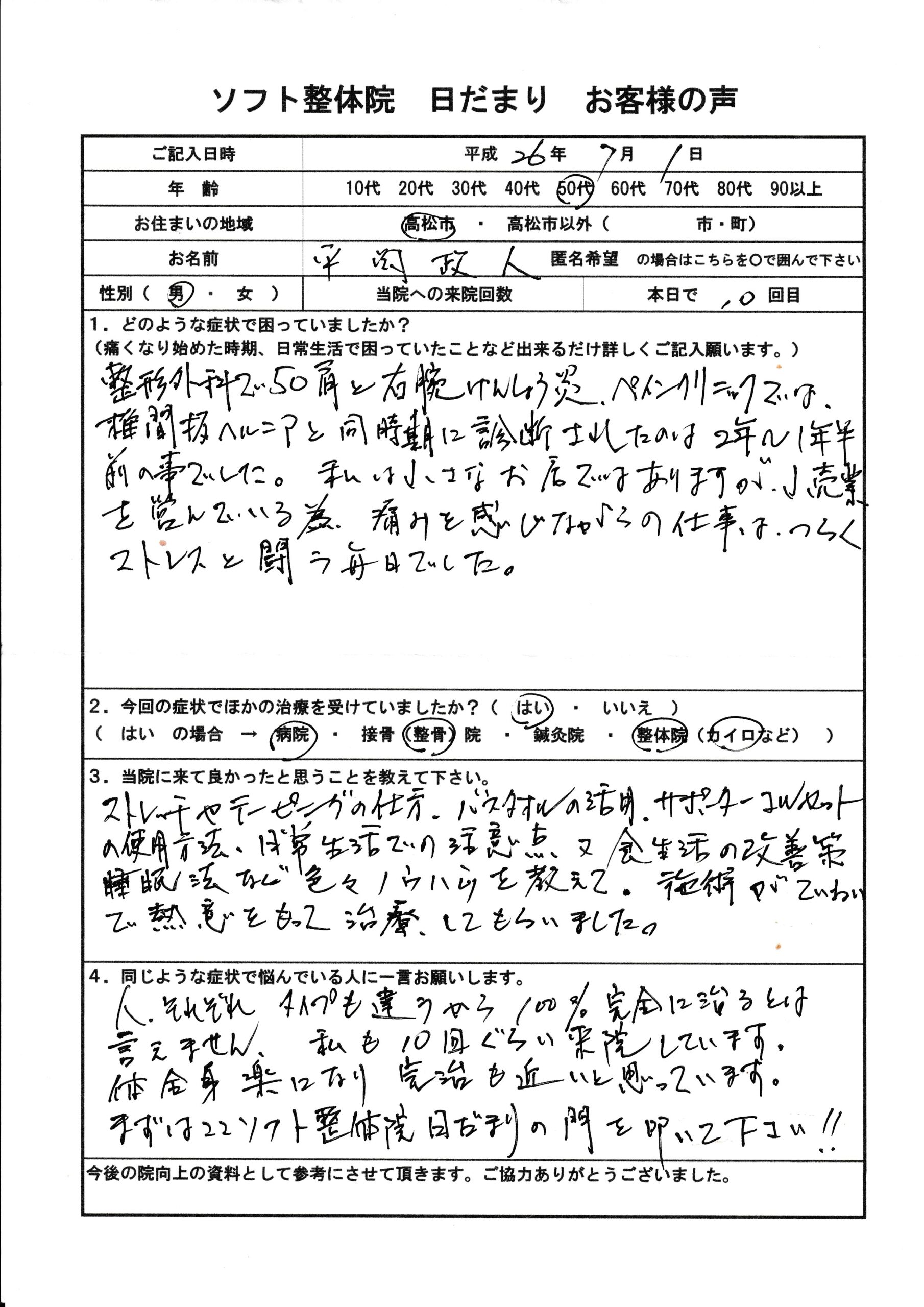 痛みのある肩、膝等の局所部が原因だとずっと思っていたが、八木先生より腰だと聞き、いままでわからなかった原因をていねいに説明して頂き、信頼できる先生だと思いました。